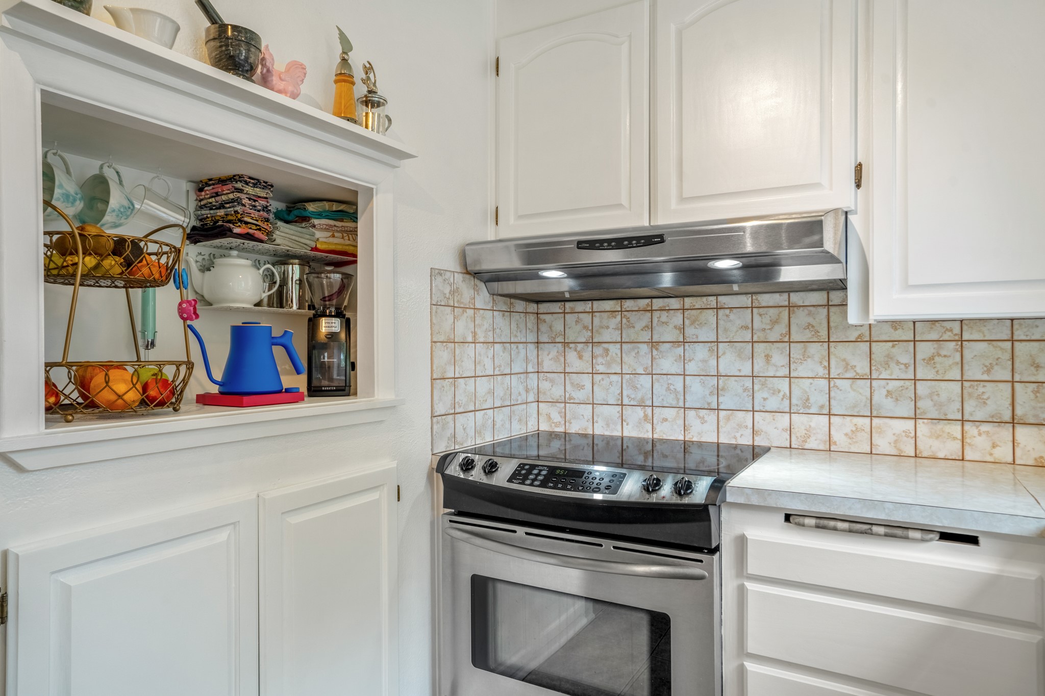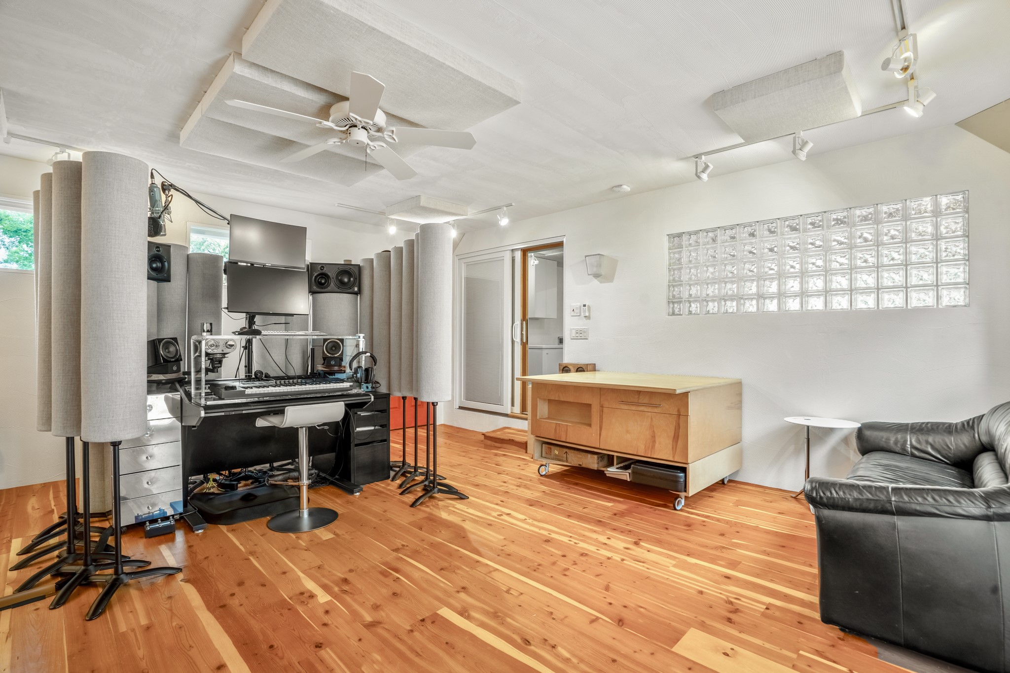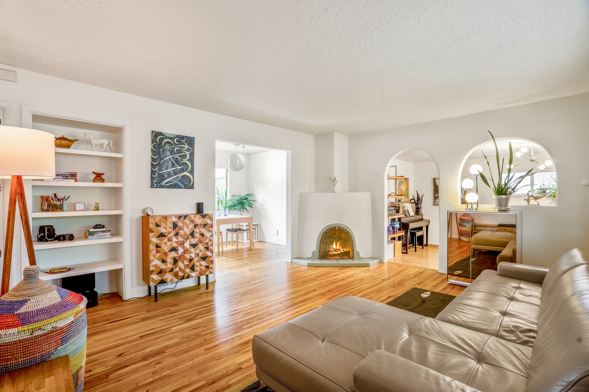 This charming Stamm home in Casa Solana offers a blend of classic character and modern updates, and is mere minutes from the Santa Fe Plaza. Beautifully cared for oak floors flow through thoughtfully updated interiors. There is also a brand-new TPO roof topped with owned and completely paid for solar panels. The bright living room features a cozy Kiva fireplace, and extends into a second living space with a beautiful bay window, creating a welcoming gathering space. The cheery kitchen features stainless steel appliances and a sunny dining nook for informal dining. The primary suite, tucked at the end of the hall, boasts a private bath, while a second bedroom and full bath are thoughtfully placed nearby. There is a soundproof music studio on the other end of the home with it's own private entrance that can easily transform into a third bedroom or office. Situated on an oversized corner lot with lush landscaping watered by an underground rainwater tank, this home is move-in ready, full of warmth and perfectly balanced for comfort and style.