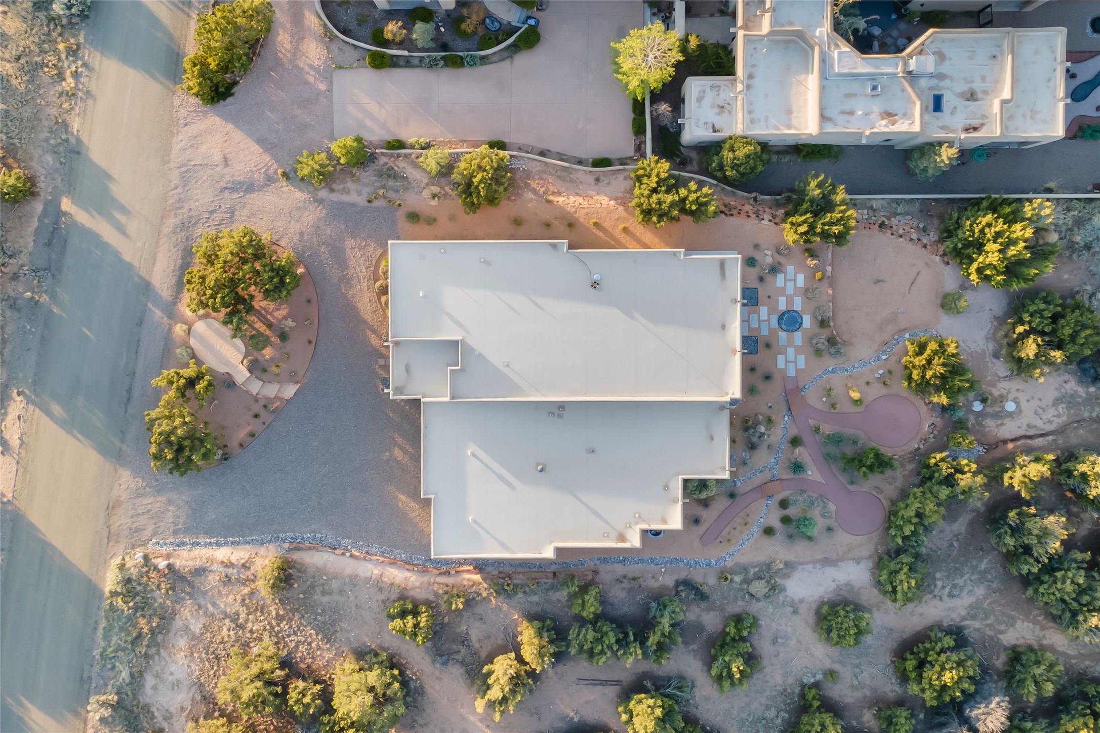 Welcome to 14 Plano Arbolito--where sleek contemporary design meets the serene beauty of Santa Fe's natural landscape. Perched on a half acre in the desirable Tano West neighborhood, this recently built, single-level home offers the perfect balance of luxury, comfort, and breathtaking views. This three-bedroom, three-bathroom residence boasts an open-concept floorplan designed for effortless living and entertaining. The expansive great room features soaring ceilings, a modern electric ambiance fireplace, and floor-to-ceiling windows that frame spectacular views of the Sangre de Cristo Mountains. The adjacent chef's kitchen is equipped with premium stainless-steel appliances, a generous island with counter seating, a walk-in pantry, and elegant finishes that blend form and function. Retreat to a tranquil owner's suite complete with outdoor access, a spa-like bathroom with a soaking tub, dual vanities, a spacious shower, and two oversized walk-in closets--one currently used as an office or yoga space. A separate guest wing includes two private bedrooms, one with its own entrance and en suite bath, perfect for visitors or extended stays. Step outside to a deep-covered portal with gas fireplace hookups and a custom fountain, ideal for enjoying Santa Fe's vivid sunsets and star-filled nights. The fully landscaped, xeriscape backyard opens to panoramic vistas and unmatched privacy. Additional highlights include an oversized three-car garage, a flexible bonus room off the entry, and many thoughtful upgrades--from whole-house air purification to premium lighting and smart home features. Only 20 minutes from the Plaza and nestled within a community known for its protected open space, 14 Plano Arbolito offers peace, luxury, and a front-row seat to Santa Fe's majestic beauty.