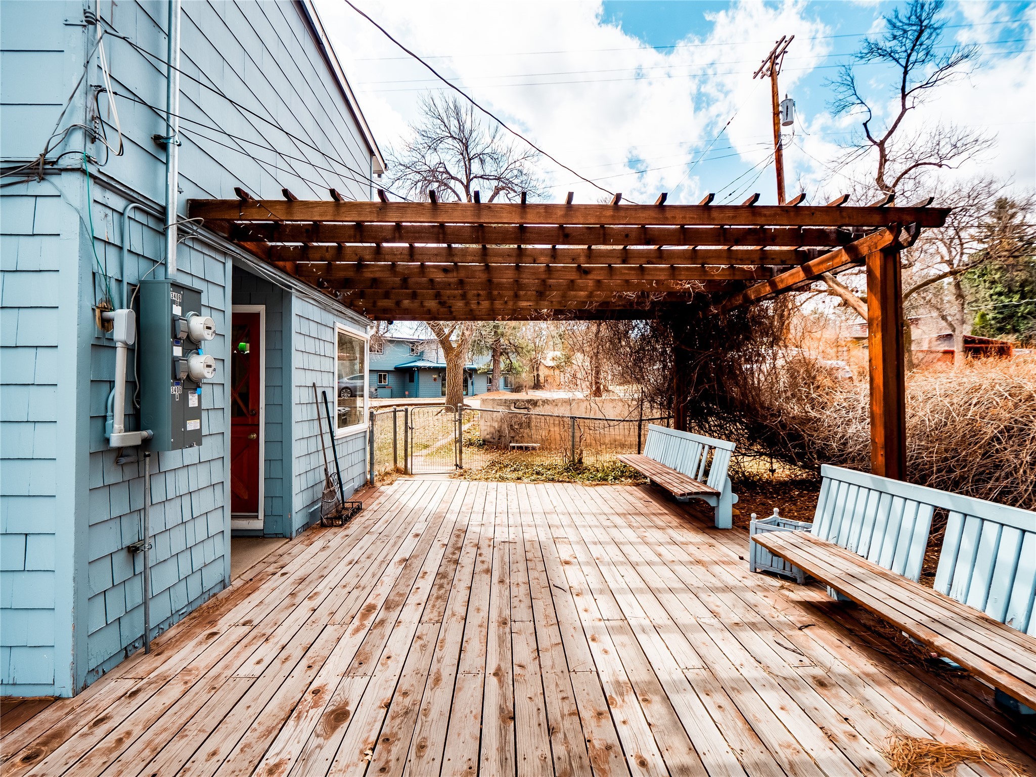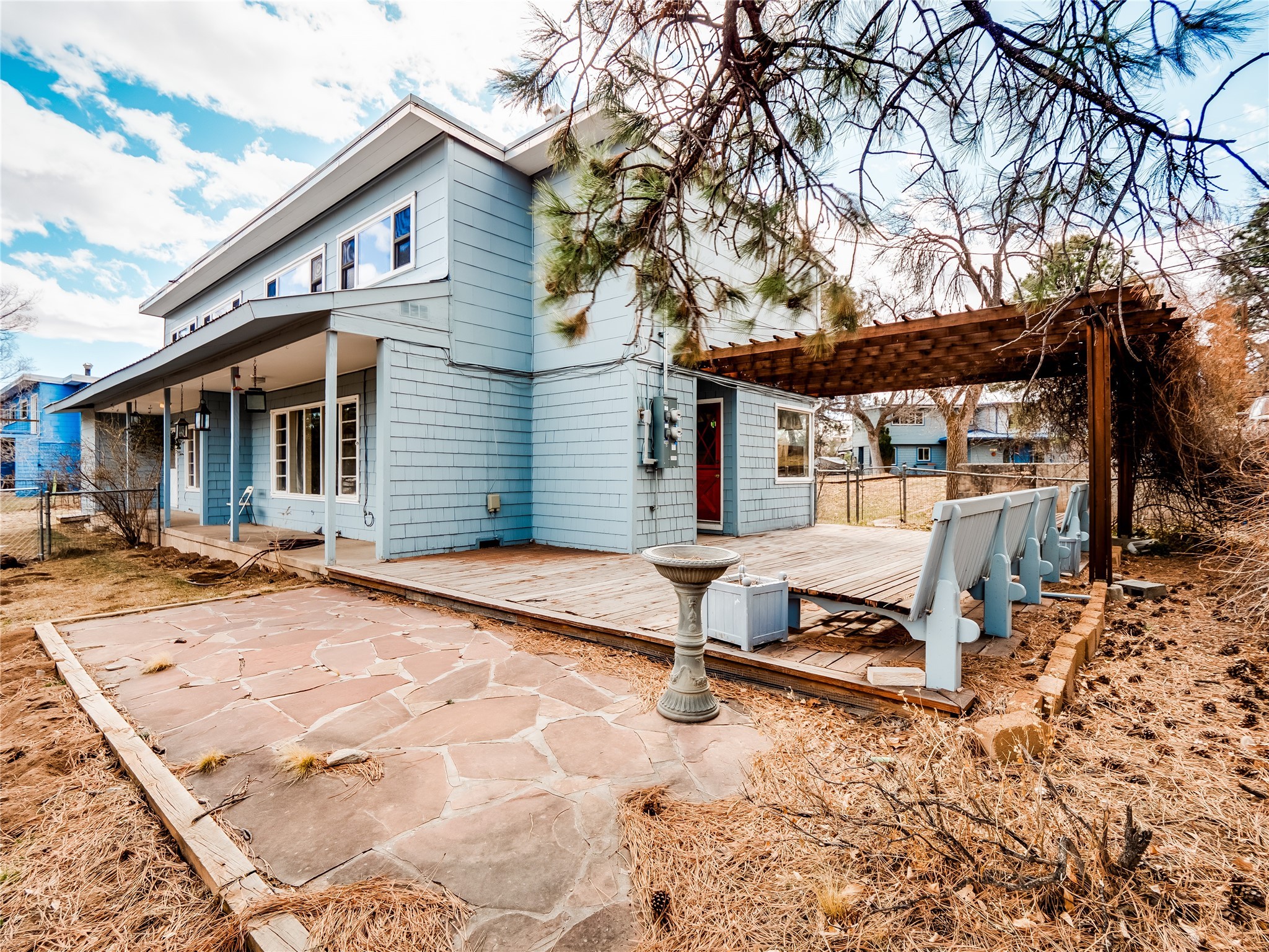 Located in a desirable West Area-East neighborhood, this charming two-story condo offers a perfect blend of comfort, and natural beauty. From the street-level designated parking spot, descend the stairs to a spacious front grass lawn, mature trees and shrubs, creating a welcoming atmosphere. Head inside through the bright enclosed porch/sunroom, an ideal space for plants and protection from the elements before entering the cozy interior. The front entryway features carpet flooring that extends throughout the living spaces, along with a convenient storage coat closet. Straight ahead, the inviting living room is filled with natural light from a wall of windows adorned with half shutters and a door leading to the backyard. Galley-style kitchen with tile flooring, warm wood cabinets with black hardware, and a pantry closet. Included appliances--refrigerator, gas stove, and a washer-dryer combo. A side door leads to the yard and an additional storage closet. Upstairs, there's three bedrooms. Two well-sized guest bedrooms, with one offering a double closet. And a spacious primary bedroom with treeline views, complete with a generous walk-in closet. A shared bath has a single sink vanity, tile flooring, and a tiled shower/tub with a sliding door enclosure. The fenced backyard offers a blend of open space and natural scenery. A covered porch off the living room provides a shaded retreat. The yard slopes gently down to the canyon, where mature trees and native vegetation create a picturesque, private setting. To the side, a spacious wood deck with built-in seating and a pergola serves as the ideal spot for outdoor gatherings. Whether you're hosting a summer barbecue, relaxing with a book, or savoring your favorite beverage under the stars, this inviting space is perfect for year-round enjoyment. The yard also offers plenty of room for gardening and pets. Just a short drive to downtown, parks, trails, shopping, and restaurants, this fantastic property is a must-see.