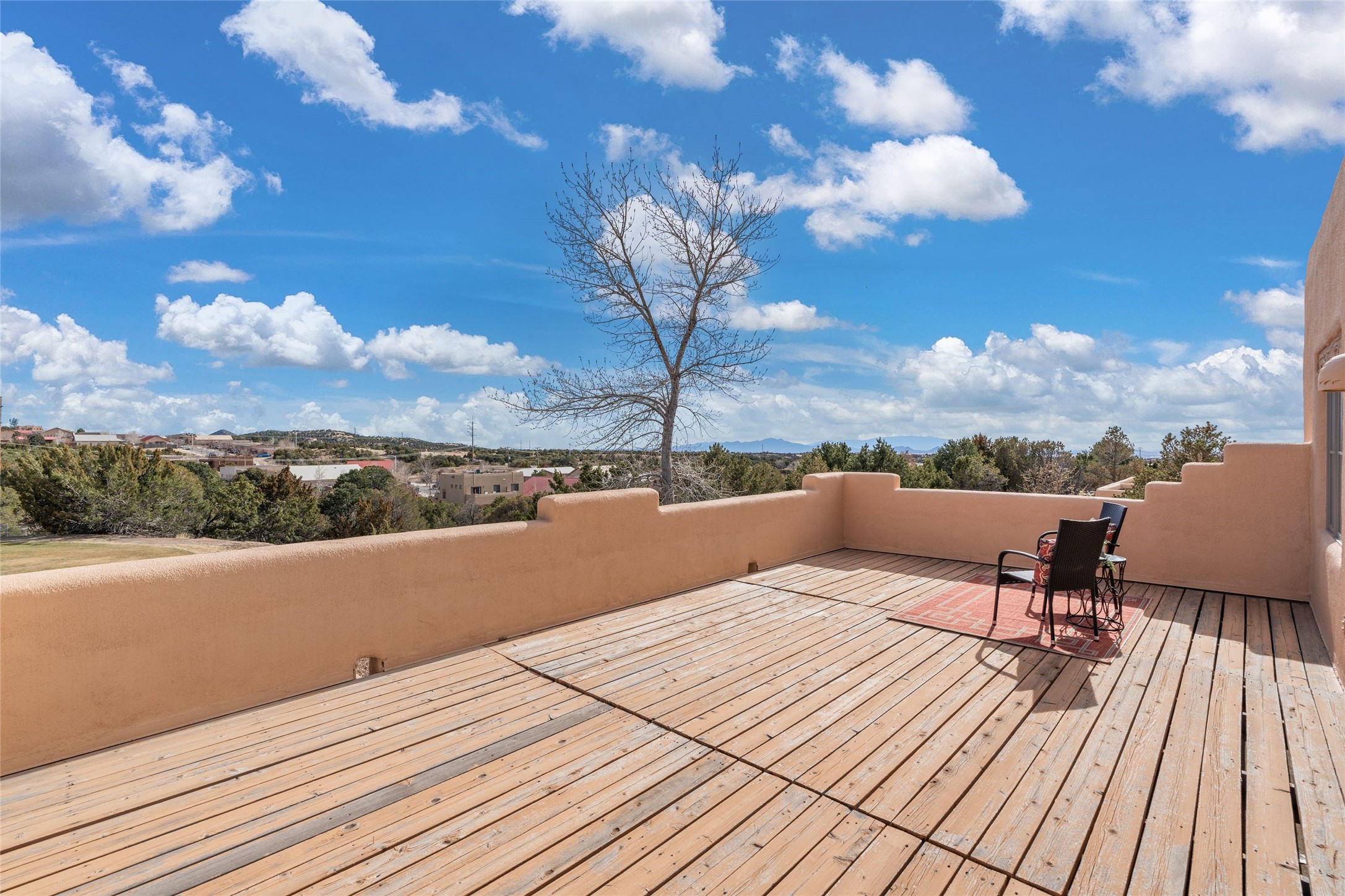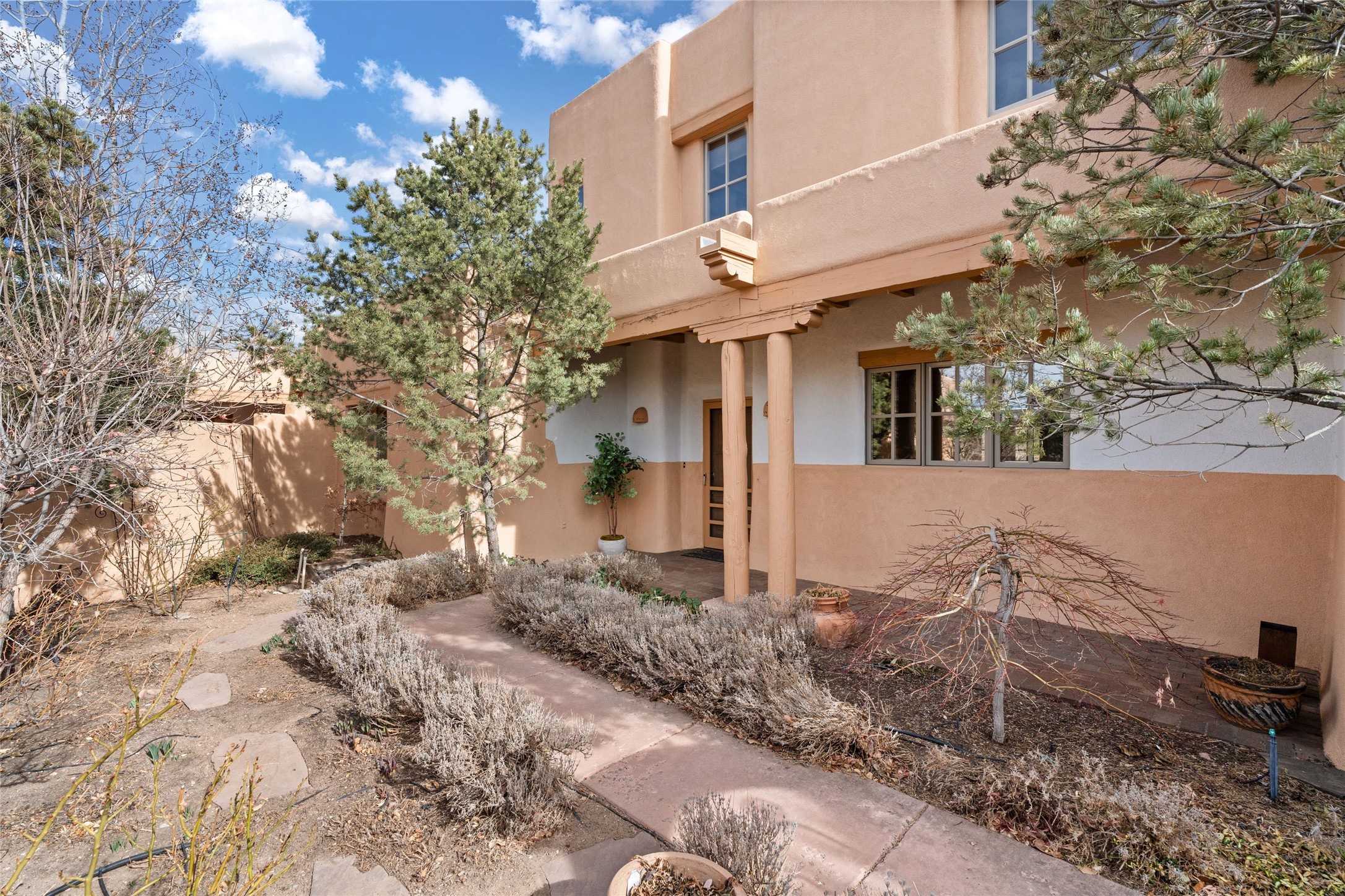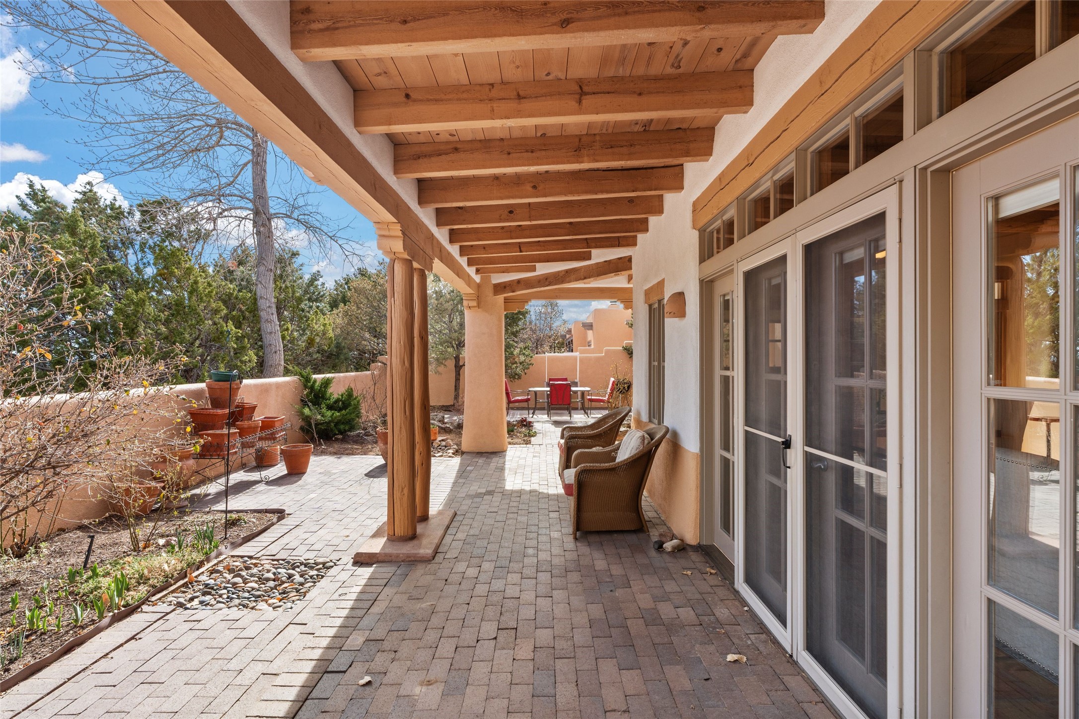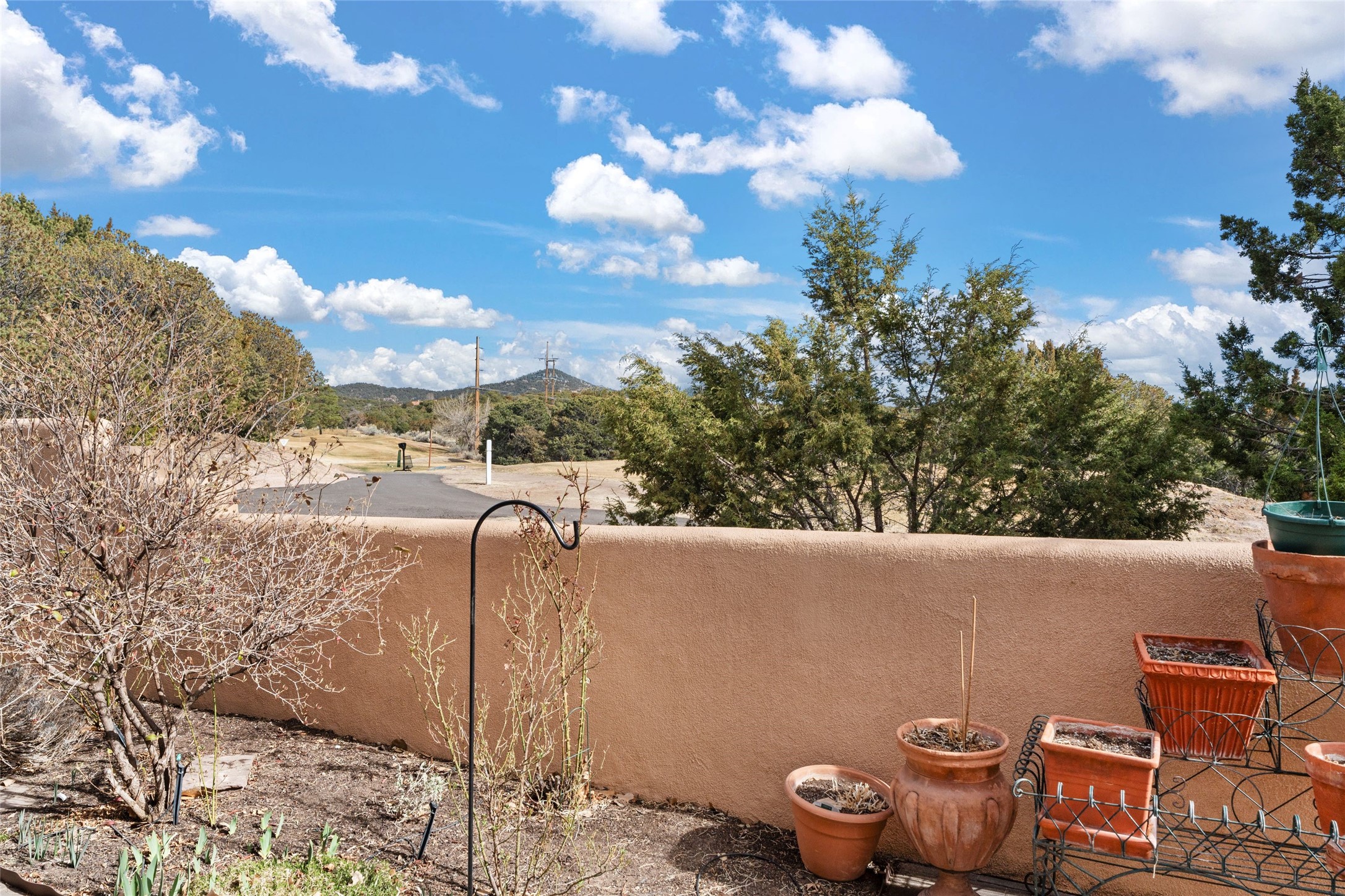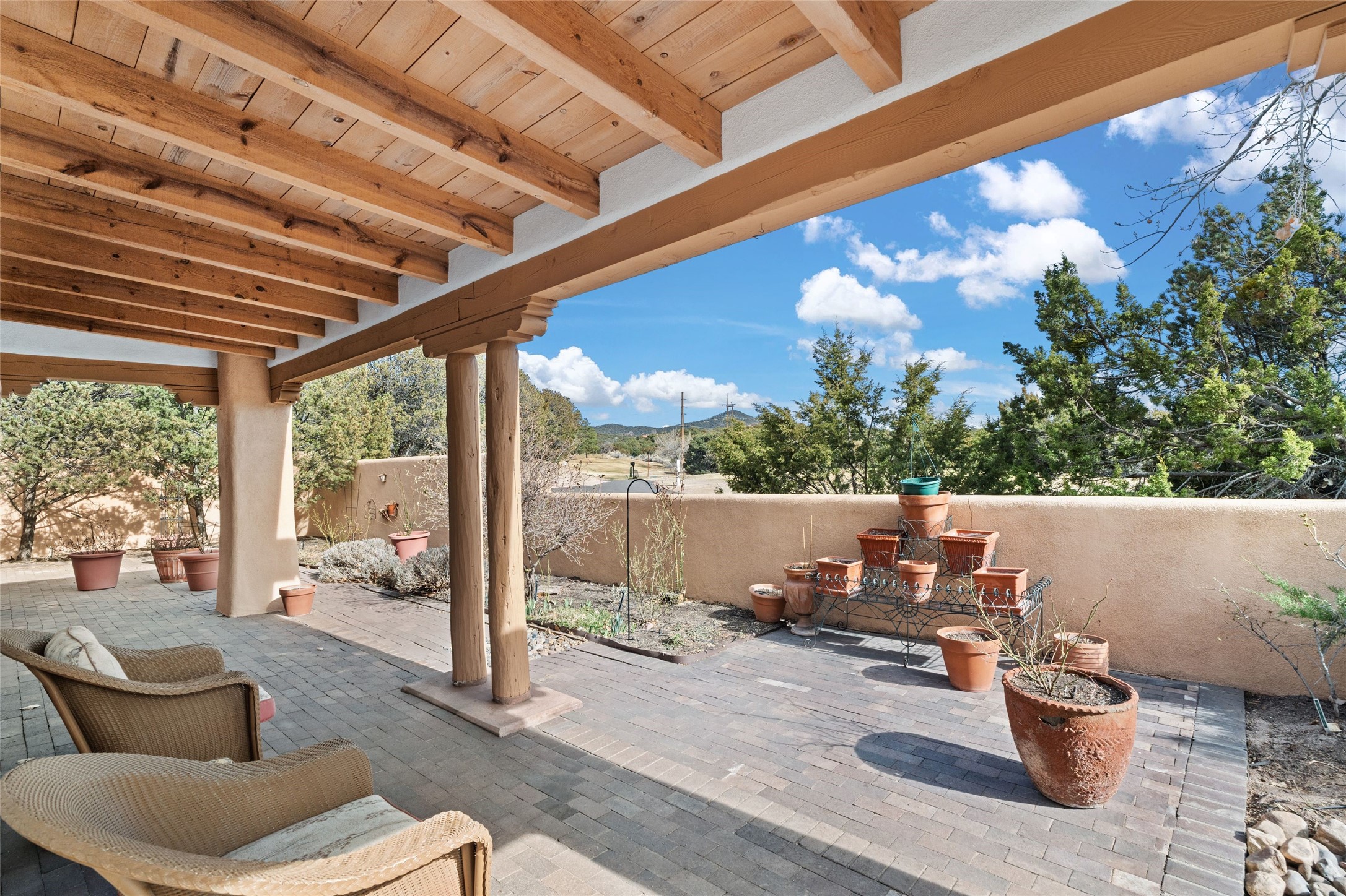 Classic Quail Run Pinon D floorplan featuring Santa Fe Style, great separation of bedrooms and timeless craftsmanship with ample sized rooms, a large kitchen and bright open living room. A serene and flowing space that allows for comfortable indoor living while showcasing spacious terraces that will beckon you outdoors. Tall portal with vigas offers views of the golf course, mountains and those famous Santa Fe skies. The gardens feature 30 specimen roses. This oversized outdoor space is ideal for entertaining. Upstairs there is a large sun flooded room that can be used as a bedroom or study. It includes an adjoining bathroom and outdoor deck with expansive scenery. Quintessential style that embodies Santa Fe beauty on the inside and out. If you are looking for a fabulous community with 24 hour hosted security and countless amenities as well as social clubs and gatherings, this is your next home! Ownership includes access to a state of the art gym, pool/spa, tennis/pickleball courts, golf, fitness classes and much more; come and see!