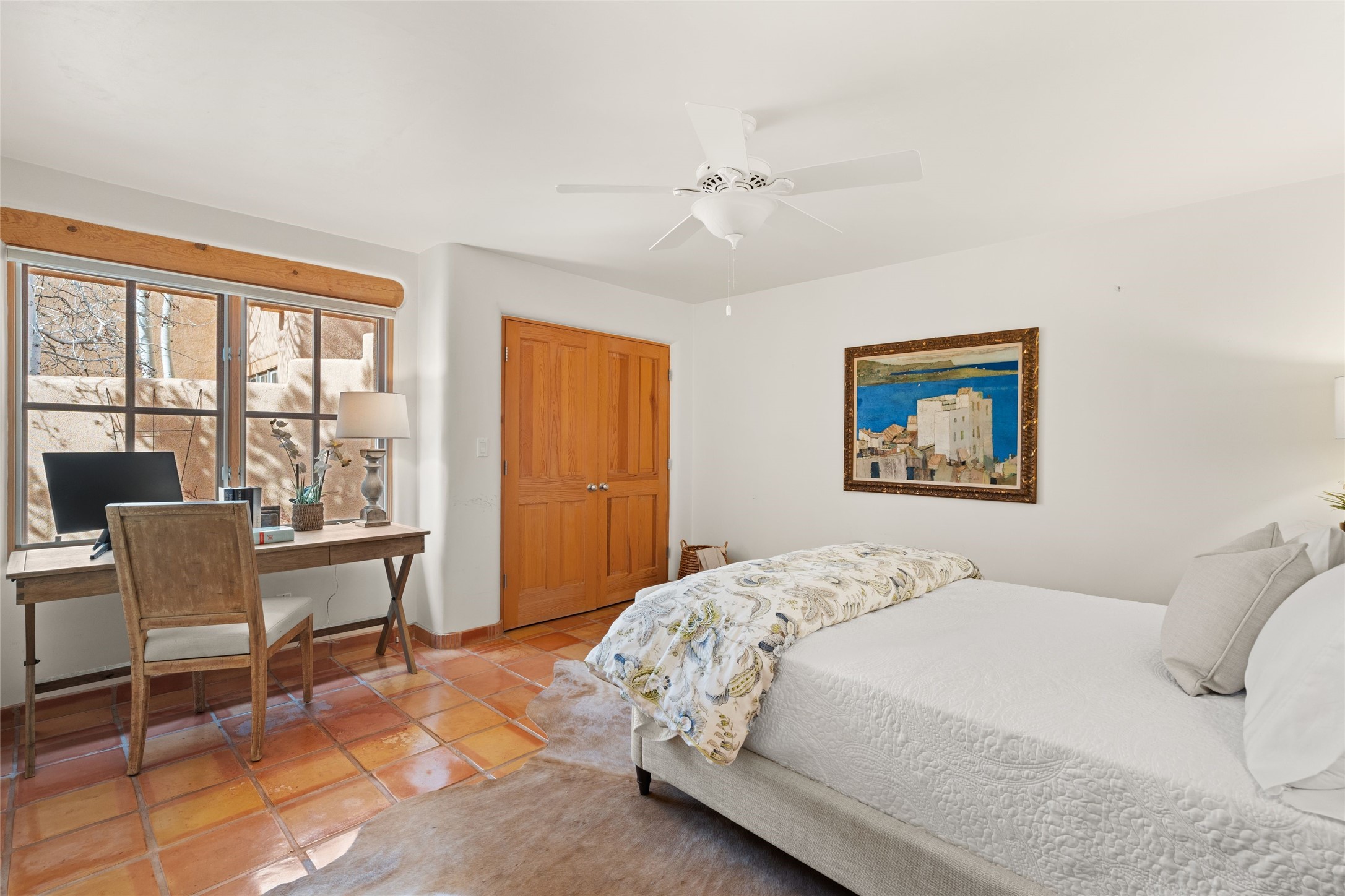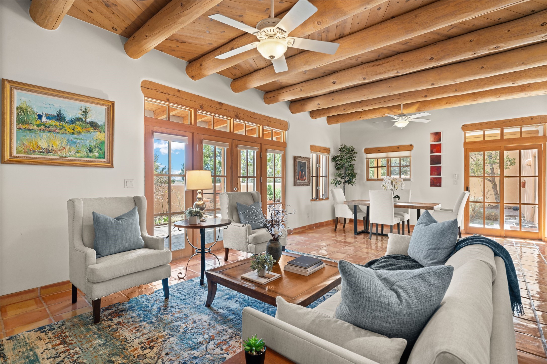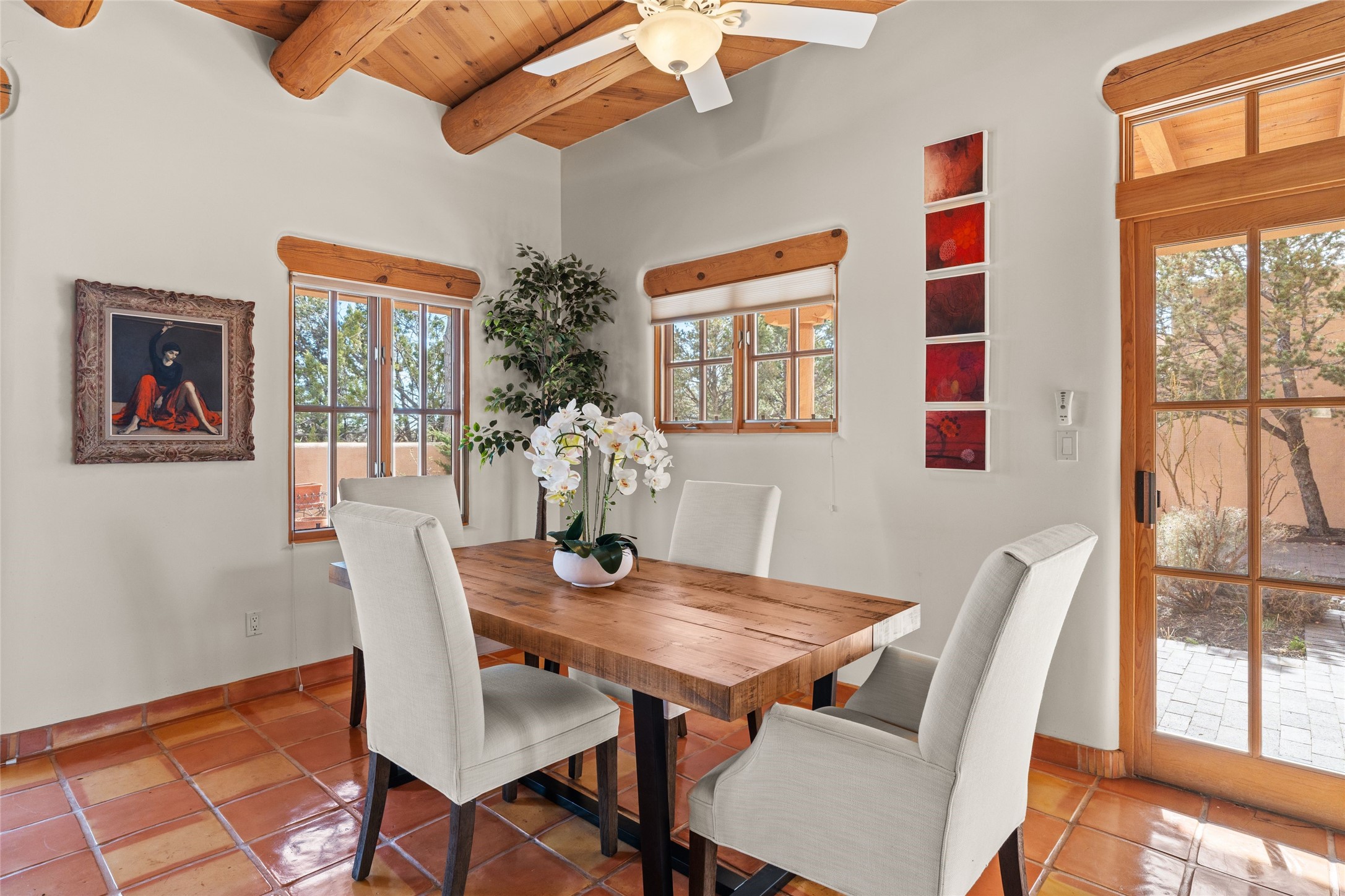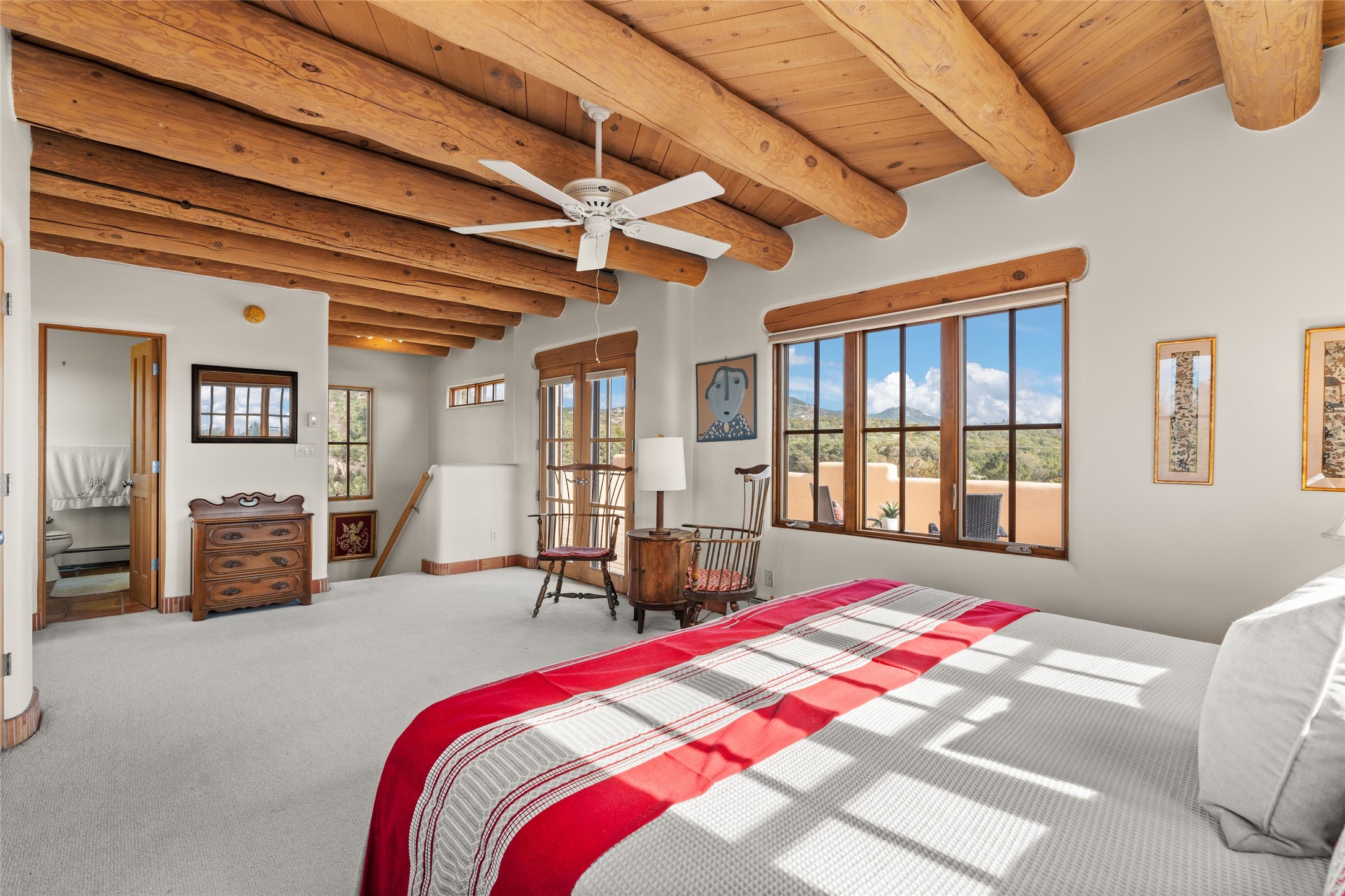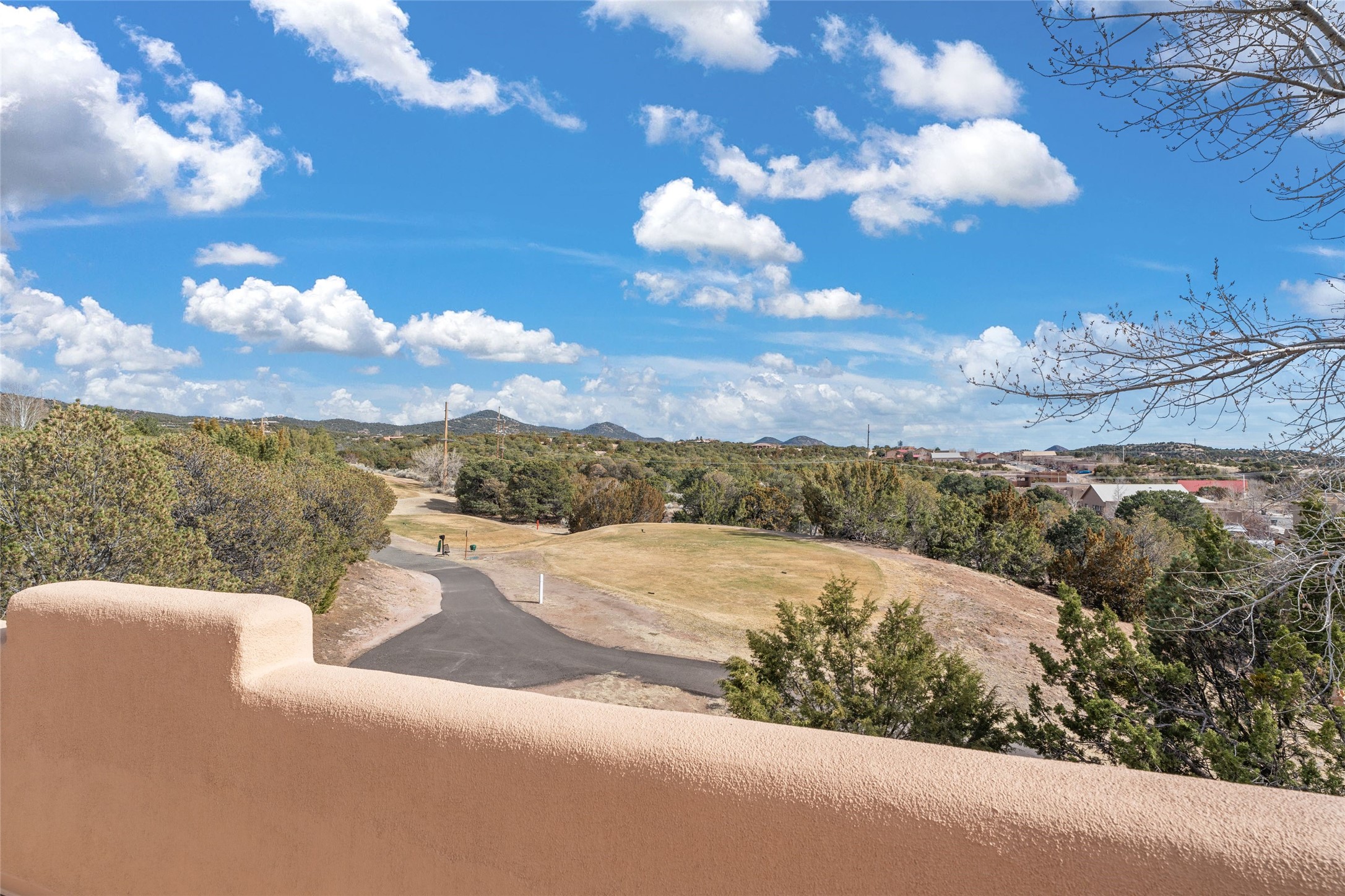 Classic Quail Run Pinon D floorplan featuring Santa Fe Style, great separation of bedrooms and timeless craftsmanship with ample sized rooms, a large kitchen and bright open living room. A serene and flowing space that allows for comfortable indoor living while showcasing spacious terraces that will beckon you outdoors. Tall portal with vigas offers views of the golf course, mountains and those famous Santa Fe skies. The gardens feature 30 specimen roses. This oversized outdoor space is ideal for entertaining. Upstairs there is a large sun flooded room that can be used as a bedroom or study. It includes an adjoining bathroom and outdoor deck with expansive scenery. Quintessential style that embodies Santa Fe beauty on the inside and out. If you are looking for a fabulous community with 24 hour hosted security and countless amenities as well as social clubs and gatherings, this is your next home! Ownership includes access to a state of the art gym, pool/spa, tennis/pickleball courts, golf, fitness classes and much more; come and see!