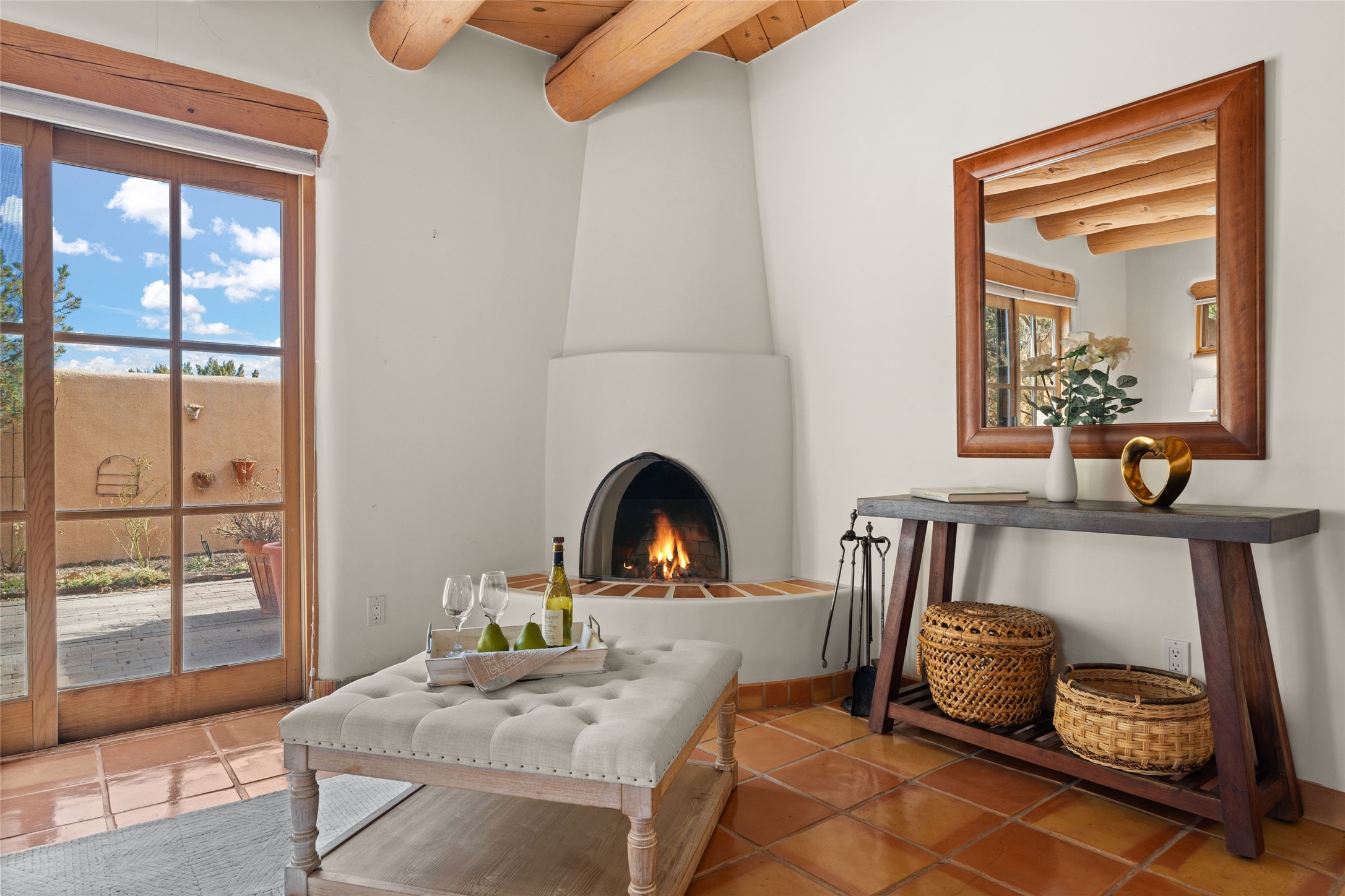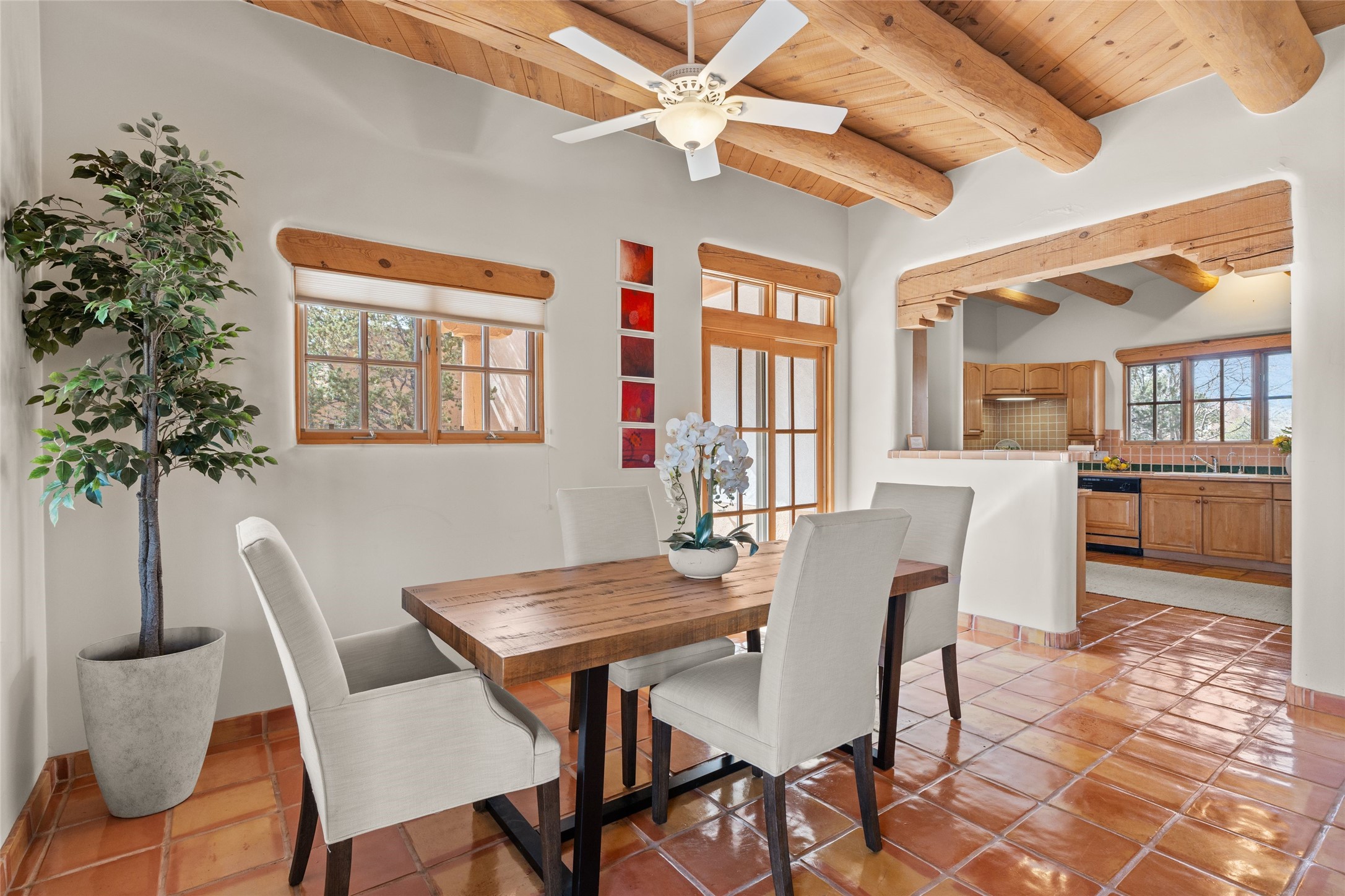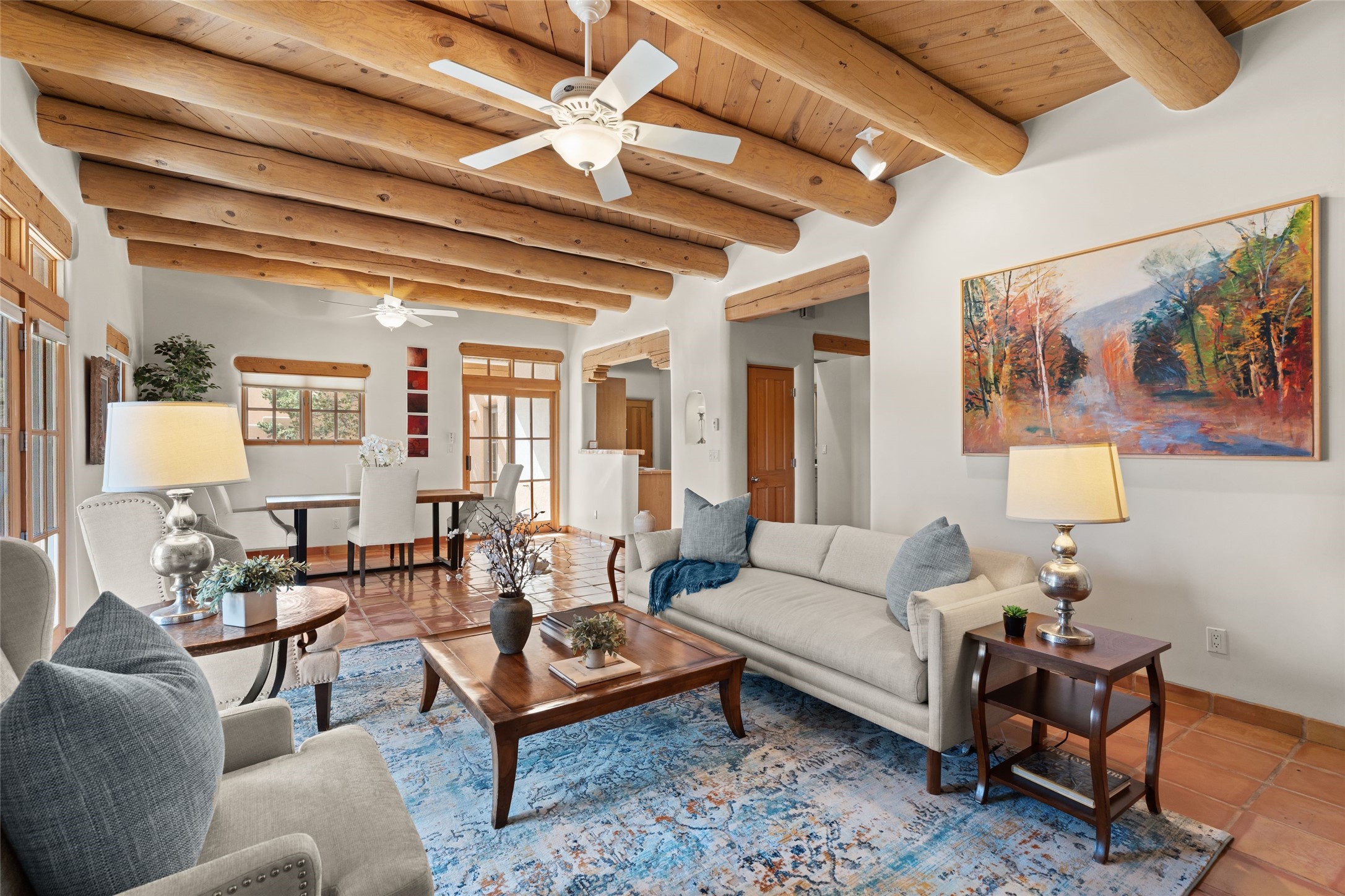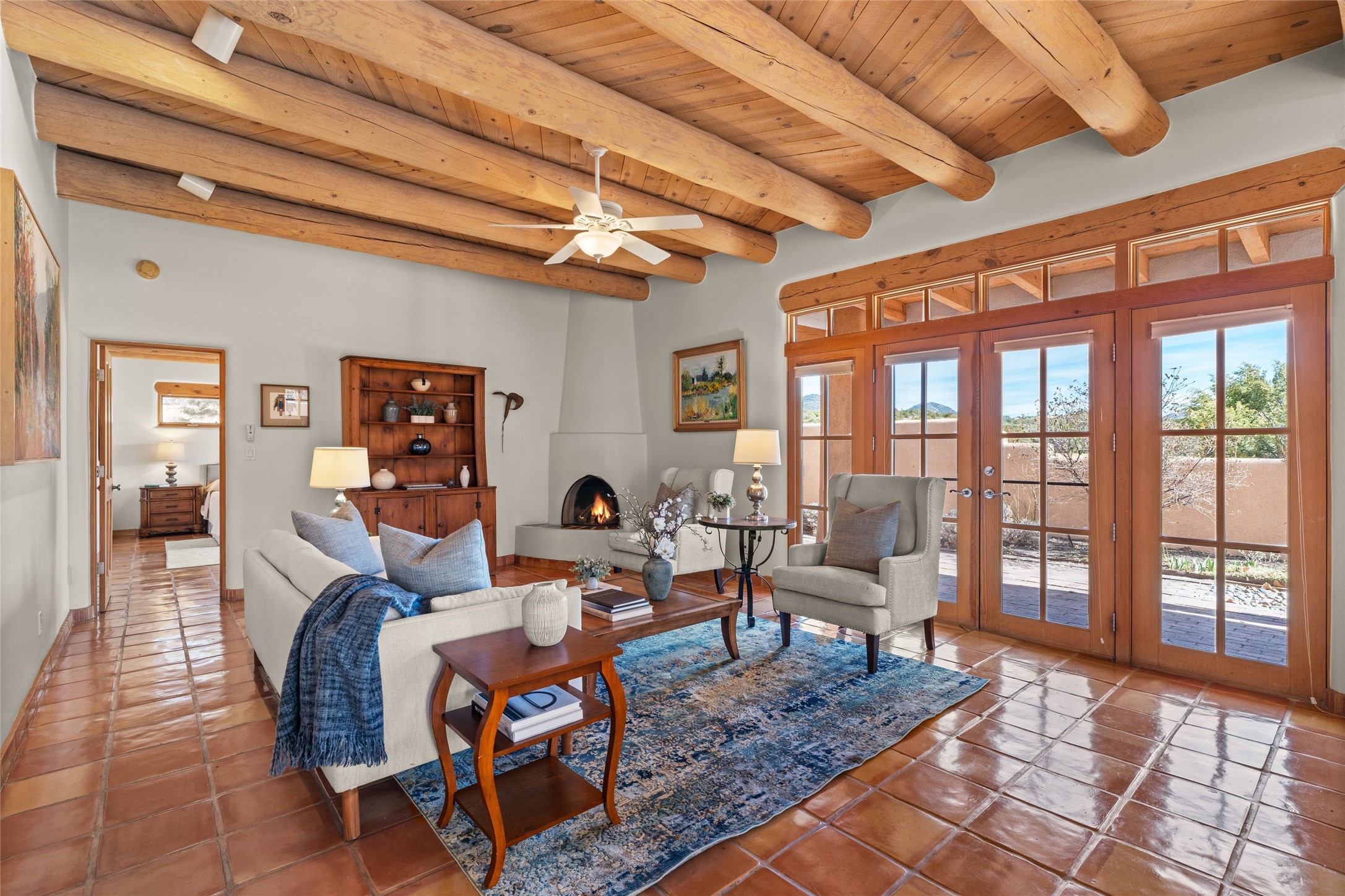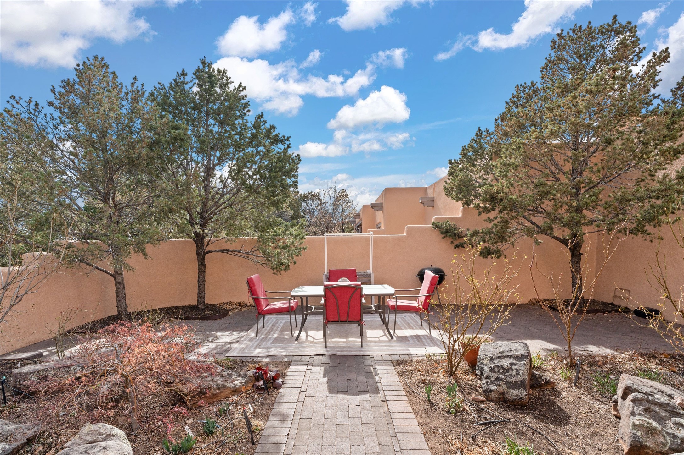 Classic Quail Run Pinon D floorplan featuring Santa Fe Style, great separation of bedrooms and timeless craftsmanship with ample sized rooms, a large kitchen and bright open living room. A serene and flowing space that allows for comfortable indoor living while showcasing spacious terraces that will beckon you outdoors. Tall portal with vigas offers views of the golf course, mountains and those famous Santa Fe skies. The gardens feature 30 specimen roses. This oversized outdoor space is ideal for entertaining. Upstairs there is a large sun flooded room that can be used as a bedroom or study. It includes an adjoining bathroom and outdoor deck with expansive scenery. Quintessential style that embodies Santa Fe beauty on the inside and out. If you are looking for a fabulous community with 24 hour hosted security and countless amenities as well as social clubs and gatherings, this is your next home! Ownership includes access to a state of the art gym, pool/spa, tennis/pickleball courts, golf, fitness classes and much more; come and see!