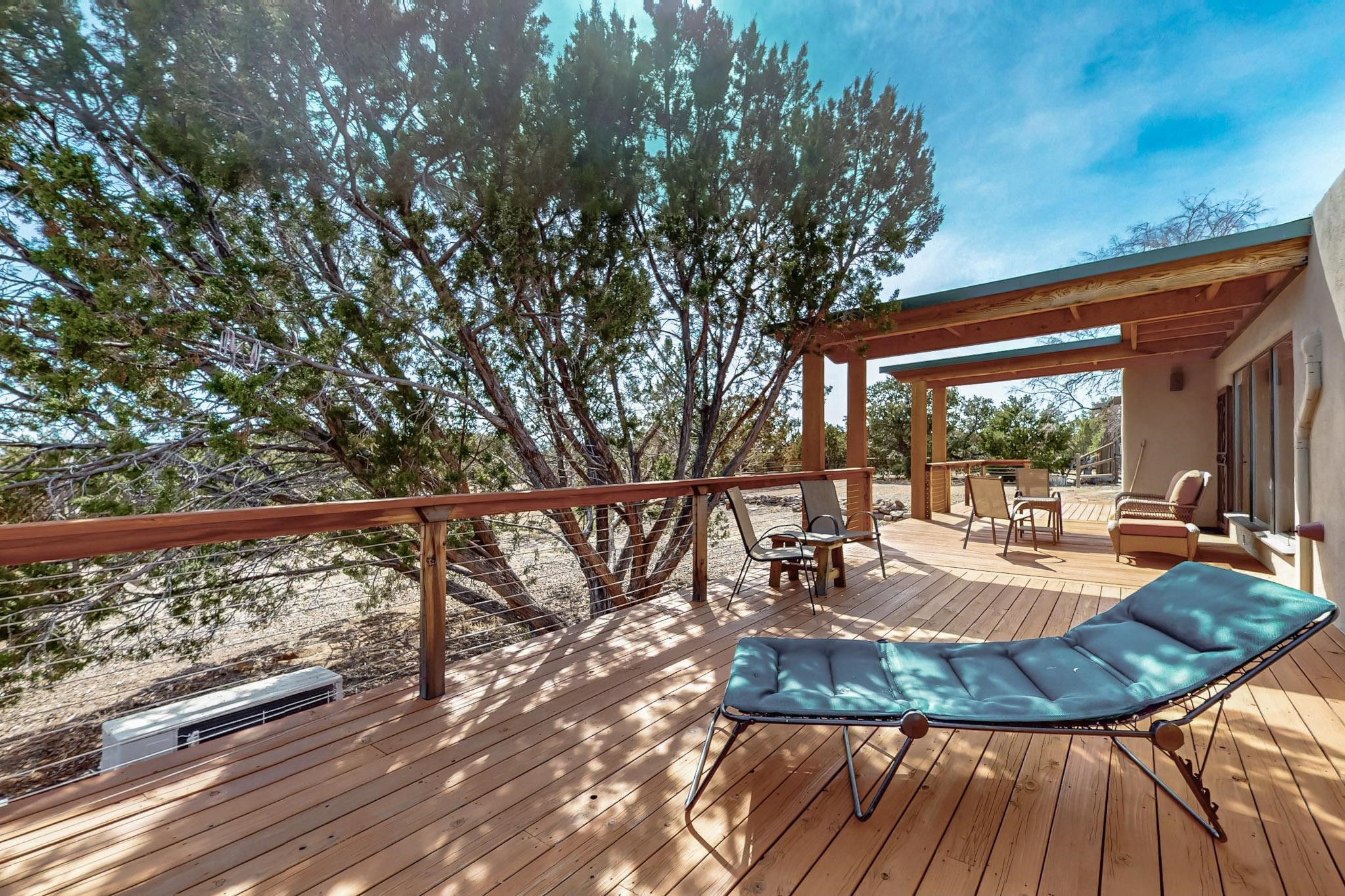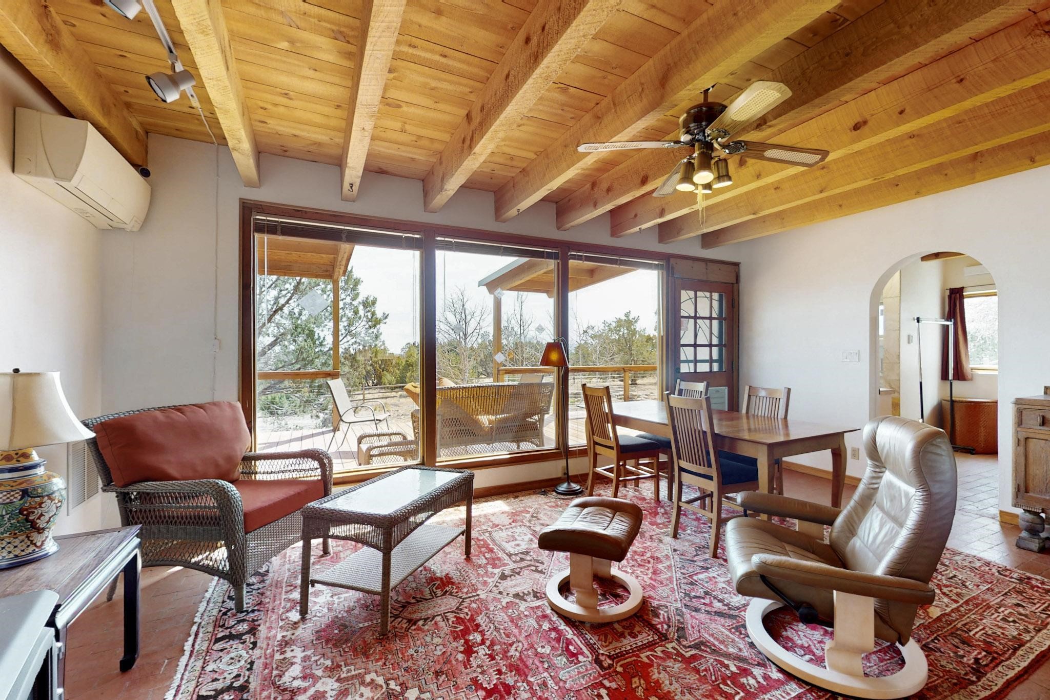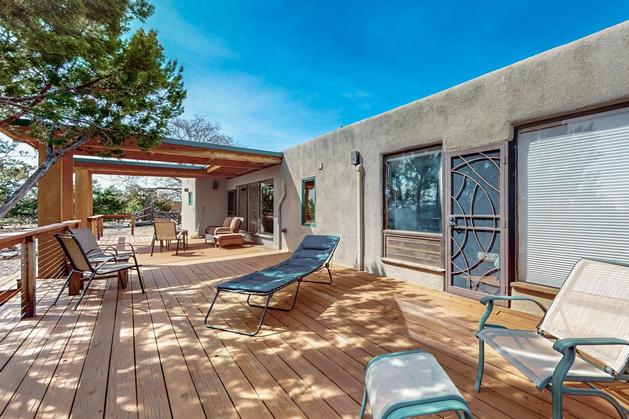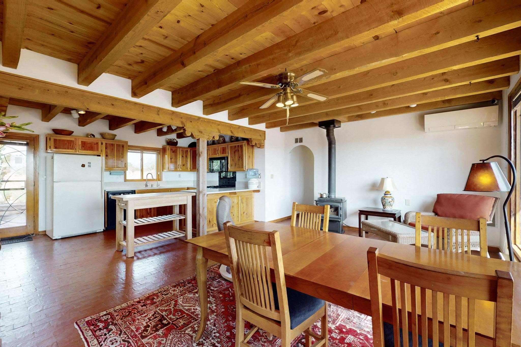Newly priced lovely remodeled pueblo farmhouse with gleaming Saltillo tile and brick floors, beam ceilings throughout and long south facing windows for passive solar winter gain. The kitchen was remodeled, also both bathrooms were remodeled in 2021. The main bedroom bathroom has a spa like finish and includes a remodeled laundry area with a new Navien hot water heater in 2021, washer and dryer installed in 2022. Extremely flexible floor plan with two master suites, plus another guest bedroom center by the main living open plan areas. There are two mini splits to cool in the summer and 2 gas Regency stoves installed in 2015 add a cosy winter heat, serviced in 2024. A large deck was installed in 2020 for outside enjoyment, and the 2 car garage which was once used as a workshop has an old woodstove. The roof has been maintained, the private well pump was replaced in 2010, and a Nuvo water filter installed in 2021. There is a large fenced private back yard and plenty of parking space for guests. This home accesses all of Eldorado amenities, close to local shopping, the pub, schools, parks, trails, library and senior center and is only minutes into Santa Fe.
