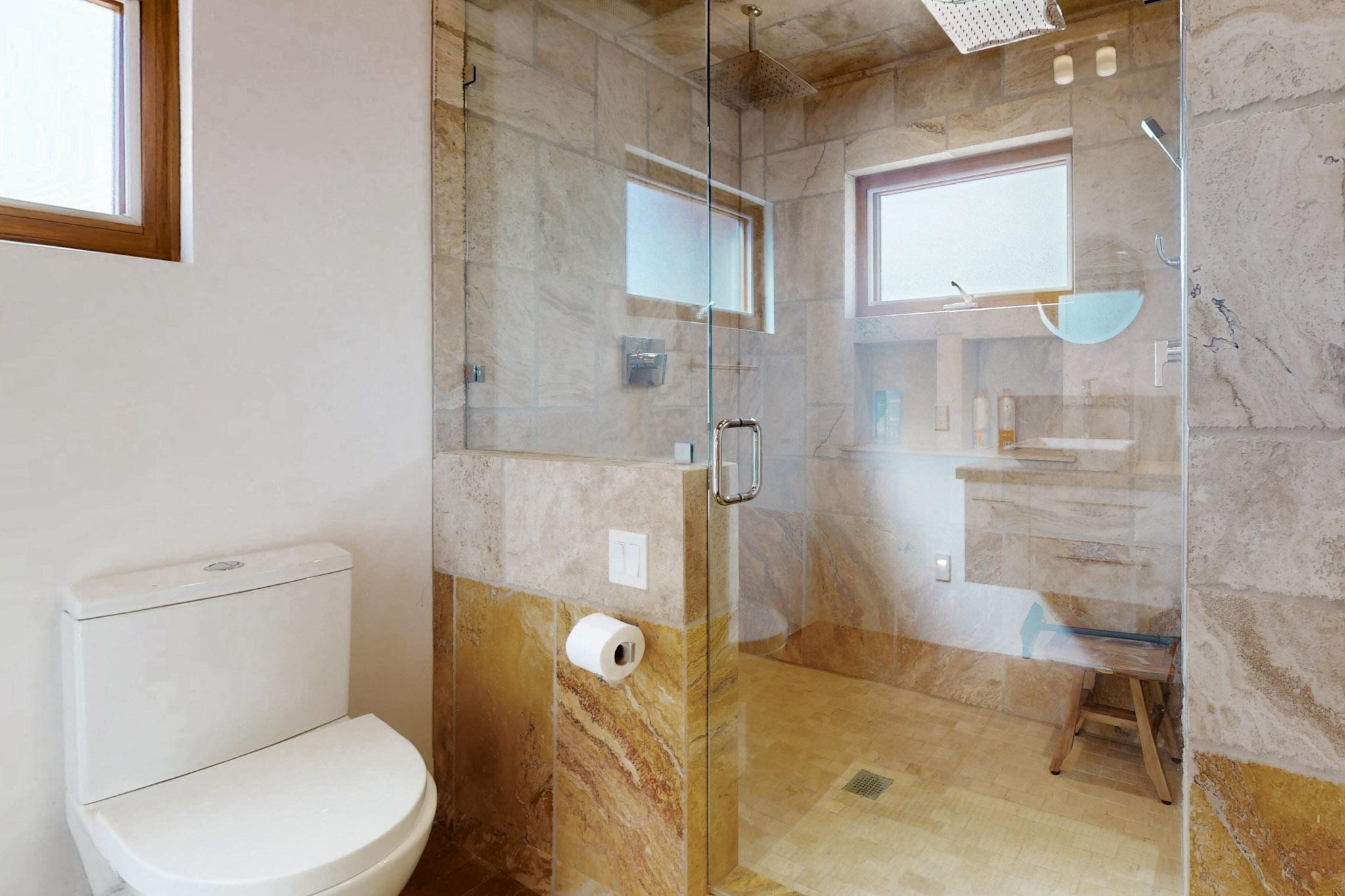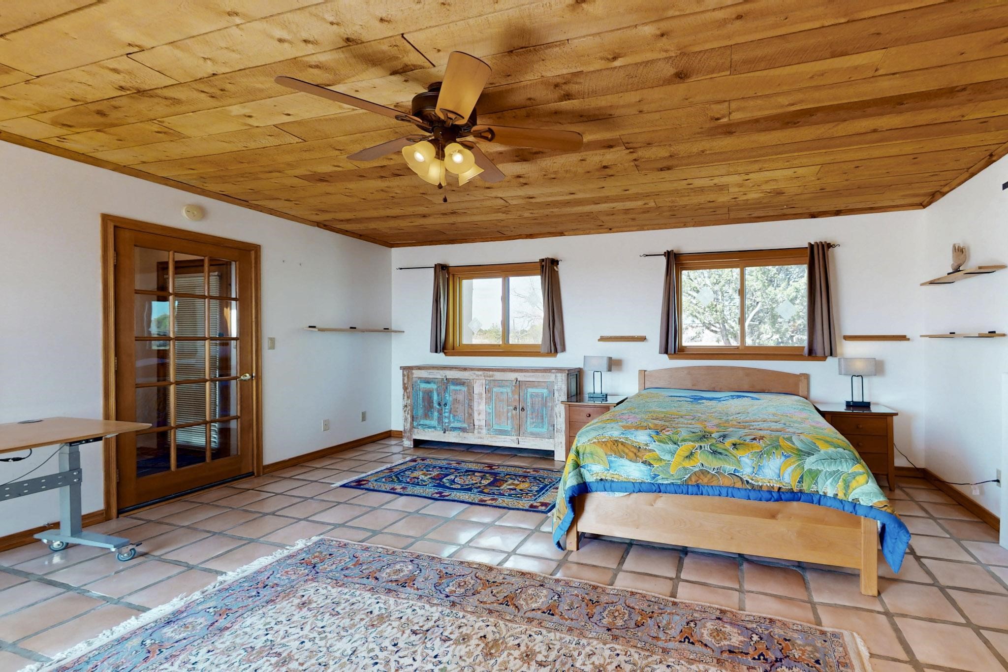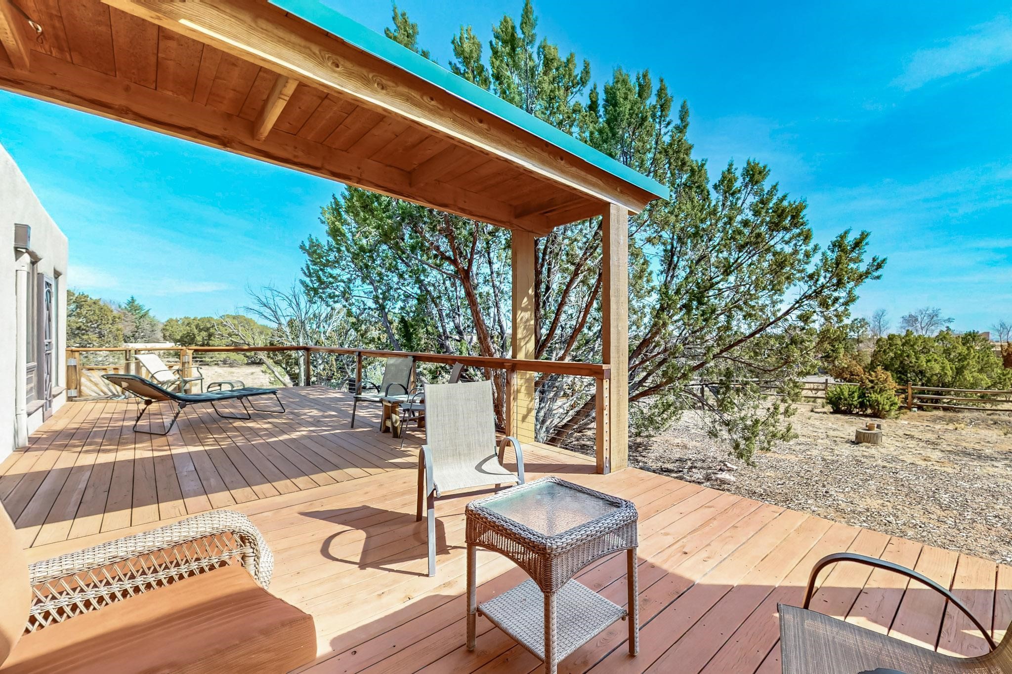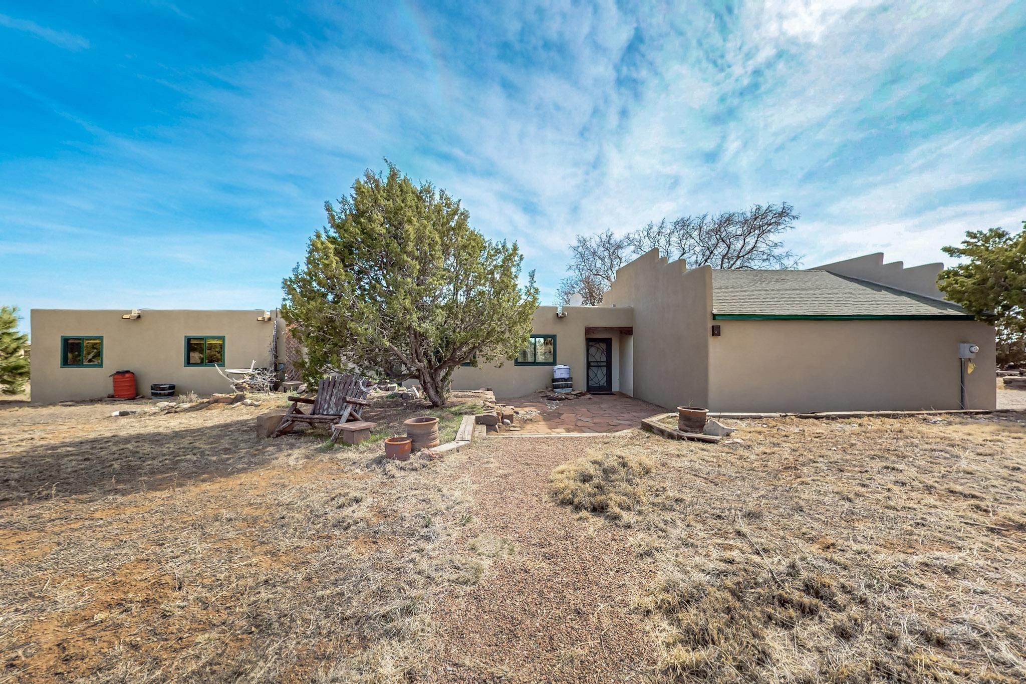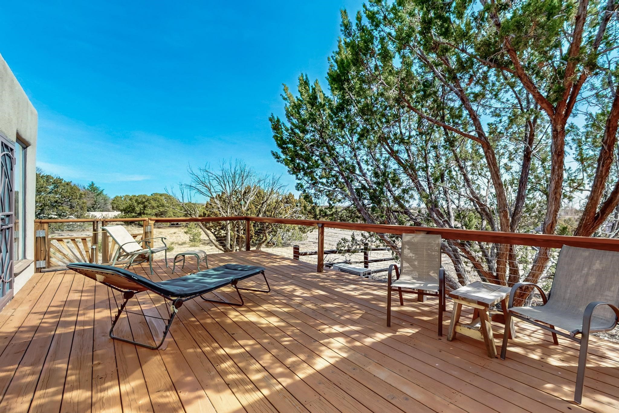 Newly priced lovely remodeled pueblo farmhouse with gleaming Saltillo tile and brick floors, beam ceilings throughout and long south facing windows for passive solar winter gain. The kitchen was remodeled, also both bathrooms were remodeled in 2021. The main bedroom bathroom has a spa like finish and includes a remodeled laundry area with a new Navien hot water heater in 2021, washer and dryer installed in 2022. Extremely flexible floor plan with two master suites, plus another guest bedroom center by the main living open plan areas. There are two mini splits to cool in the summer and 2 gas Regency stoves installed in 2015 add a cosy winter heat, serviced in 2024. A large deck was installed in 2020 for outside enjoyment, and the 2 car garage which was once used as a workshop has an old woodstove. The roof has been maintained, the private well pump was replaced in 2010, and a Nuvo water filter installed in 2021. There is a large fenced private back yard and plenty of parking space for guests. This home accesses all of Eldorado amenities, close to local shopping, the pub, schools, parks, trails, library and senior center and is only minutes into Santa Fe.