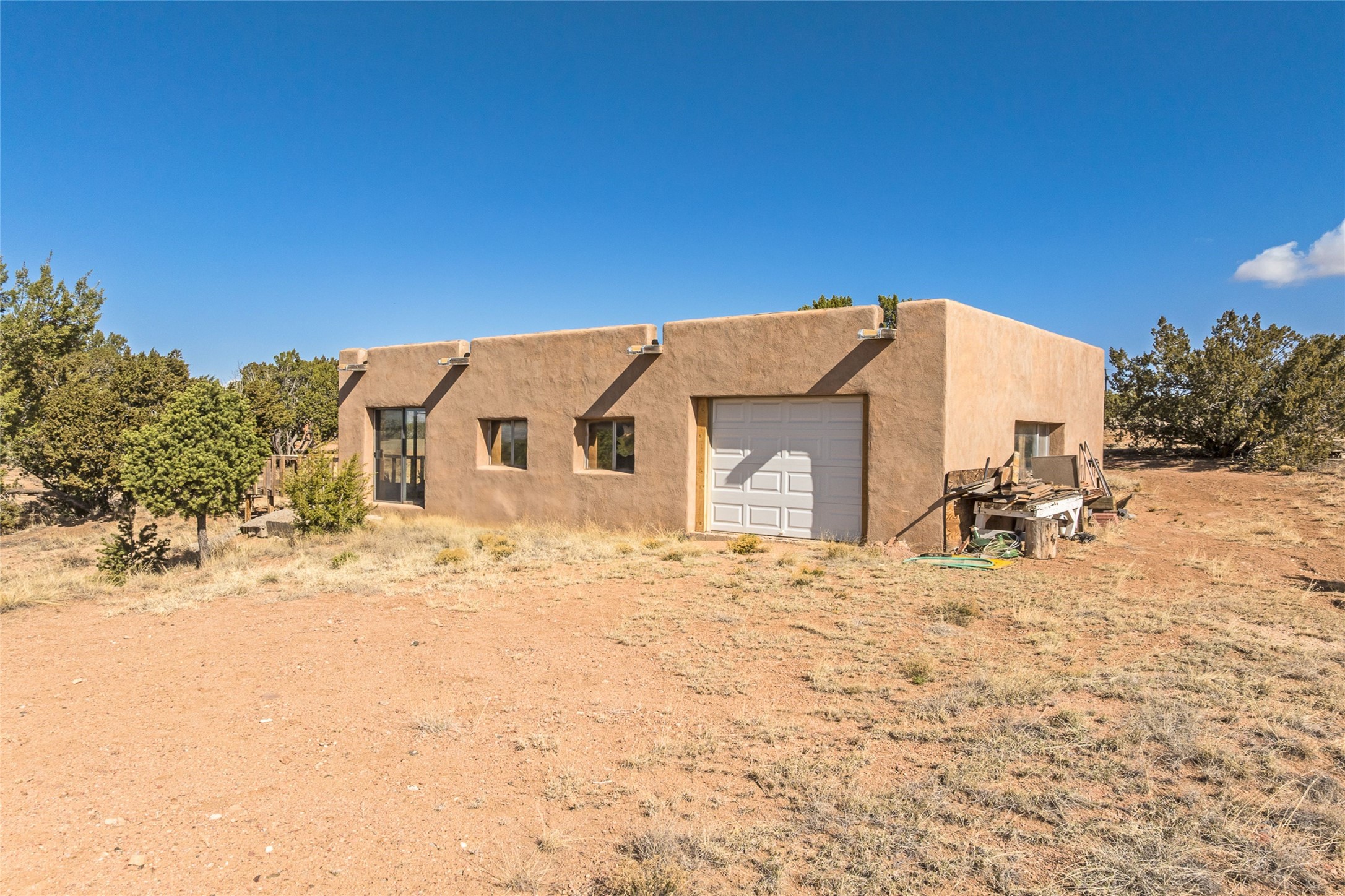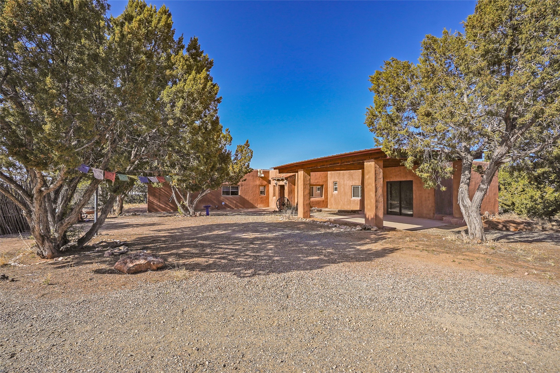 This delightful and versatile property spans over 10 acres and horses are allowed. It features a spacious main house with an attached apartment and a detached garage/workshop. Tucked away from the road for enhanced privacy, the property offers stunning views of the surrounding mountains. Enjoy the Ortiz mountains from the south-facing covered portal or the great-room windows. The kitchen has been recently remodeled with Quartzite countertops, new appliances, and a large center island that opens to a warm and inviting living space with a cozy wood stove. Situated in the historic San Marcos Pueblo area, and just off the Turquoise Trail Scenic Byway, the property provides easy access to Santa Fe and Albuquerque. The main house and roof have added fire-protection features, which also adds additional insulation. The detached workshop, equipped with a bay door, serves as an excellent studio space or garage, complete with power and a wood stove for heating.