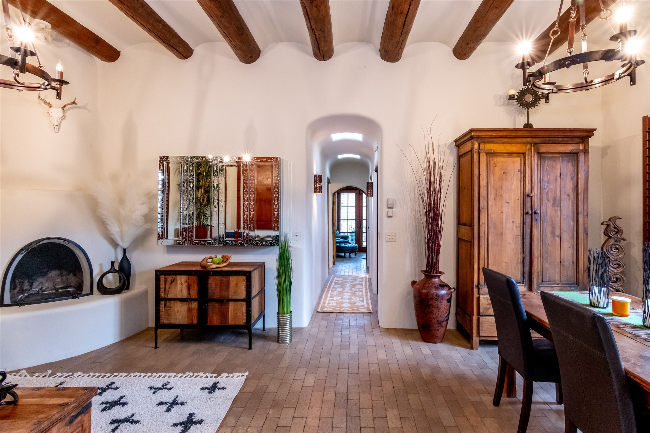 Experience timeless charm on Santa Fe's Historic Palace Avenue, where centuries-old trees frame this dream-come-true freestanding home in the prestigious East Side Neighborhood. Located behind curbside homes, surrounded by hidden courtyards and mature fruit trees, there is an oasis of privacy. At this prime location, enjoy being two blocks from the galleries and restaurants of Canyon Road, taking morning nature walks on the trails of the Santa Fe River Park, and easy access to downtown. This modern adobe-style home boasts beautifully coved high viga ceilings, a kiva fireplace, local brick floors, and hand plastered walls in the living area. Custom reclaimed wood doors open to each room and French doors in the second bedroom or office open to the private courtyards. The kitchen features custom cabinetry, butcher block countertops, Kitchen Aid stainless steel appliances and new Kohler fixtures. In the dual basin bath, there are contemporary slate tiles, new Kohler fixtures, and a new Toto toilet. Other updates include custom wood window coverings, three Fujitsu mini splits, baseboard heaters, a new 50-gallon Rheem water heater, and a new sewer line. This elegant cozy adobe is offered turn-key ready, it is freshly painted with designer curated furnishings, simply inquire if interested (some personal items excluded). No HOA.