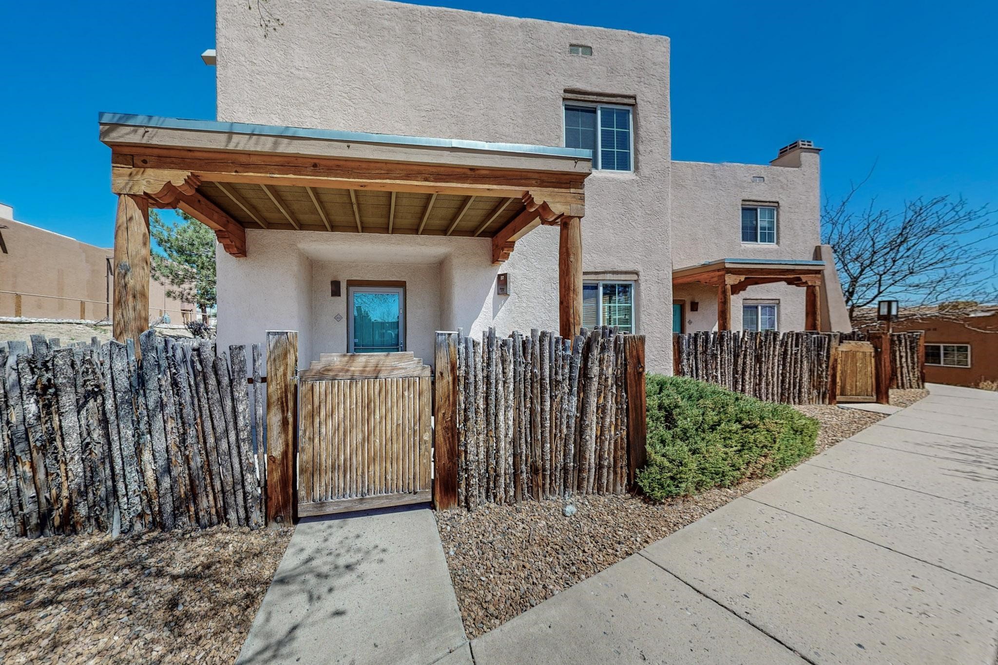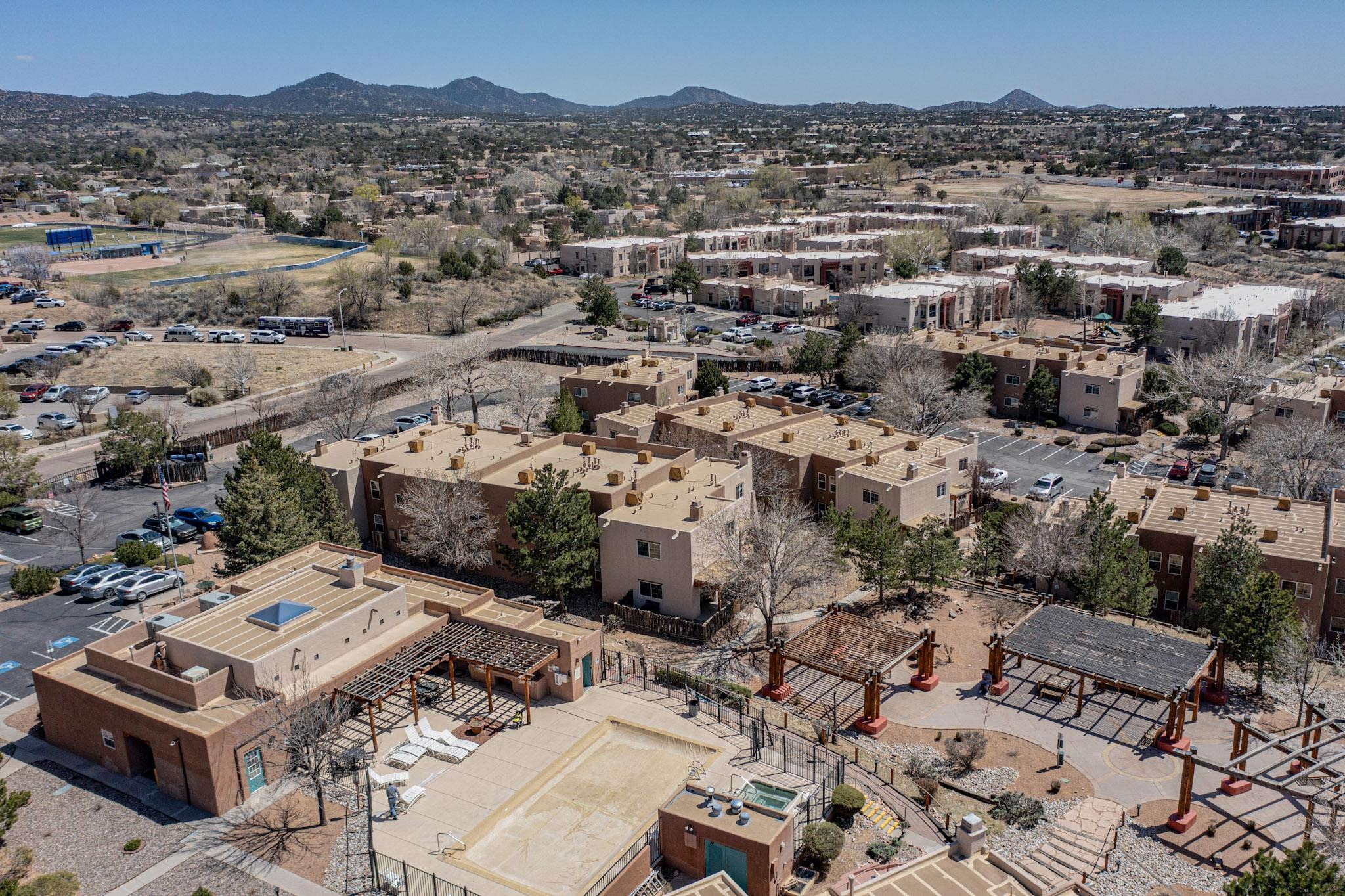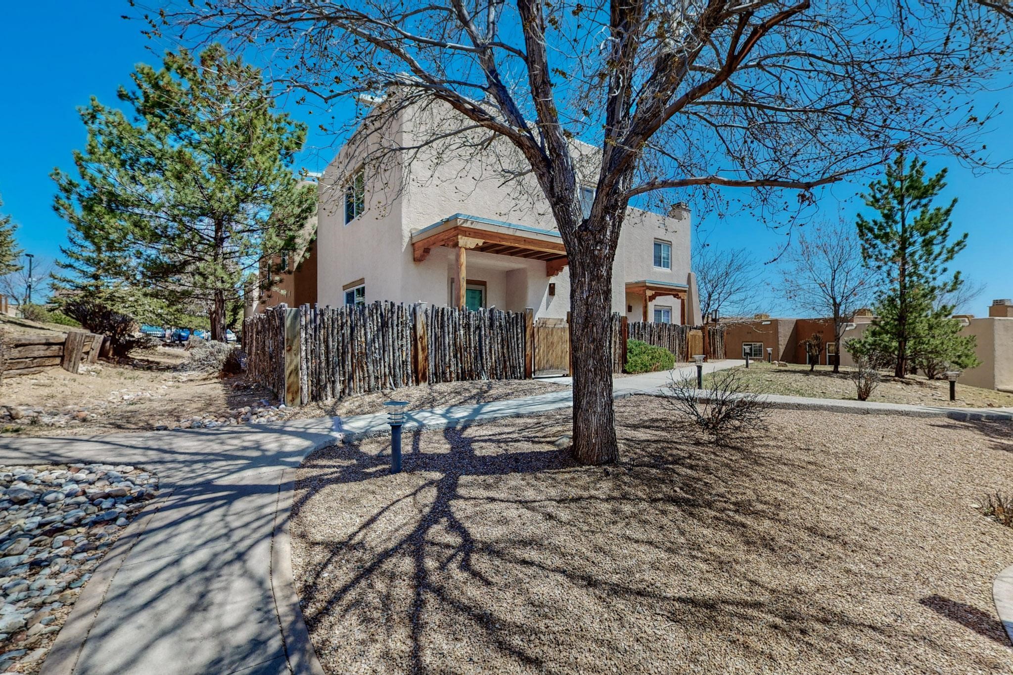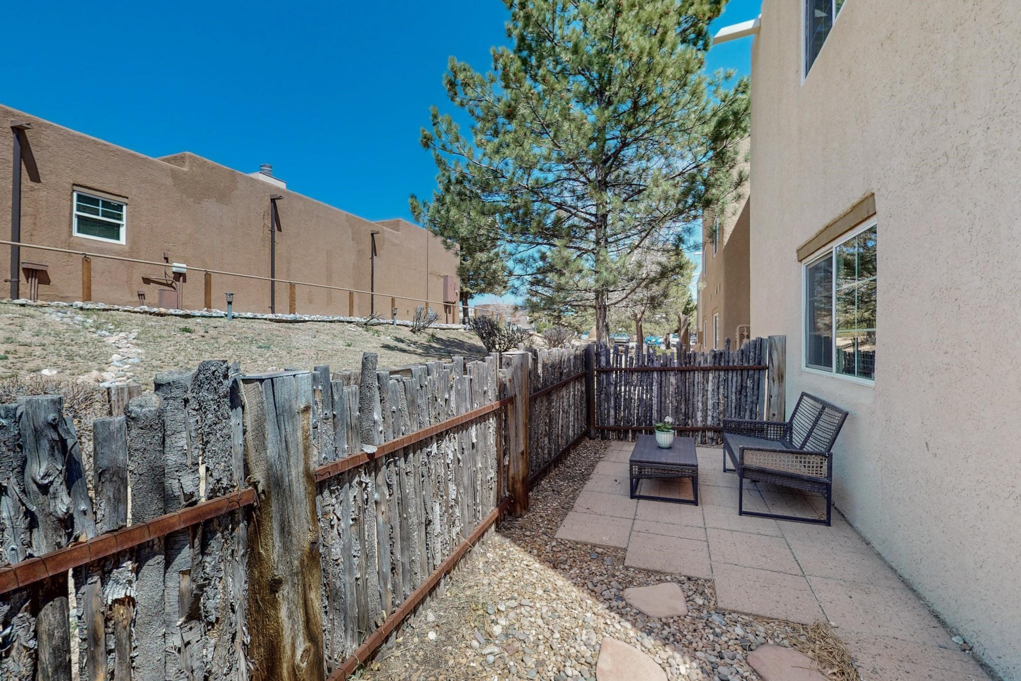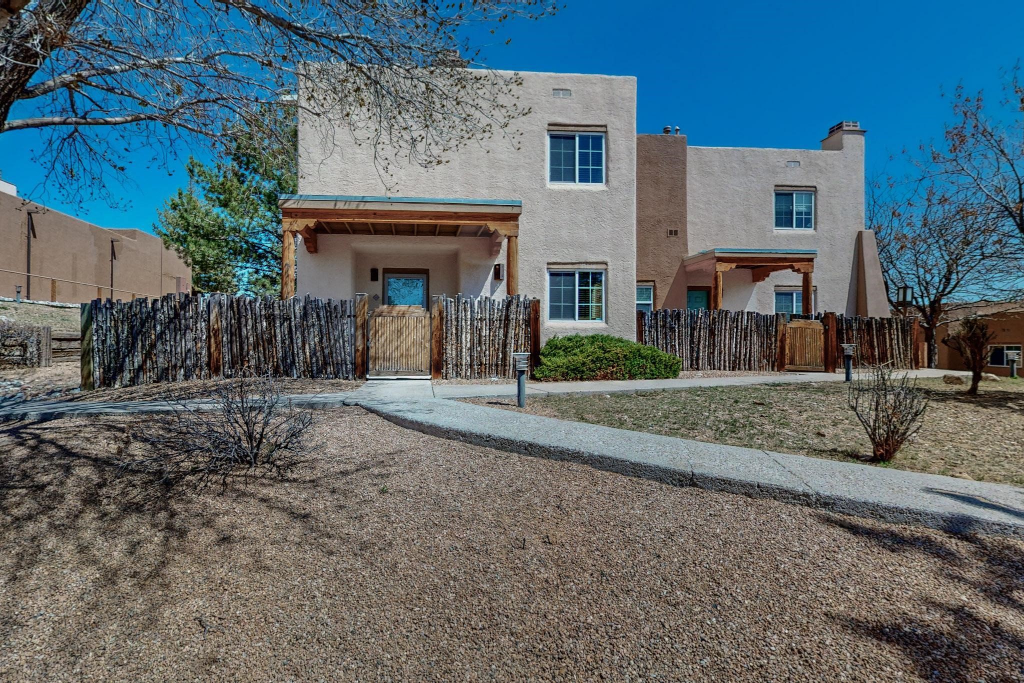 Welcome home to this wonderful, deluxe, end unit, in well maintained Dos Santos! Freshly painted with 2 bedrooms, 2 baths, 950+/- square feet, stainless steel appliances in the kitchen, with Saltillo tile floors and carpet in the bedrooms. This corner unit has a front and side yard located right next to the community area with BBQ grills, the pool and hot tub and the clubhouse! Enjoy this well maintained complex that also includes a dog park and water/sewer that's included in your HOA fees. Schedule your showing today - you won't be disappointed!
