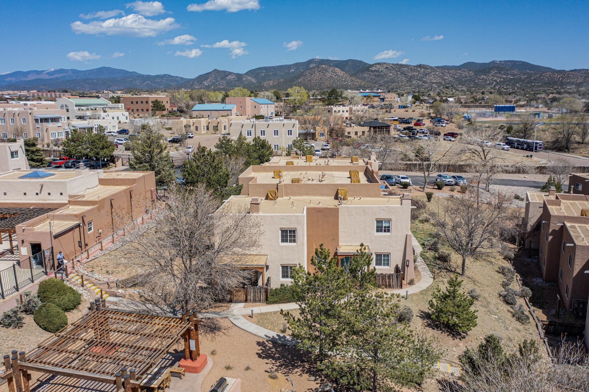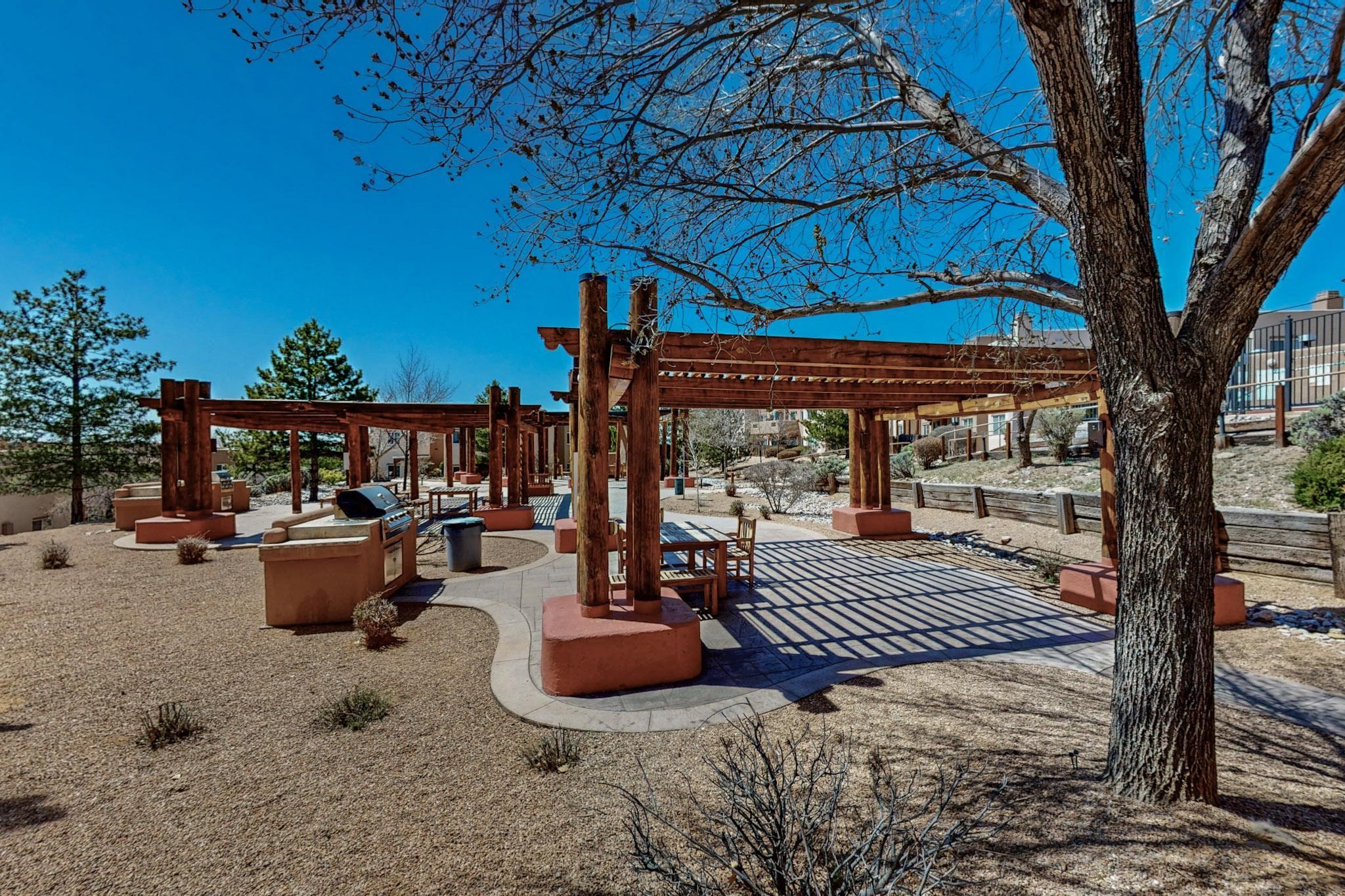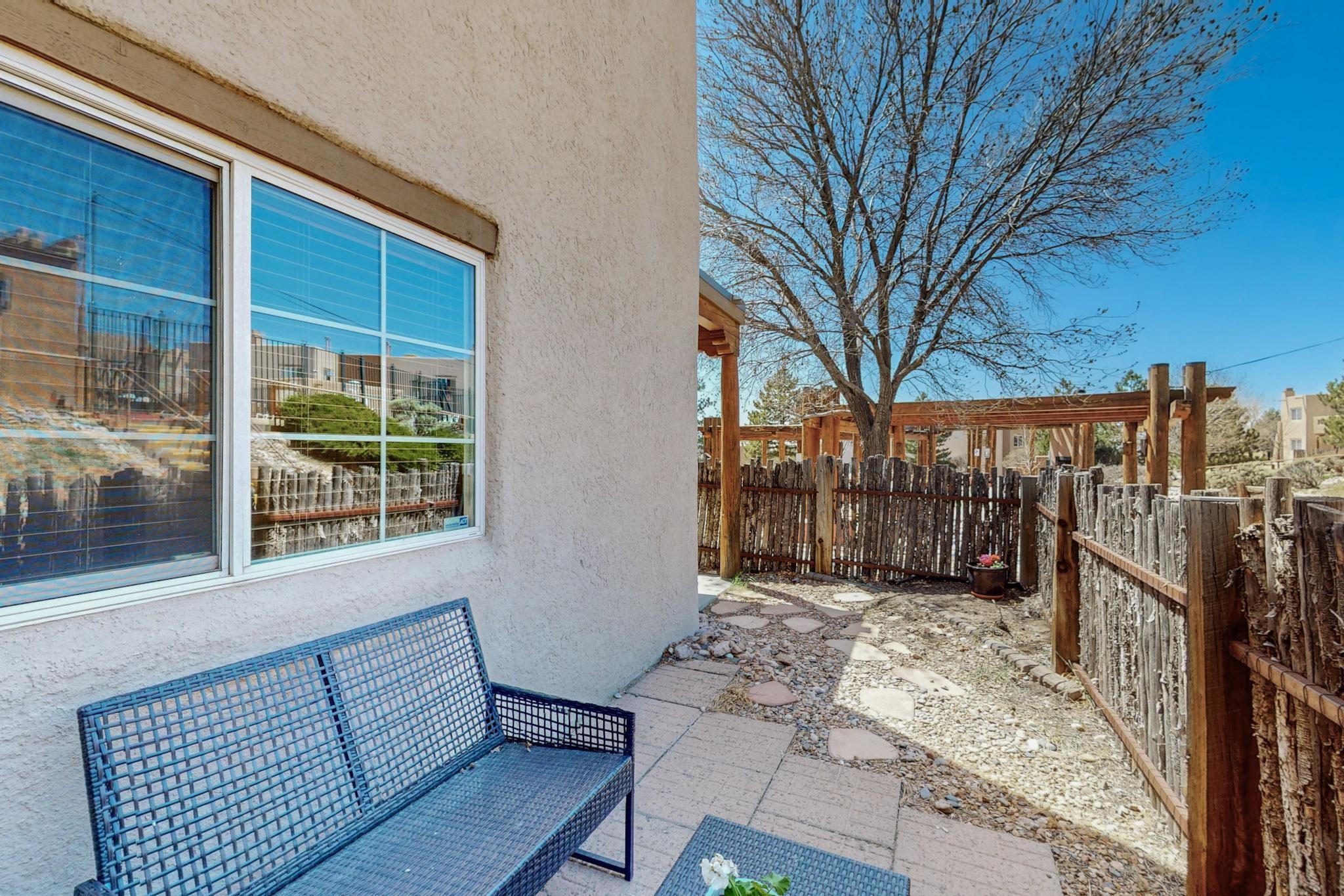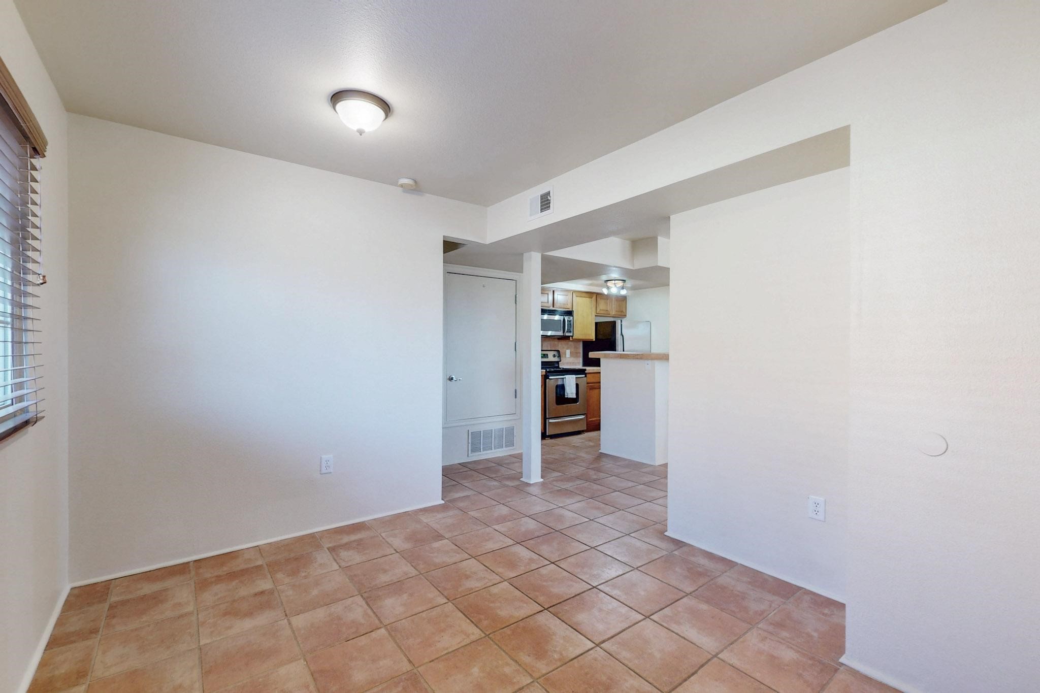 Welcome home to this wonderful, deluxe, end unit, in well maintained Dos Santos! Freshly painted with 2 bedrooms, 2 baths, 950+/- square feet, stainless steel appliances in the kitchen, with Saltillo tile floors and carpet in the bedrooms. This corner unit has a front and side yard located right next to the community area with BBQ grills, the pool and hot tub and the clubhouse! Enjoy this well maintained complex that also includes a dog park and water/sewer that's included in your HOA fees. Schedule your showing today - you won't be disappointed!