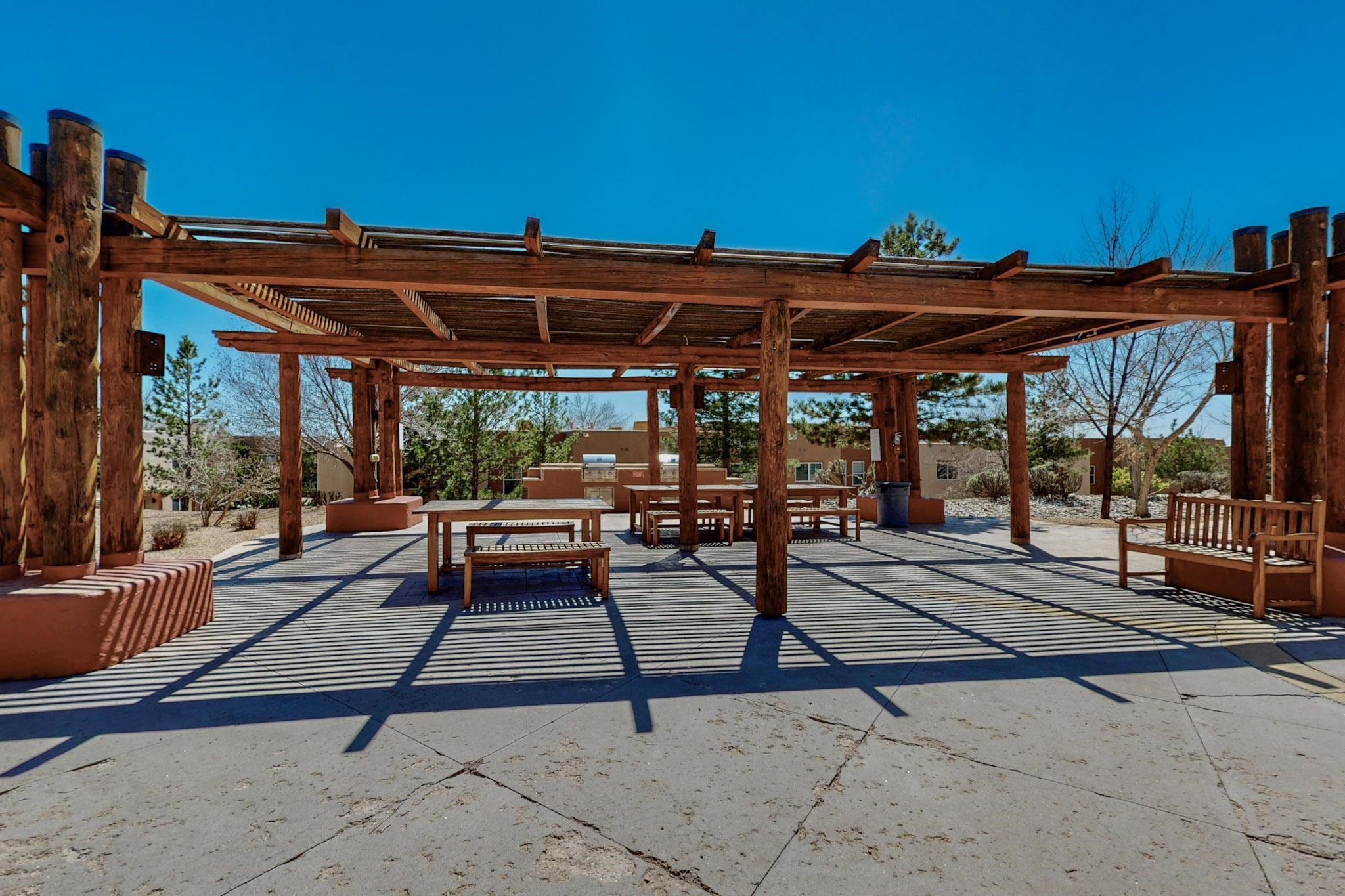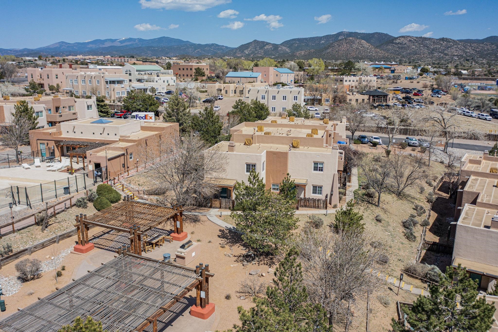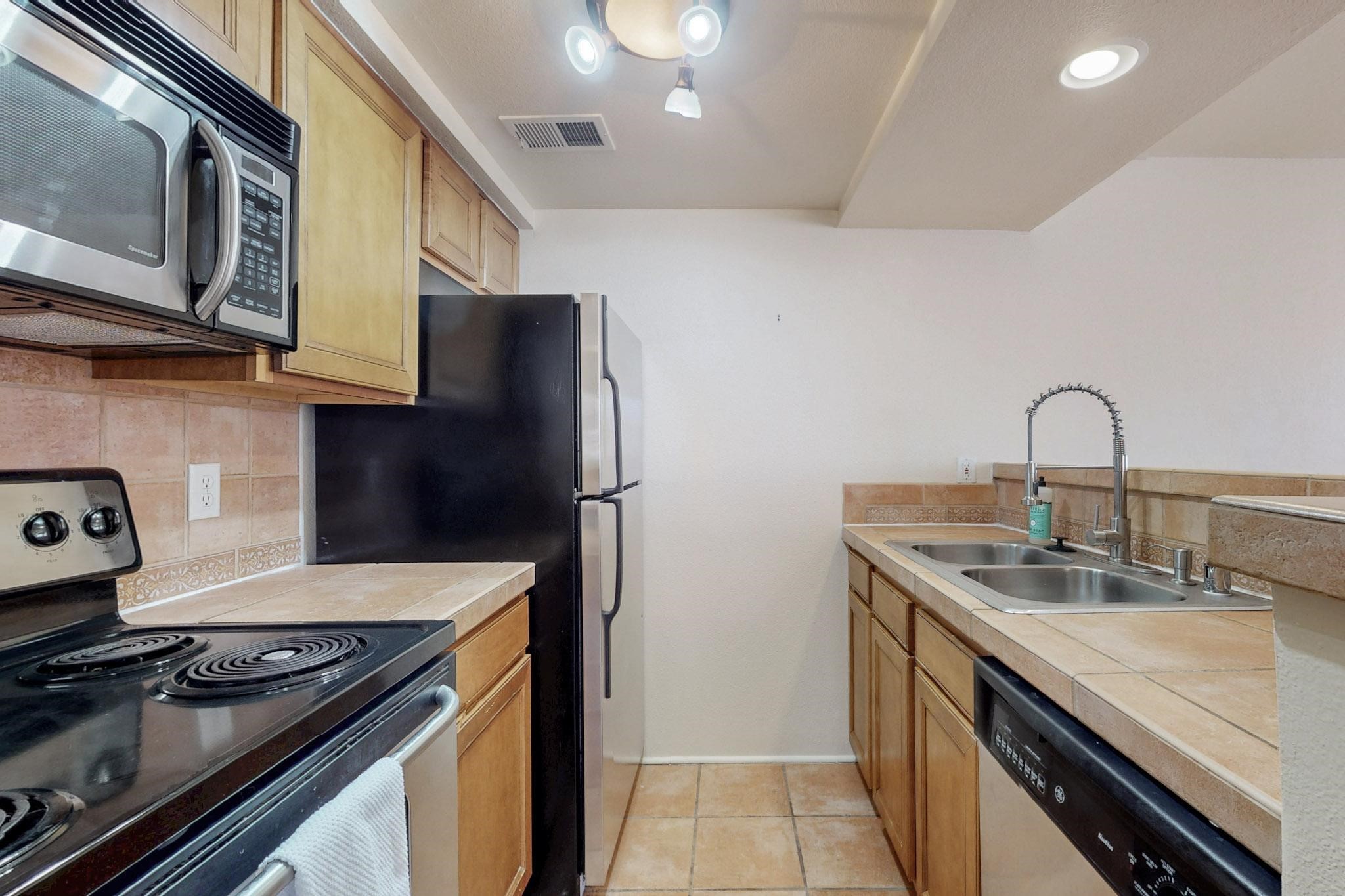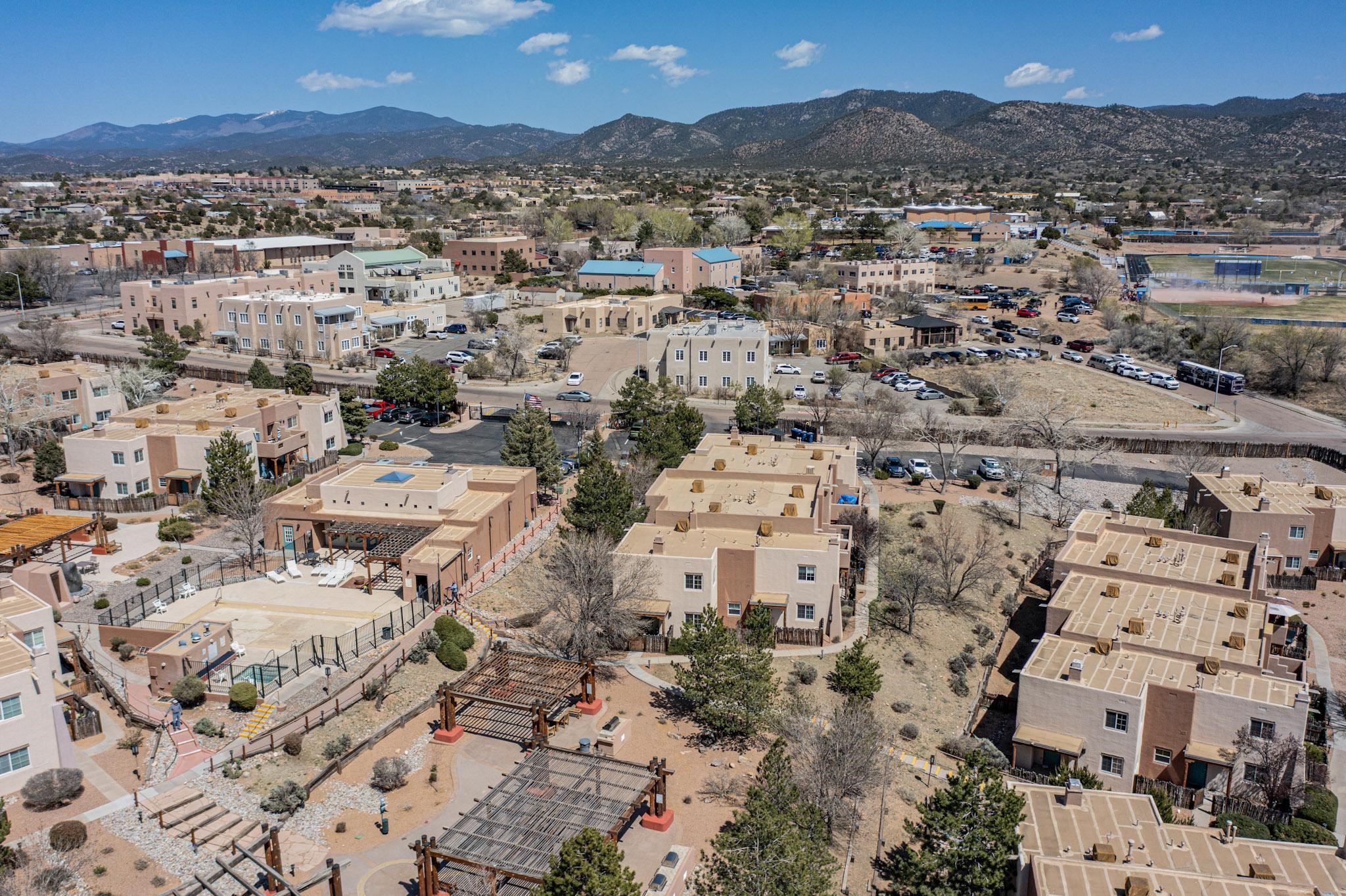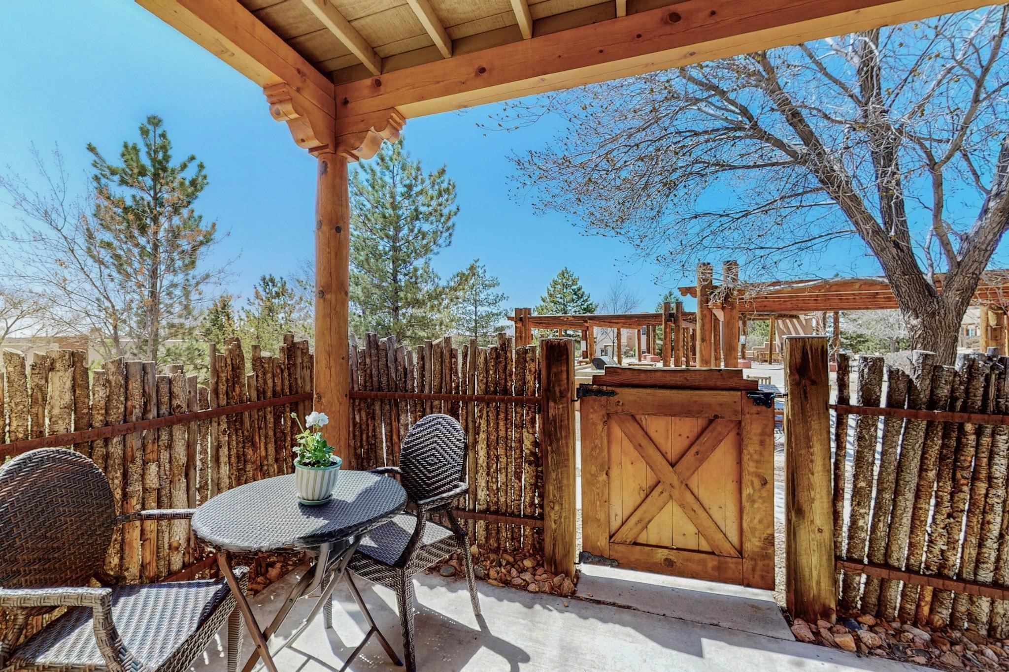 Welcome home to this wonderful, deluxe, end unit, in well maintained Dos Santos! Freshly painted with 2 bedrooms, 2 baths, 950+/- square feet, stainless steel appliances in the kitchen, with Saltillo tile floors and carpet in the bedrooms. This corner unit has a front and side yard located right next to the community area with BBQ grills, the pool and hot tub and the clubhouse! Enjoy this well maintained complex that also includes a dog park and water/sewer that's included in your HOA fees. Schedule your showing today - you won't be disappointed!