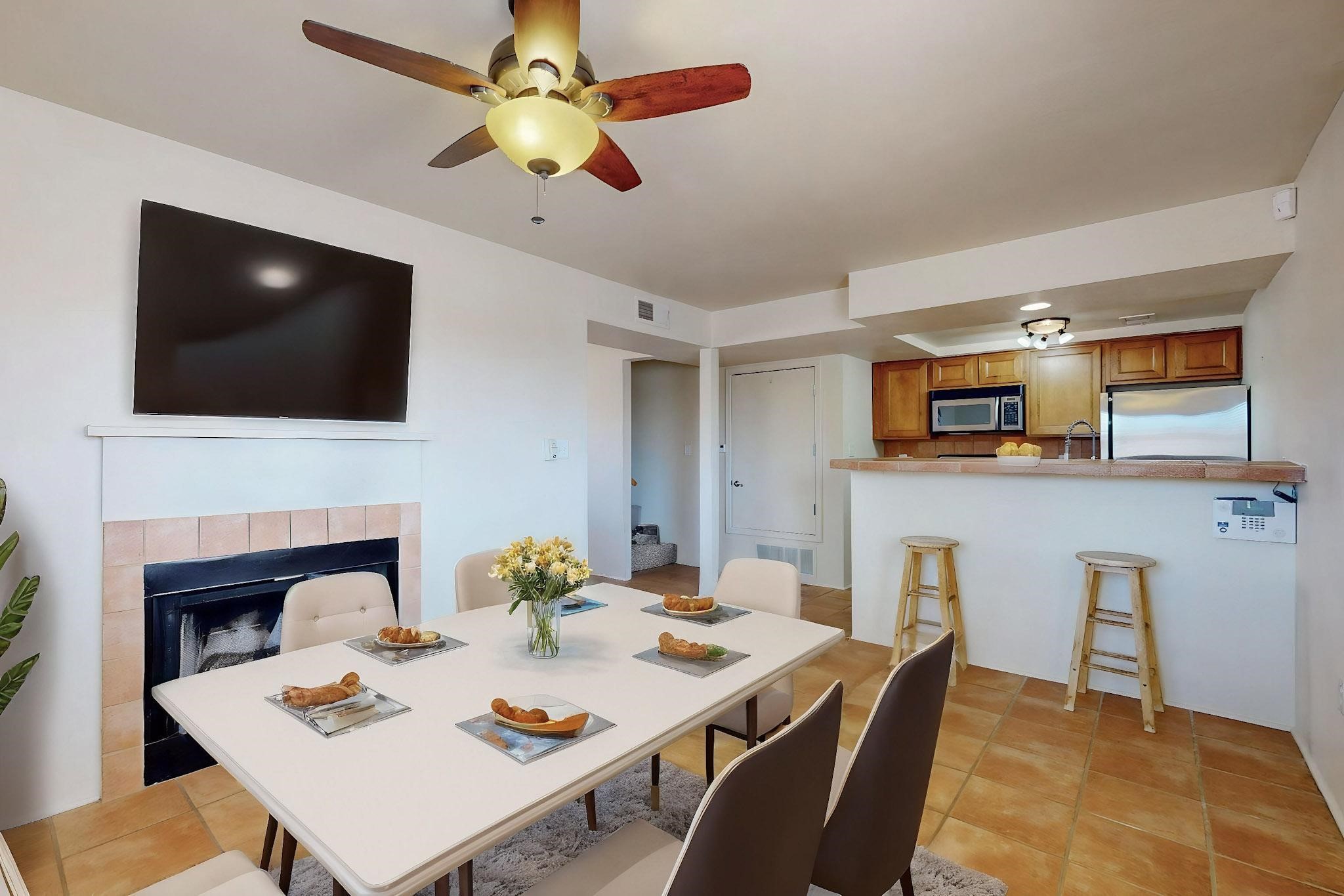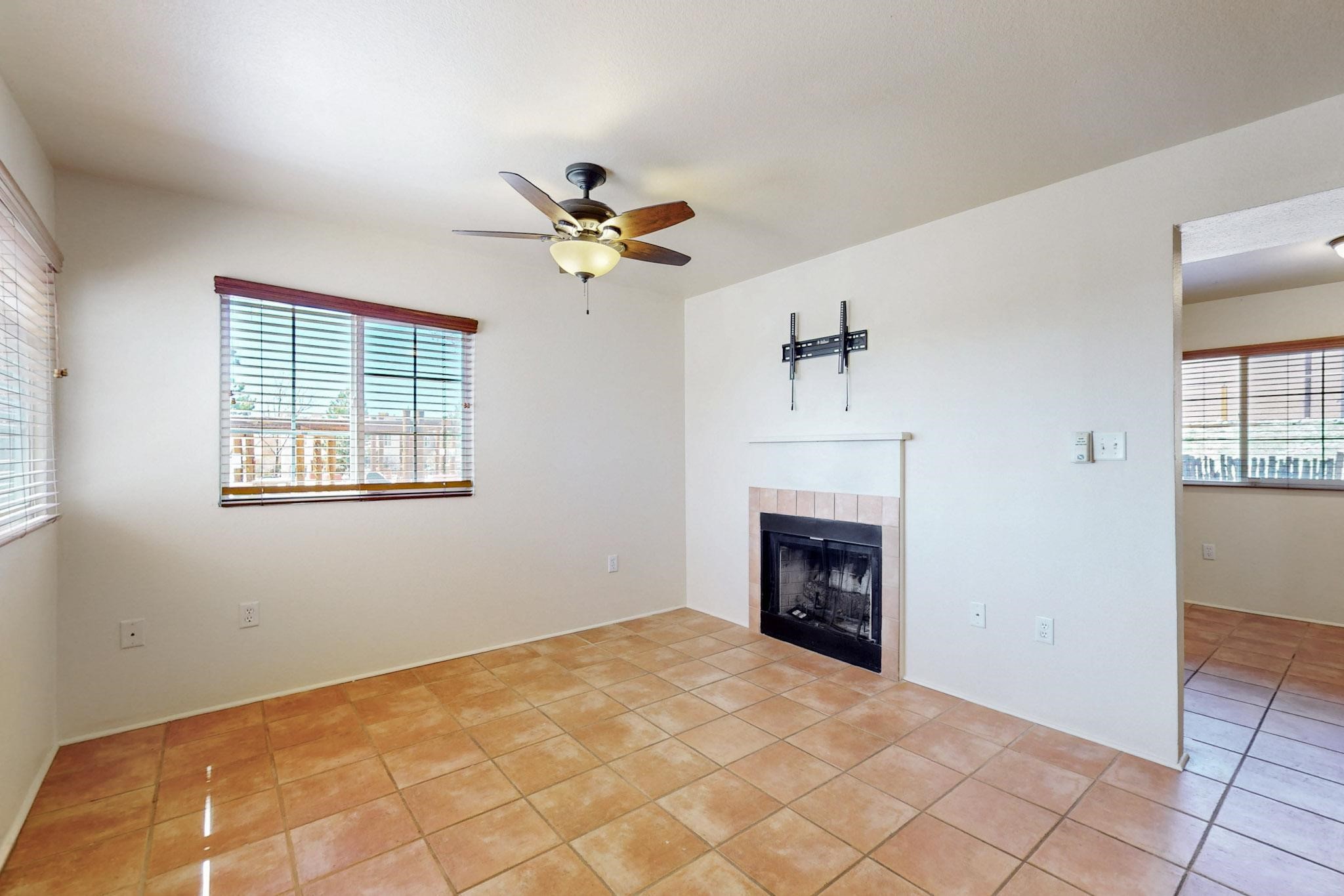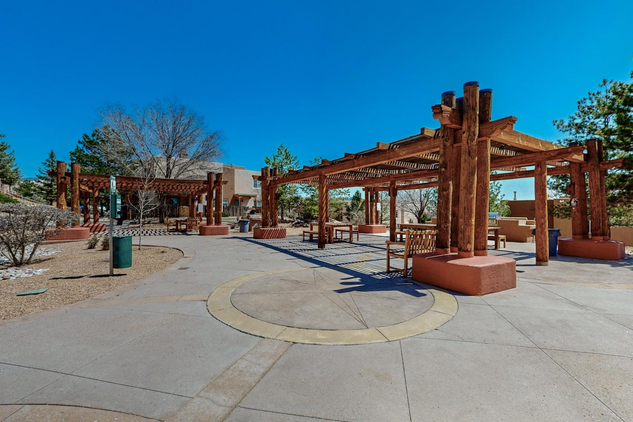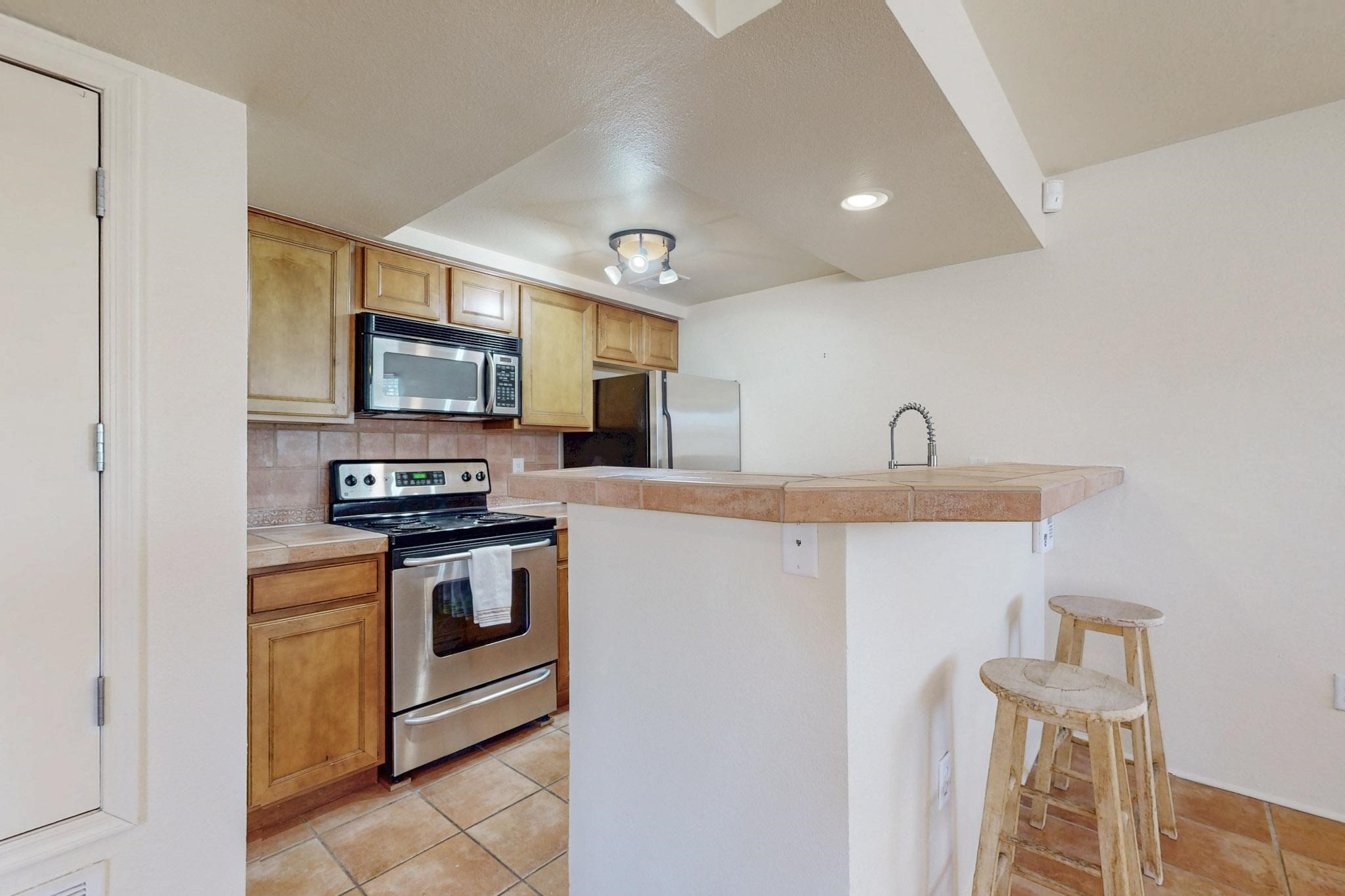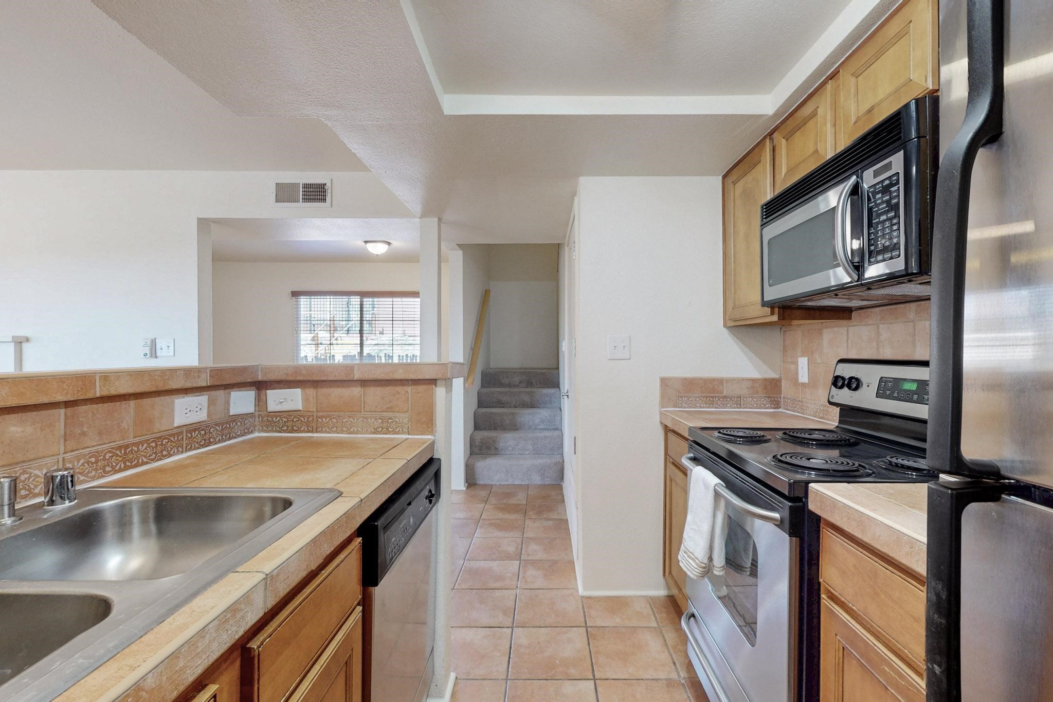 Welcome home to this wonderful, deluxe, end unit, in well maintained Dos Santos! Freshly painted with 2 bedrooms, 2 baths, 950+/- square feet, stainless steel appliances in the kitchen, with Saltillo tile floors and carpet in the bedrooms. This corner unit has a front and side yard located right next to the community area with BBQ grills, the pool and hot tub and the clubhouse! Enjoy this well maintained complex that also includes a dog park and water/sewer that's included in your HOA fees. Schedule your showing today - you won't be disappointed!
