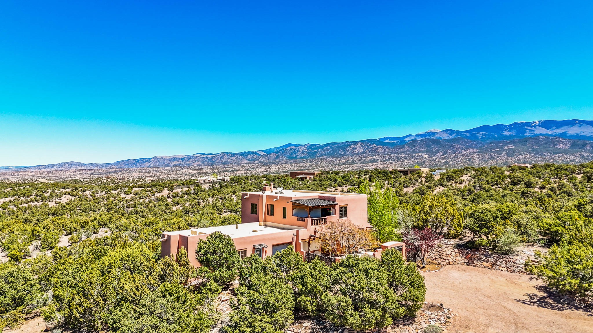 True to its name, 22 Loma Serena--"Serene Hill"--offers a peaceful hilltop retreat with some of the most breathtaking views in Santa Fe. Located in the desirable Tano Road area, this 2,508-square-foot home sits on 4.55 private acres, surrounded by pion trees and big New Mexico skies. You'll enjoy panoramic views of the Sangre de Cristos, Jemez Mountains, Badlands, and beyond all the way to Colorado. Built with classic Southwestern charm, the home features warm wood beams and vigas, colorful Talavera and Saltillo tile, beautiful hardwood floors, and cozy kiva fireplaces. The open floorplan flows easily and is filled with natural light. There are three spacious bedrooms, including two upstairs suites with private decks, and four bathrooms--one full and three baths--giving everyone space and privacy. The welcoming kitchen, bright living and dining areas, and large windows bring the outdoors in, while the Eastside flagstone patio is perfect for soaking up the crisp Santa Fe air. A gated courtyard, sunny stone patio, direct-entry one-car garage, and a private guest suite with its own entrance add even more flexibility and comfort. In addition the property was reroofed in 2019, new HVAC installed 2022 and re-stuccoed in 2023. Whether you're looking for a serene full-time home or a peaceful getaway to gather with family and friends, 22 Loma Serena is the kind of place that just feels good to come home to.