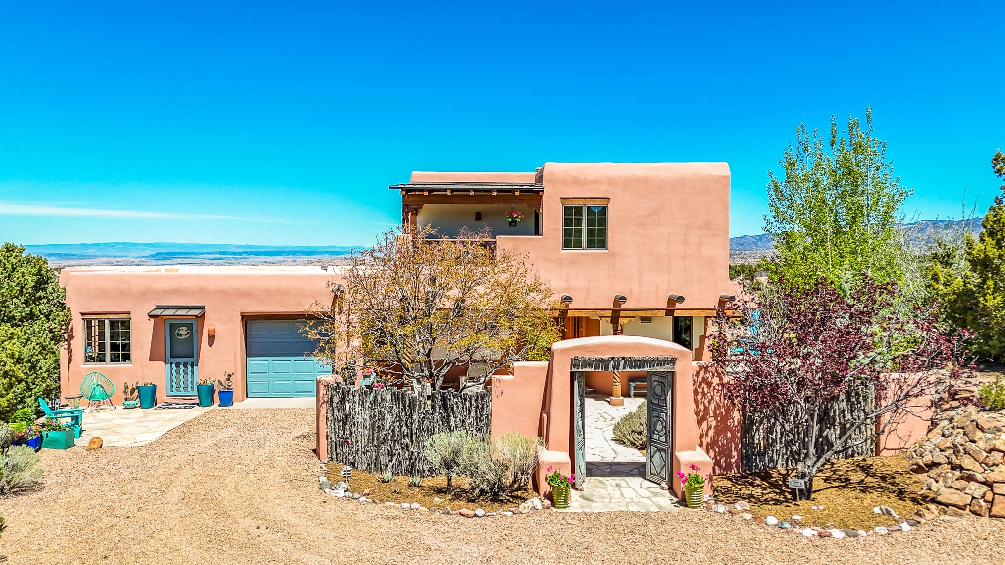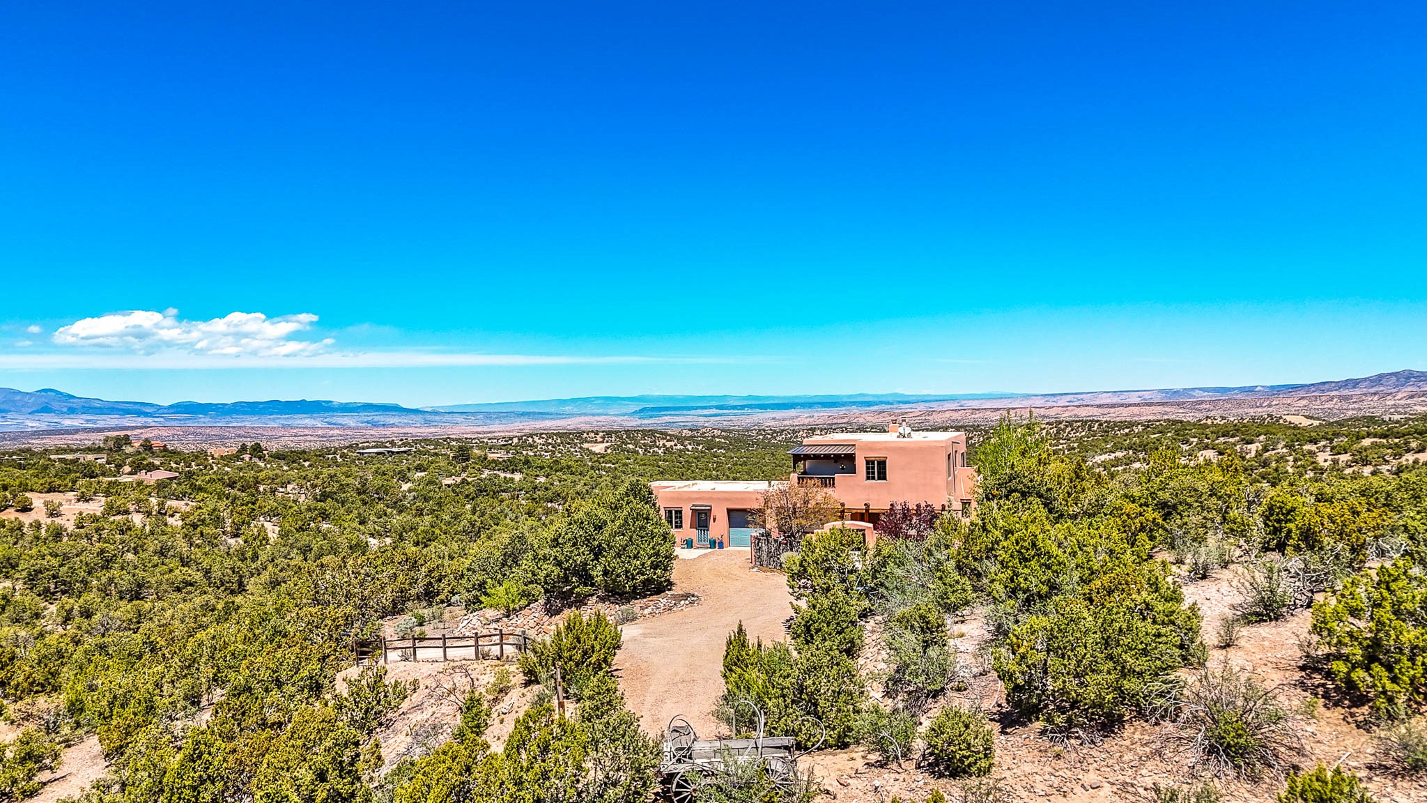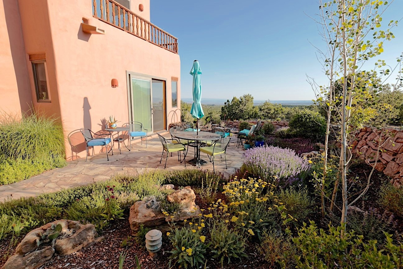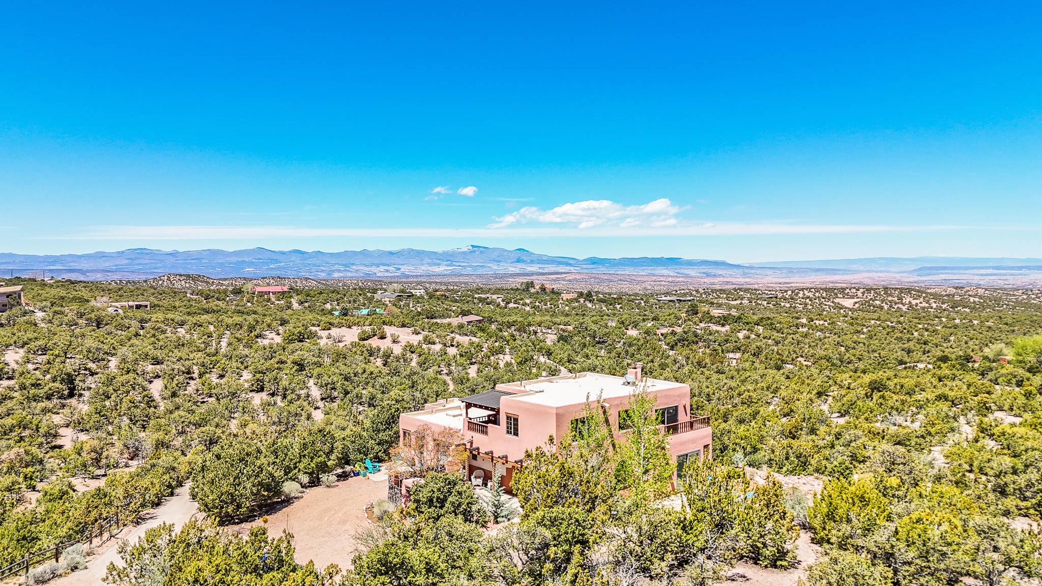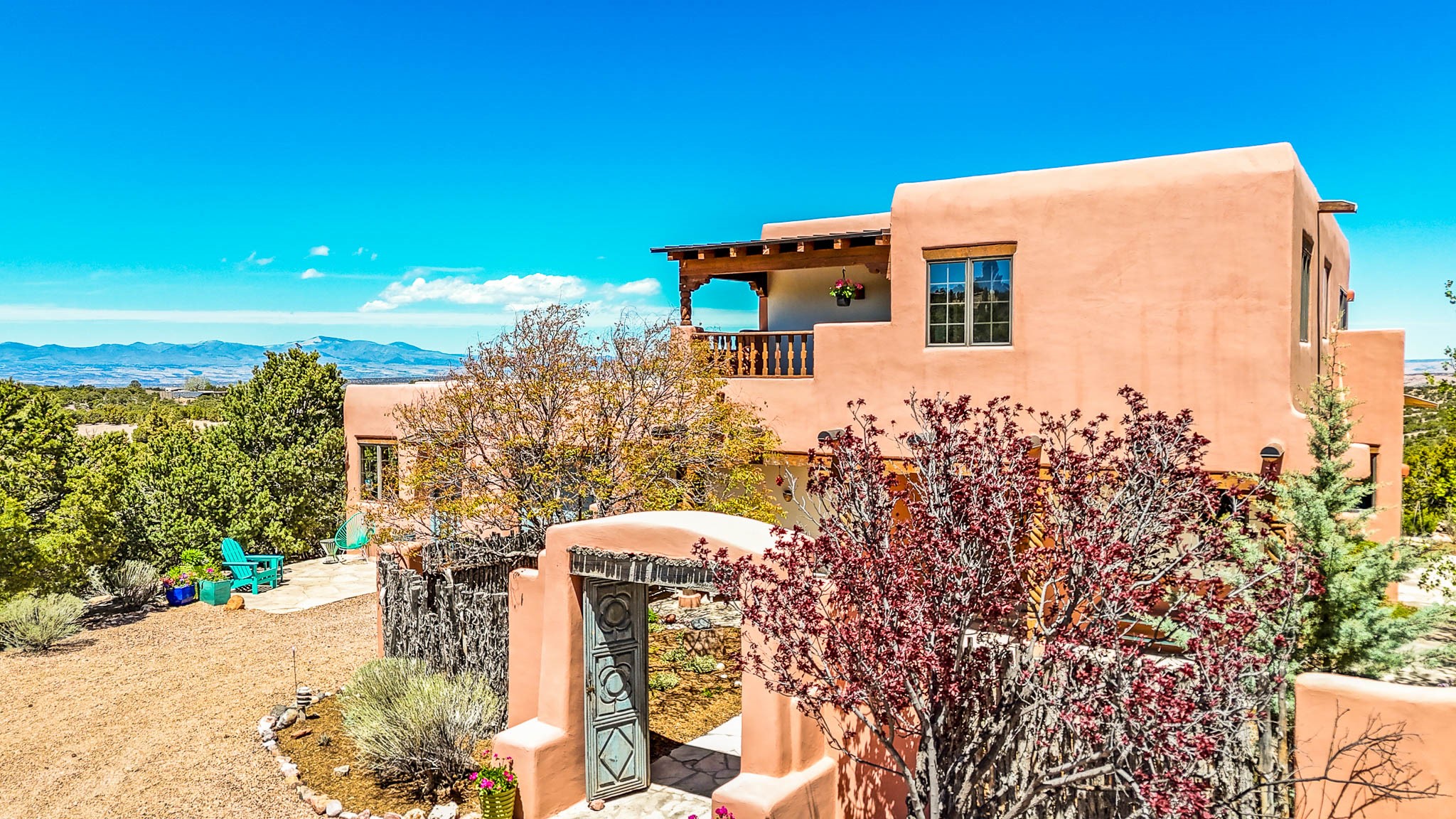 True to its name, 22 Loma Serena--"Serene Hill"--offers a peaceful hilltop retreat with some of the most breathtaking views in Santa Fe. Located in the desirable Tano Road area, this 2,508-square-foot home sits on 4.55 private acres, surrounded by pion trees and big New Mexico skies. You'll enjoy panoramic views of the Sangre de Cristos, Jemez Mountains, Badlands, and beyond all the way to Colorado. Built with classic Southwestern charm, the home features warm wood beams and vigas, colorful Talavera and Saltillo tile, beautiful hardwood floors, and cozy kiva fireplaces. The open floorplan flows easily and is filled with natural light. There are three spacious bedrooms, including two upstairs suites with private decks, and four bathrooms--one full and three baths--giving everyone space and privacy. The welcoming kitchen, bright living and dining areas, and large windows bring the outdoors in, while the Eastside flagstone patio is perfect for soaking up the crisp Santa Fe air. A gated courtyard, sunny stone patio, direct-entry one-car garage, and a private guest suite with its own entrance add even more flexibility and comfort. In addition the property was reroofed in 2019, new HVAC installed 2022 and re-stuccoed in 2023. Whether you're looking for a serene full-time home or a peaceful getaway to gather with family and friends, 22 Loma Serena is the kind of place that just feels good to come home to.