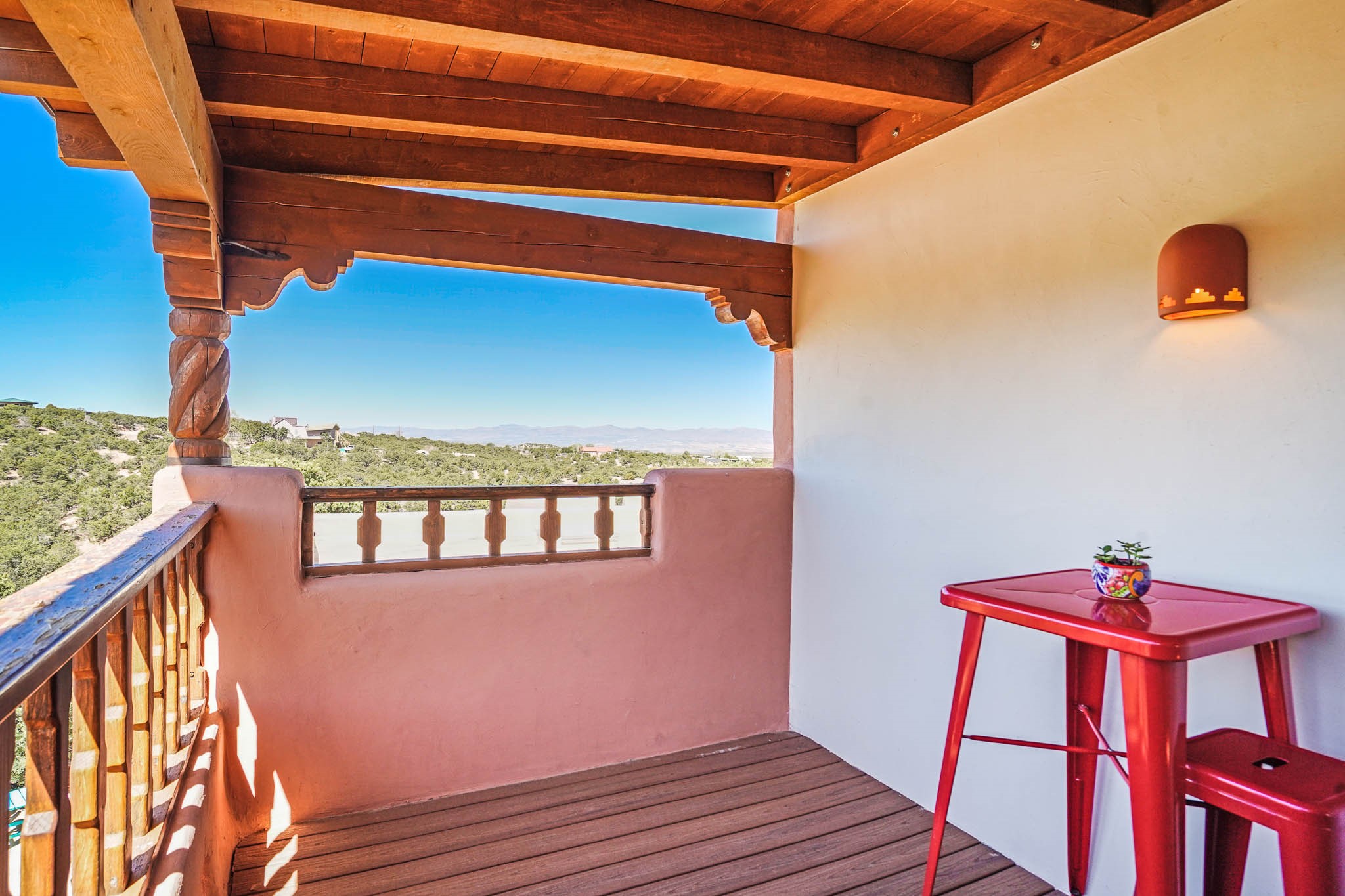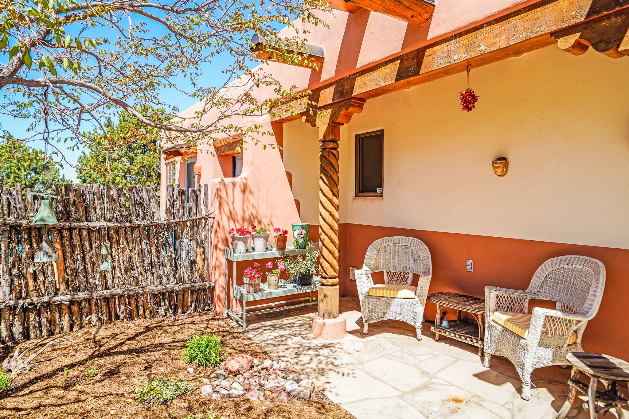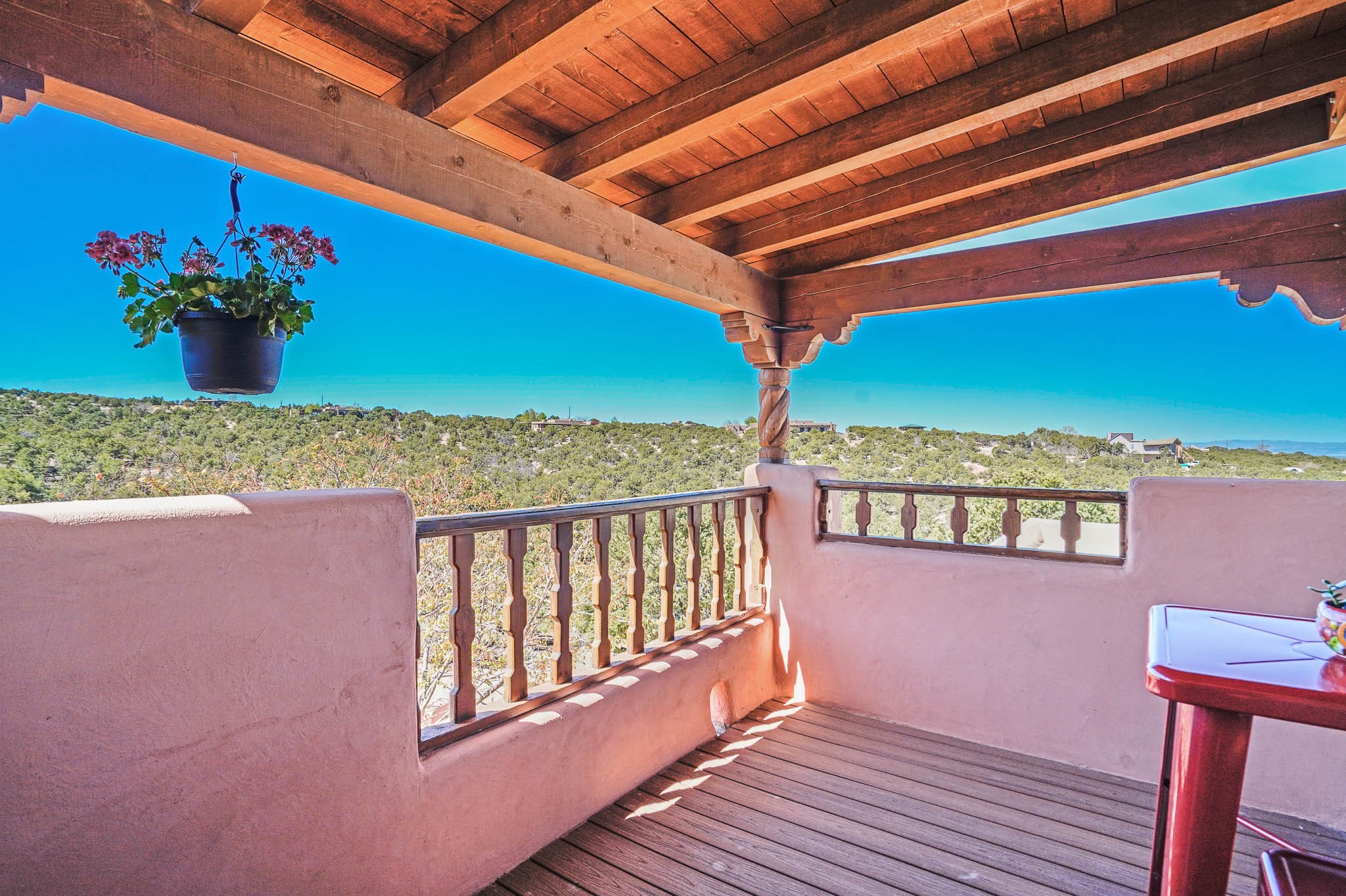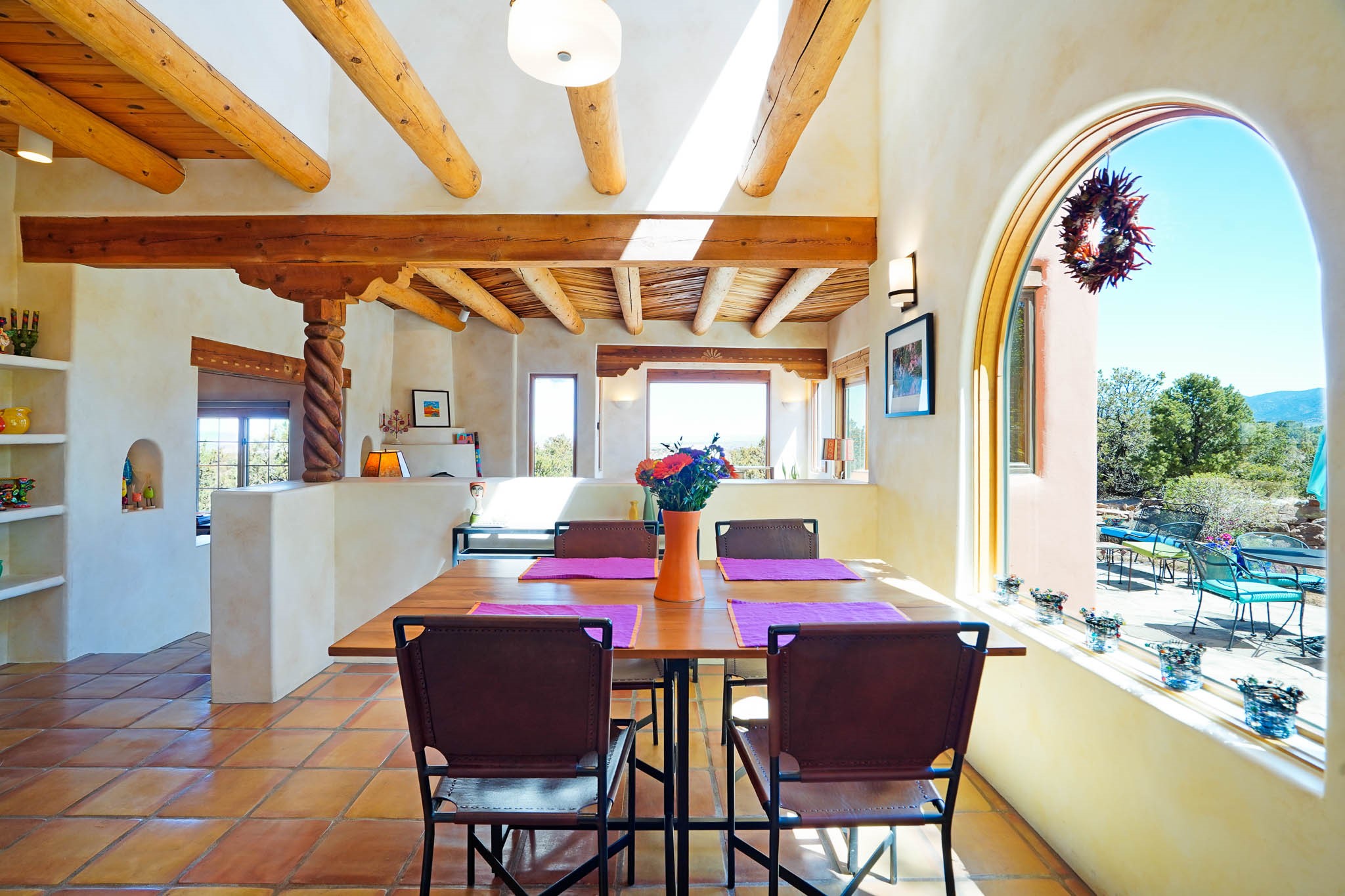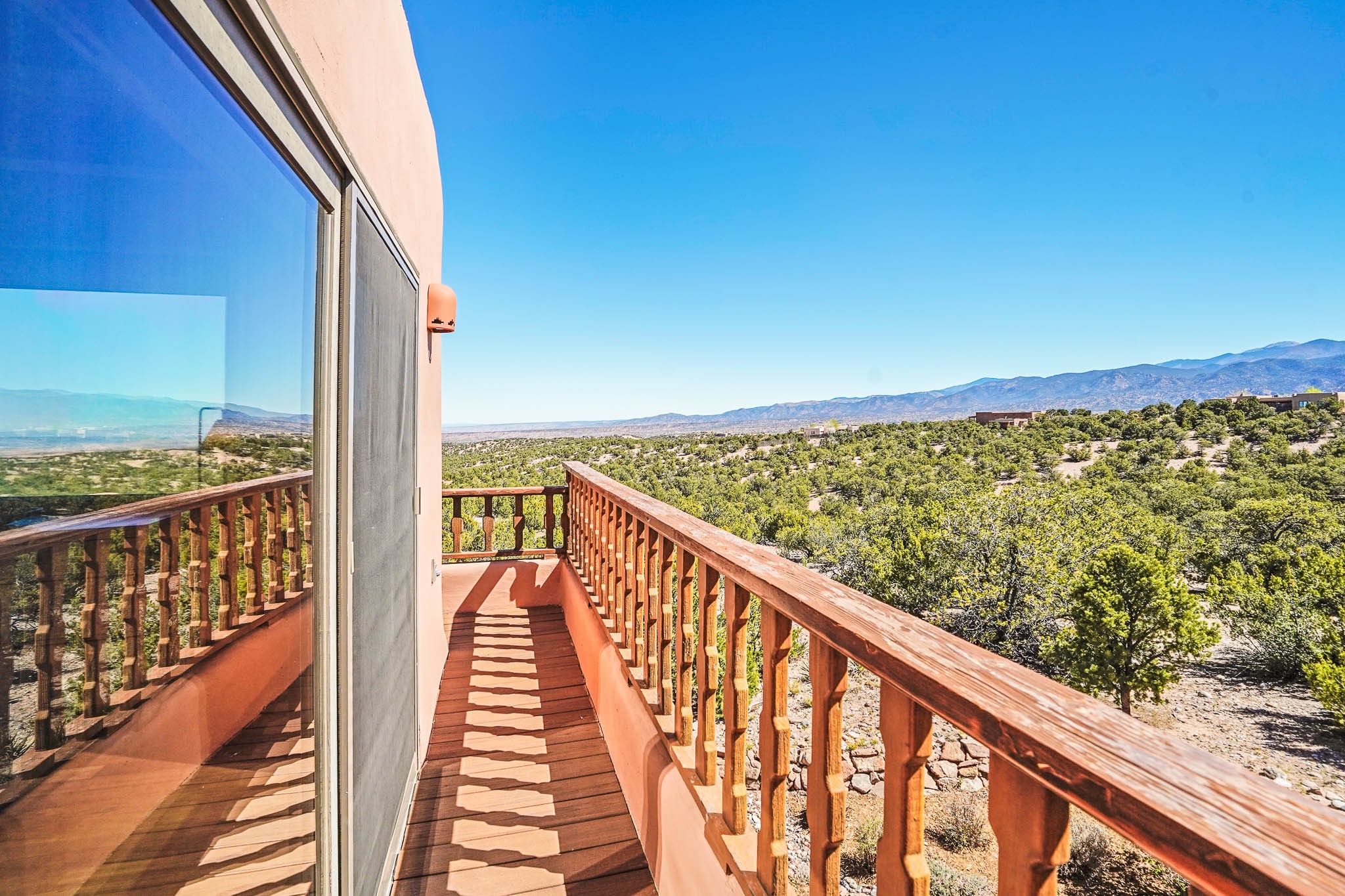 True to its name, 22 Loma Serena--"Serene Hill"--offers a peaceful hilltop retreat with some of the most breathtaking views in Santa Fe. Located in the desirable Tano Road area, this 2,508-square-foot home sits on 4.55 private acres, surrounded by pion trees and big New Mexico skies. You'll enjoy panoramic views of the Sangre de Cristos, Jemez Mountains, Badlands, and beyond all the way to Colorado. Built with classic Southwestern charm, the home features warm wood beams and vigas, colorful Talavera and Saltillo tile, beautiful hardwood floors, and cozy kiva fireplaces. The open floorplan flows easily and is filled with natural light. There are three spacious bedrooms, including two upstairs suites with private decks, and four bathrooms--one full and three baths--giving everyone space and privacy. The welcoming kitchen, bright living and dining areas, and large windows bring the outdoors in, while the Eastside flagstone patio is perfect for soaking up the crisp Santa Fe air. A gated courtyard, sunny stone patio, direct-entry one-car garage, and a private guest suite with its own entrance add even more flexibility and comfort. In addition the property was reroofed in 2019, new HVAC installed 2022 and re-stuccoed in 2023. Whether you're looking for a serene full-time home or a peaceful getaway to gather with family and friends, 22 Loma Serena is the kind of place that just feels good to come home to.
