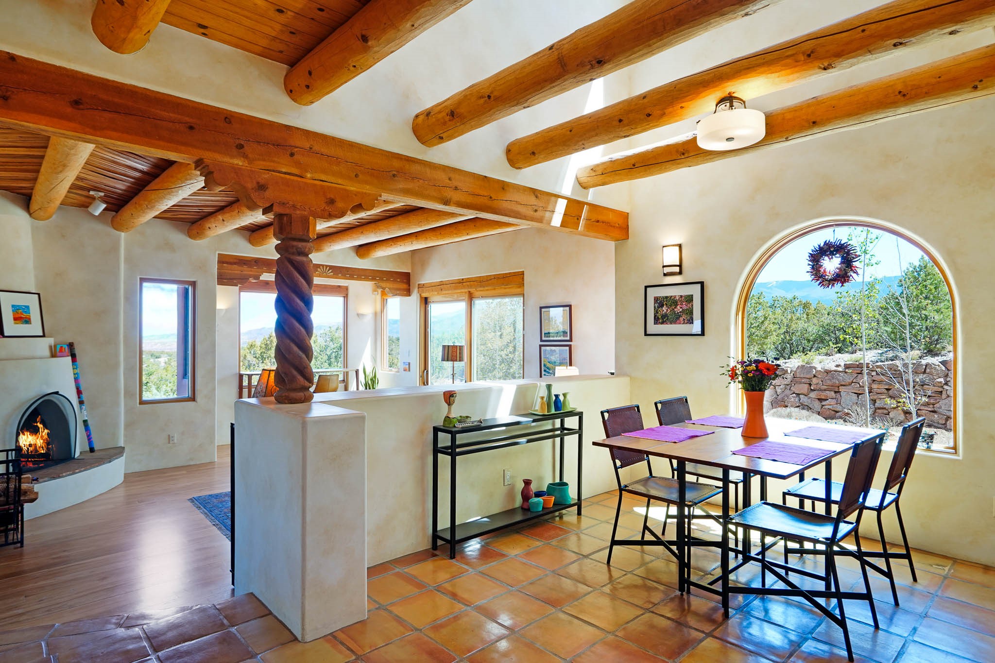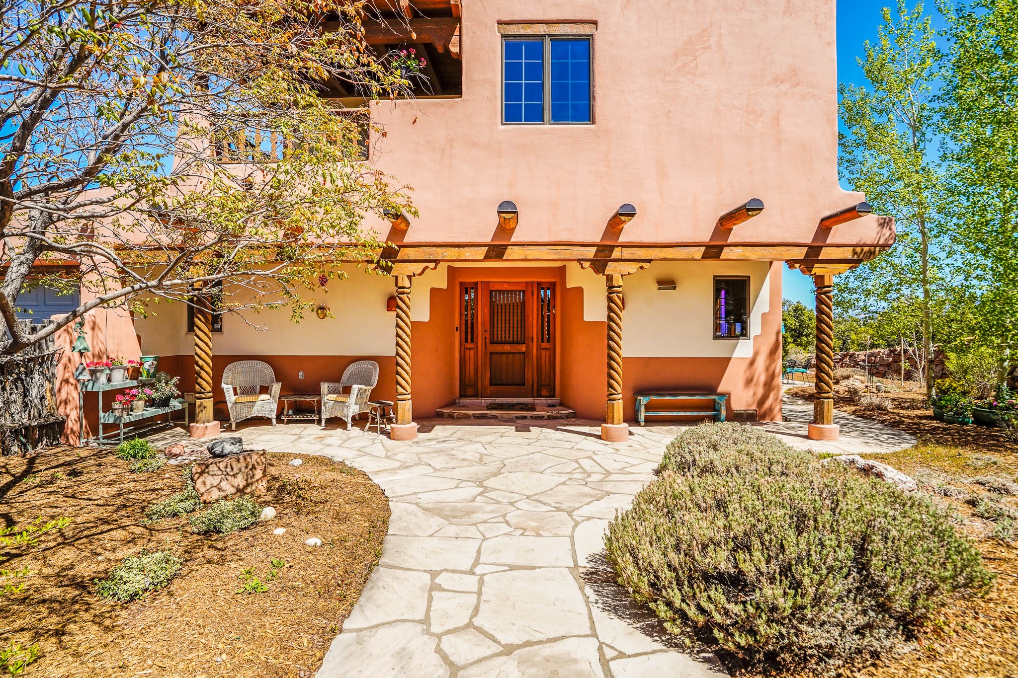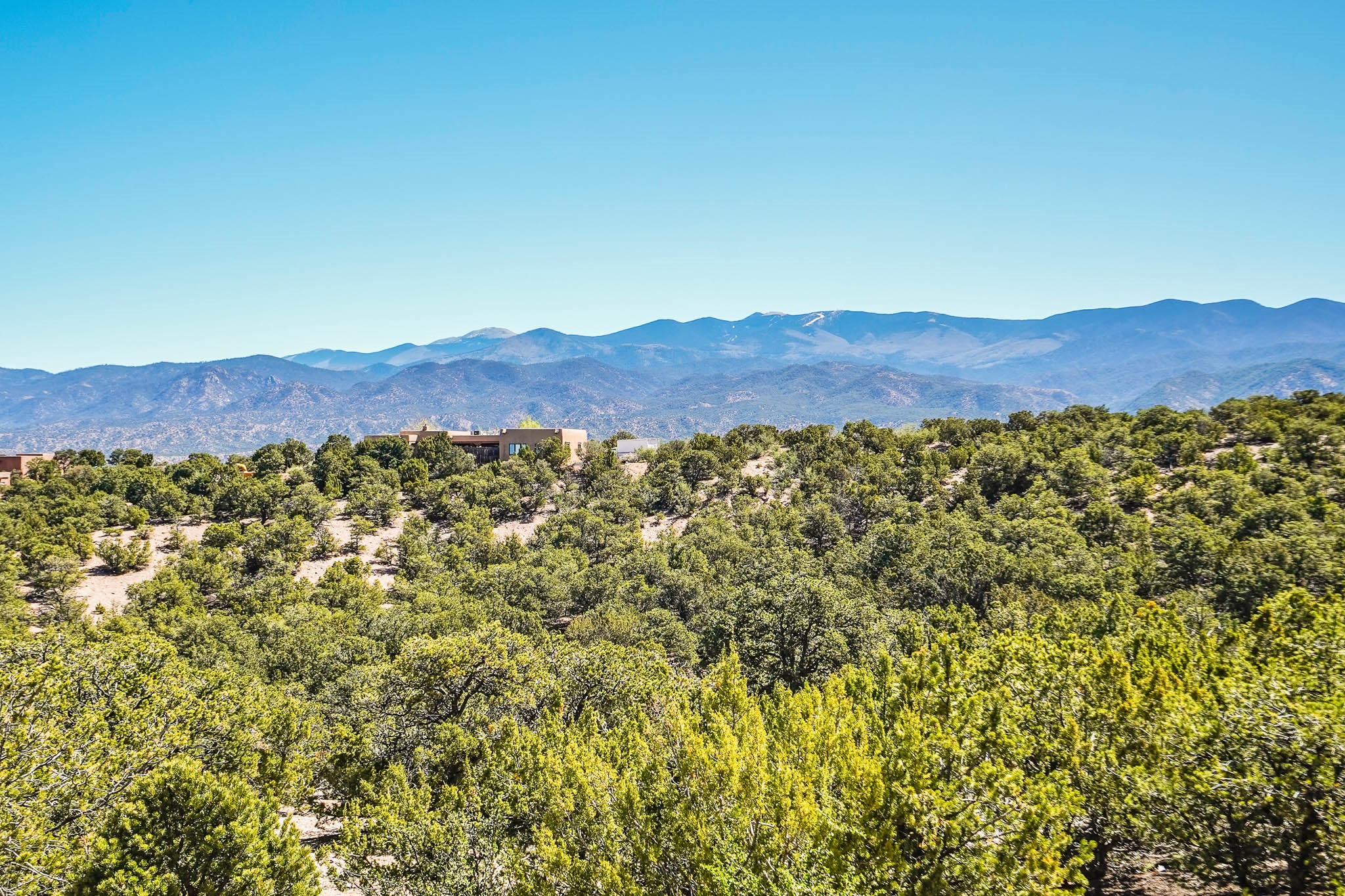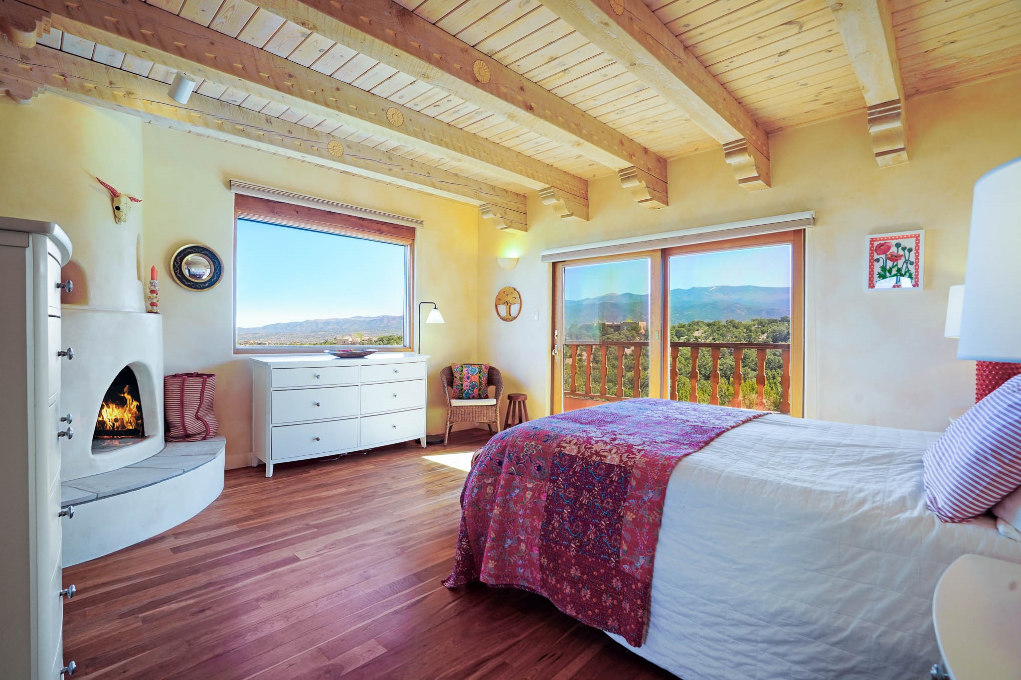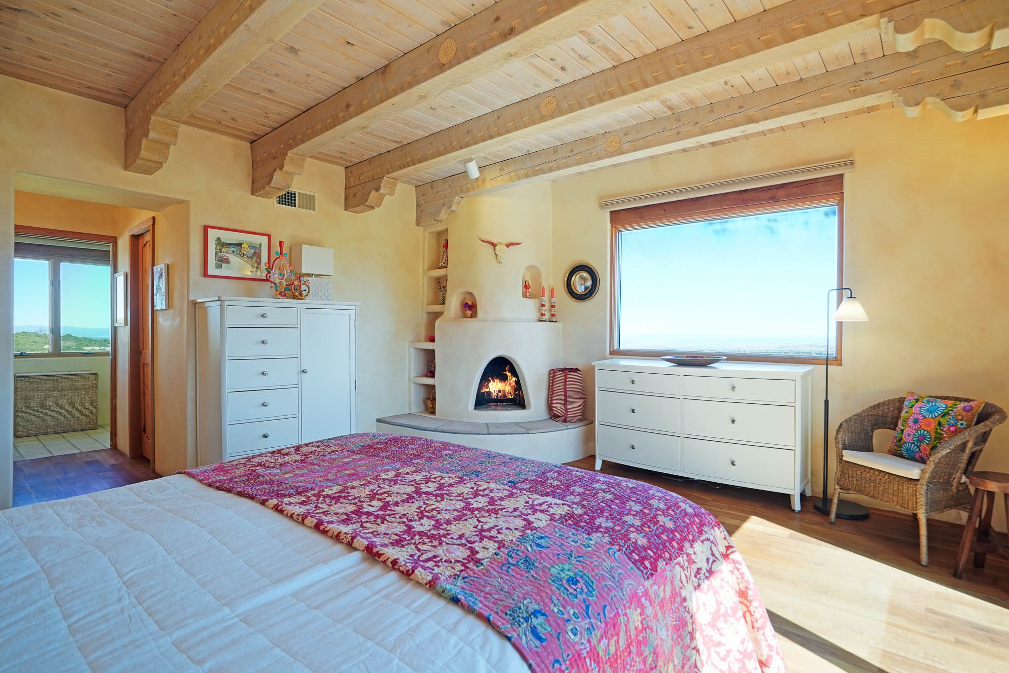 True to its name, 22 Loma Serena--"Serene Hill"--offers a peaceful hilltop retreat with some of the most breathtaking views in Santa Fe. Located in the desirable Tano Road area, this 2,508-square-foot home sits on 4.55 private acres, surrounded by pion trees and big New Mexico skies. You'll enjoy panoramic views of the Sangre de Cristos, Jemez Mountains, Badlands, and beyond all the way to Colorado. Built with classic Southwestern charm, the home features warm wood beams and vigas, colorful Talavera and Saltillo tile, beautiful hardwood floors, and cozy kiva fireplaces. The open floorplan flows easily and is filled with natural light. There are three spacious bedrooms, including two upstairs suites with private decks, and four bathrooms--one full and three baths--giving everyone space and privacy. The welcoming kitchen, bright living and dining areas, and large windows bring the outdoors in, while the Eastside flagstone patio is perfect for soaking up the crisp Santa Fe air. A gated courtyard, sunny stone patio, direct-entry one-car garage, and a private guest suite with its own entrance add even more flexibility and comfort. In addition the property was reroofed in 2019, new HVAC installed 2022 and re-stuccoed in 2023. Whether you're looking for a serene full-time home or a peaceful getaway to gather with family and friends, 22 Loma Serena is the kind of place that just feels good to come home to.
