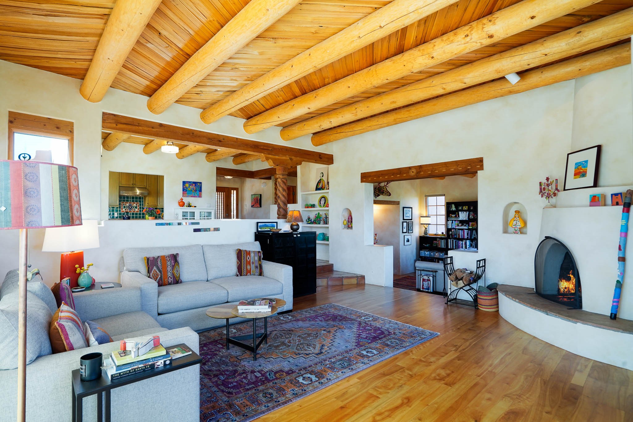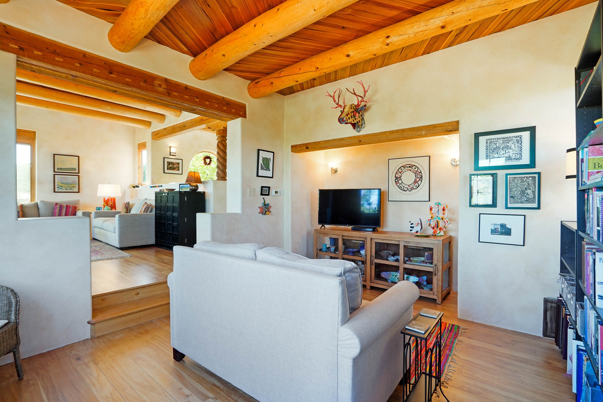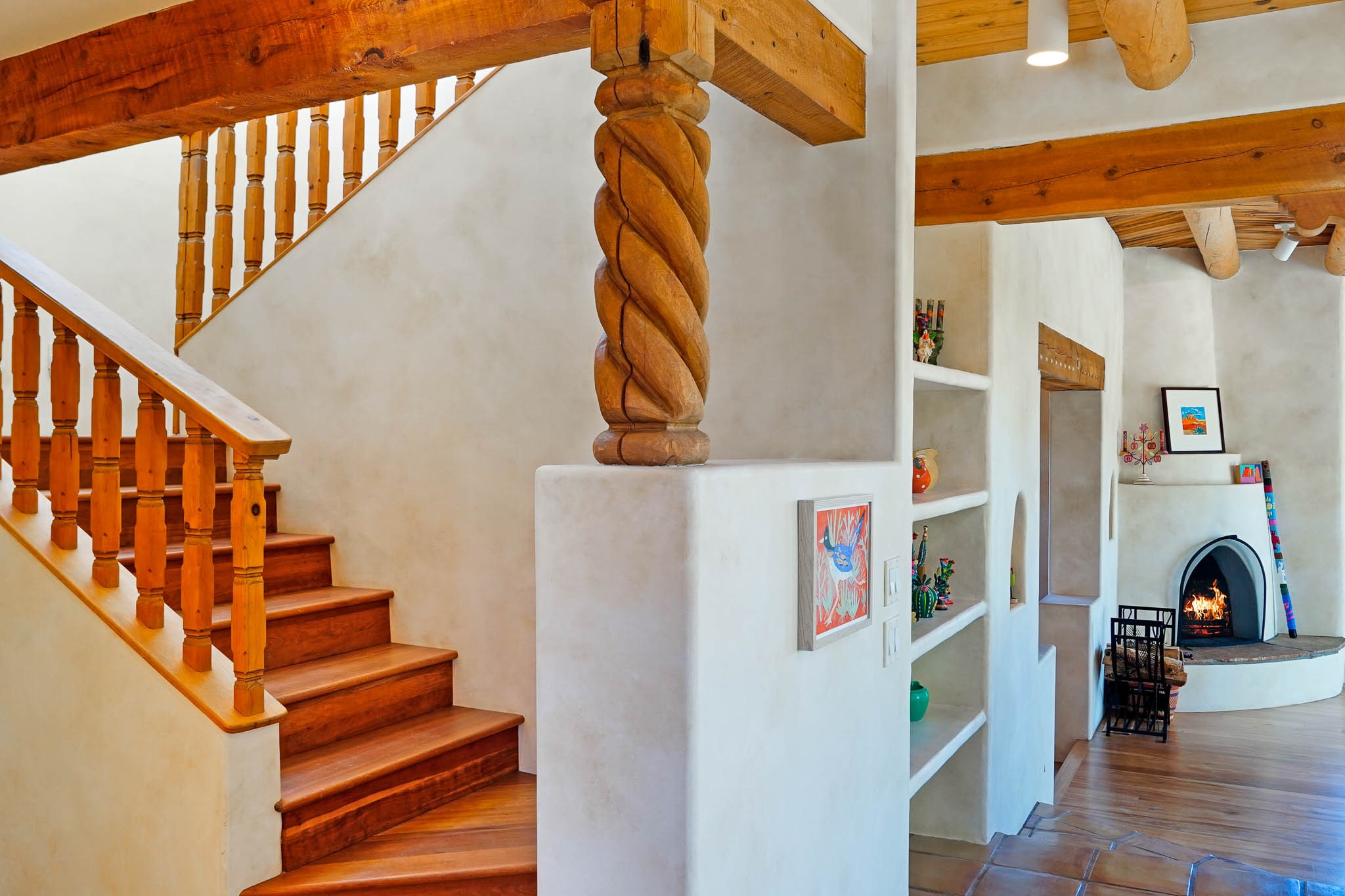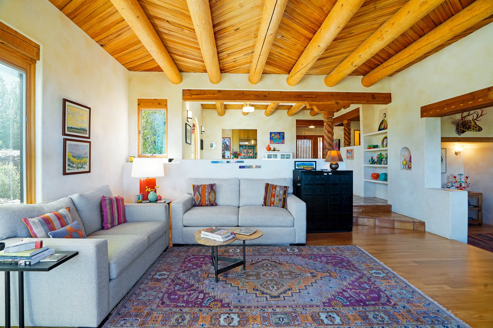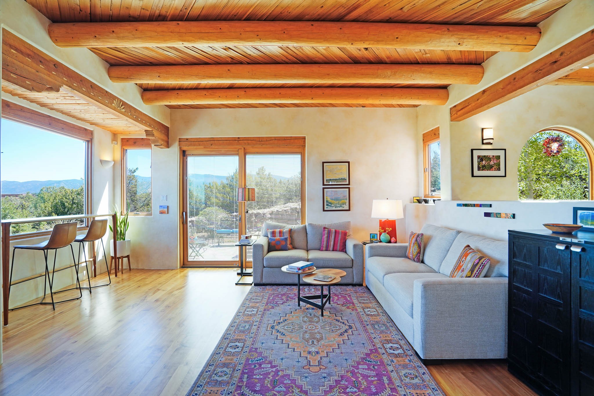 True to its name, 22 Loma Serena--"Serene Hill"--offers a peaceful hilltop retreat with some of the most breathtaking views in Santa Fe. Located in the desirable Tano Road area, this 2,508-square-foot home sits on 4.55 private acres, surrounded by pion trees and big New Mexico skies. You'll enjoy panoramic views of the Sangre de Cristos, Jemez Mountains, Badlands, and beyond all the way to Colorado. Built with classic Southwestern charm, the home features warm wood beams and vigas, colorful Talavera and Saltillo tile, beautiful hardwood floors, and cozy kiva fireplaces. The open floorplan flows easily and is filled with natural light. There are three spacious bedrooms, including two upstairs suites with private decks, and four bathrooms--one full and three baths--giving everyone space and privacy. The welcoming kitchen, bright living and dining areas, and large windows bring the outdoors in, while the Eastside flagstone patio is perfect for soaking up the crisp Santa Fe air. A gated courtyard, sunny stone patio, direct-entry one-car garage, and a private guest suite with its own entrance add even more flexibility and comfort. In addition the property was reroofed in 2019, new HVAC installed 2022 and re-stuccoed in 2023. Whether you're looking for a serene full-time home or a peaceful getaway to gather with family and friends, 22 Loma Serena is the kind of place that just feels good to come home to.