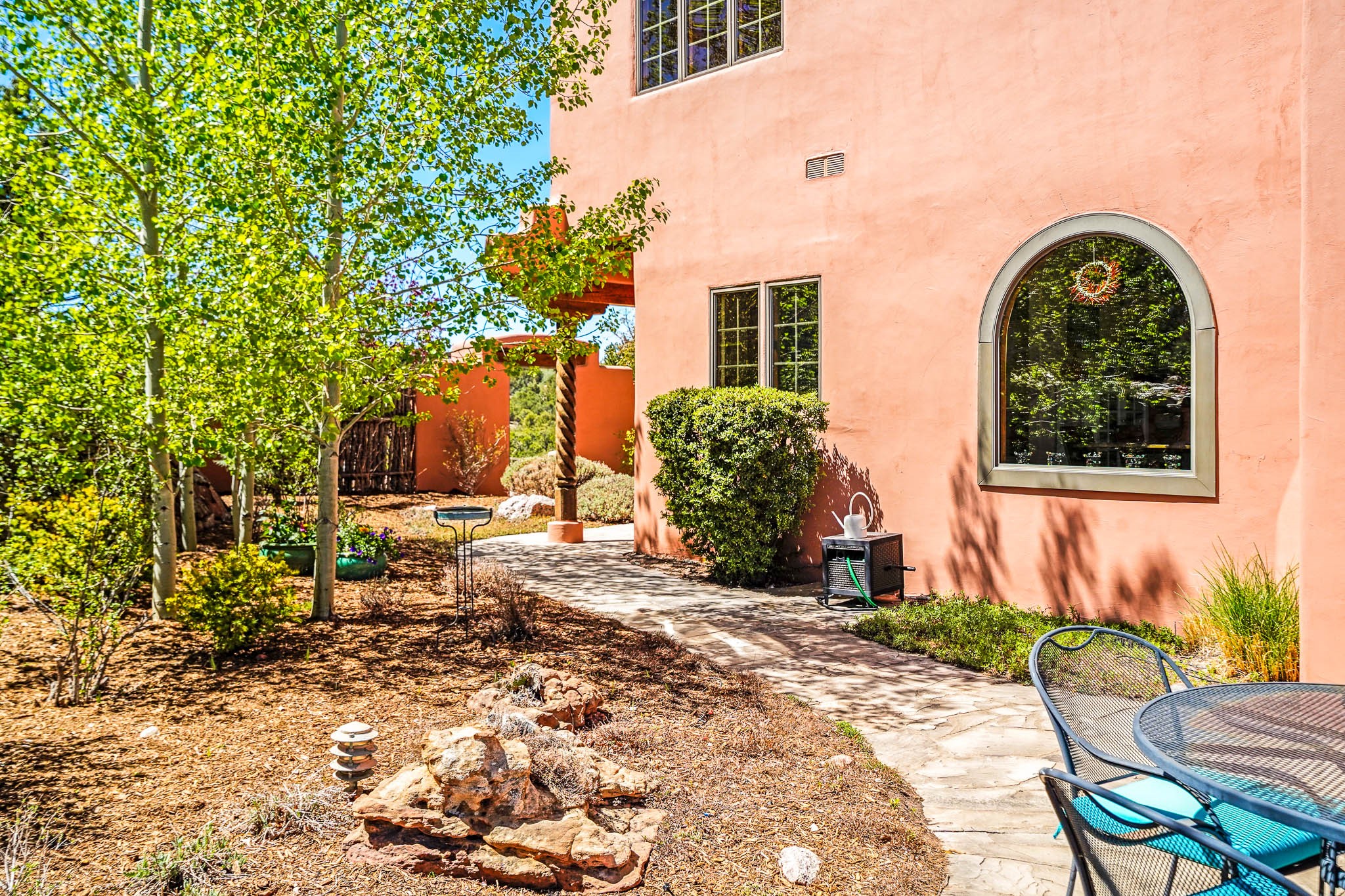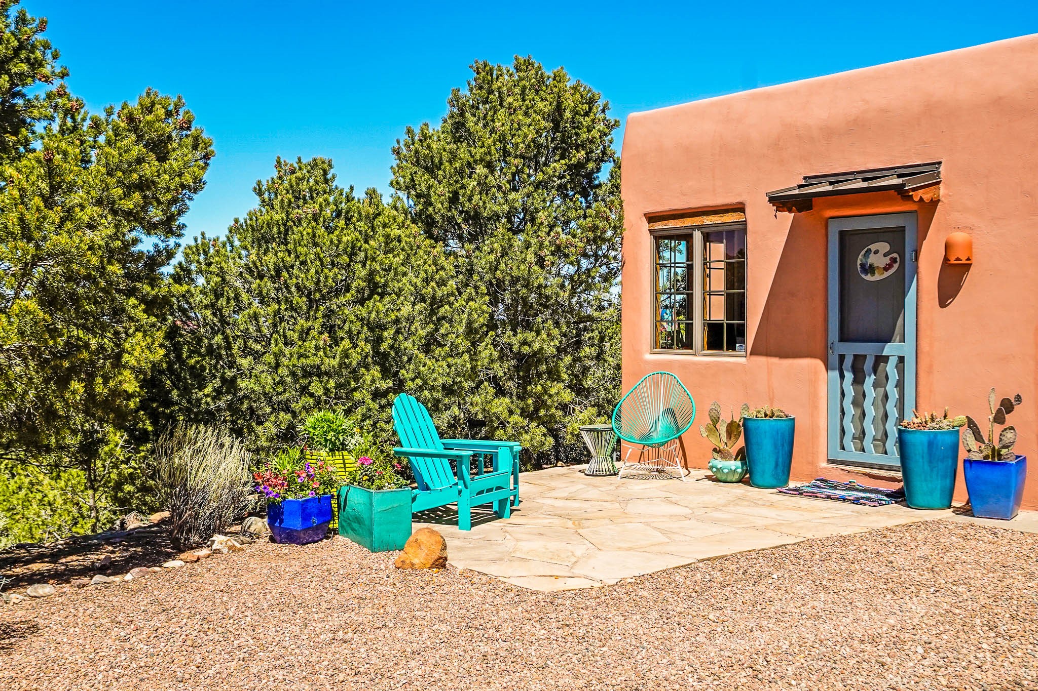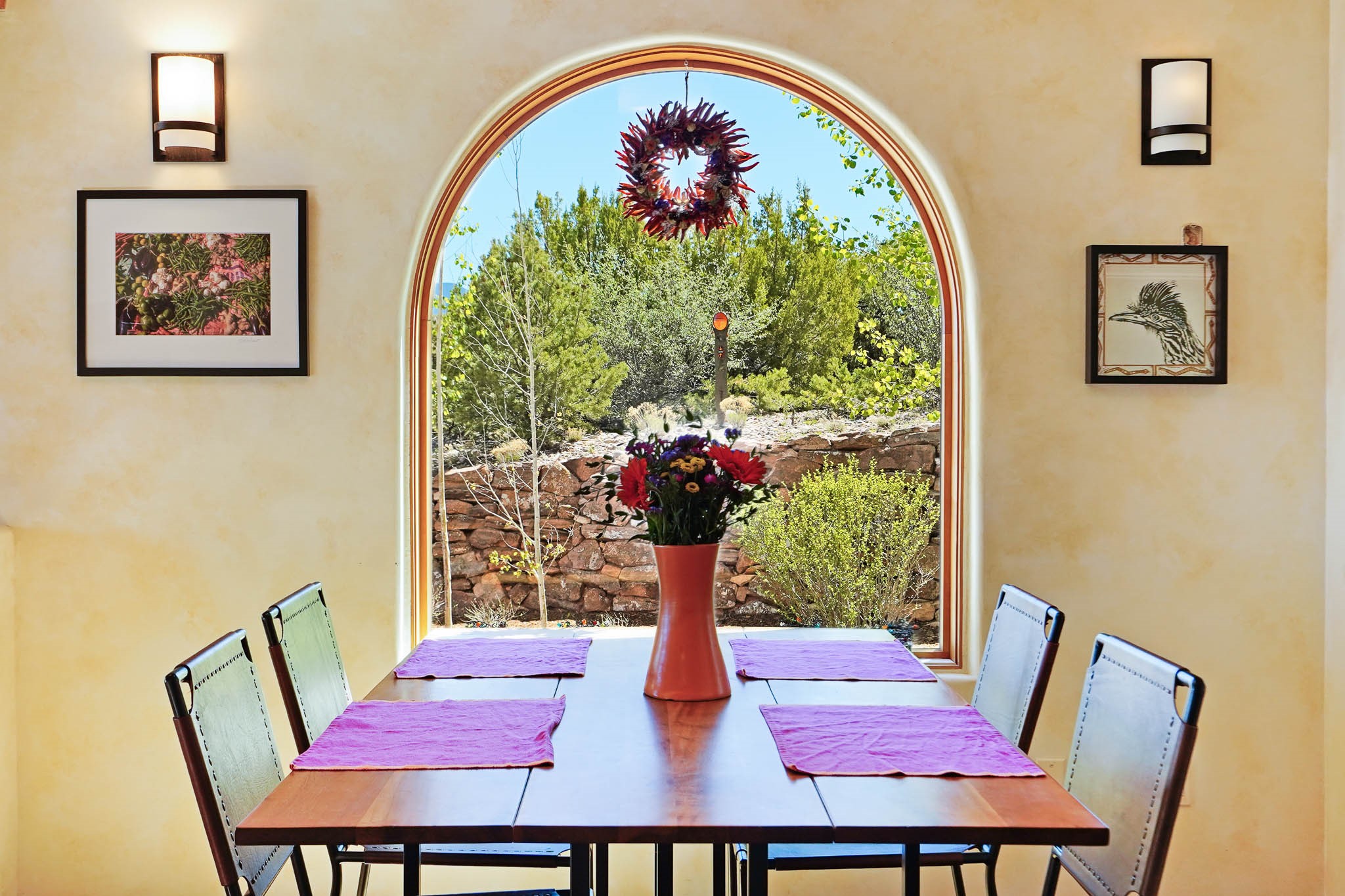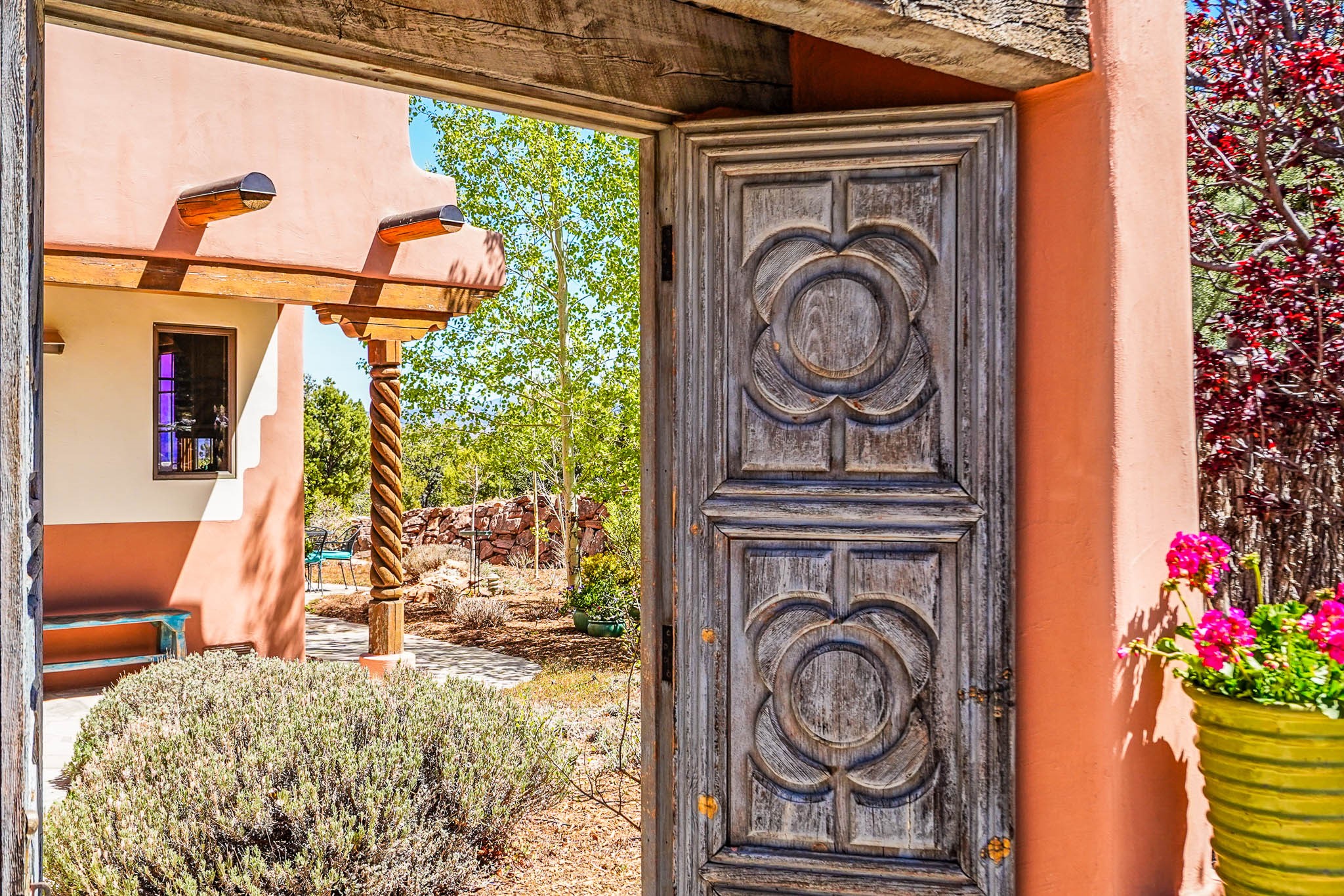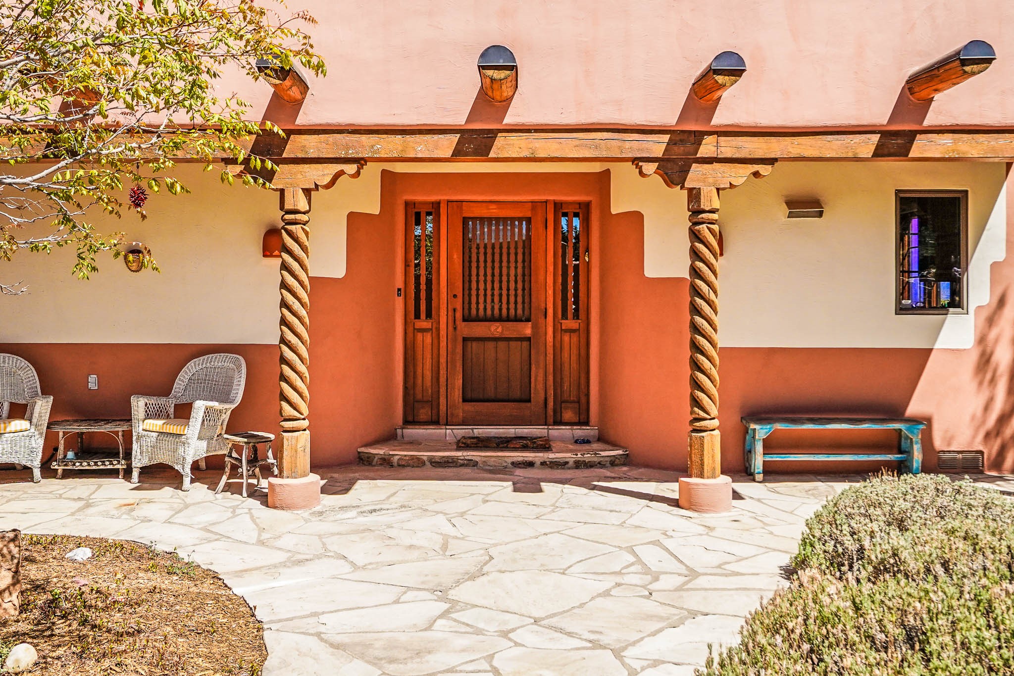 True to its name, 22 Loma Serena--"Serene Hill"--offers a peaceful hilltop retreat with some of the most breathtaking views in Santa Fe. Located in the desirable Tano Road area, this 2,508-square-foot home sits on 4.55 private acres, surrounded by pion trees and big New Mexico skies. You'll enjoy panoramic views of the Sangre de Cristos, Jemez Mountains, Badlands, and beyond all the way to Colorado. Built with classic Southwestern charm, the home features warm wood beams and vigas, colorful Talavera and Saltillo tile, beautiful hardwood floors, and cozy kiva fireplaces. The open floorplan flows easily and is filled with natural light. There are three spacious bedrooms, including two upstairs suites with private decks, and four bathrooms--one full and three baths--giving everyone space and privacy. The welcoming kitchen, bright living and dining areas, and large windows bring the outdoors in, while the Eastside flagstone patio is perfect for soaking up the crisp Santa Fe air. A gated courtyard, sunny stone patio, direct-entry one-car garage, and a private guest suite with its own entrance add even more flexibility and comfort. In addition the property was reroofed in 2019, new HVAC installed 2022 and re-stuccoed in 2023. Whether you're looking for a serene full-time home or a peaceful getaway to gather with family and friends, 22 Loma Serena is the kind of place that just feels good to come home to.