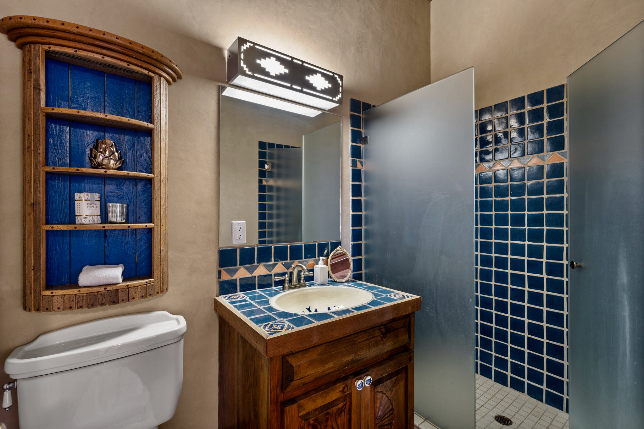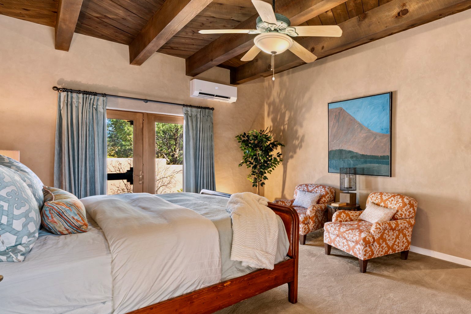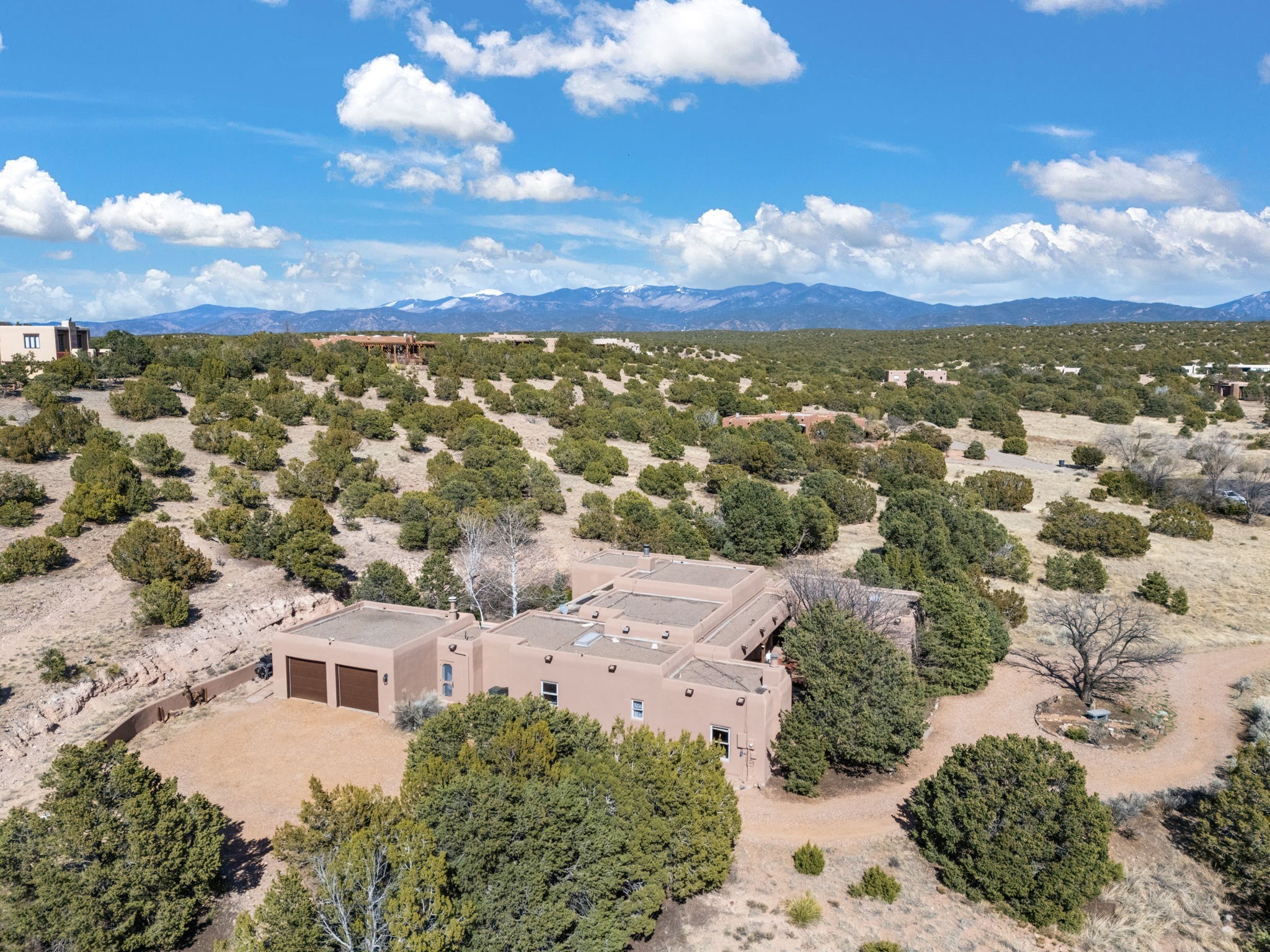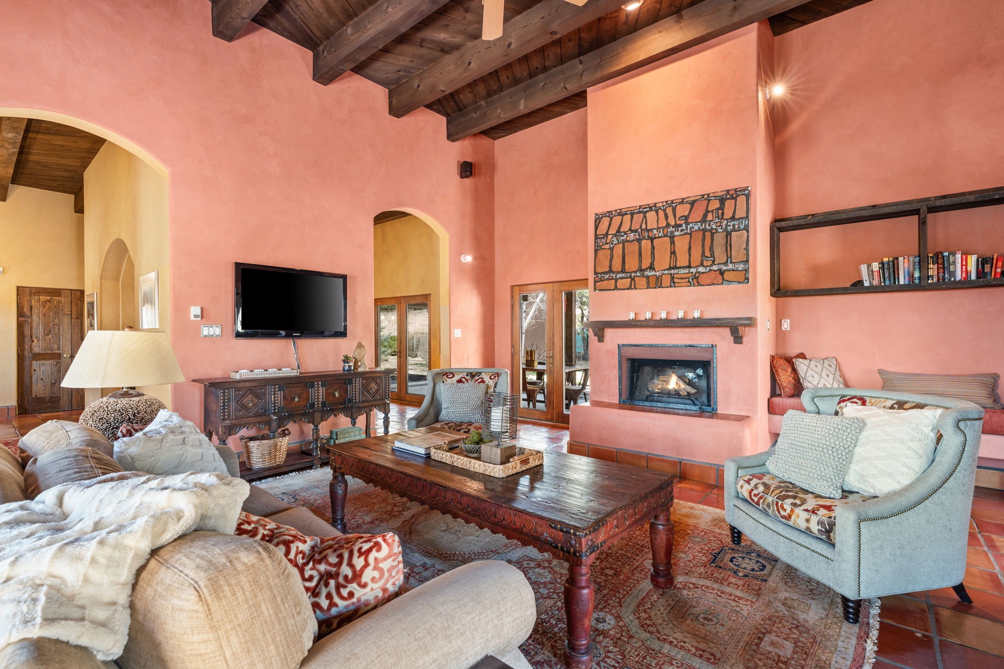 Experience timeless Southwest style in this exceptional La Mariposa home. Natural light highlights beamed ceilings, Saltillo tile, custom wood doors and hand-plastered walls. The spacious living room with a wood-burning fireplace flows seamlessly to multiple outdoor patios--perfect for entertaining or relaxing. The kitchen offers generous storage and a large walk-in pantry. A luxurious primary suite features a spa-like bath with dual sinks, soaking tub, and glass shower. A guest suite with en suite bath, plus an office with fireplace offers flexible living. Just 15 minutes to downtown Santa Fe's shopping, dining, and cultural attractions.