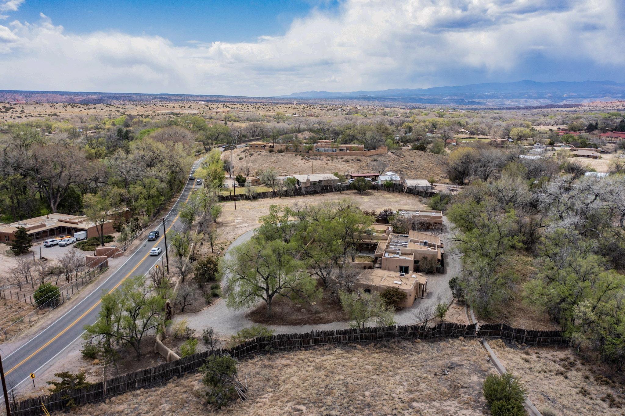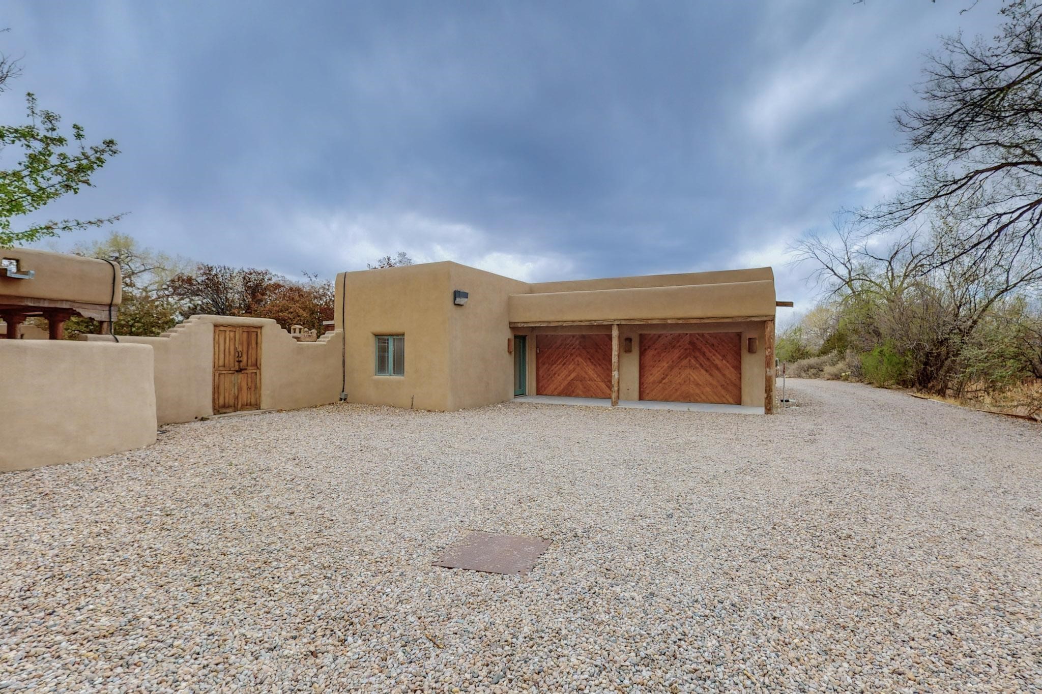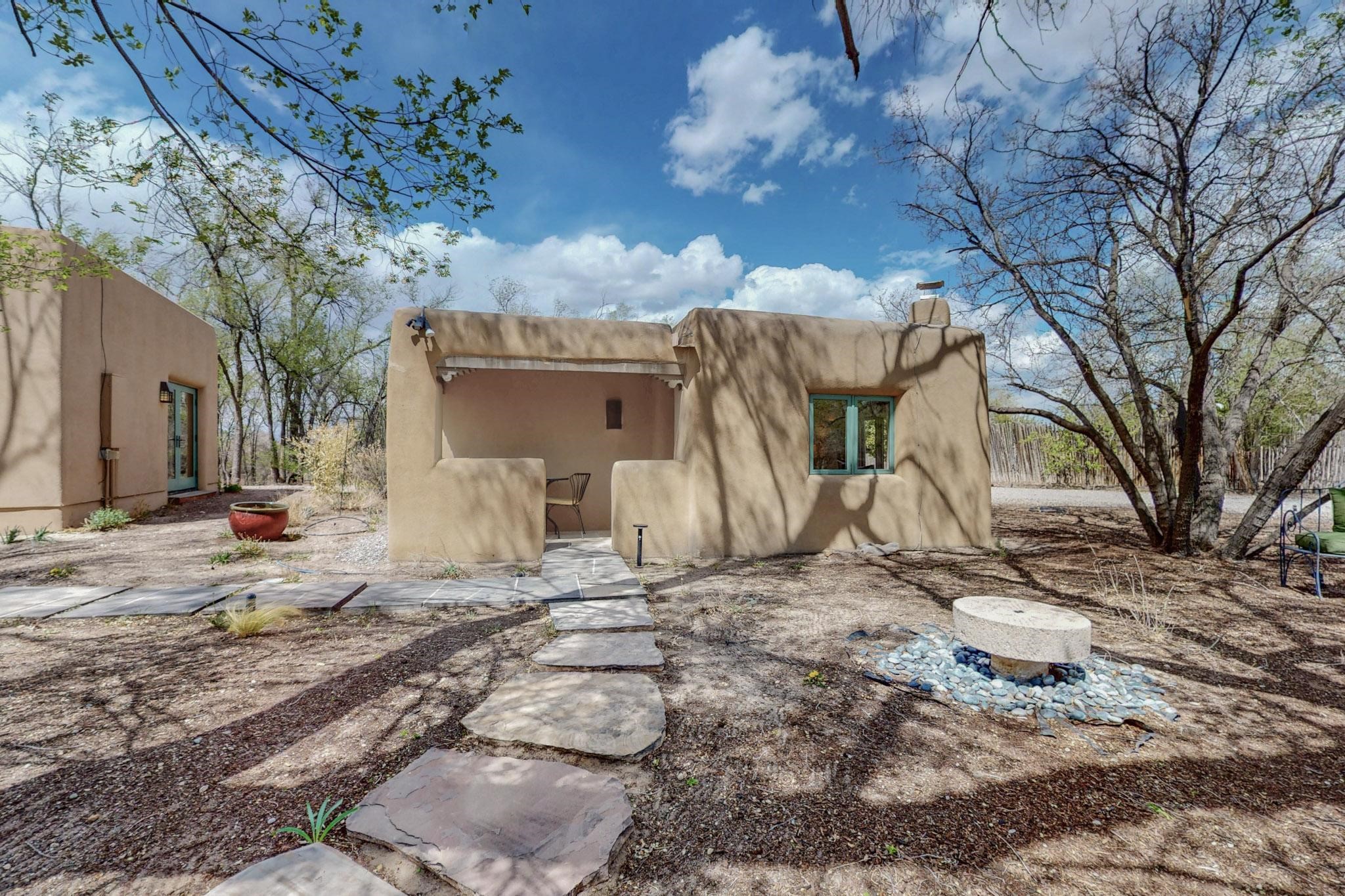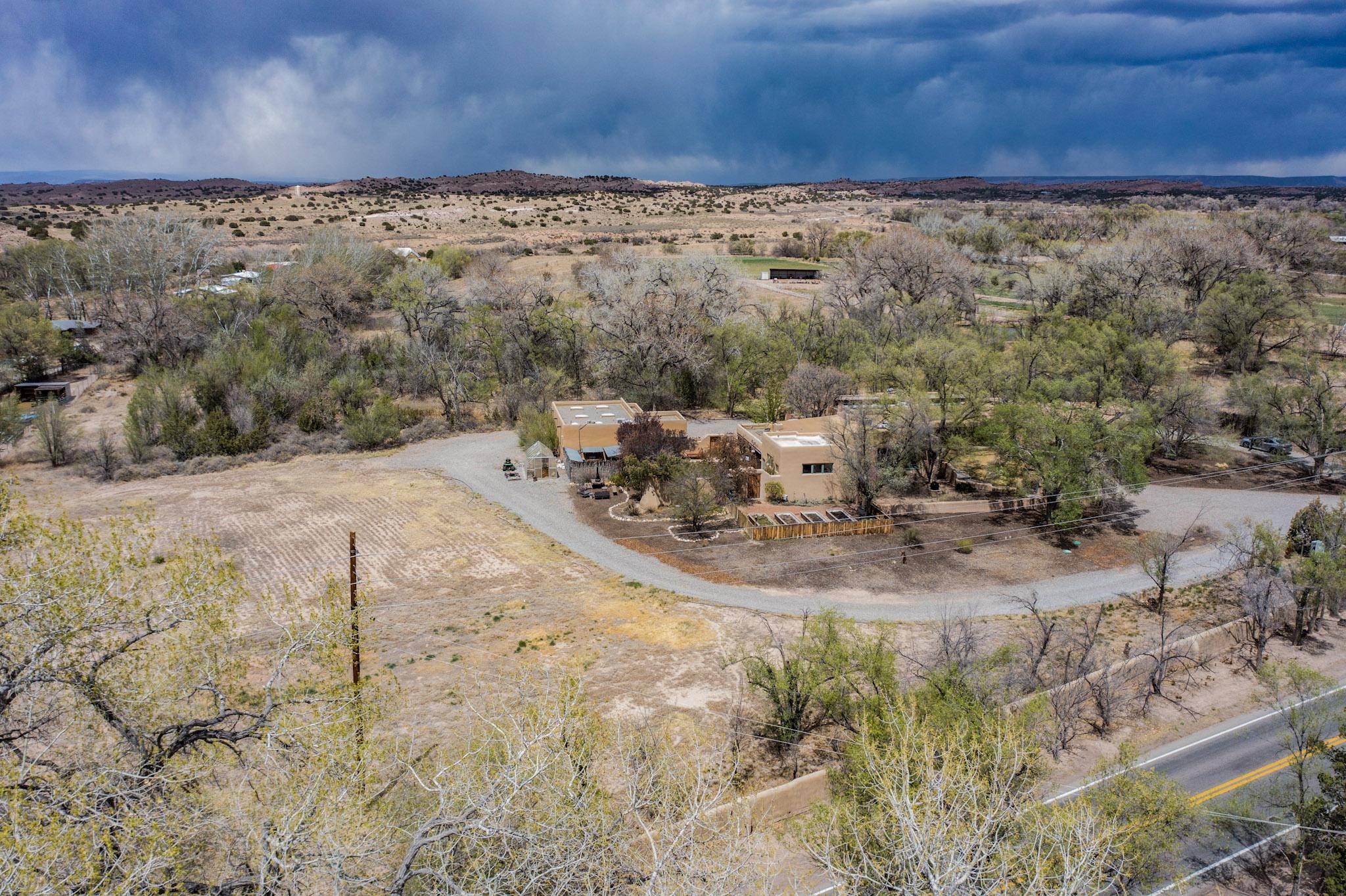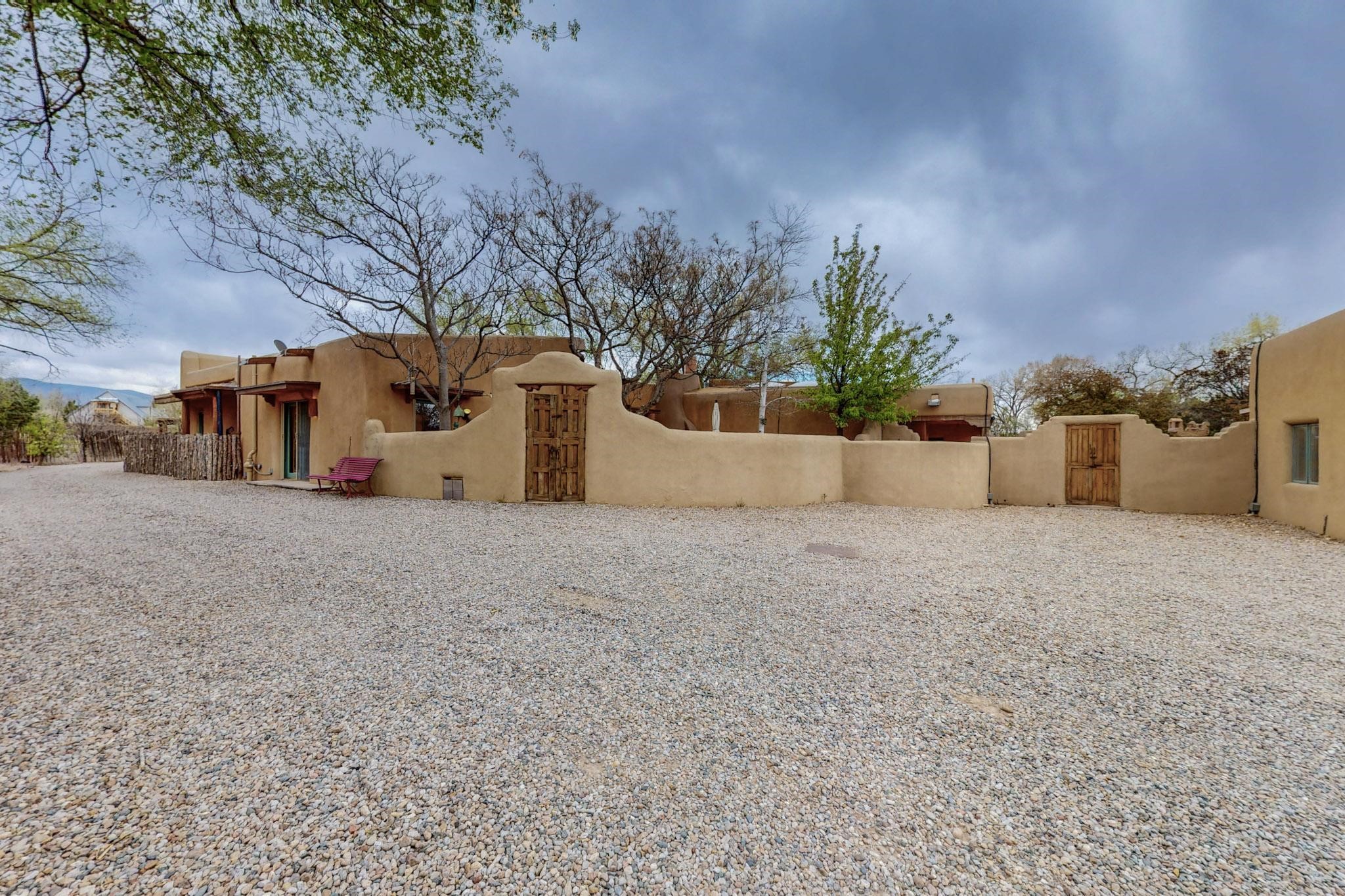 Situated on 2.05 fertile acres in the Nambe Valley lies Casa Alegria. With easy access to both Santa Fe and Los Alamos, this magnificent property boasts authentic Pueblo-style craftsmanship throughout. Surrounding the premiere home on this compound, you'll enjoy courtyards, portals, fireplaces, patios, and landscaped gardens, with mature trees. The interior of this expansive home offers a gourmet kitchen, hardwood and flagstone flooring, viga ceilings, and kiva fireplaces. In its expansive primary bedroom, you'll enjoy a spa bath, walk-in closet, and a spacious patio with its own swimming pool. Additionally, the one-bedroom guesthouse with equally impressive craftsmanship offers a dining area, bathroom, and kitchenette. Adjacent to the oversized 2-car garage is a bonus studio or office space, also with its own bath. Welcome to this spectacular northern New Mexico property.