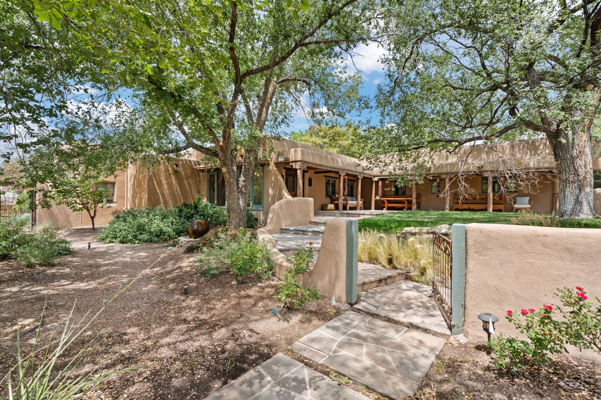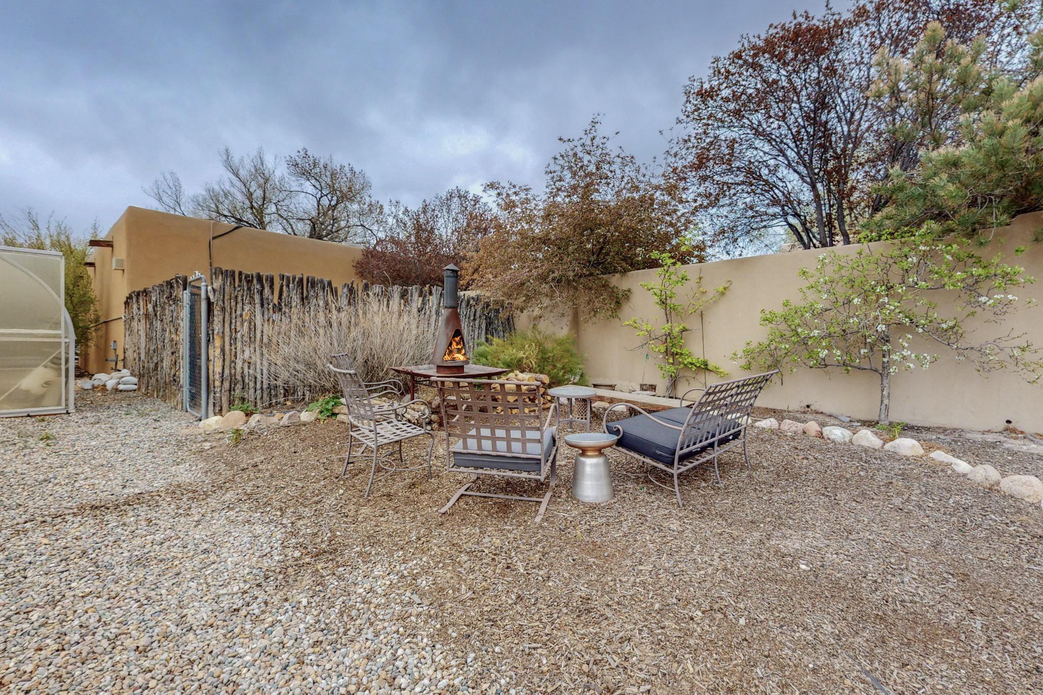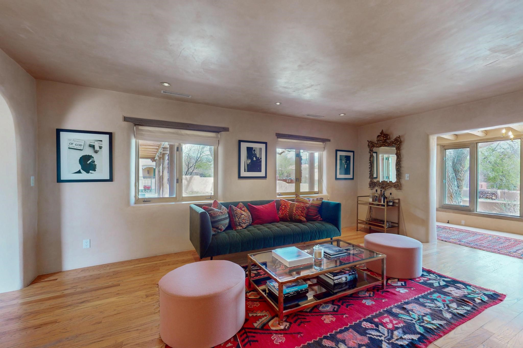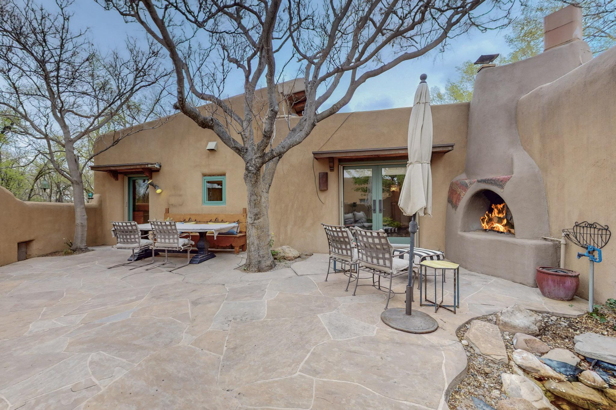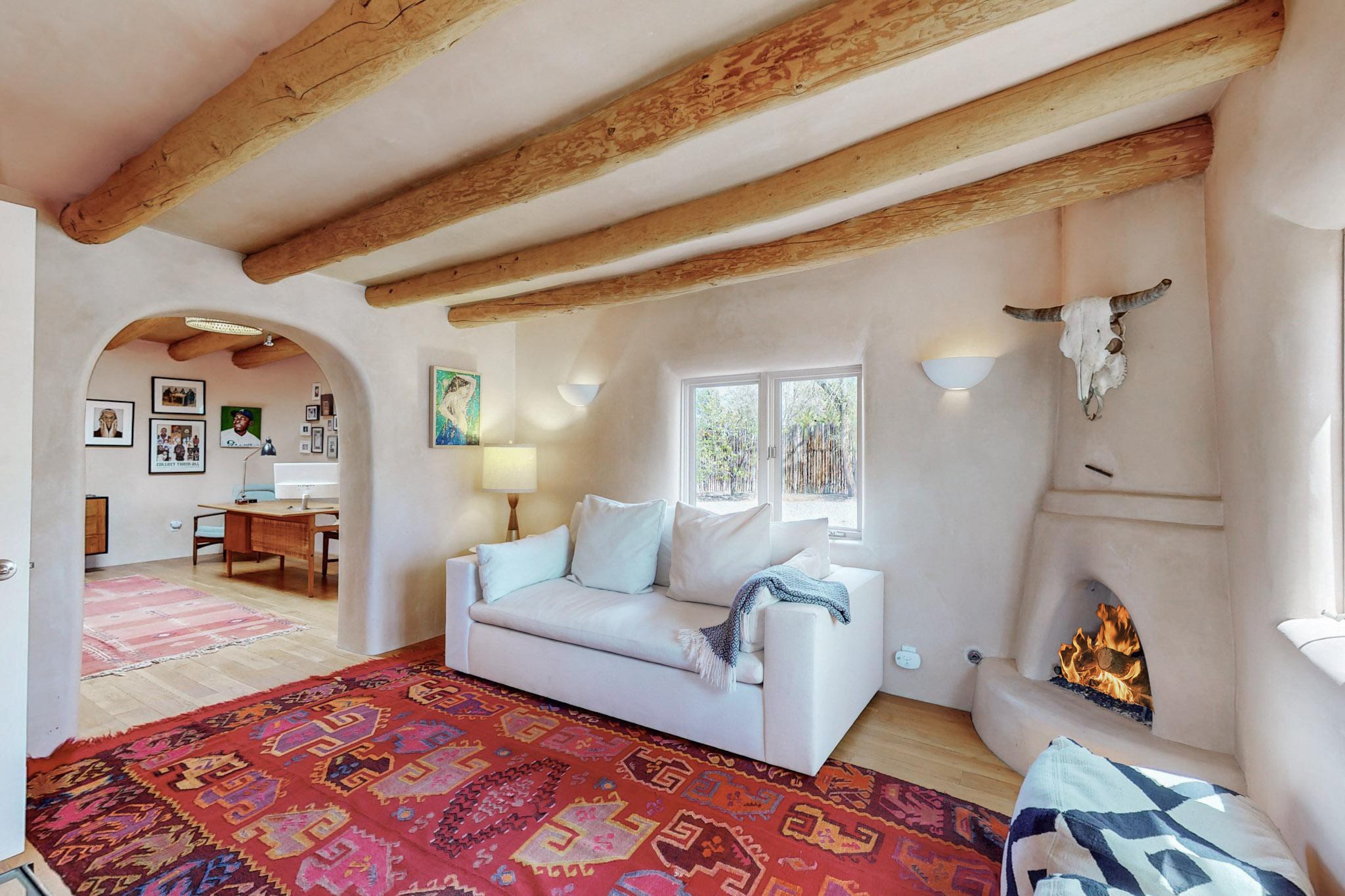 Situated on 2.05 fertile acres in the Nambe Valley lies Casa Alegria. With easy access to both Santa Fe and Los Alamos, this magnificent property boasts authentic Pueblo-style craftsmanship throughout. Surrounding the premiere home on this compound, you'll enjoy courtyards, portals, fireplaces, patios, and landscaped gardens, with mature trees. The interior of this expansive home offers a gourmet kitchen, hardwood and flagstone flooring, viga ceilings, and kiva fireplaces. In its expansive primary bedroom, you'll enjoy a spa bath, walk-in closet, and a spacious patio with its own swimming pool. Additionally, the one-bedroom guesthouse with equally impressive craftsmanship offers a dining area, bathroom, and kitchenette. Adjacent to the oversized 2-car garage is a bonus studio or office space, also with its own bath. Welcome to this spectacular northern New Mexico property.