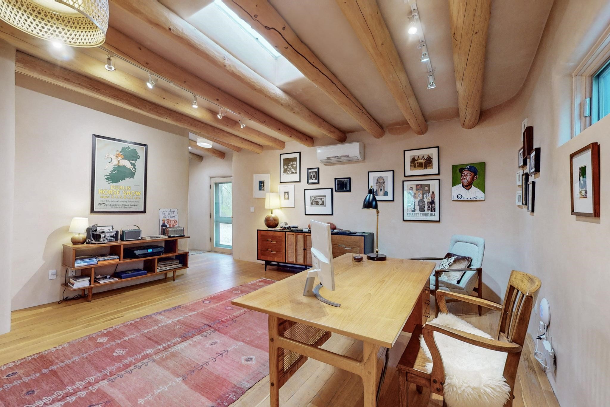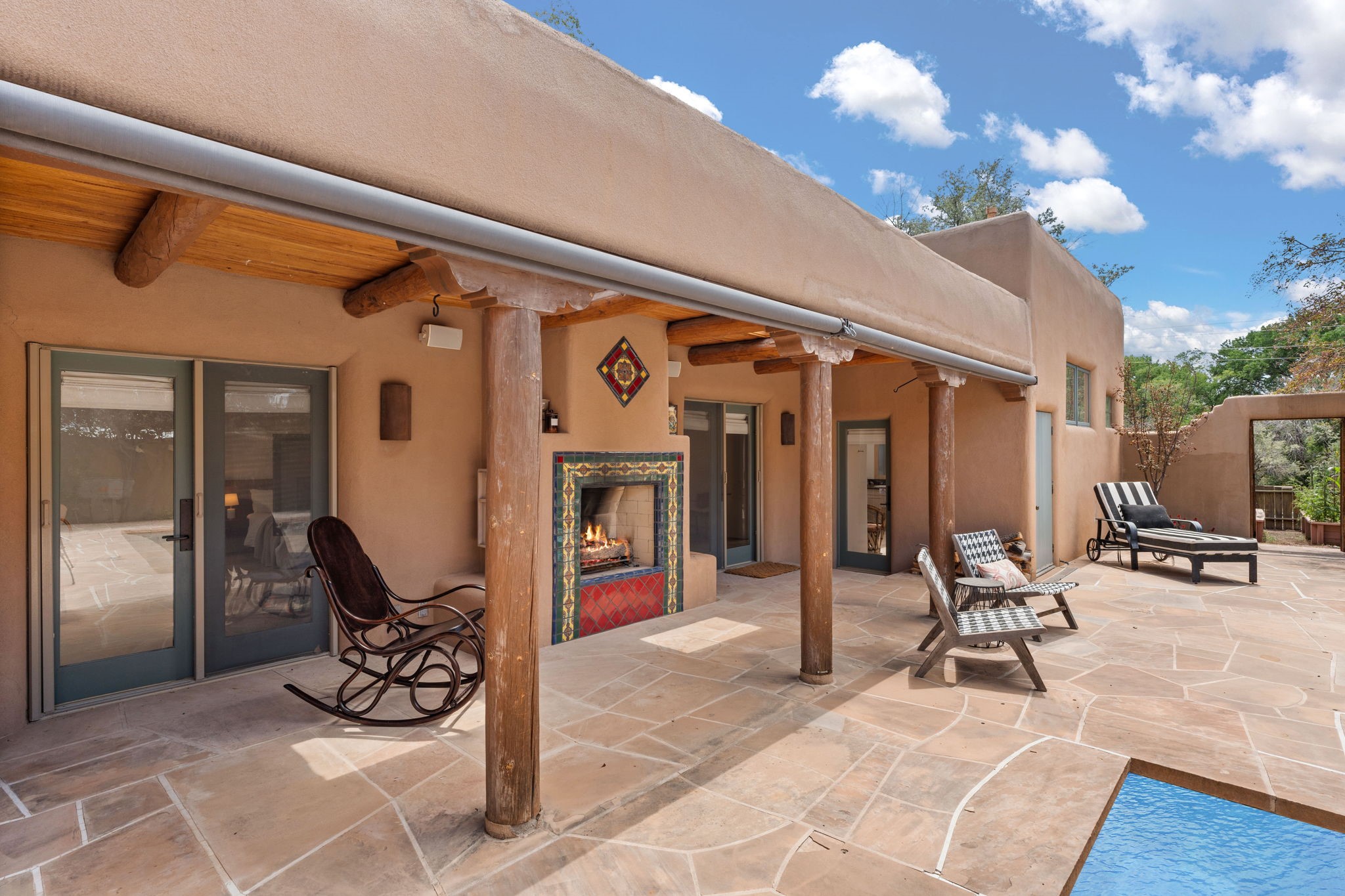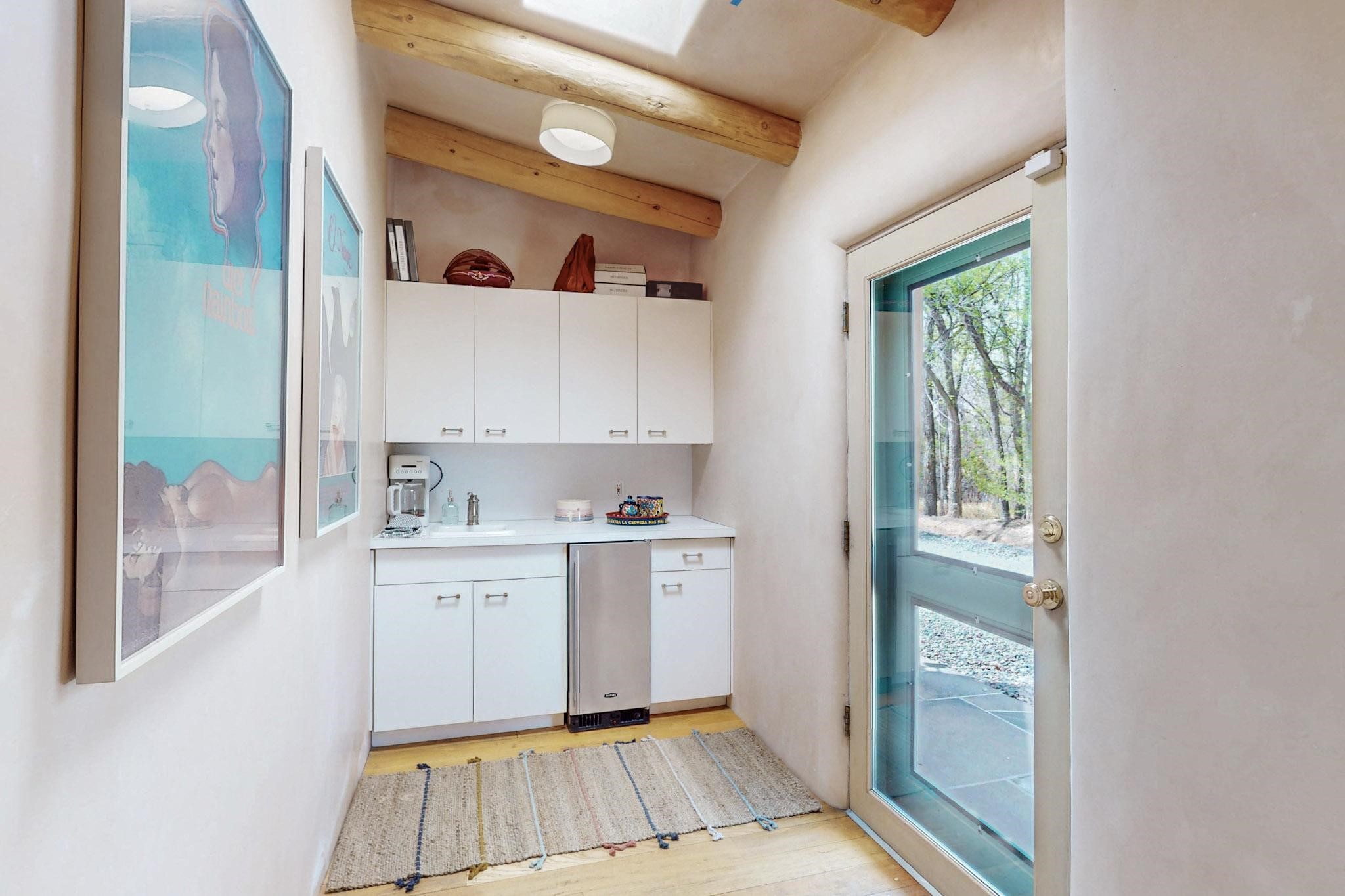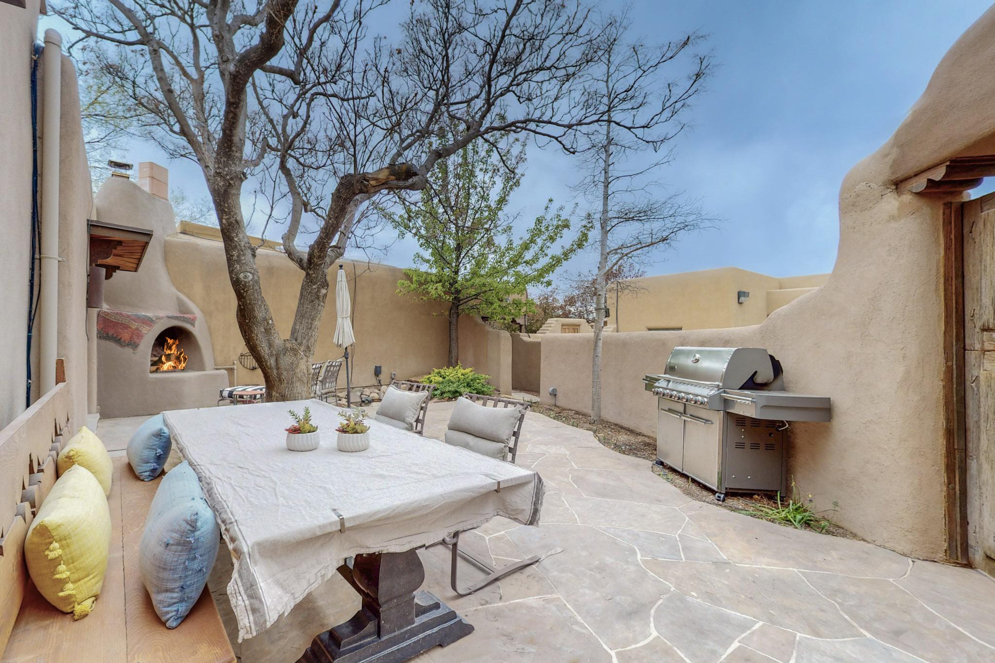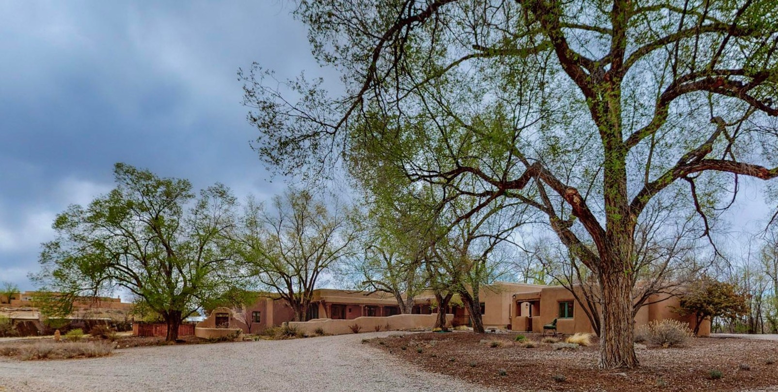 Situated on 2.05 fertile acres in the Nambe Valley lies Casa Alegria. With easy access to both Santa Fe and Los Alamos, this magnificent property boasts authentic Pueblo-style craftsmanship throughout. Surrounding the premiere home on this compound, you'll enjoy courtyards, portals, fireplaces, patios, and landscaped gardens, with mature trees. The interior of this expansive home offers a gourmet kitchen, hardwood and flagstone flooring, viga ceilings, and kiva fireplaces. In its expansive primary bedroom, you'll enjoy a spa bath, walk-in closet, and a spacious patio with its own swimming pool. Additionally, the one-bedroom guesthouse with equally impressive craftsmanship offers a dining area, bathroom, and kitchenette. Adjacent to the oversized 2-car garage is a bonus studio or office space, also with its own bath. Welcome to this spectacular northern New Mexico property.