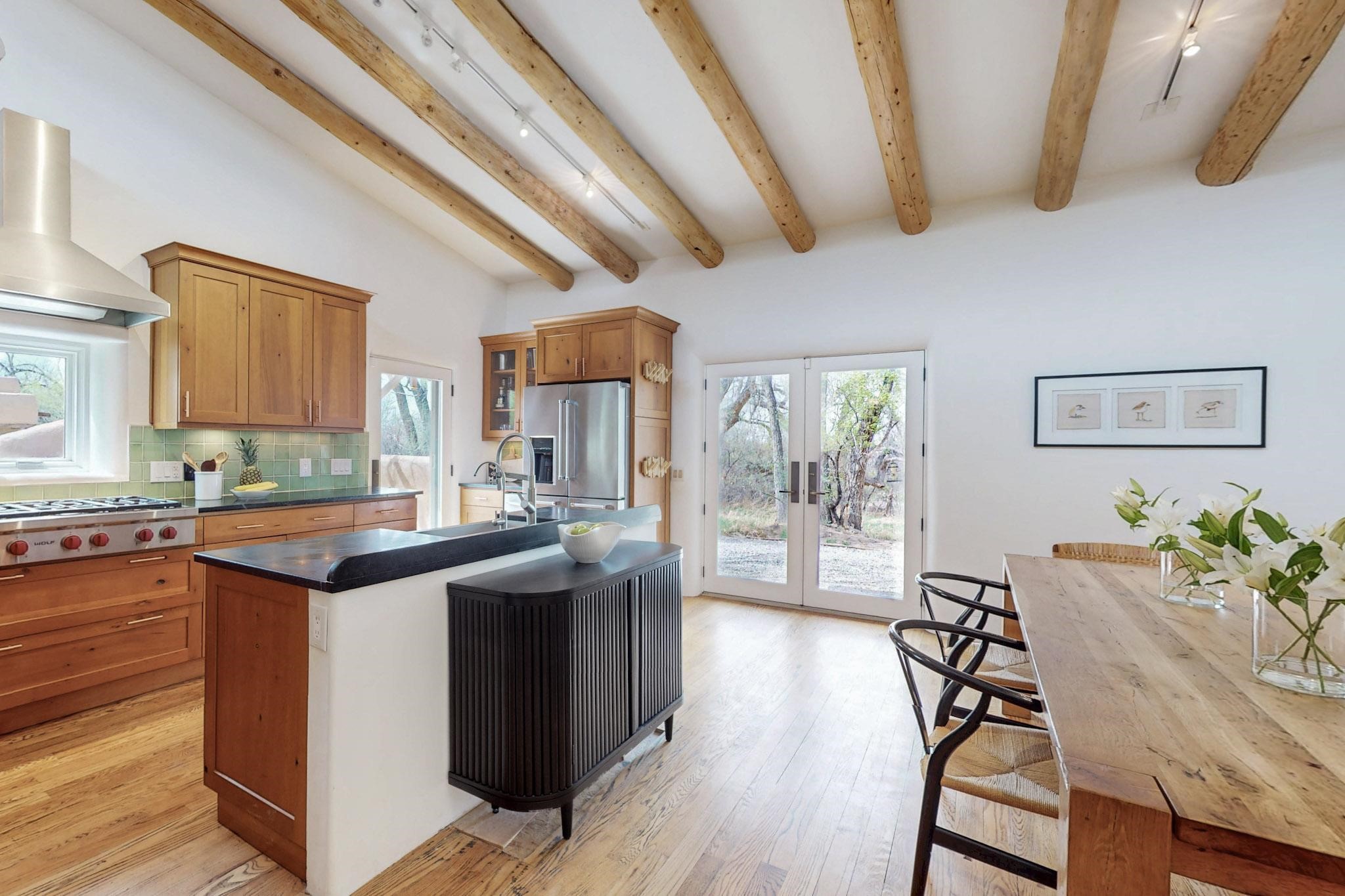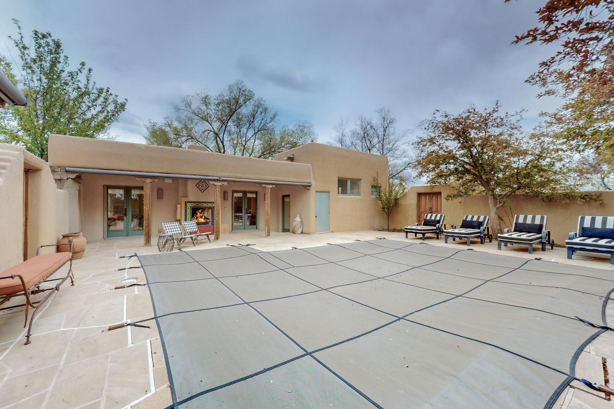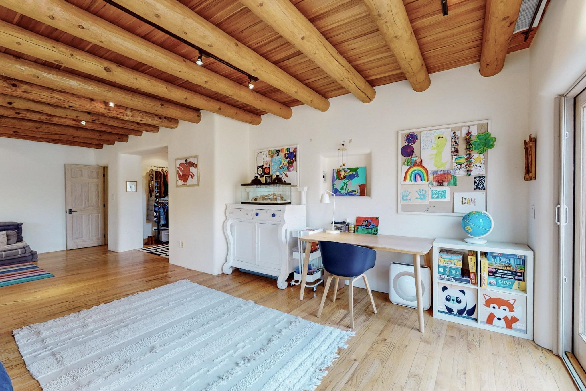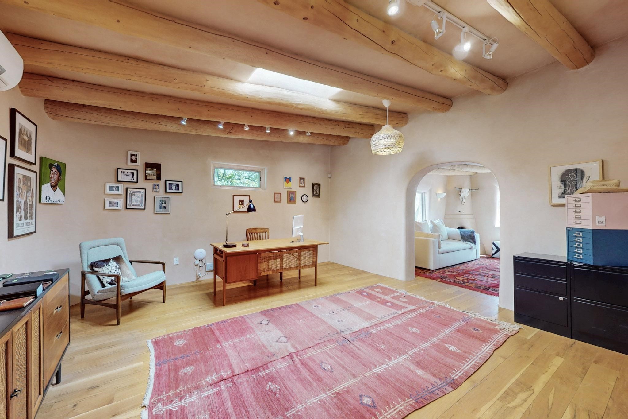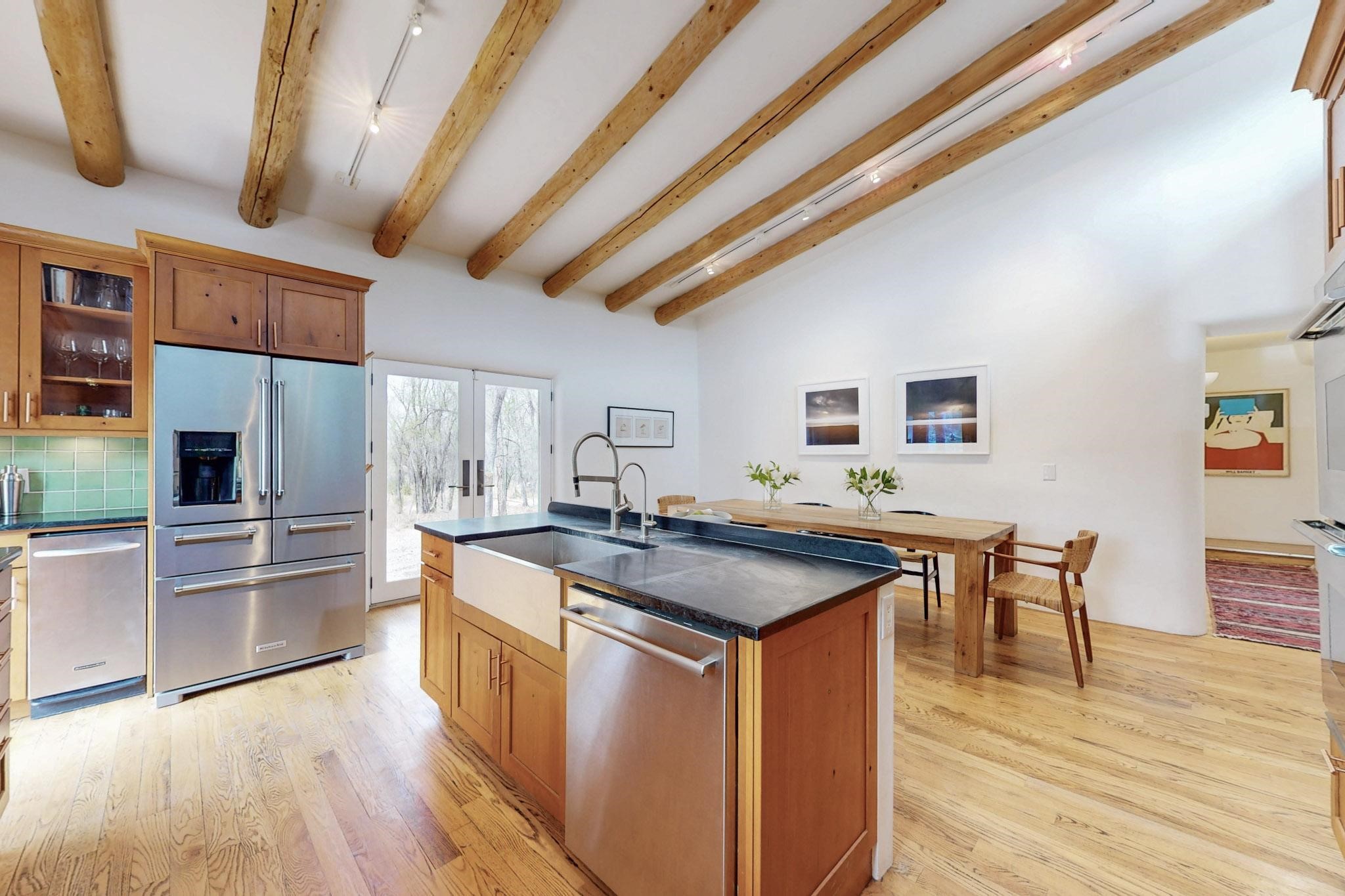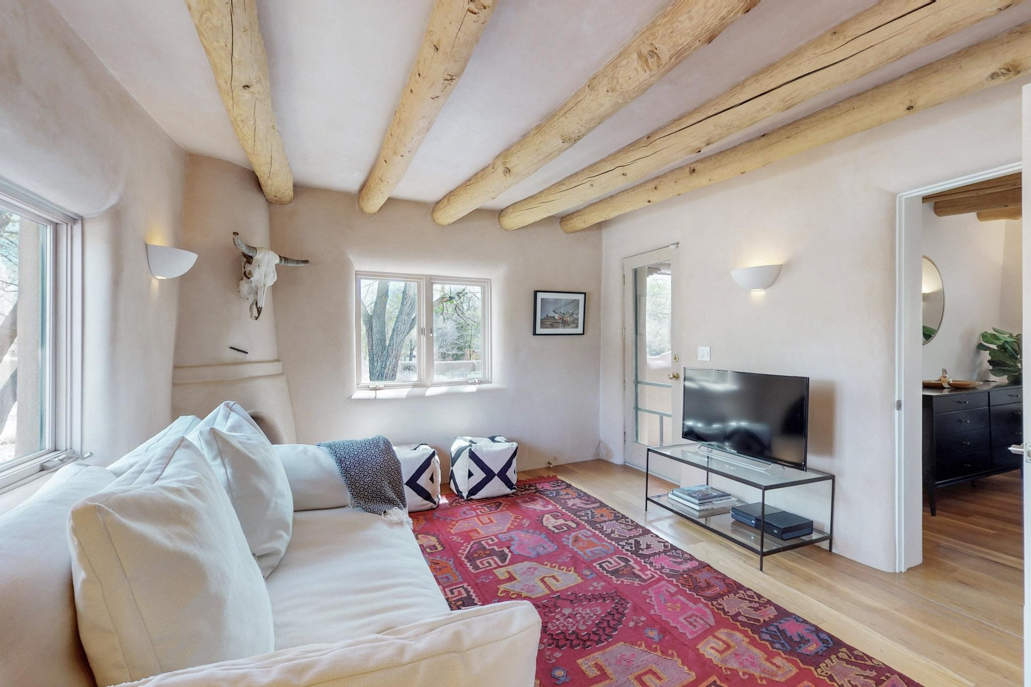 Situated on 2.05 fertile acres in the Nambe Valley lies Casa Alegria. With easy access to both Santa Fe and Los Alamos, this magnificent property boasts authentic Pueblo-style craftsmanship throughout. Surrounding the premiere home on this compound, you'll enjoy courtyards, portals, fireplaces, patios, and landscaped gardens, with mature trees. The interior of this expansive home offers a gourmet kitchen, hardwood and flagstone flooring, viga ceilings, and kiva fireplaces. In its expansive primary bedroom, you'll enjoy a spa bath, walk-in closet, and a spacious patio with its own swimming pool. Additionally, the one-bedroom guesthouse with equally impressive craftsmanship offers a dining area, bathroom, and kitchenette. Adjacent to the oversized 2-car garage is a bonus studio or office space, also with its own bath. Welcome to this spectacular northern New Mexico property.