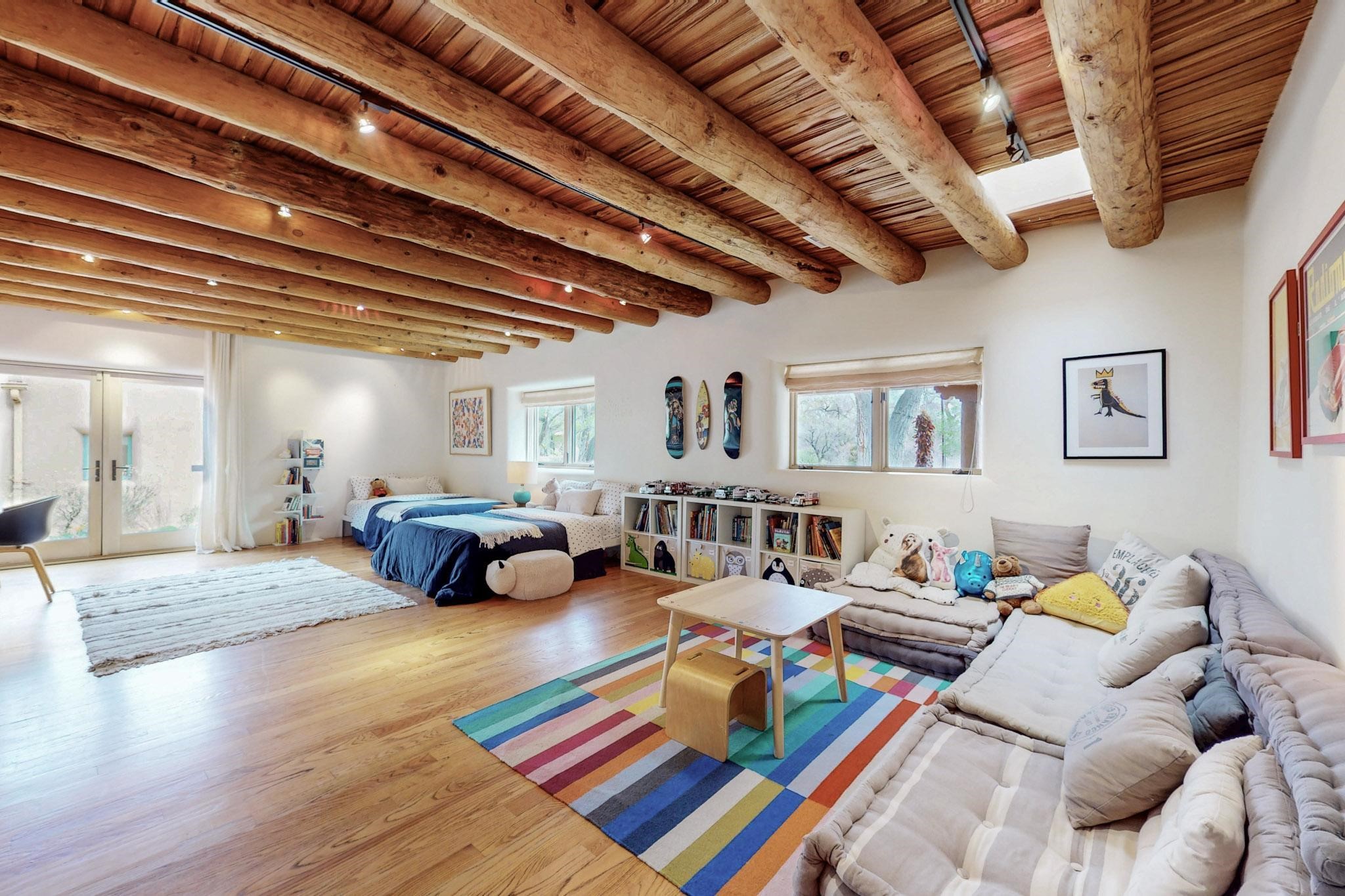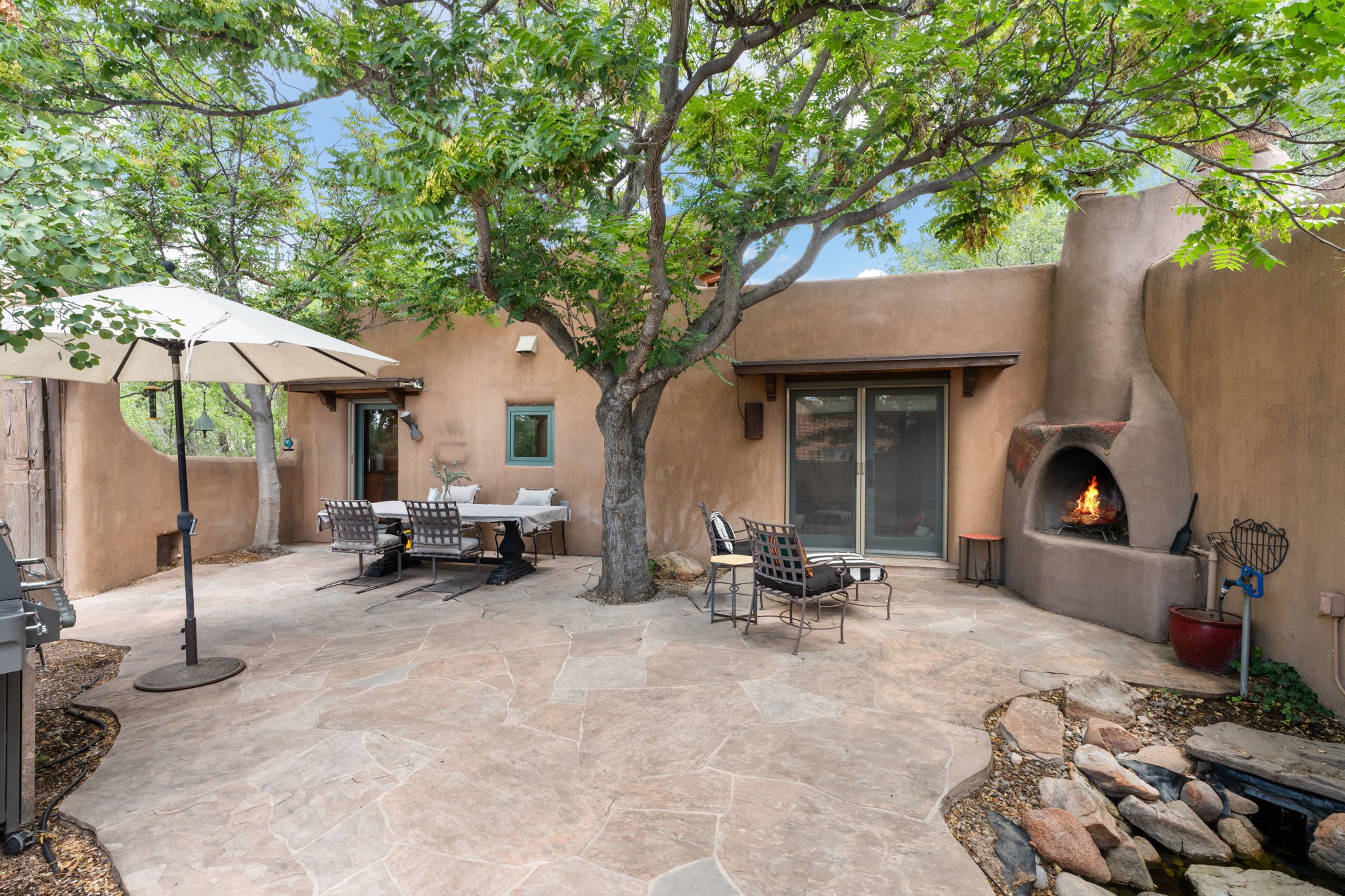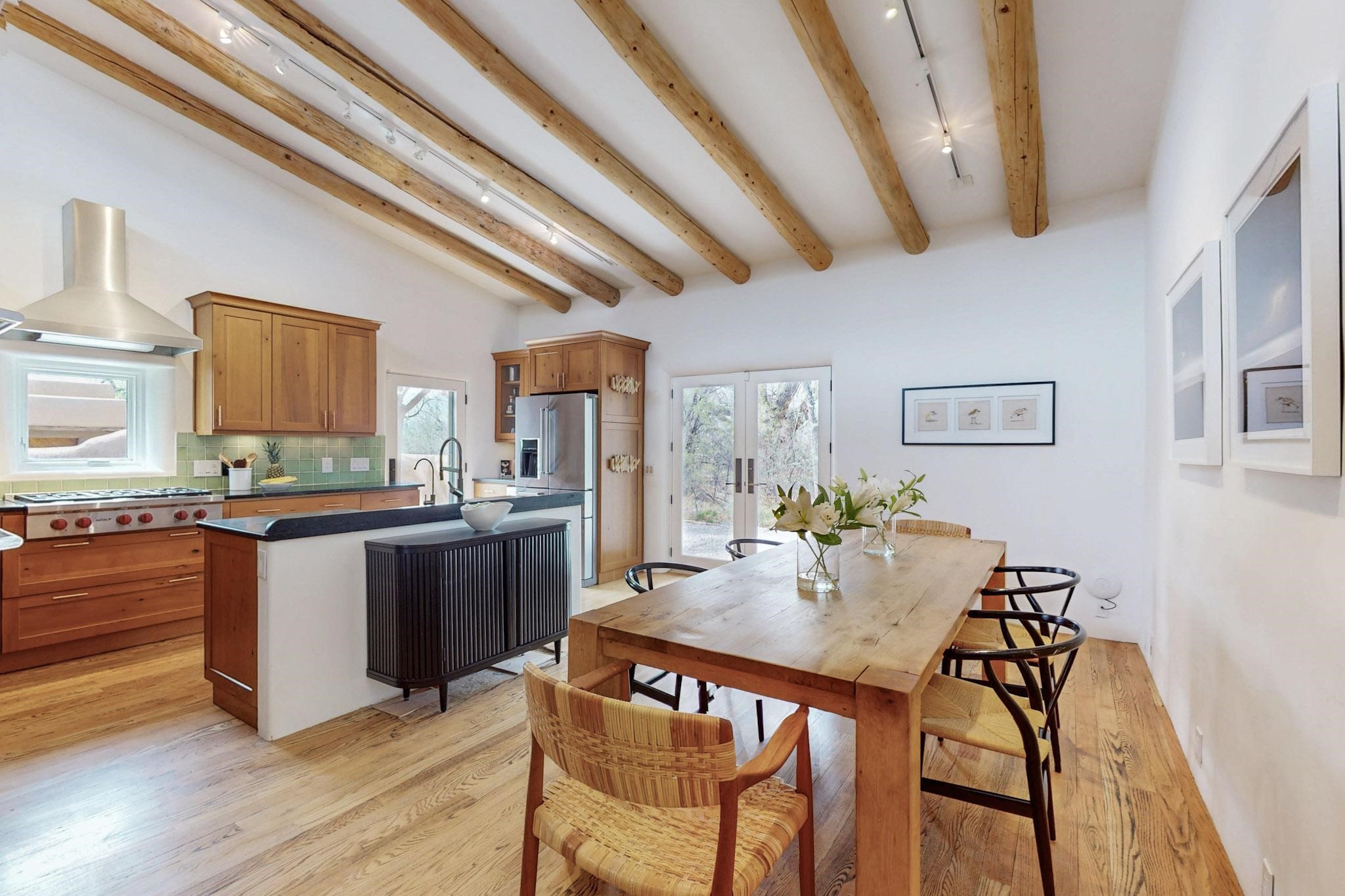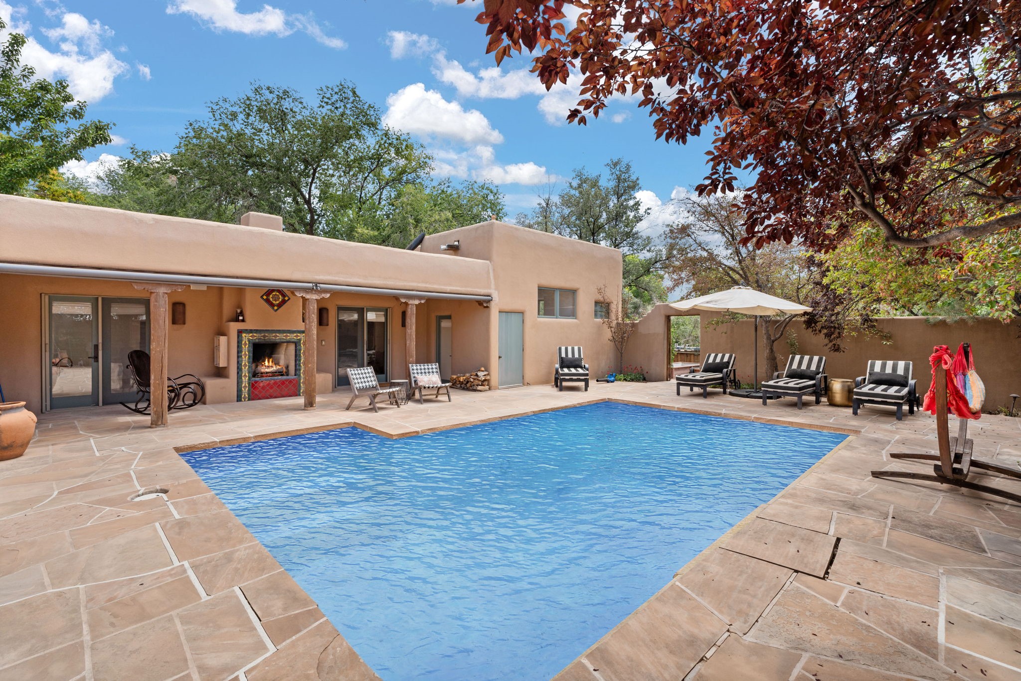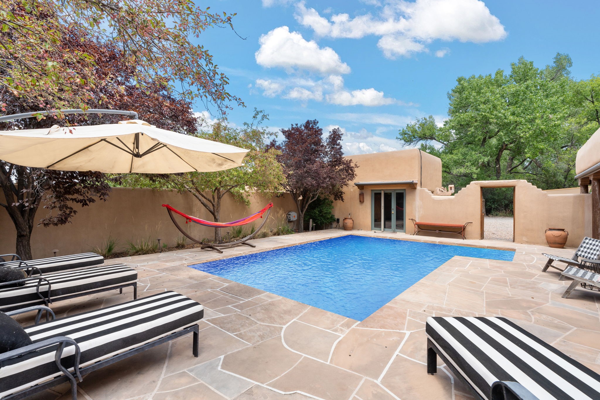 Situated on 2.05 fertile acres in the Nambe Valley lies Casa Alegria. With easy access to both Santa Fe and Los Alamos, this magnificent property boasts authentic Pueblo-style craftsmanship throughout. Surrounding the premiere home on this compound, you'll enjoy courtyards, portals, fireplaces, patios, and landscaped gardens, with mature trees. The interior of this expansive home offers a gourmet kitchen, hardwood and flagstone flooring, viga ceilings, and kiva fireplaces. In its expansive primary bedroom, you'll enjoy a spa bath, walk-in closet, and a spacious patio with its own swimming pool. Additionally, the one-bedroom guesthouse with equally impressive craftsmanship offers a dining area, bathroom, and kitchenette. Adjacent to the oversized 2-car garage is a bonus studio or office space, also with its own bath. Welcome to this spectacular northern New Mexico property.