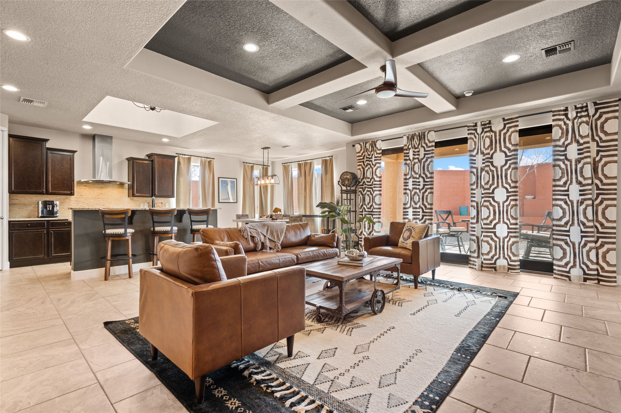 CORNER-LOT IN HIGHLY DESIRABLE LOMAS ENCANTADAS - This stunning corner-lot property in the highly sought after Lomas Encantadas Community offers the perfect blend of both comfort and elegance with its chic architectural details throughout. Meticulously maintained by its owner, this 3-bedroom, 3-bathroom single-story residence with no interior steps also includes a flex room that can serve as a supplemental office or media room. Enjoy cooking in the beautifully appointed chef's kitchen, which features stainless steel appliances, granite counter tops, and a sizable pantry. The spacious living room is bathed in natural light and boasts a coffered, two-tone ceiling which seamlessly flows into the kitchen and dining areas and opens onto a covered patio. The large three-panel door leading to the rear patio provides plenty of natural light and the perfect vantage point for enjoying those spectacular evening sunsets! The large primary suite offers ample space for a supplemental sitting area, while also accommodating a king-size bed. Two additional bedrooms are also generously sized and share a Jack-and-Jill Full bathroom. The tandem garage provides extra room for a significant amount of storage and either a workshop or hobby space. With its spectacular views of the Sandia Mountains at the front of the property and sunset views available via the rear patio, the outdoor spaces are truly inviting! This lovely home is conveniently located just minutes from schools, shopping, restaurants, and a dog park. Don't miss out on this exciting opportunity to own this spectacular home in Lomas Encantadas - schedule your showing today!