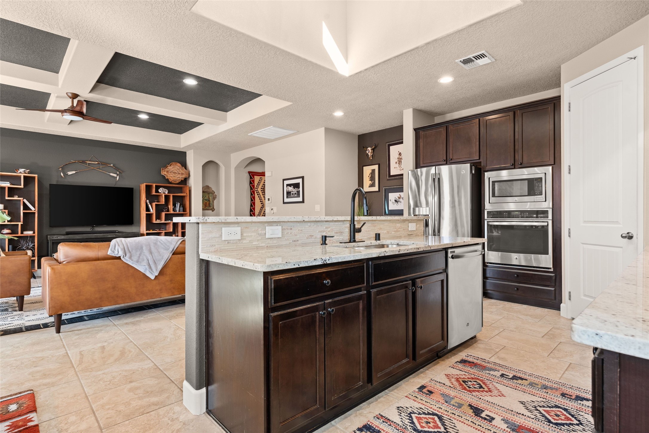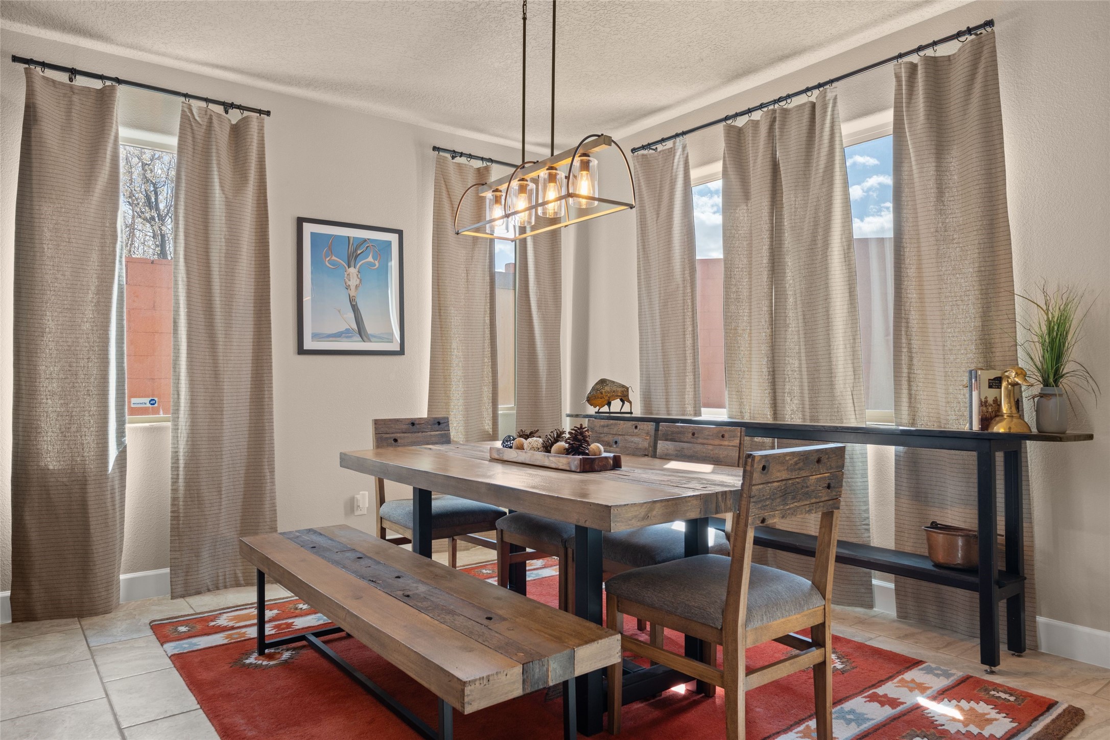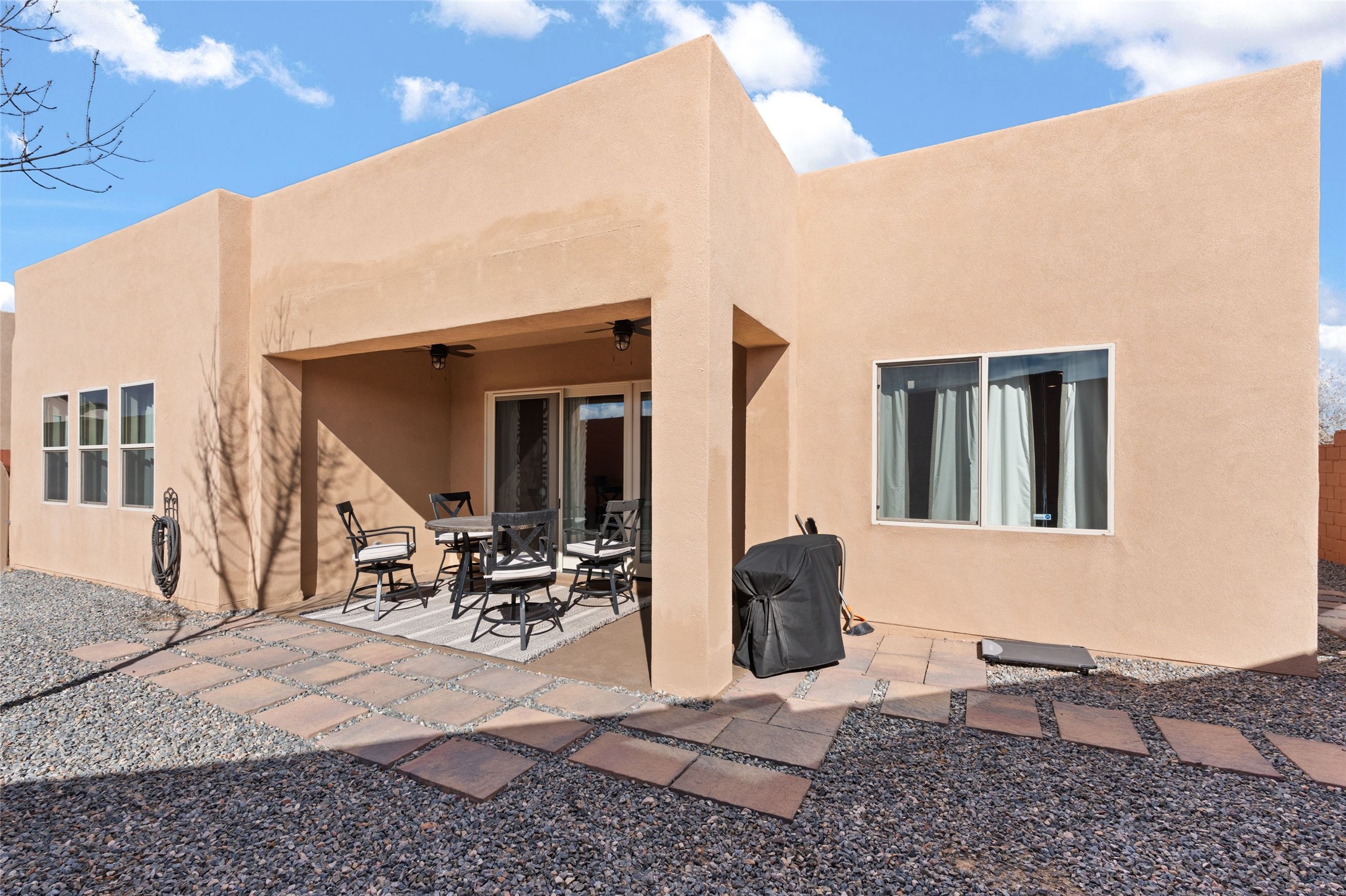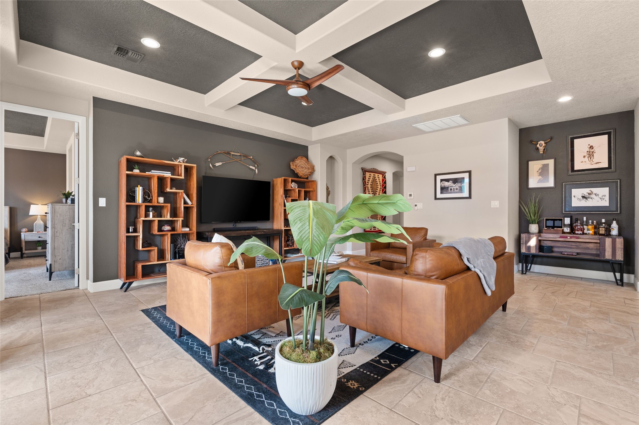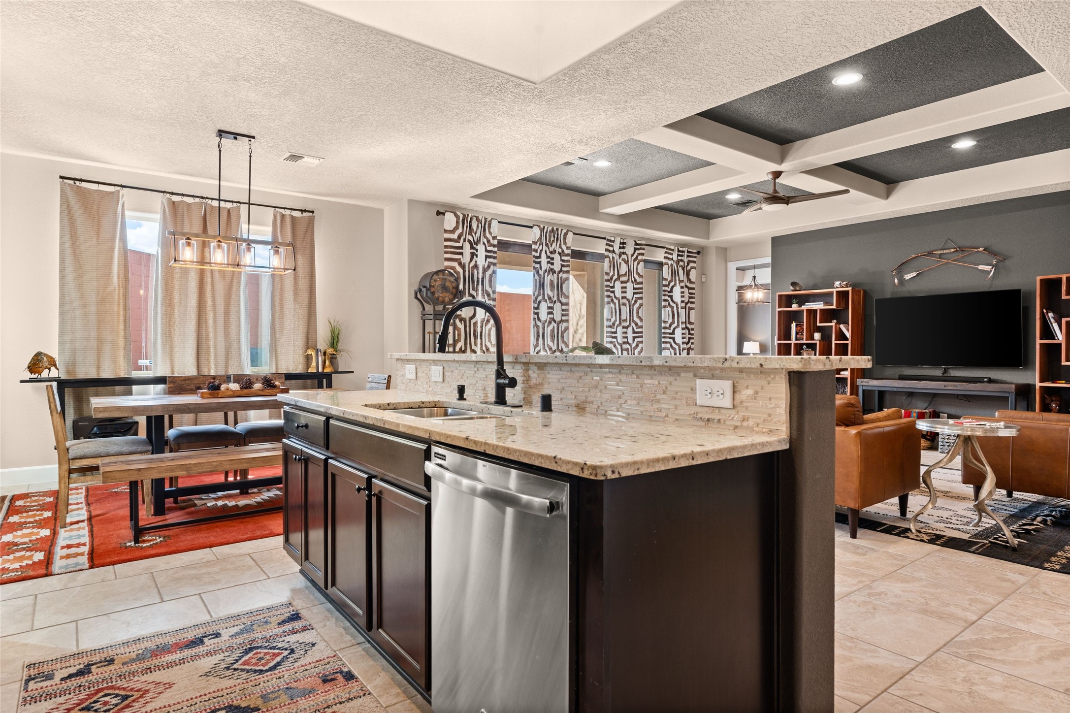 CORNER-LOT IN HIGHLY DESIRABLE LOMAS ENCANTADAS - This stunning corner-lot property in the highly sought after Lomas Encantadas Community offers the perfect blend of both comfort and elegance with its chic architectural details throughout. Meticulously maintained by its owner, this 3-bedroom, 3-bathroom single-story residence with no interior steps also includes a flex room that can serve as a supplemental office or media room. Enjoy cooking in the beautifully appointed chef's kitchen, which features stainless steel appliances, granite counter tops, and a sizable pantry. The spacious living room is bathed in natural light and boasts a coffered, two-tone ceiling which seamlessly flows into the kitchen and dining areas and opens onto a covered patio. The large three-panel door leading to the rear patio provides plenty of natural light and the perfect vantage point for enjoying those spectacular evening sunsets! The large primary suite offers ample space for a supplemental sitting area, while also accommodating a king-size bed. Two additional bedrooms are also generously sized and share a Jack-and-Jill Full bathroom. The tandem garage provides extra room for a significant amount of storage and either a workshop or hobby space. With its spectacular views of the Sandia Mountains at the front of the property and sunset views available via the rear patio, the outdoor spaces are truly inviting! This lovely home is conveniently located just minutes from schools, shopping, restaurants, and a dog park. Don't miss out on this exciting opportunity to own this spectacular home in Lomas Encantadas - schedule your showing today!