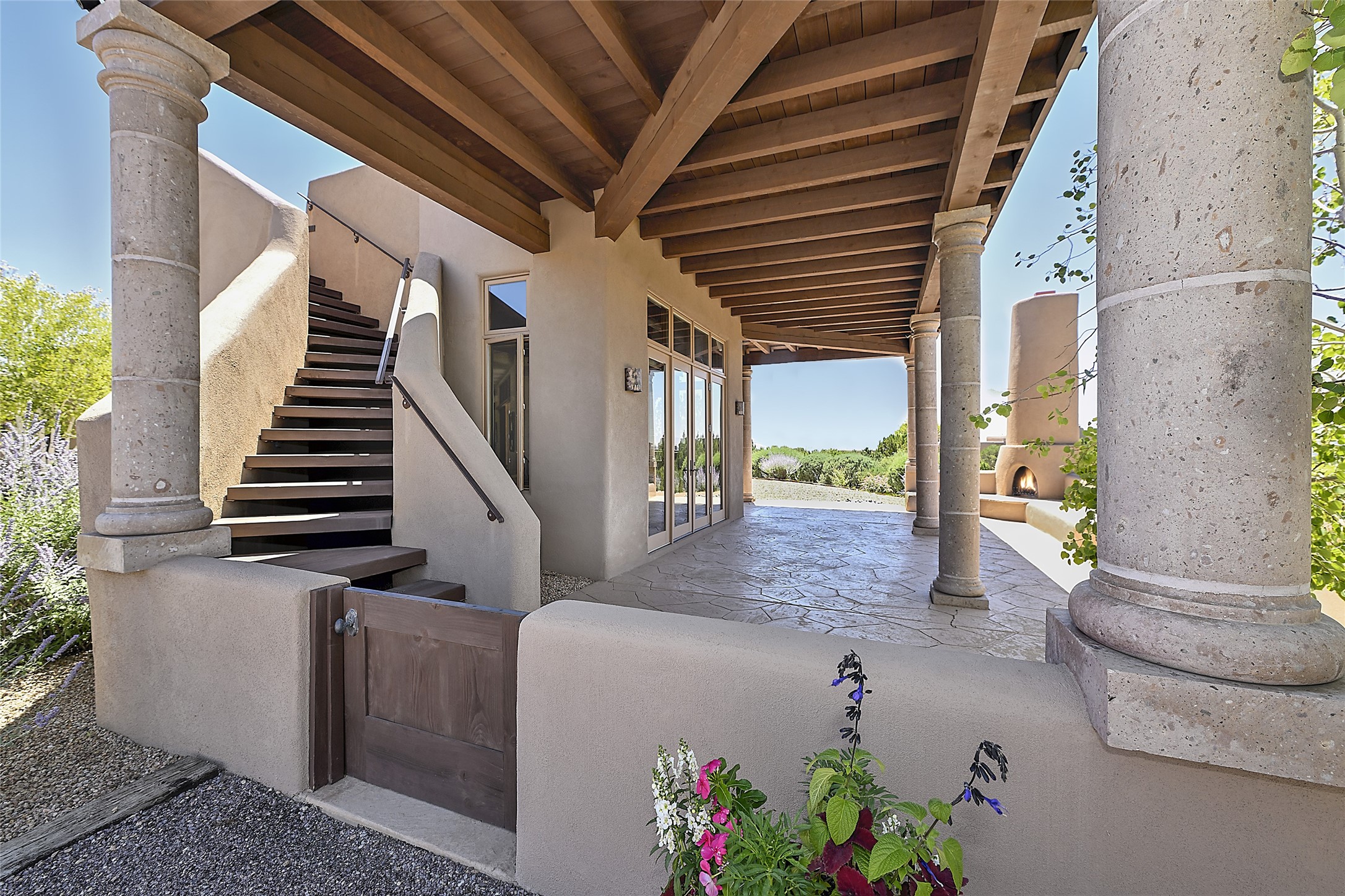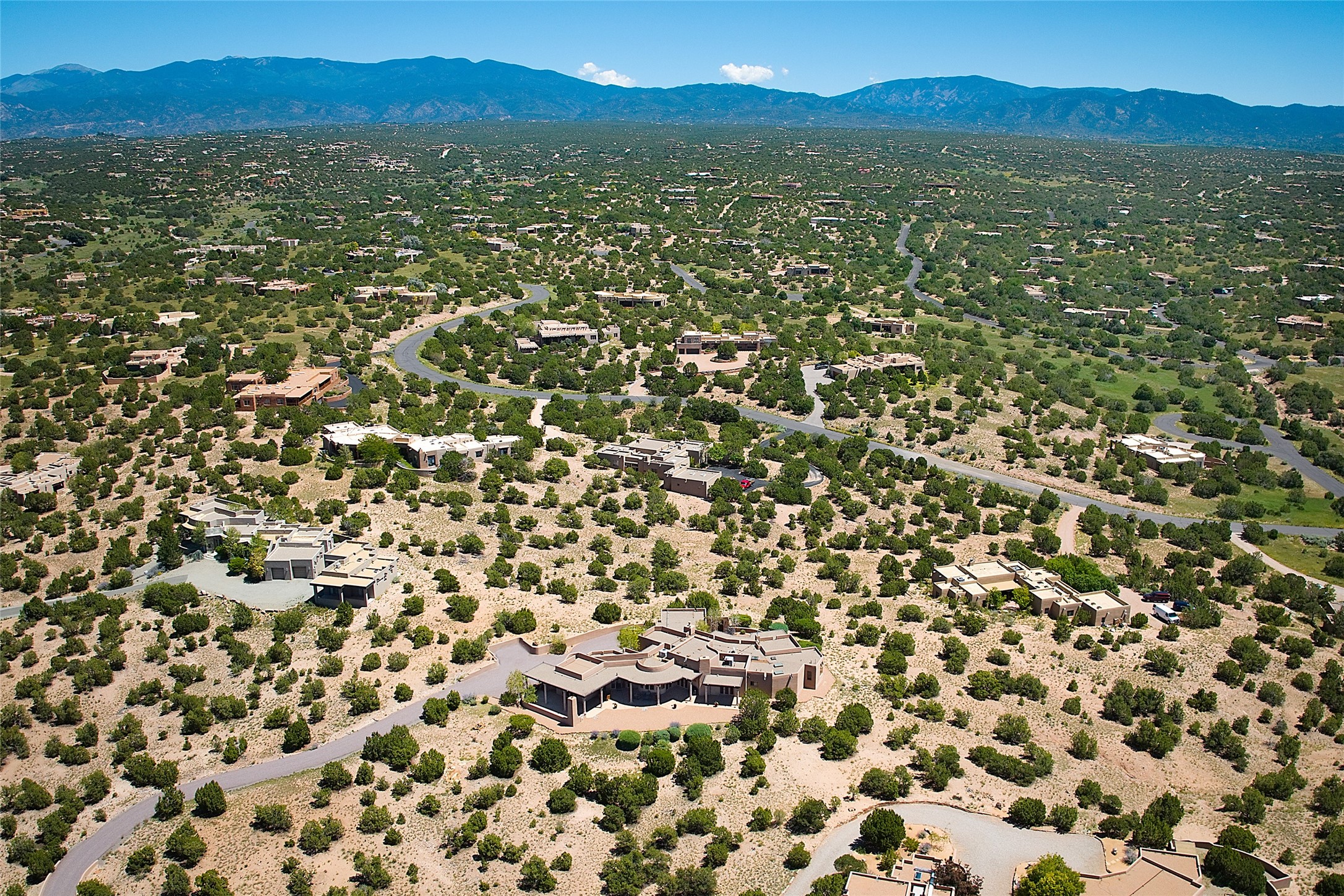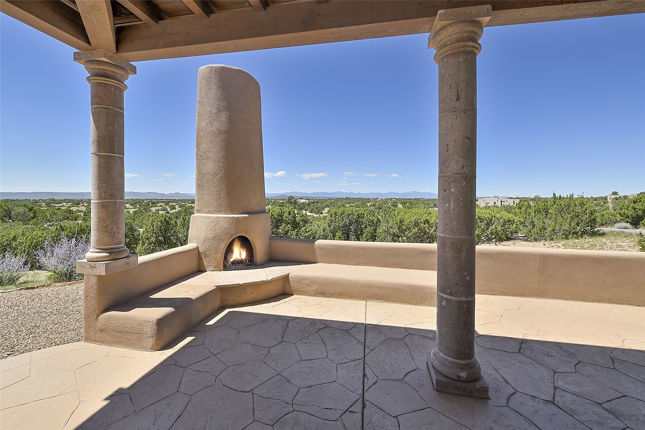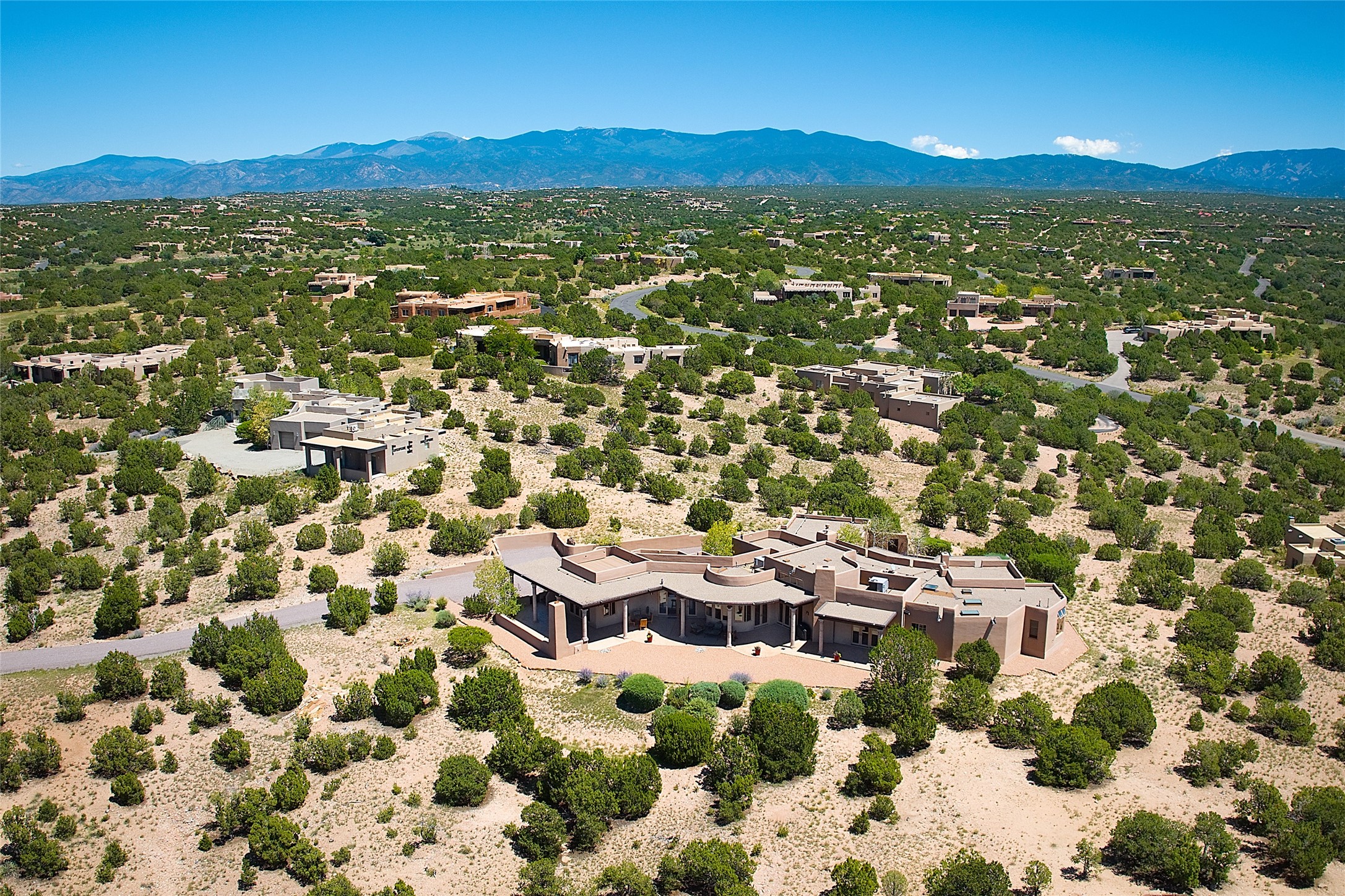 This beautiful 3,900+ sq ft, single level home is sited on a large and exciting 2.9 acre lot in Estates I of Las Campanas, only 6 miles from the Santa Fe Plaza. Incredible 360 degree views to the Jemez and Sandia mountains as well as the Sangre de Cristo mountains are framed by the spacious portals that surround the home, ideal for entertaining. The curved diamond plaster walls, with rounded details define the open living room, dining, kitchen and family areas. There are three bedrooms and four bathrooms, plus flex room. Mexican stone and travertine tiled floors and columns are skillfully incorporated into the luxurious interior spaces. A sweeping stairway on an outside portal leads to a roof top deck offering spectacular and unobstructed views of all the surrounding mountains. This gorgeous home has the location, design fit and fixtures that make it a must see. Memberships to The Club at Las Campanas are available for purchase upon approval.