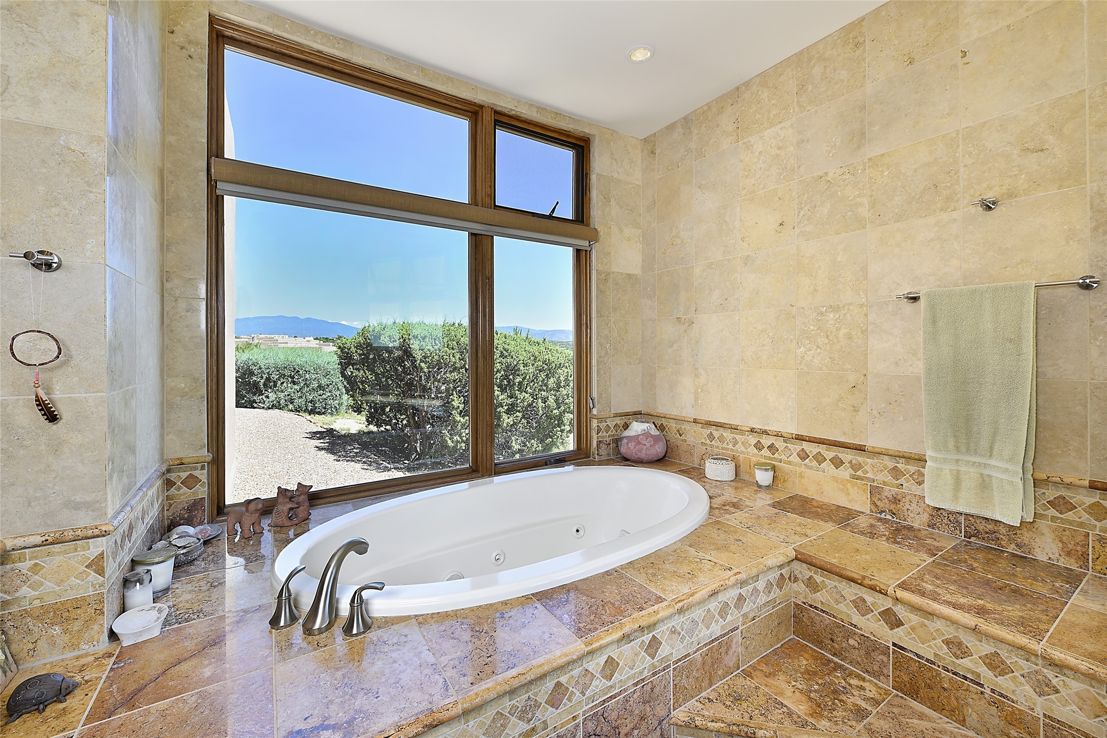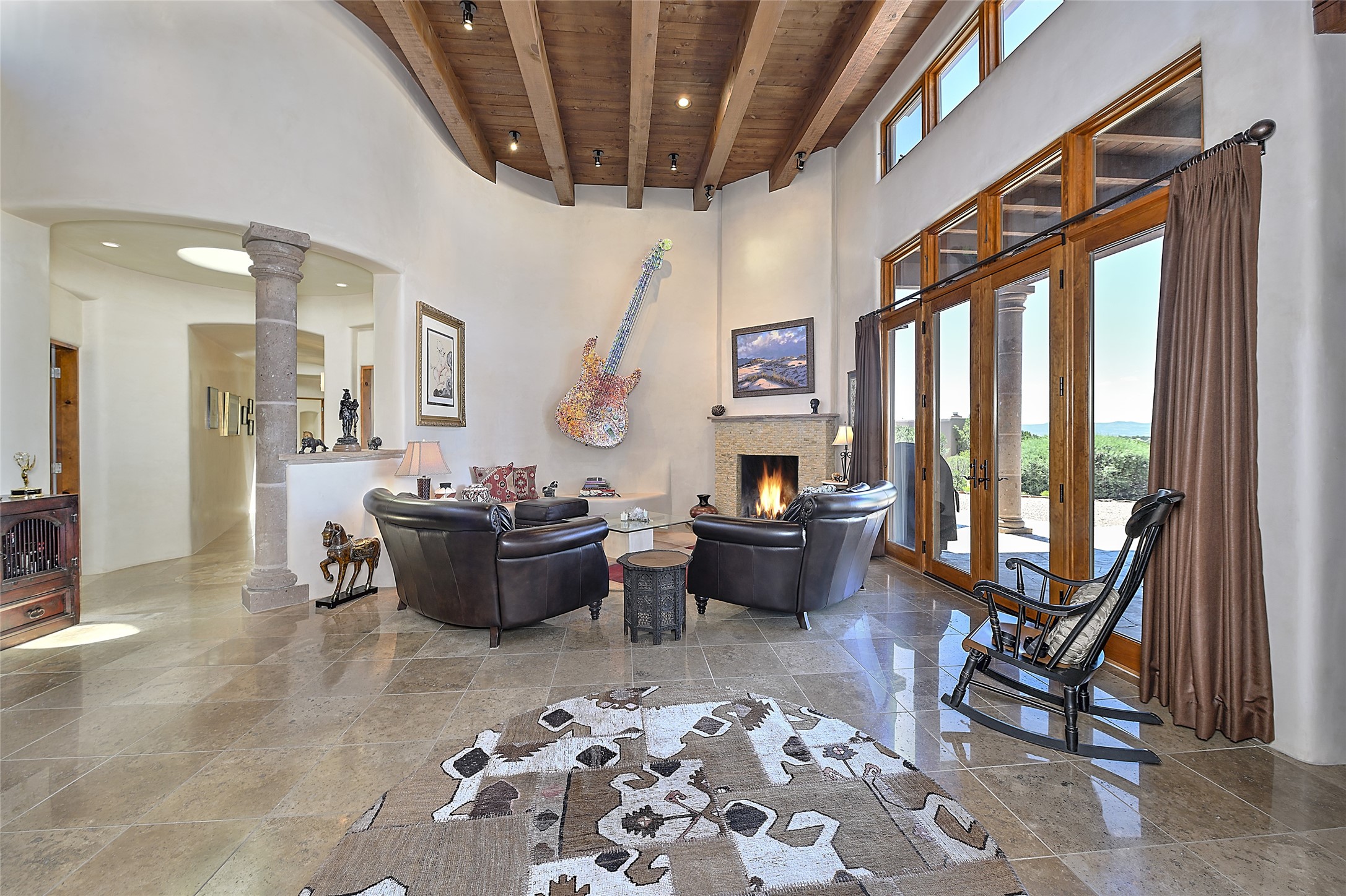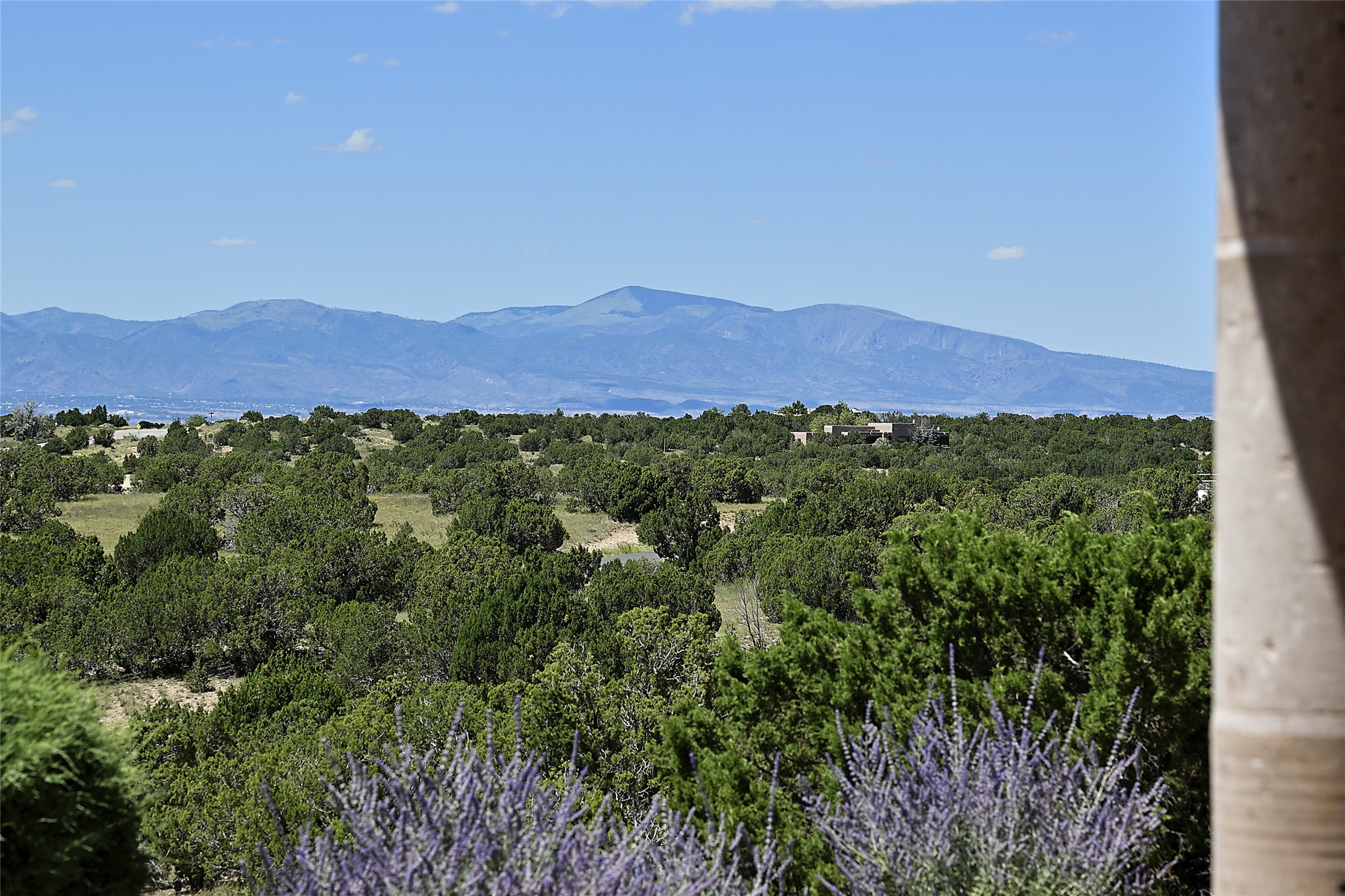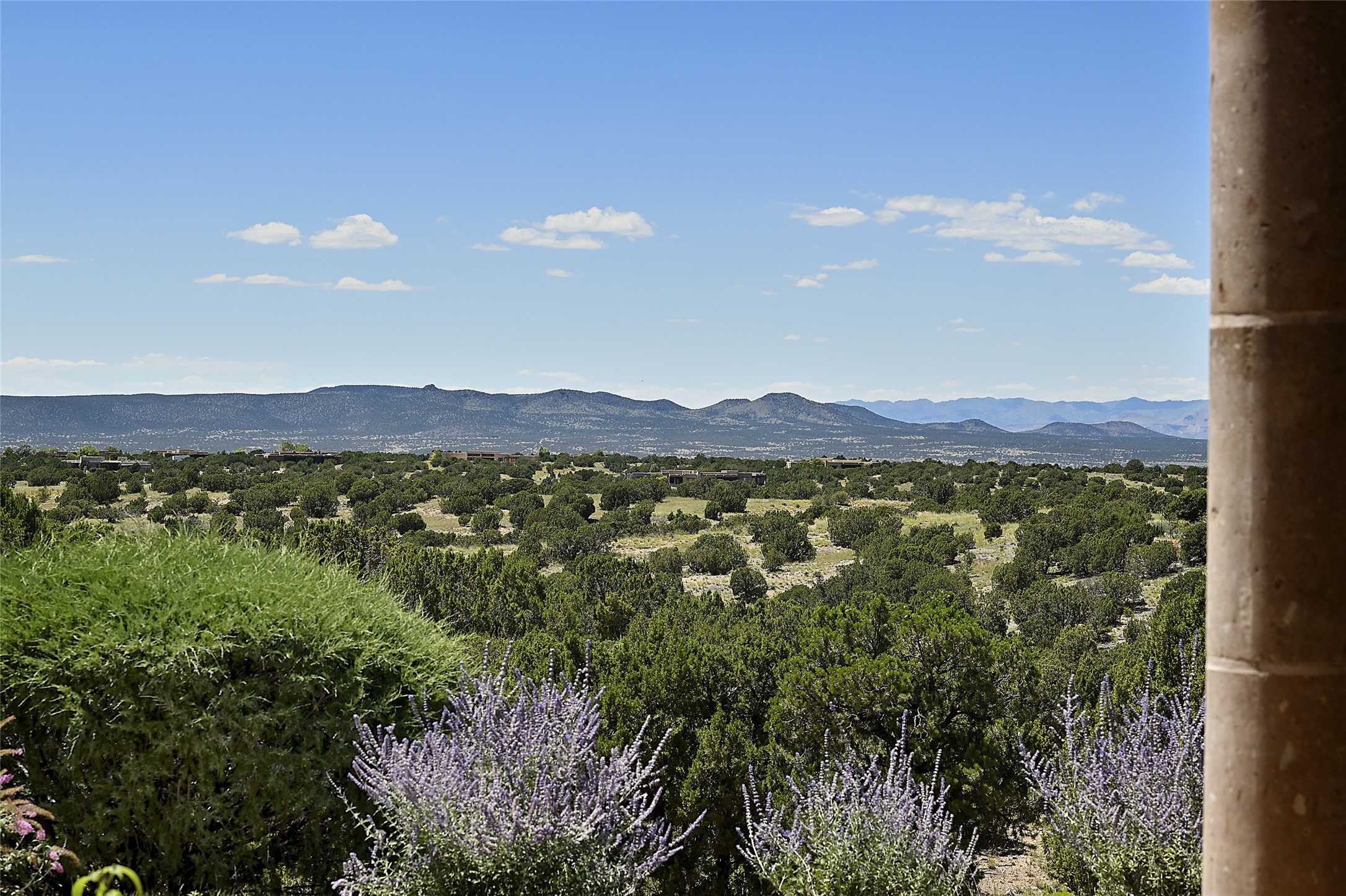 This beautiful 3,900+ sq ft, single level home is sited on a large and exciting 2.9 acre lot in Estates I of Las Campanas, only 6 miles from the Santa Fe Plaza. Incredible 360 degree views to the Jemez and Sandia mountains as well as the Sangre de Cristo mountains are framed by the spacious portals that surround the home, ideal for entertaining. The curved diamond plaster walls, with rounded details define the open living room, dining, kitchen and family areas. There are three bedrooms and four bathrooms, plus flex room. Mexican stone and travertine tiled floors and columns are skillfully incorporated into the luxurious interior spaces. A sweeping stairway on an outside portal leads to a roof top deck offering spectacular and unobstructed views of all the surrounding mountains. This gorgeous home has the location, design fit and fixtures that make it a must see. Memberships to The Club at Las Campanas are available for purchase upon approval.
