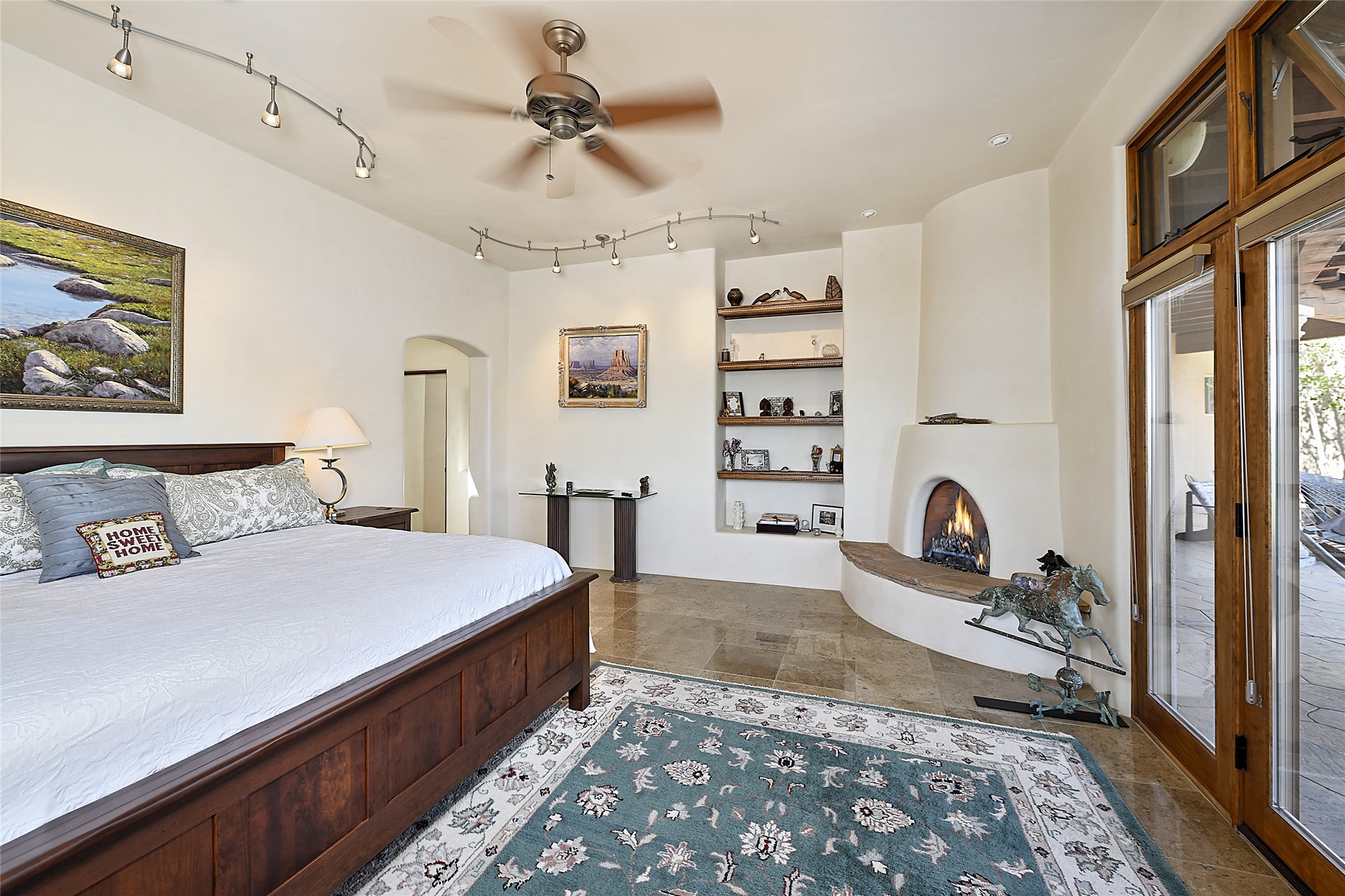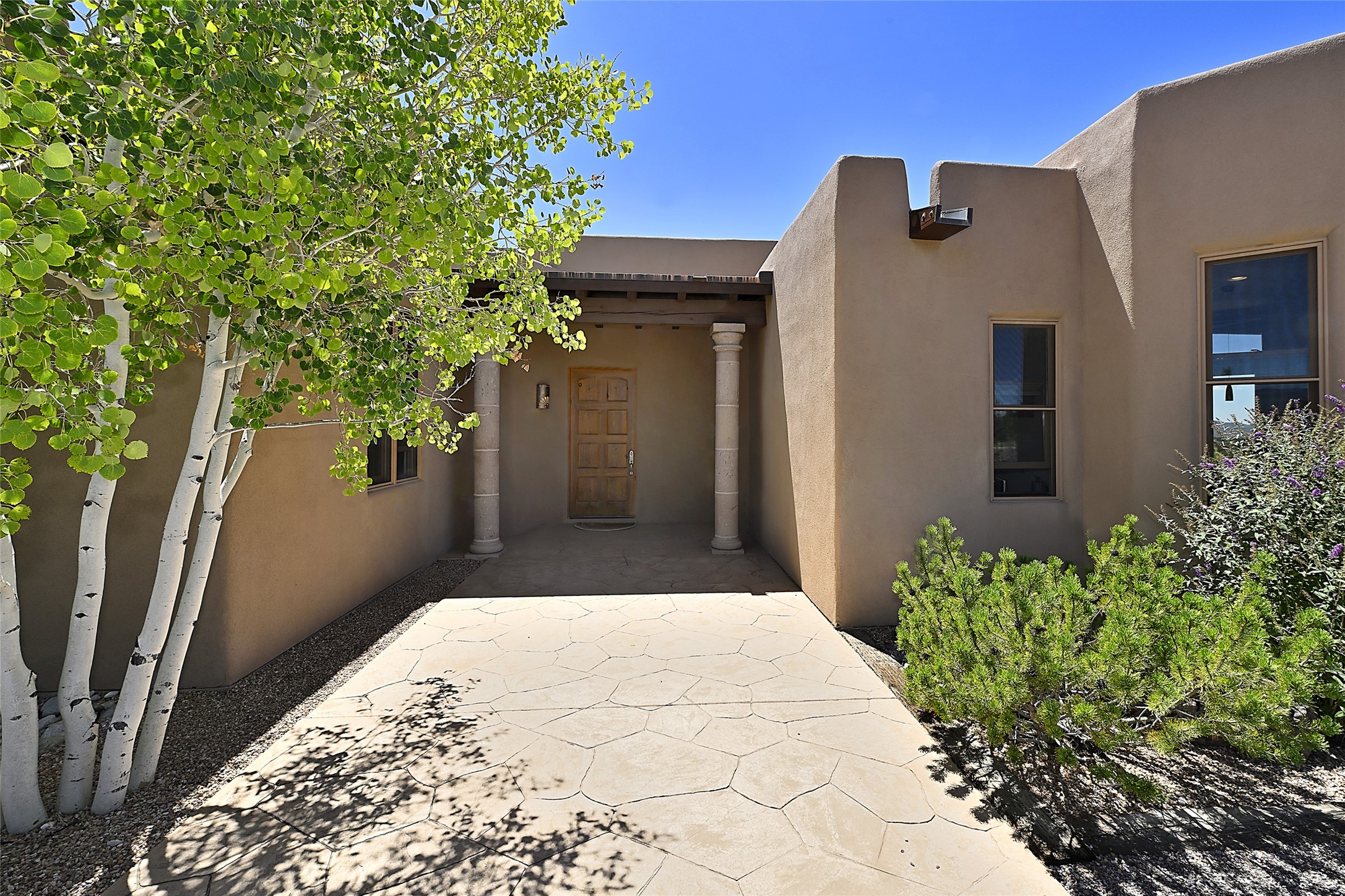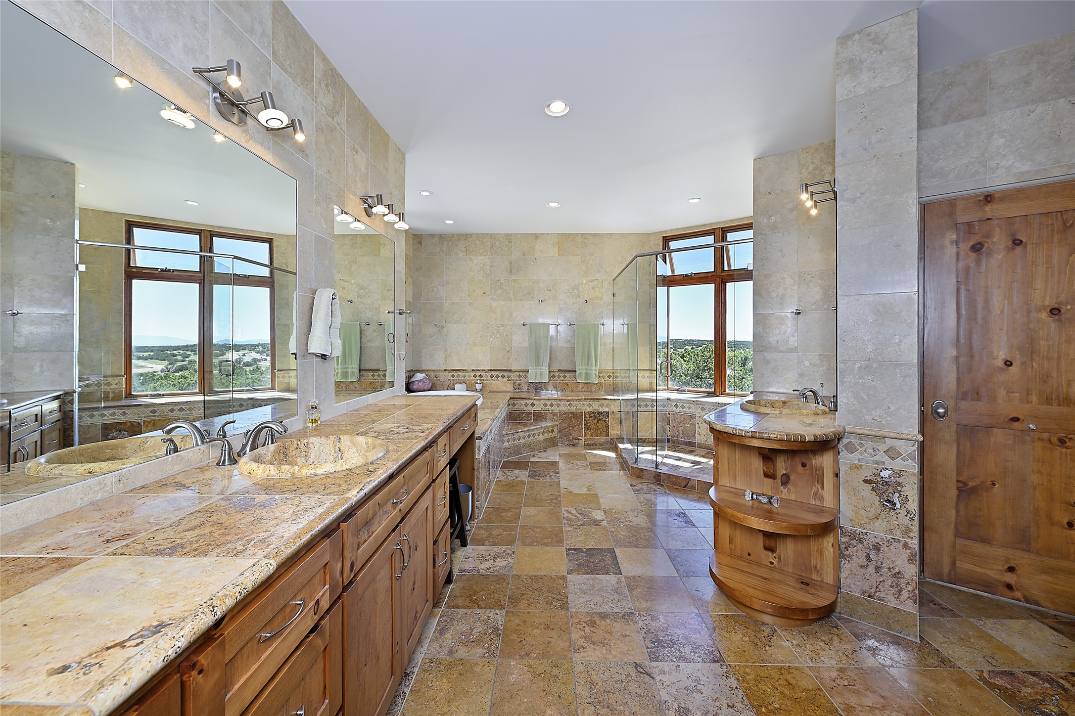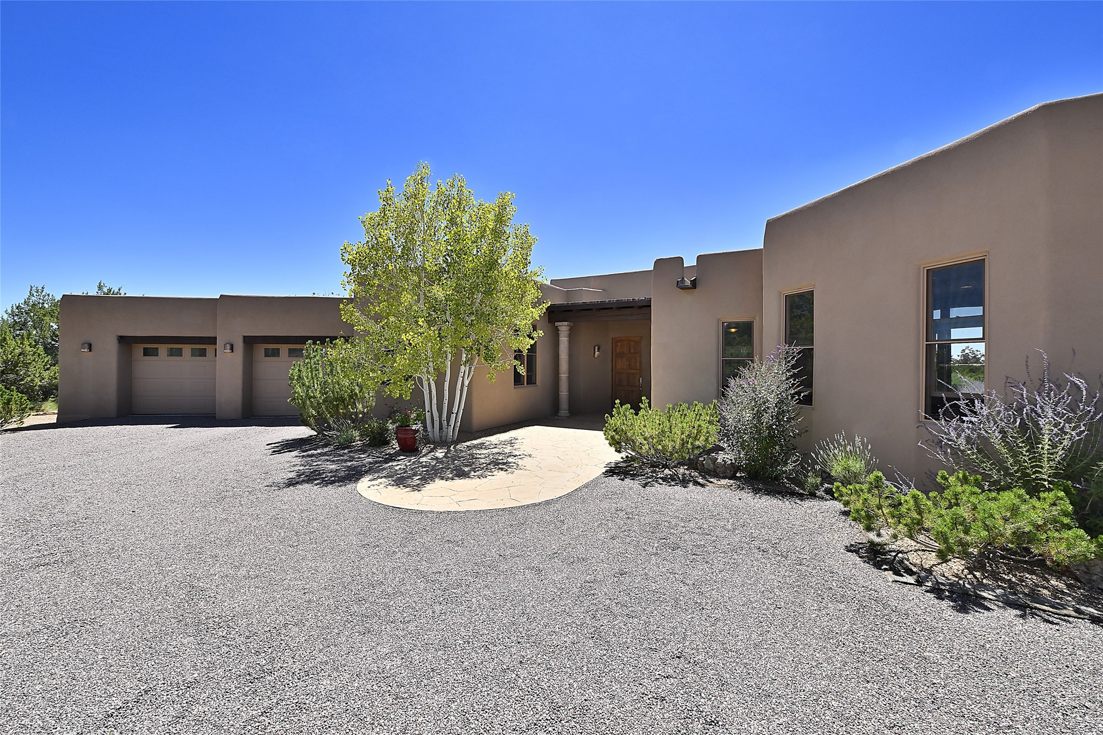 This beautiful 3,900+ sq ft, single level home is sited on a large and exciting 2.9 acre lot in Estates I of Las Campanas, only 6 miles from the Santa Fe Plaza. Incredible 360 degree views to the Jemez and Sandia mountains as well as the Sangre de Cristo mountains are framed by the spacious portals that surround the home, ideal for entertaining. The curved diamond plaster walls, with rounded details define the open living room, dining, kitchen and family areas. There are three bedrooms and four bathrooms, plus flex room. Mexican stone and travertine tiled floors and columns are skillfully incorporated into the luxurious interior spaces. A sweeping stairway on an outside portal leads to a roof top deck offering spectacular and unobstructed views of all the surrounding mountains. This gorgeous home has the location, design fit and fixtures that make it a must see. Memberships to The Club at Las Campanas are available for purchase upon approval.