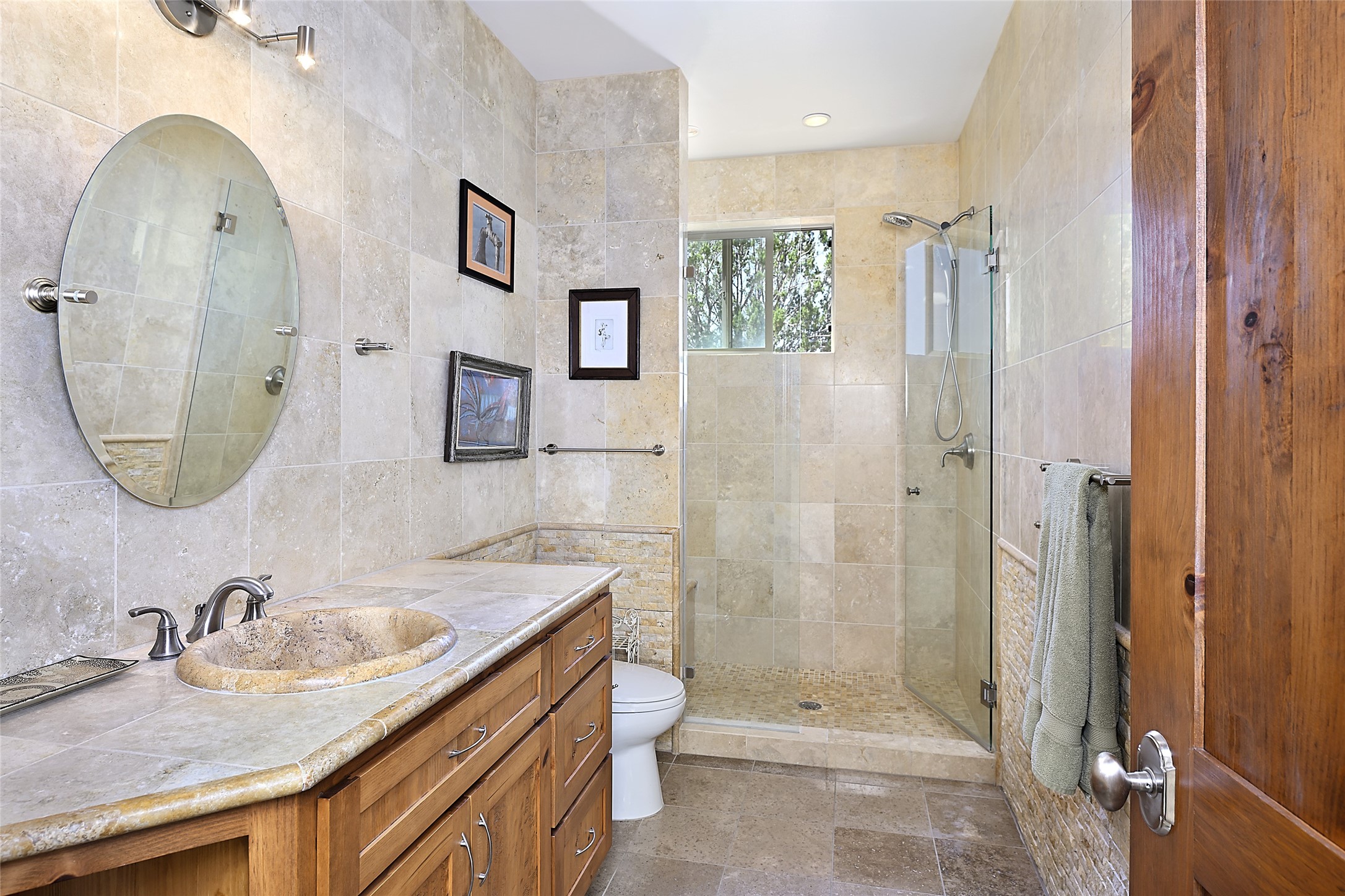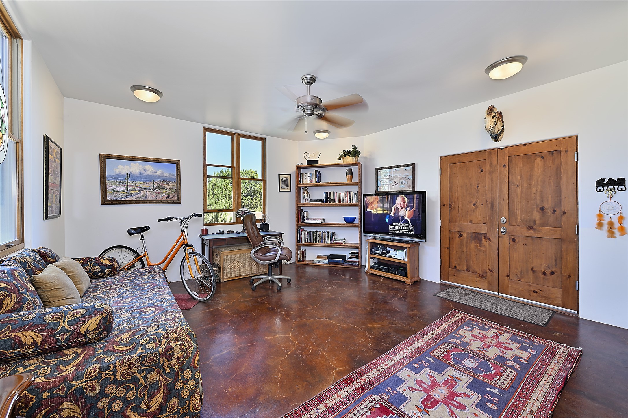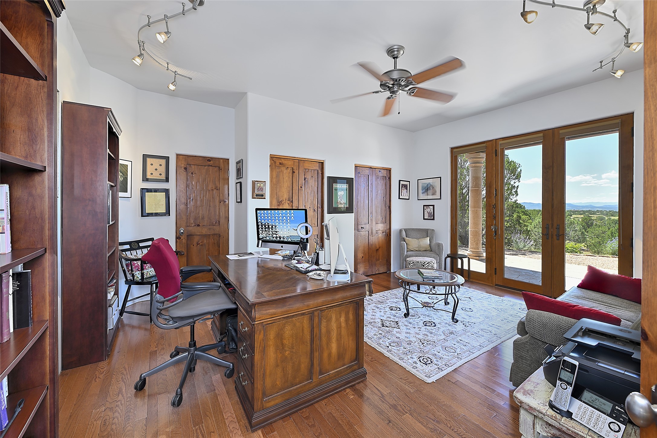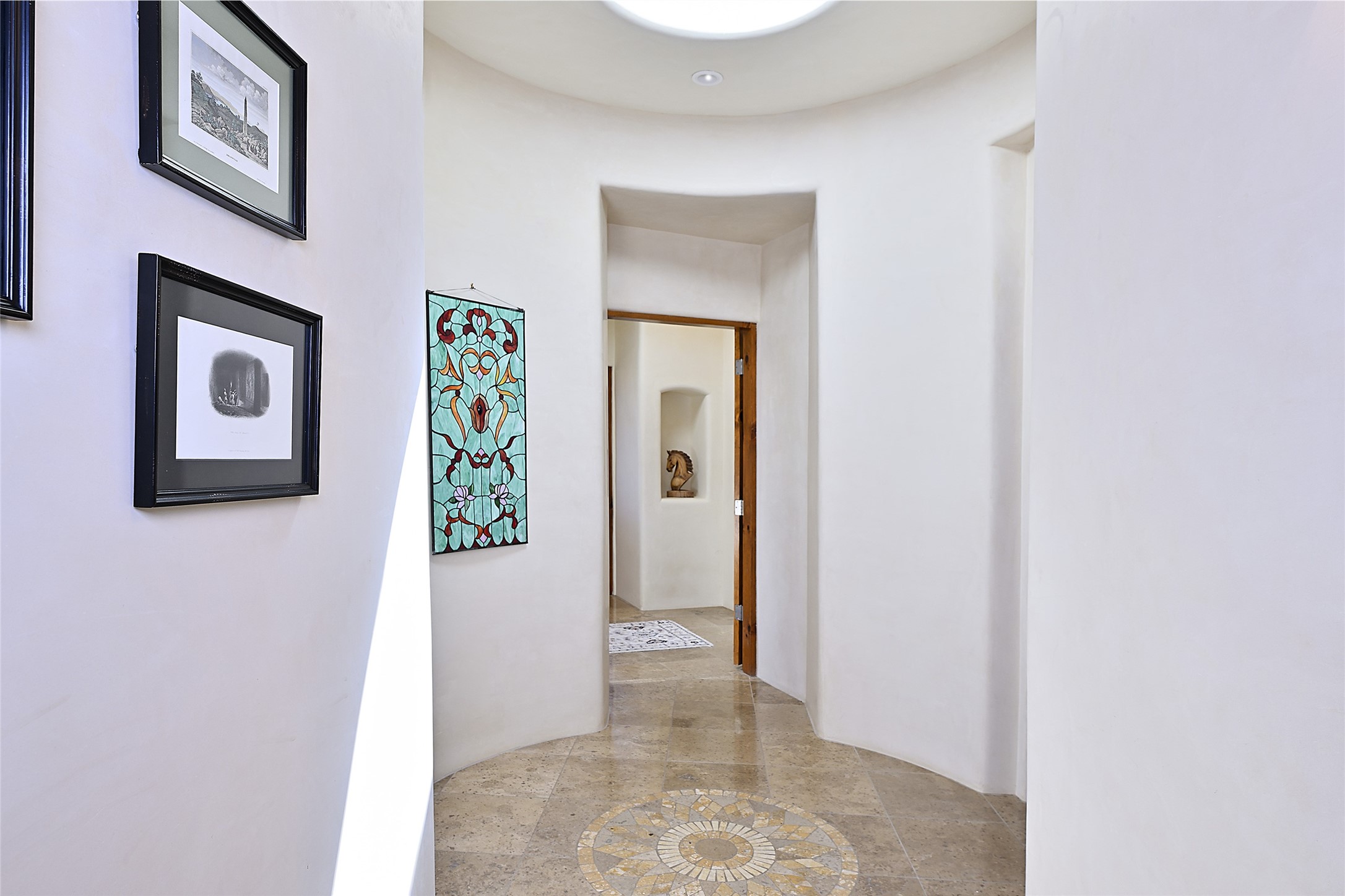 This beautiful 3,900+ sq ft, single level home is sited on a large and exciting 2.9 acre lot in Estates I of Las Campanas, only 6 miles from the Santa Fe Plaza. Incredible 360 degree views to the Jemez and Sandia mountains as well as the Sangre de Cristo mountains are framed by the spacious portals that surround the home, ideal for entertaining. The curved diamond plaster walls, with rounded details define the open living room, dining, kitchen and family areas. There are three bedrooms and four bathrooms, plus flex room. Mexican stone and travertine tiled floors and columns are skillfully incorporated into the luxurious interior spaces. A sweeping stairway on an outside portal leads to a roof top deck offering spectacular and unobstructed views of all the surrounding mountains. This gorgeous home has the location, design fit and fixtures that make it a must see. Memberships to The Club at Las Campanas are available for purchase upon approval.