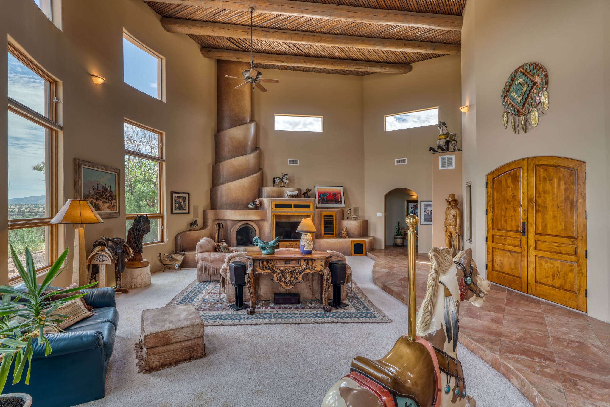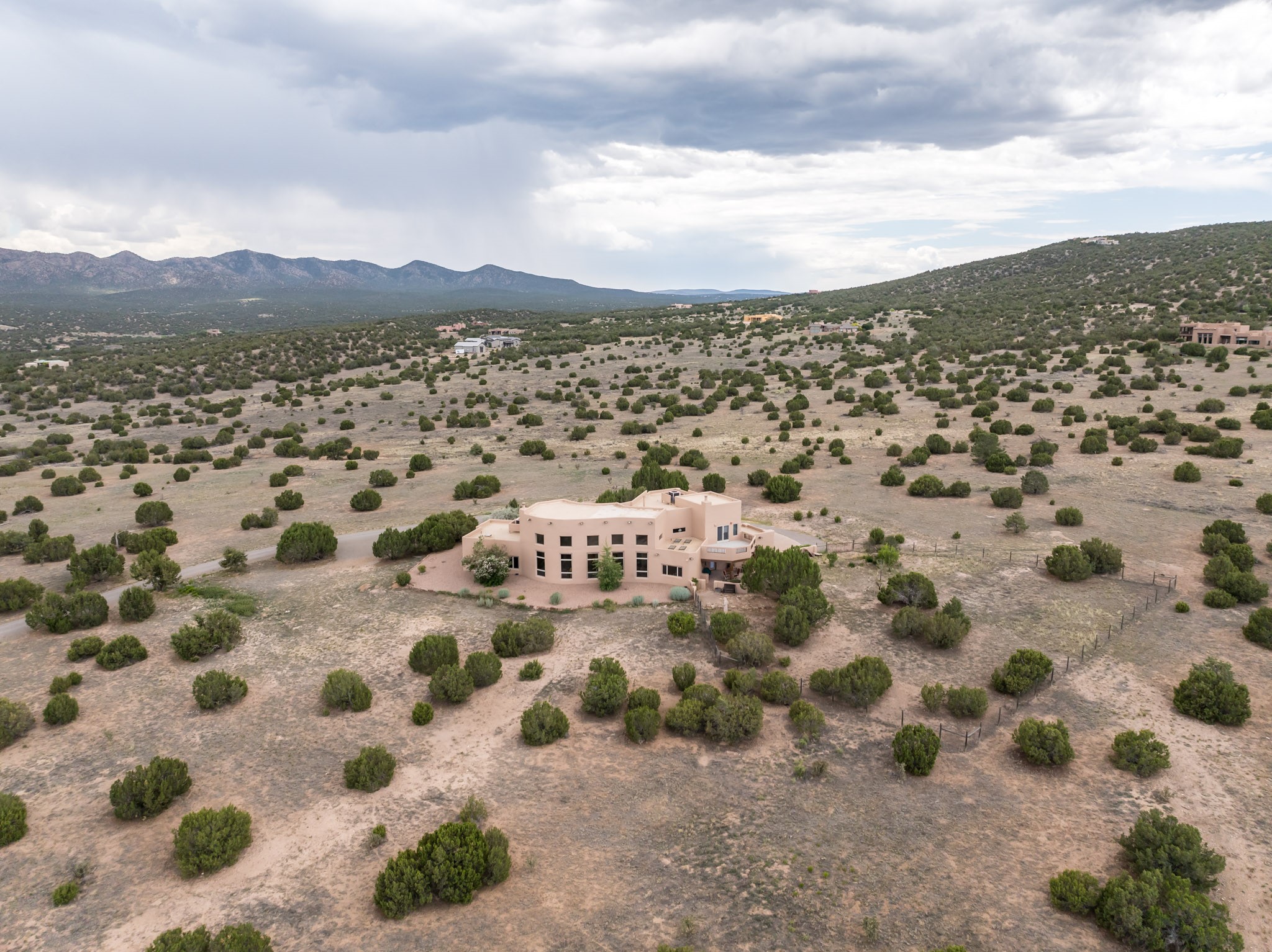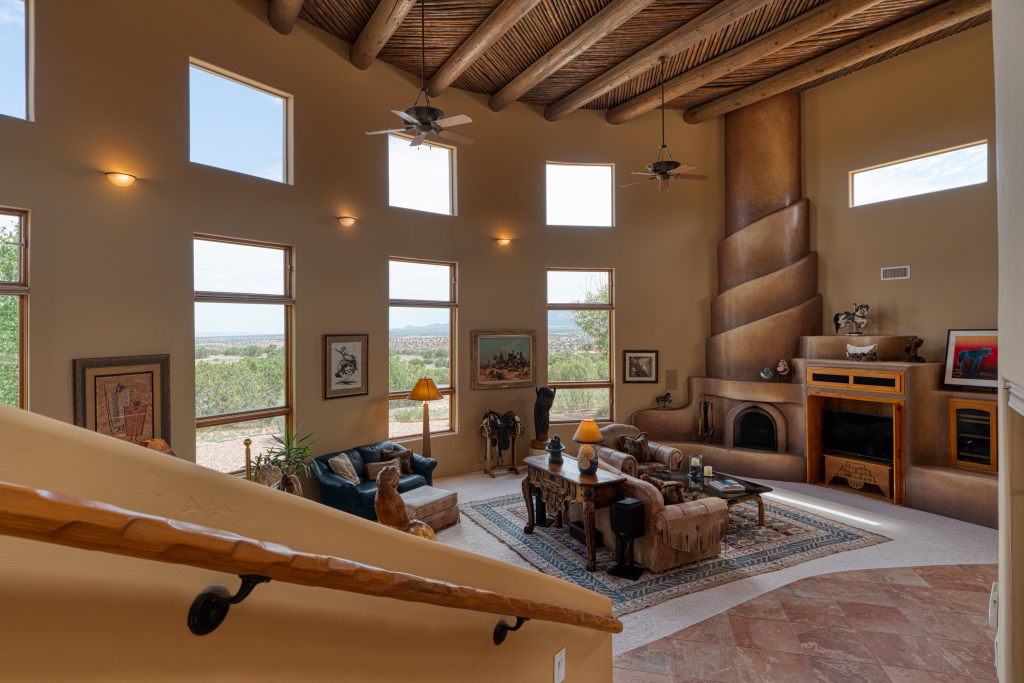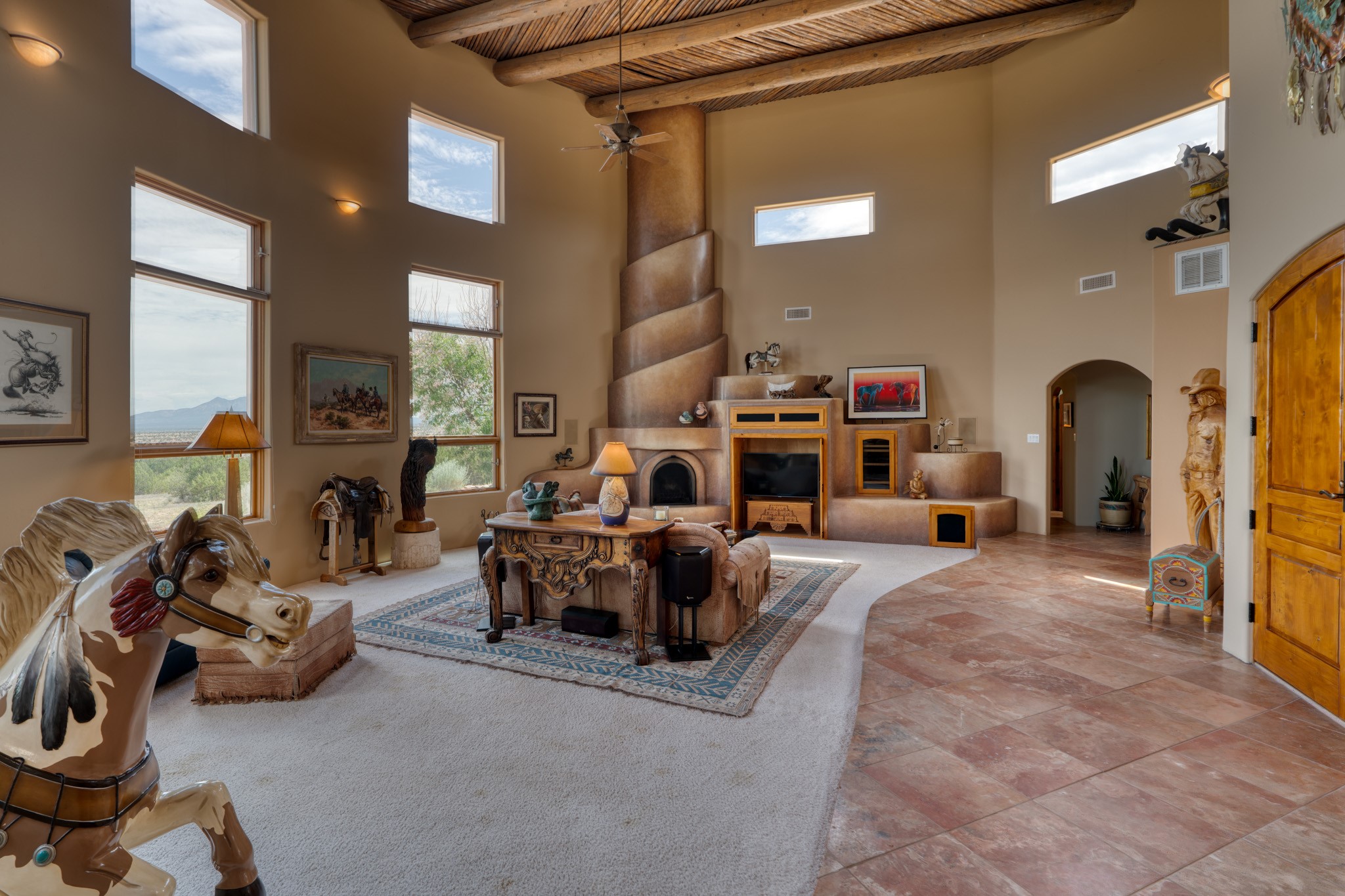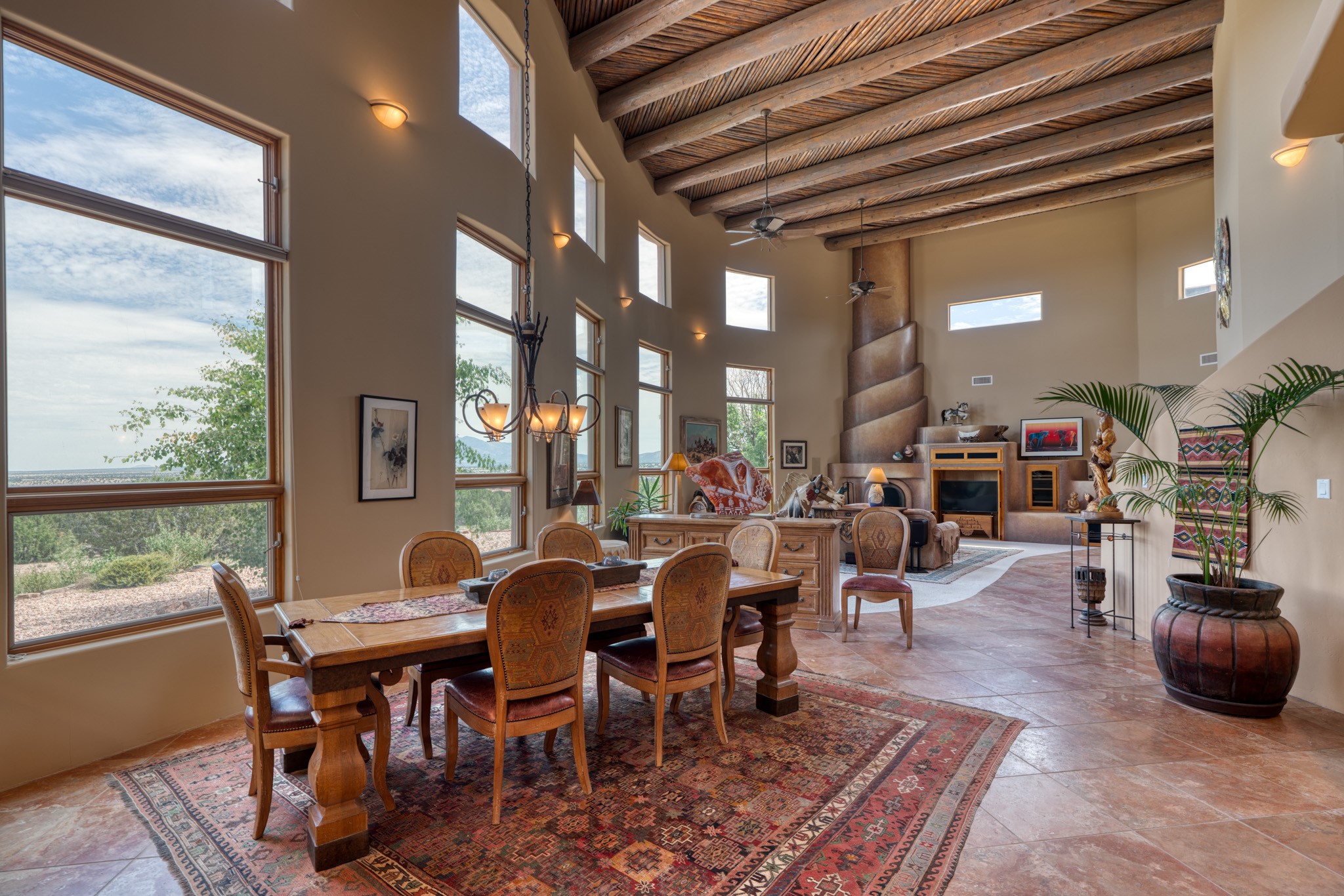 Imagine a home designed to capture the essence of East Mountain living on 10 acres, where expansive walls of glass blur the lines between indoors & out. This custom-built masterpiece boasts soaring ceilings with handcrafted wood beams that amplify light and openness, while every window offers a breathtaking vista. This beauty with a fabulous open floor plan, originally built for the builder, with many custom features. Certified Green Build with ICF Construction and Turkish travertine floors, Pella wood windows, magnificent 22' Kiva in Living room, Chef's kitchen with high-end Kitchen Aid appliances, Thermador Professional range, tons of counter space & butcher block island. Covered patio with kiva fireplace, 4-car oversized garage, fenced yard (2/3 ac) Roof-top deck on 10 acres.