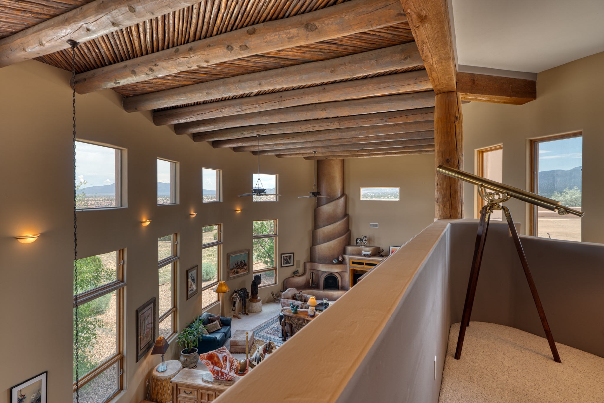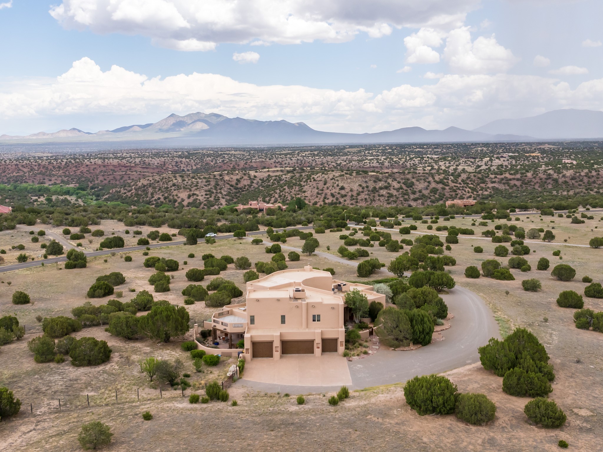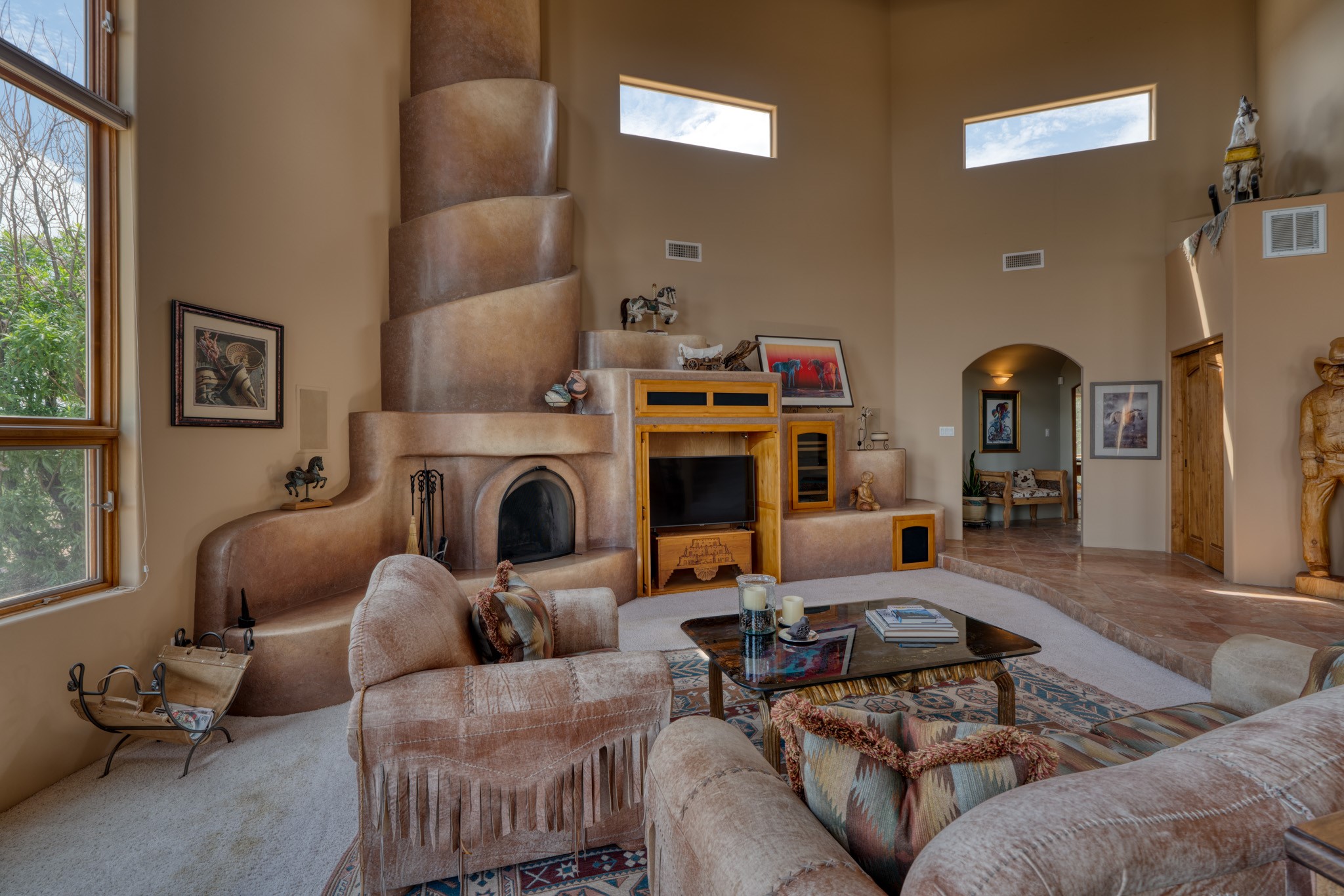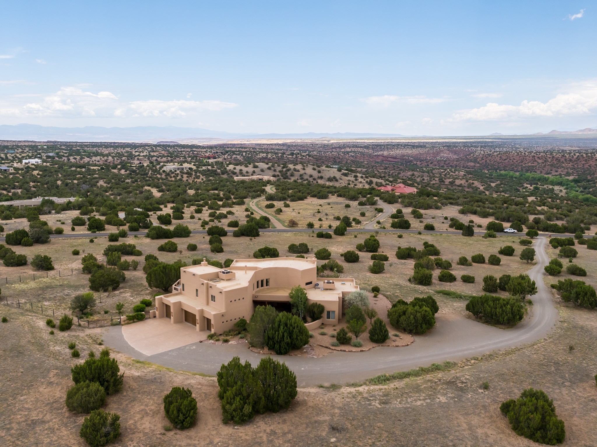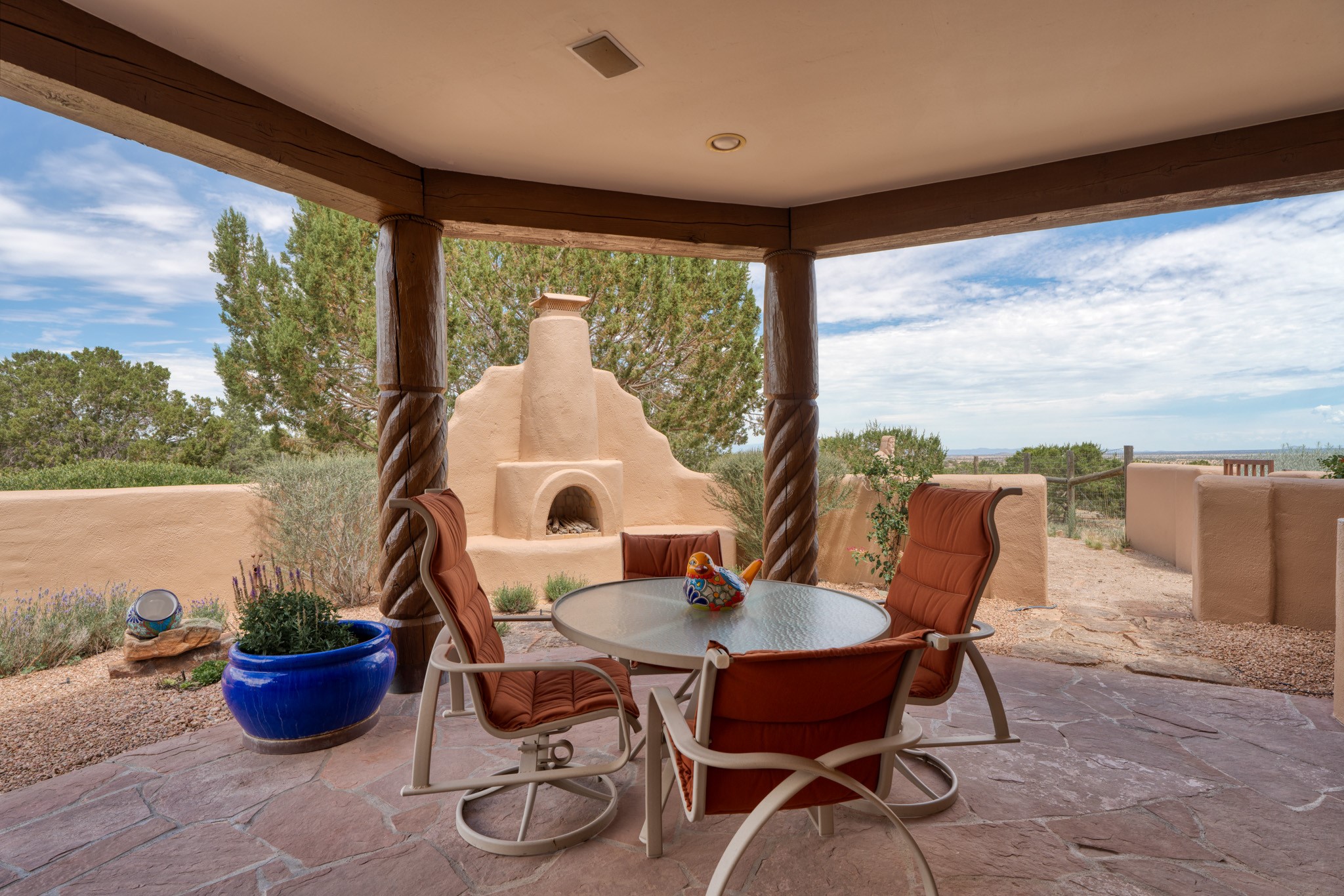 Imagine a home designed to capture the essence of East Mountain living on 10 acres, where expansive walls of glass blur the lines between indoors & out. This custom-built masterpiece boasts soaring ceilings with handcrafted wood beams that amplify light and openness, while every window offers a breathtaking vista. This beauty with a fabulous open floor plan, originally built for the builder, with many custom features. Certified Green Build with ICF Construction and Turkish travertine floors, Pella wood windows, magnificent 22' Kiva in Living room, Chef's kitchen with high-end Kitchen Aid appliances, Thermador Professional range, tons of counter space & butcher block island. Covered patio with kiva fireplace, 4-car oversized garage, fenced yard (2/3 ac) Roof-top deck on 10 acres.