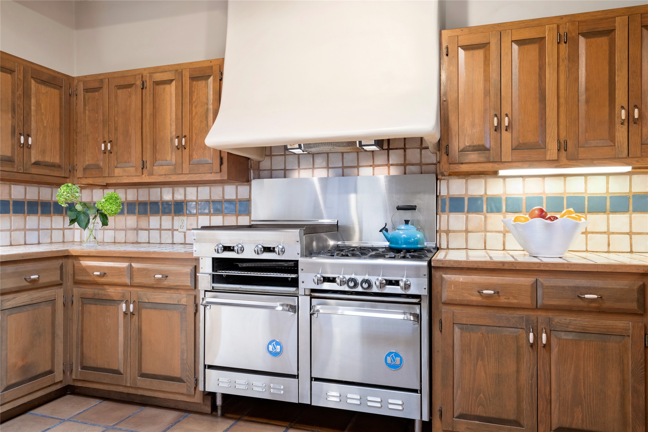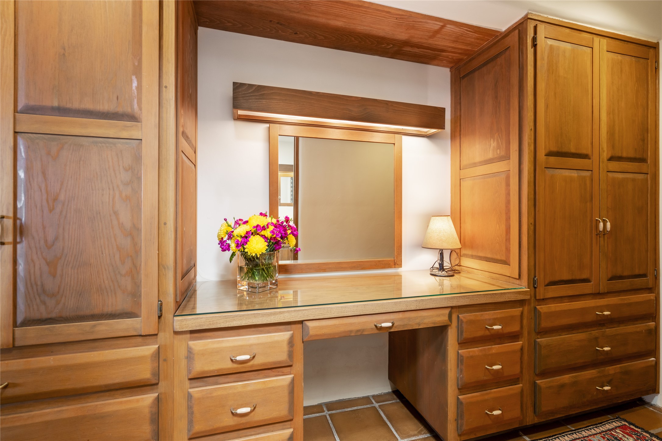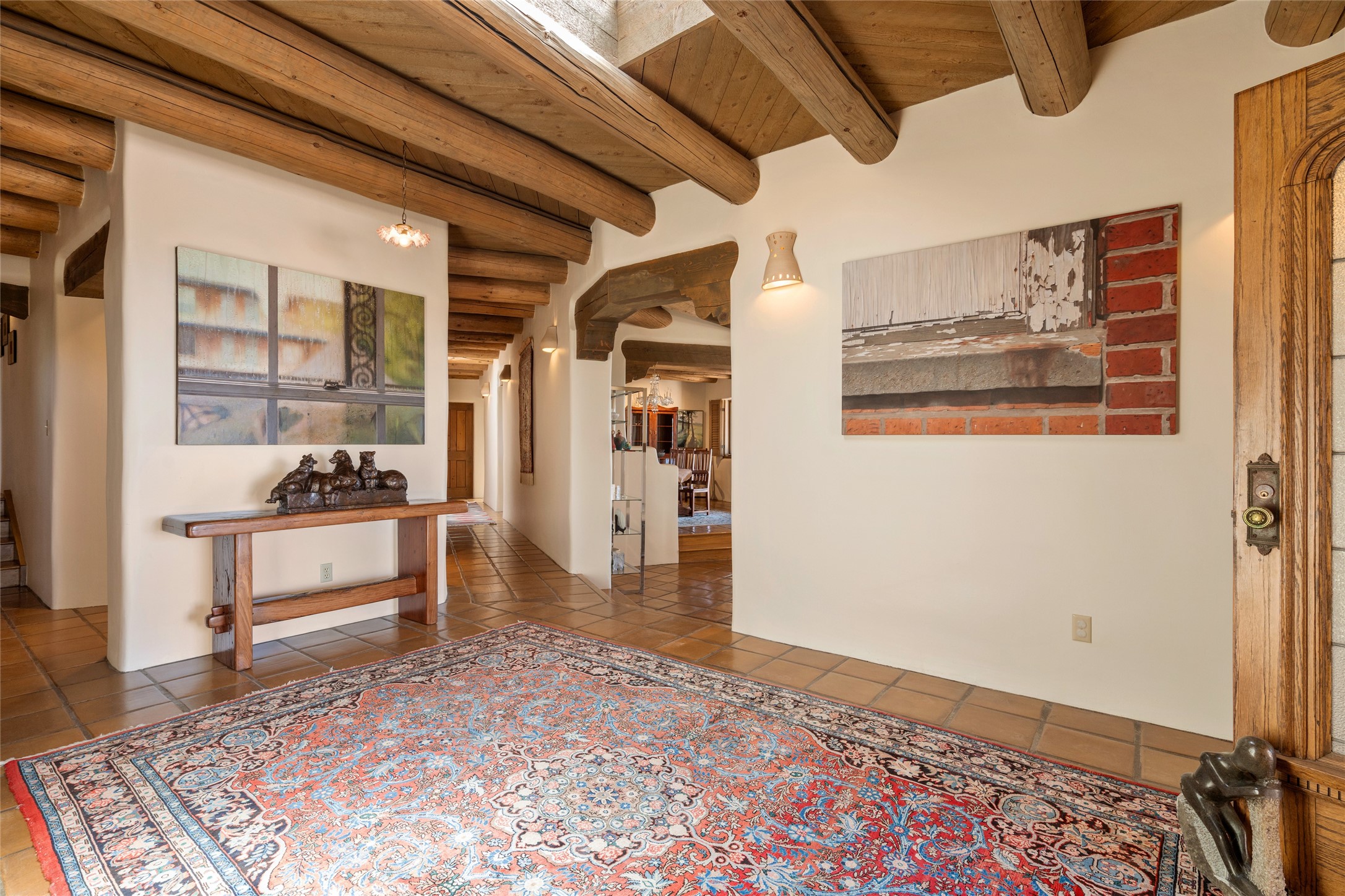 Located in the prestigious gated community of Los Caminitos in Tesuque, New Mexico, 61 Calle Encanto is a spacious residence that offers both comfort and tranquility sited on 8+ acres of scenic land. Traditional Santa Fe features are abundant. The property boasts panoramic views of the Jemez and distant mountain ranges, as well as the Santa Fe Opera house, providing a backdrop of natural beauty that enhances its peaceful, private setting. Sunrises, sunsets, and starry nights will delight. This gracious four-bedroom, five bath home features two primary suites and a private guest wing - thoughtfully separated from the main living areas. The floor plan offers privacy for all and generous living spaces. Additionally, there is an inviting den/library with ample shelves and a cozy fireplace. Another of the home's highlights is its large wrap-around portal, offering shaded spaces for enjoying the serene environment and views or hosting gatherings. The mature landscaping complements the property's natural surroundings. In addition to the property's private amenities, residents of Los Caminitos have access to an inviting clubhouse, with a pool, tennis court, and pickleball court - adding to the lifestyle appeal.