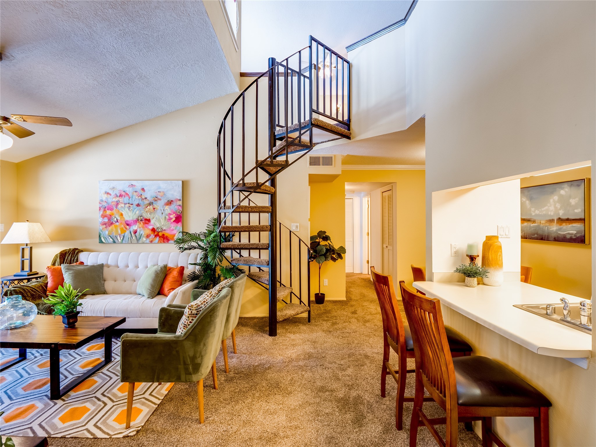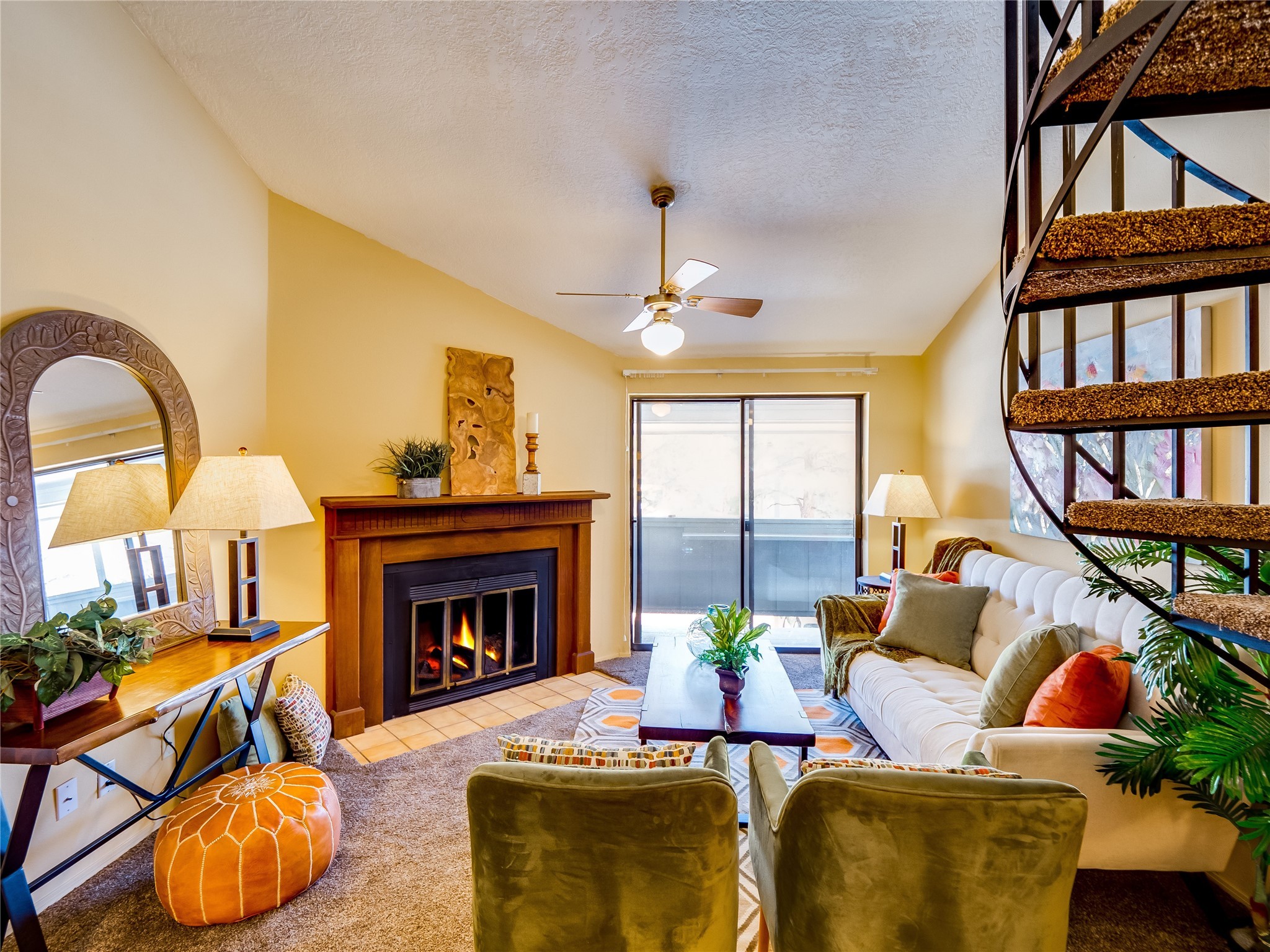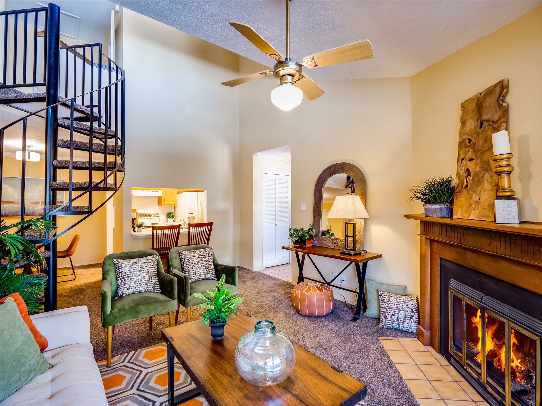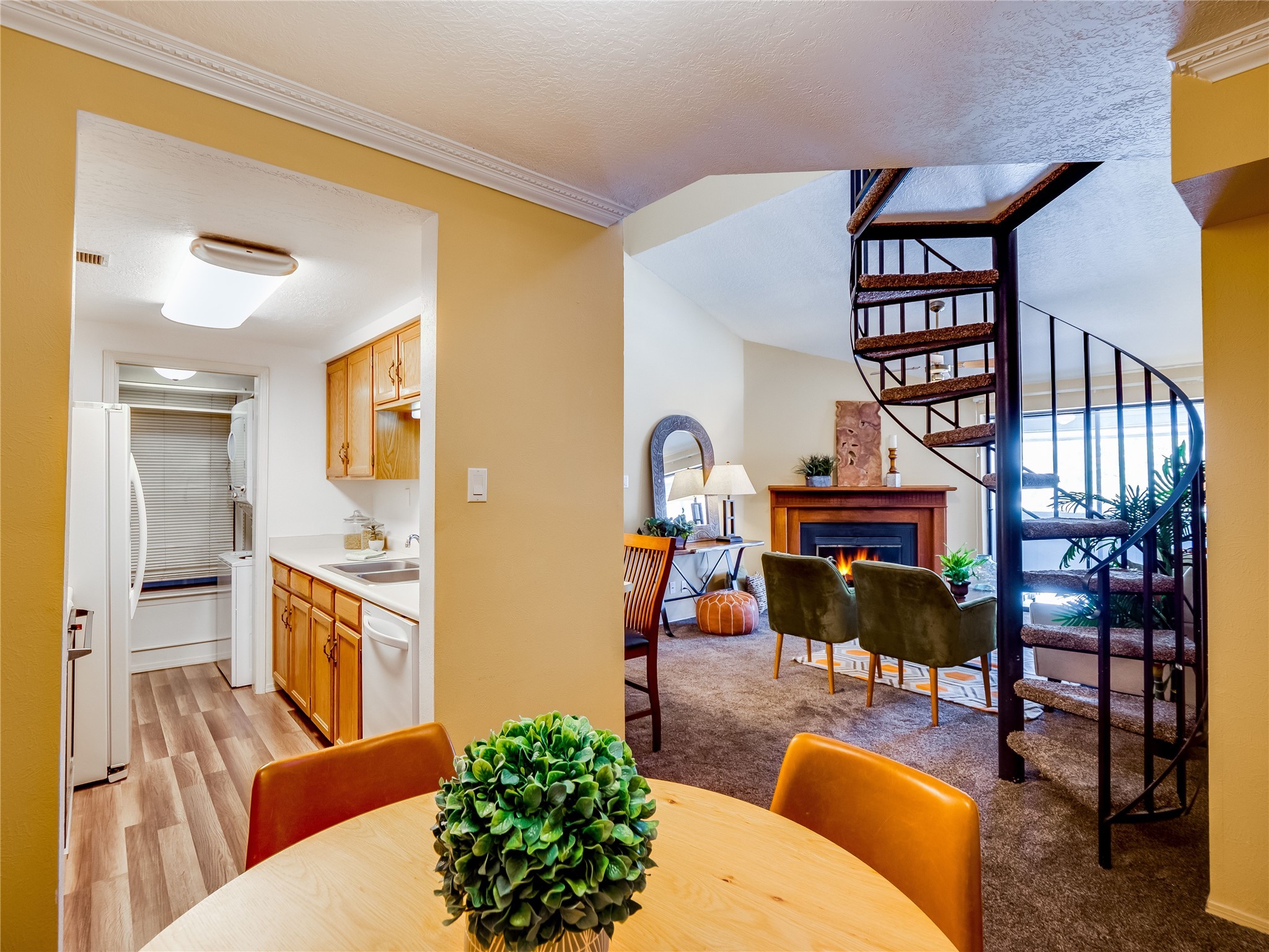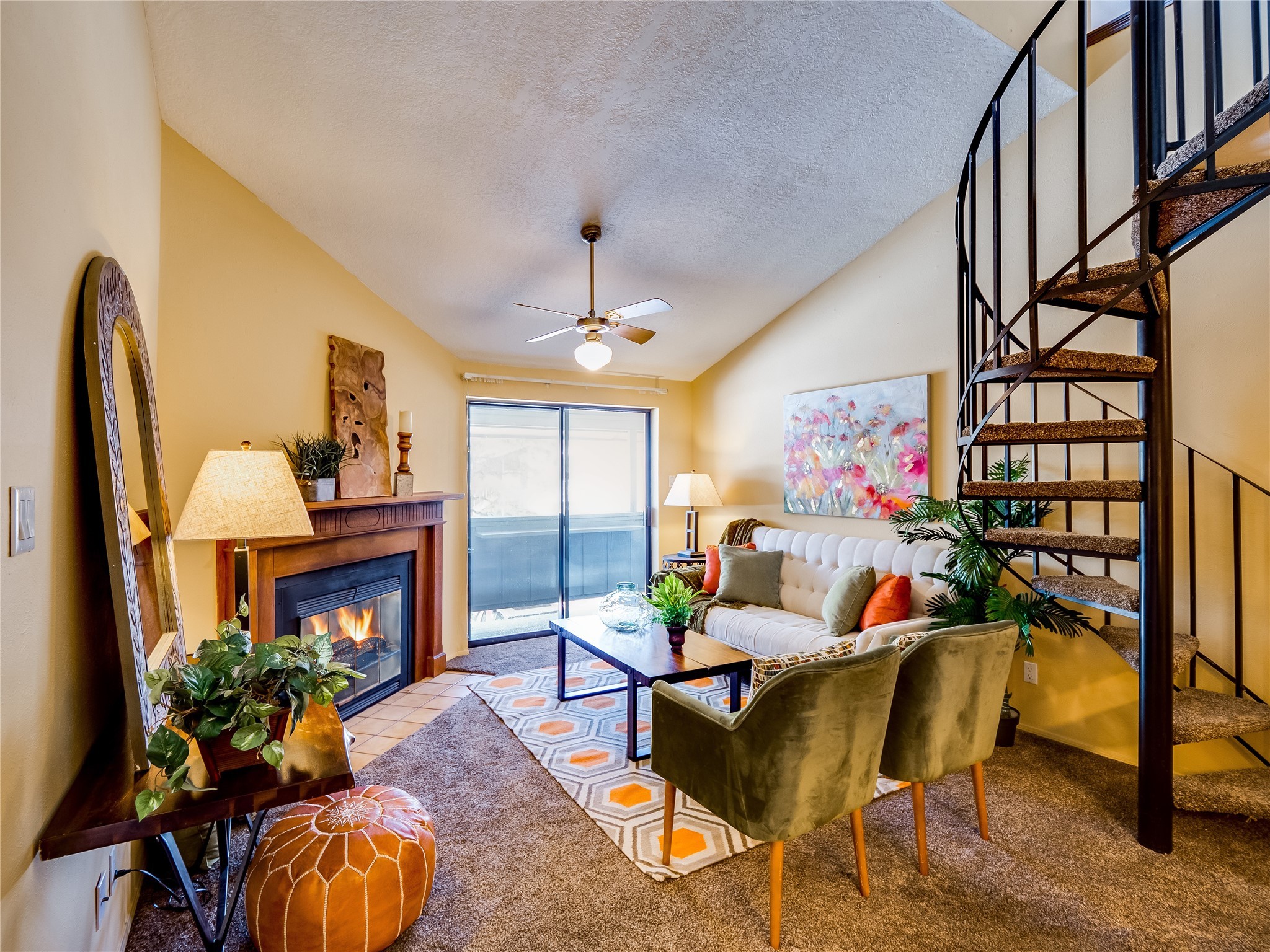 Welcome to this inviting two-story condo in the desirable Ridge Park community, offering serene treeline views from its second-floor location. Step inside to a welcoming entrance with tile flooring and a convenient coat closet. The spacious and inviting living room is the heart of the home, featuring soaring vaulted ceilings that enhance the open and airy feel. Plush carpeting adds warmth underfoot, while a wood-burning fireplace with a classic mantel serves as a cozy focal point, perfect for chilly evenings. Natural light streams in through large sliding glass doors, which lead to a covered deck, offering a peaceful outdoor retreat with treetop views. A striking spiral staircase adds architectural charm, leading to the loft-style primary suite on the second floor. The open-concept design seamlessly connects the living room to the dining area and kitchen, making the space perfect for both relaxing and entertaining. The bright galley-style kitchen features warm wood cabinetry, stylish black hardware, laminate flooring, and a passthrough window that doubles as bar seating. Just off the kitchen, you'll find a laundry closet with a stackable washer and dryer, plus built-in shelving for added convenience. A hallway with two additional storage closets leads to a full guest bathroom, complete with a single sink vanity and a tiled shower/tub combination. The spacious guest bedroom offers direct access to the covered deck, providing a private retreat with tranquil views. Upstairs, the loft-style primary en-suite is a spacious and serene escape, tucked away for ultimate privacy. The room boasts double closets offering ample storage and organization and a well-appointed bathroom with a large sink vanity and a walk-in tiled shower. Located near parks, shopping, and restaurants, this lovely condo is ready to welcome you home. Added amenities include a community pool, clubhouse, and fitness room. Don't miss your chance to see this beautiful home and schedule a viewing today!