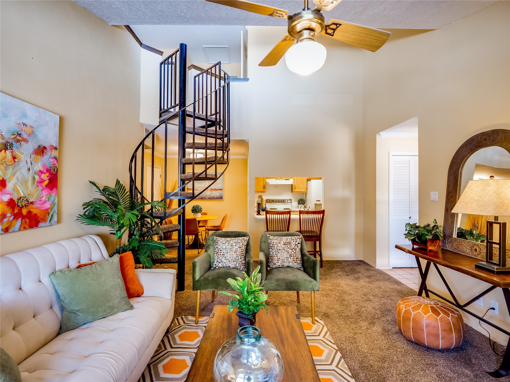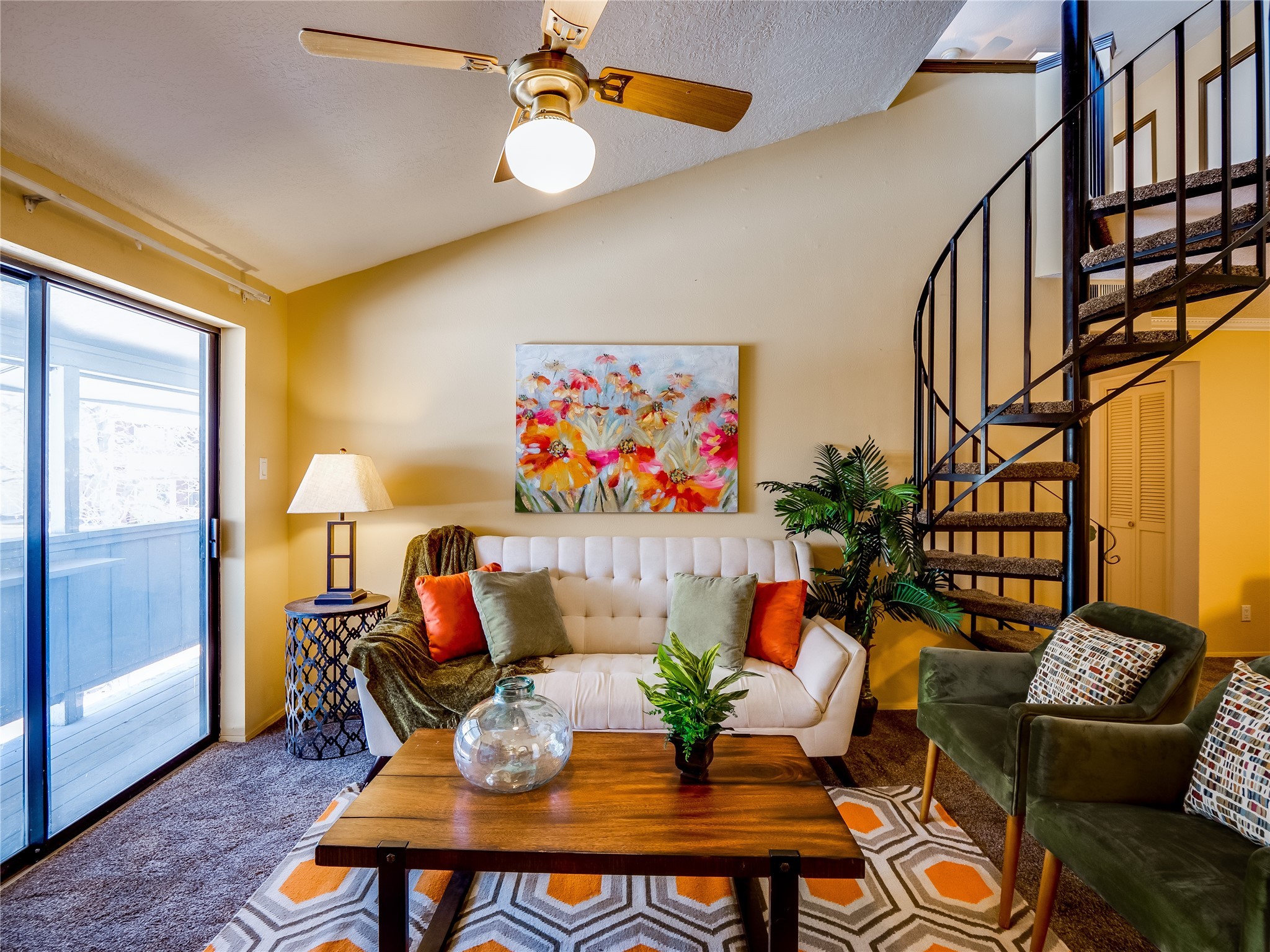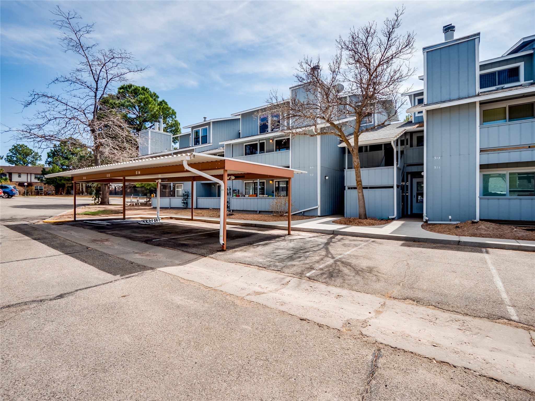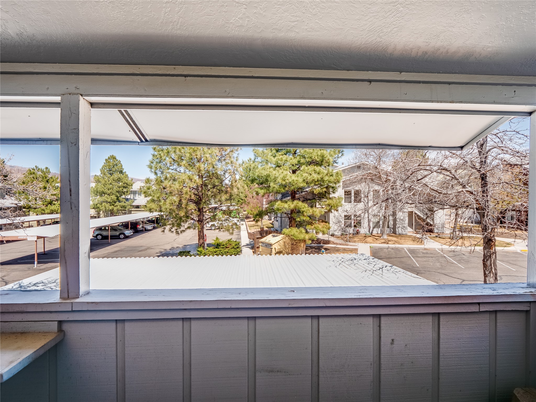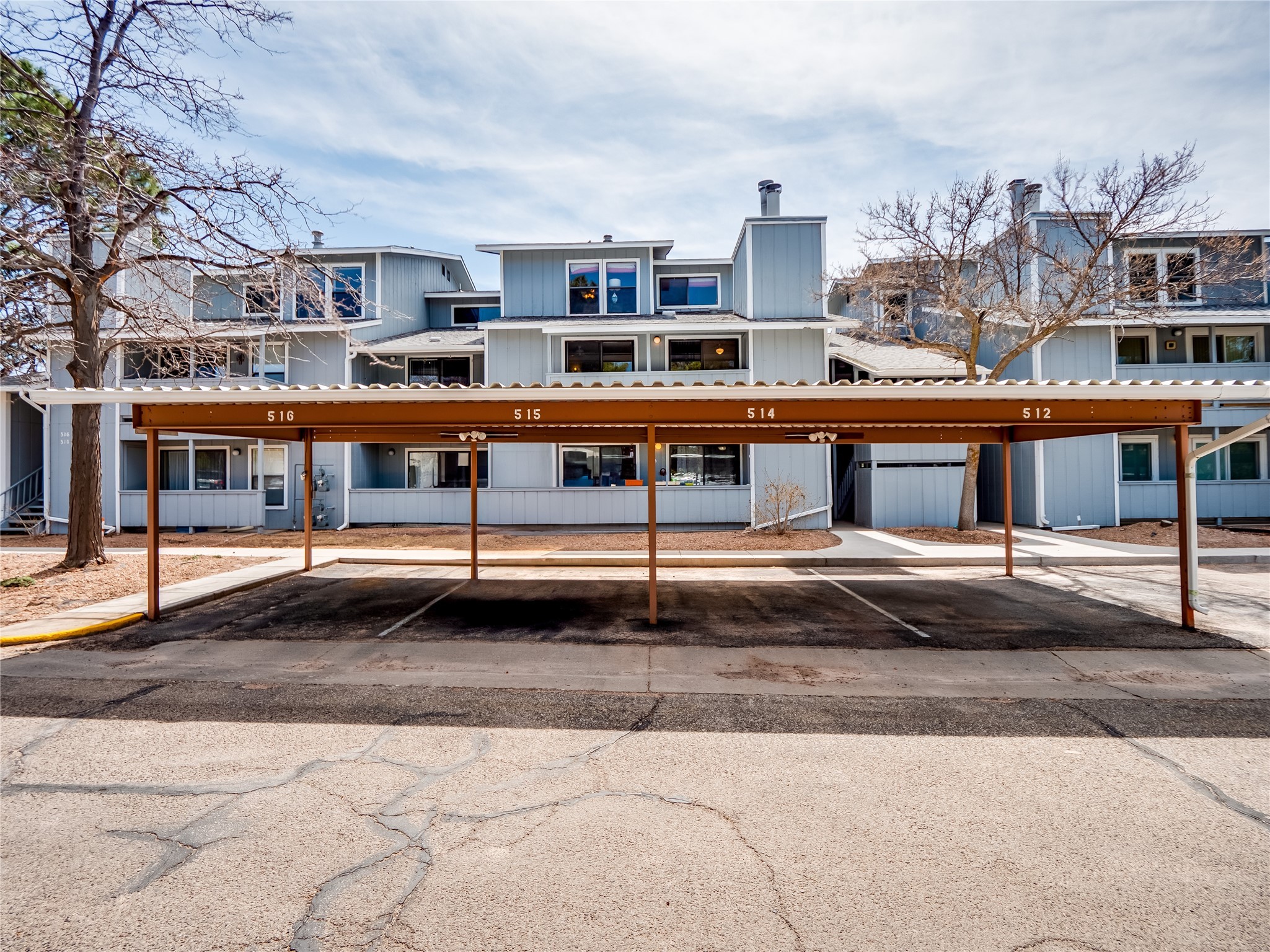 Welcome to this inviting two-story condo in the desirable Ridge Park community, offering serene treeline views from its second-floor location. Step inside to a welcoming entrance with tile flooring and a convenient coat closet. The spacious and inviting living room is the heart of the home, featuring soaring vaulted ceilings that enhance the open and airy feel. Plush carpeting adds warmth underfoot, while a wood-burning fireplace with a classic mantel serves as a cozy focal point, perfect for chilly evenings. Natural light streams in through large sliding glass doors, which lead to a covered deck, offering a peaceful outdoor retreat with treetop views. A striking spiral staircase adds architectural charm, leading to the loft-style primary suite on the second floor. The open-concept design seamlessly connects the living room to the dining area and kitchen, making the space perfect for both relaxing and entertaining. The bright galley-style kitchen features warm wood cabinetry, stylish black hardware, laminate flooring, and a passthrough window that doubles as bar seating. Just off the kitchen, you'll find a laundry closet with a stackable washer and dryer, plus built-in shelving for added convenience. A hallway with two additional storage closets leads to a full guest bathroom, complete with a single sink vanity and a tiled shower/tub combination. The spacious guest bedroom offers direct access to the covered deck, providing a private retreat with tranquil views. Upstairs, the loft-style primary en-suite is a spacious and serene escape, tucked away for ultimate privacy. The room boasts double closets offering ample storage and organization and a well-appointed bathroom with a large sink vanity and a walk-in tiled shower. Located near parks, shopping, and restaurants, this lovely condo is ready to welcome you home. Added amenities include a community pool, clubhouse, and fitness room. Don't miss your chance to see this beautiful home and schedule a viewing today!