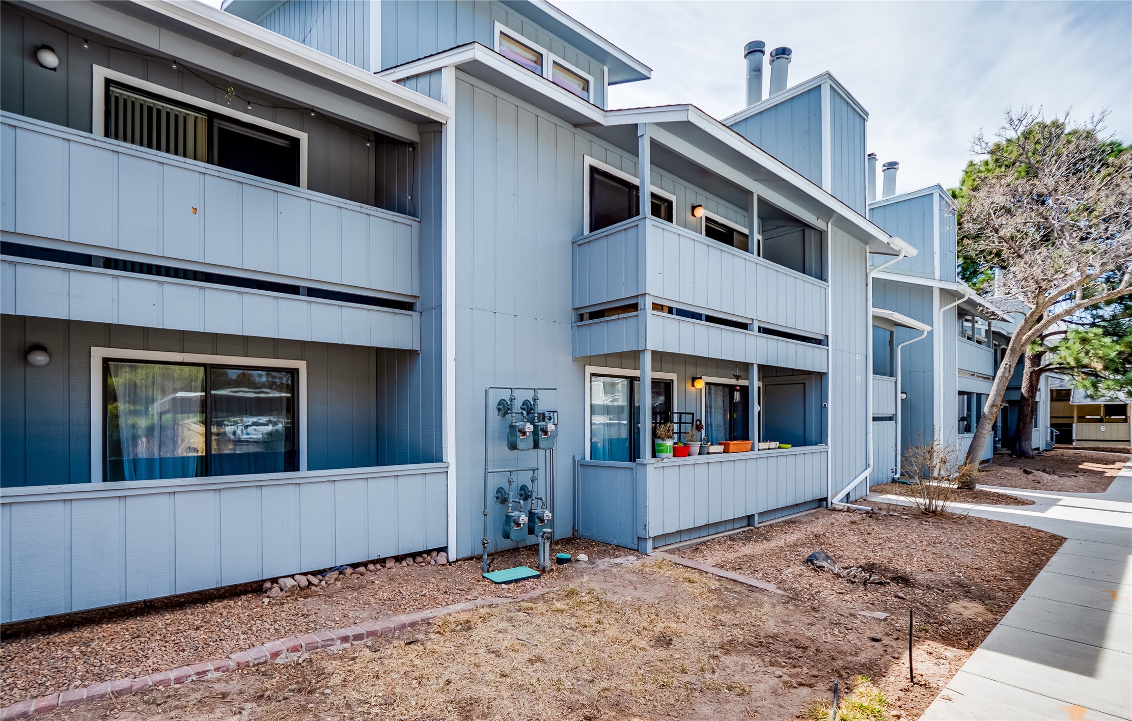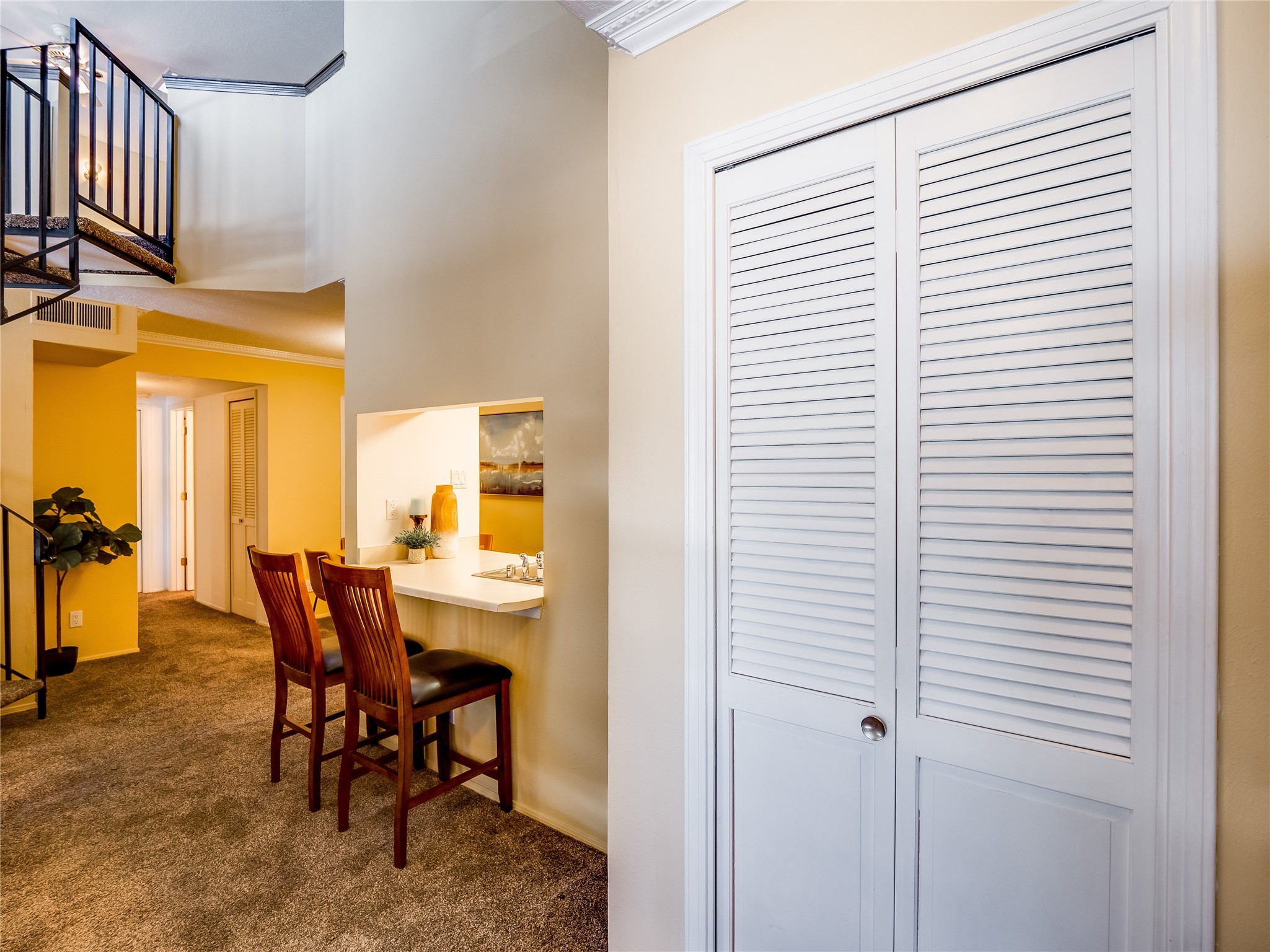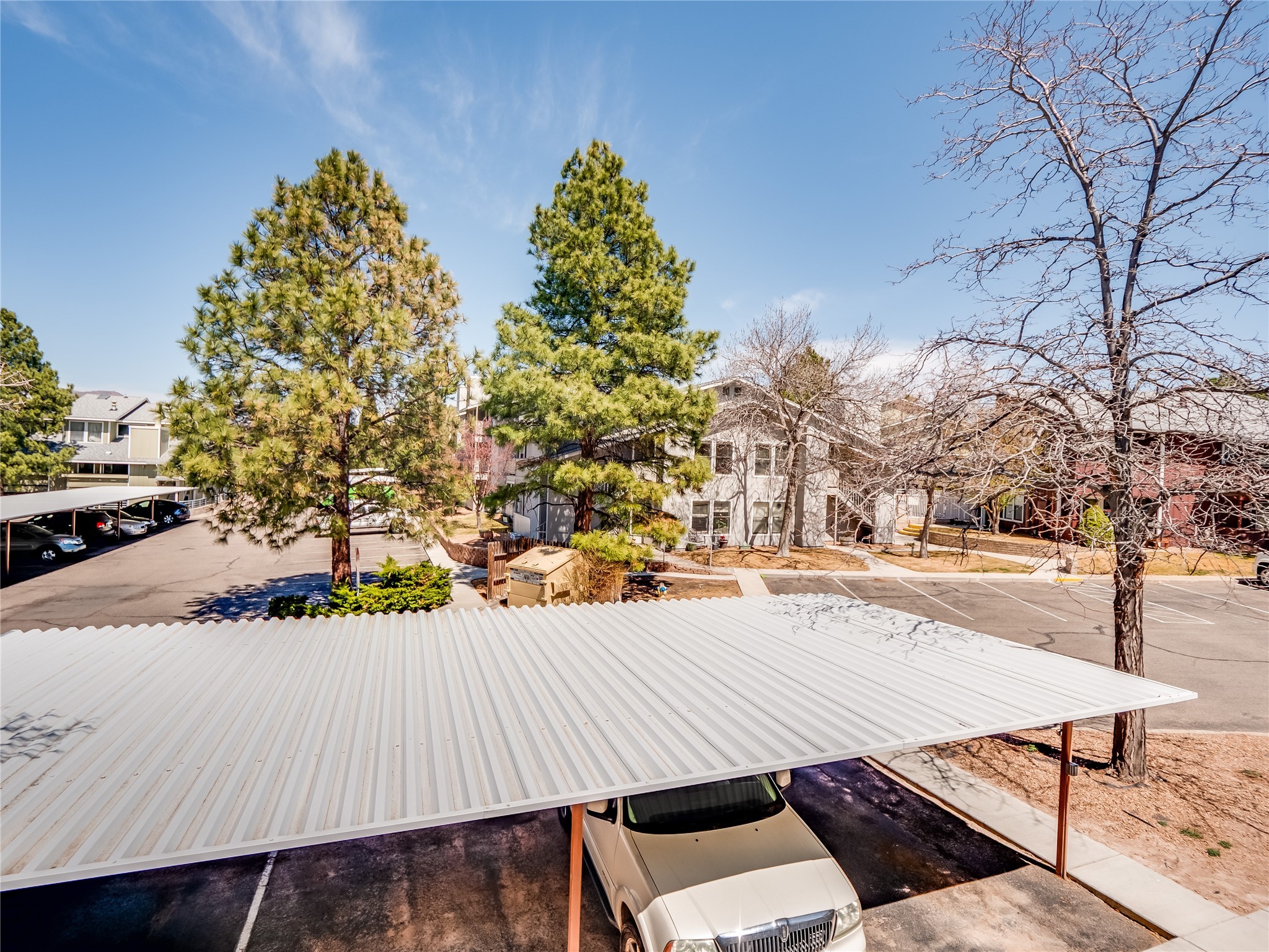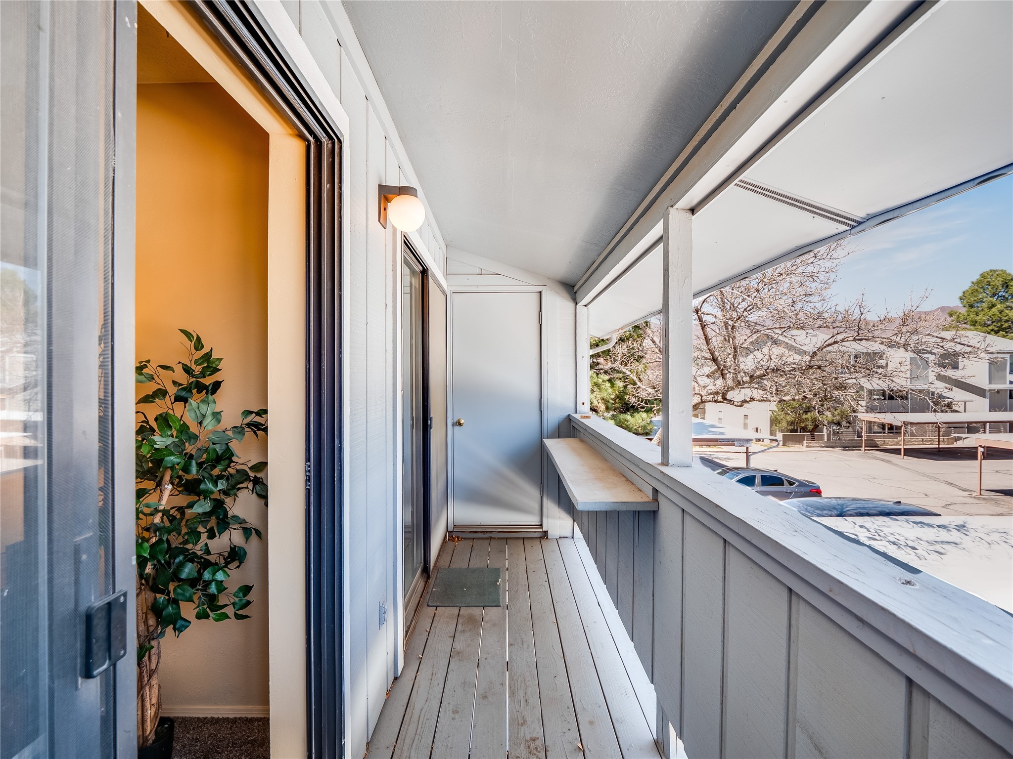 Welcome to this inviting two-story condo in the desirable Ridge Park community, offering serene treeline views from its second-floor location. Step inside to a welcoming entrance with tile flooring and a convenient coat closet. The spacious and inviting living room is the heart of the home, featuring soaring vaulted ceilings that enhance the open and airy feel. Plush carpeting adds warmth underfoot, while a wood-burning fireplace with a classic mantel serves as a cozy focal point, perfect for chilly evenings. Natural light streams in through large sliding glass doors, which lead to a covered deck, offering a peaceful outdoor retreat with treetop views. A striking spiral staircase adds architectural charm, leading to the loft-style primary suite on the second floor. The open-concept design seamlessly connects the living room to the dining area and kitchen, making the space perfect for both relaxing and entertaining. The bright galley-style kitchen features warm wood cabinetry, stylish black hardware, laminate flooring, and a passthrough window that doubles as bar seating. Just off the kitchen, you'll find a laundry closet with a stackable washer and dryer, plus built-in shelving for added convenience. A hallway with two additional storage closets leads to a full guest bathroom, complete with a single sink vanity and a tiled shower/tub combination. The spacious guest bedroom offers direct access to the covered deck, providing a private retreat with tranquil views. Upstairs, the loft-style primary en-suite is a spacious and serene escape, tucked away for ultimate privacy. The room boasts double closets offering ample storage and organization and a well-appointed bathroom with a large sink vanity and a walk-in tiled shower. Located near parks, shopping, and restaurants, this lovely condo is ready to welcome you home. Added amenities include a community pool, clubhouse, and fitness room. Don't miss your chance to see this beautiful home and schedule a viewing today!