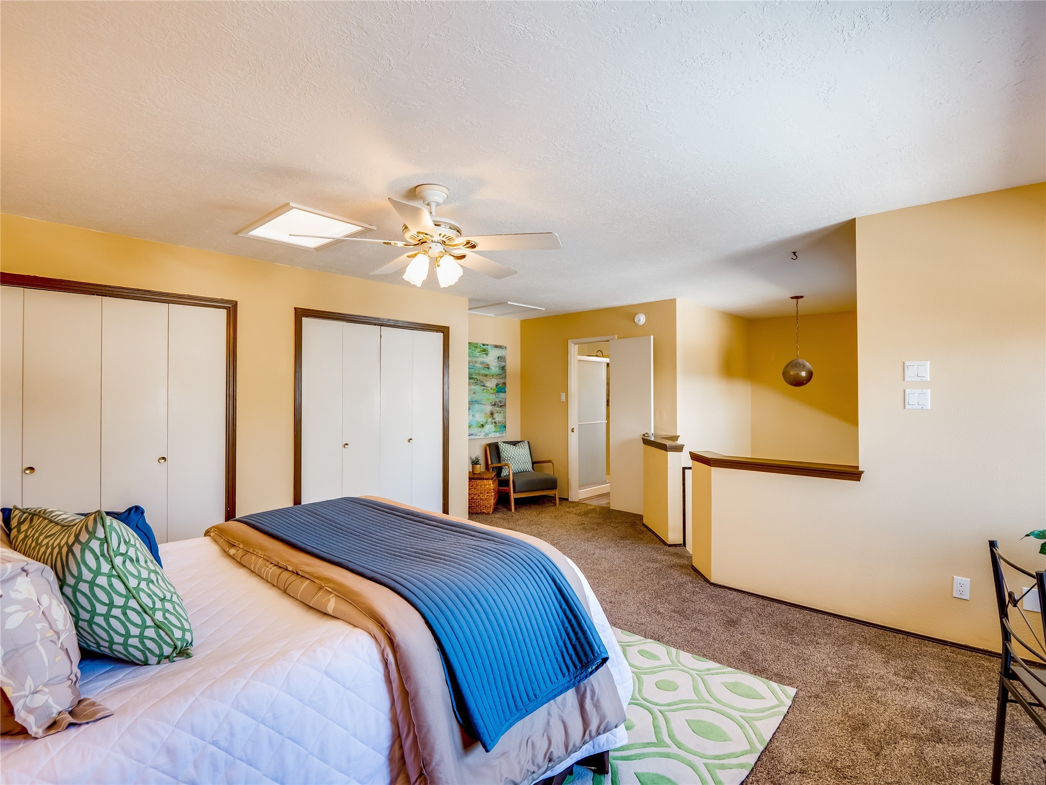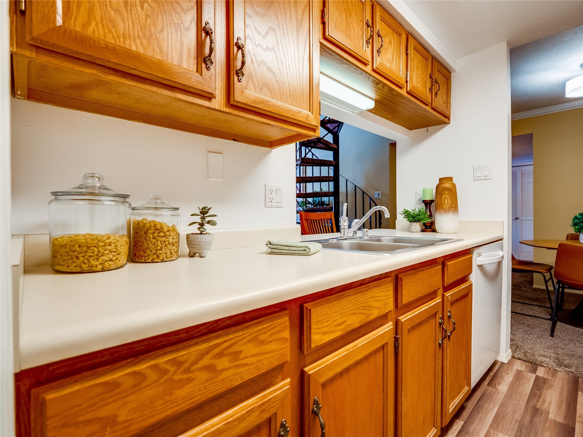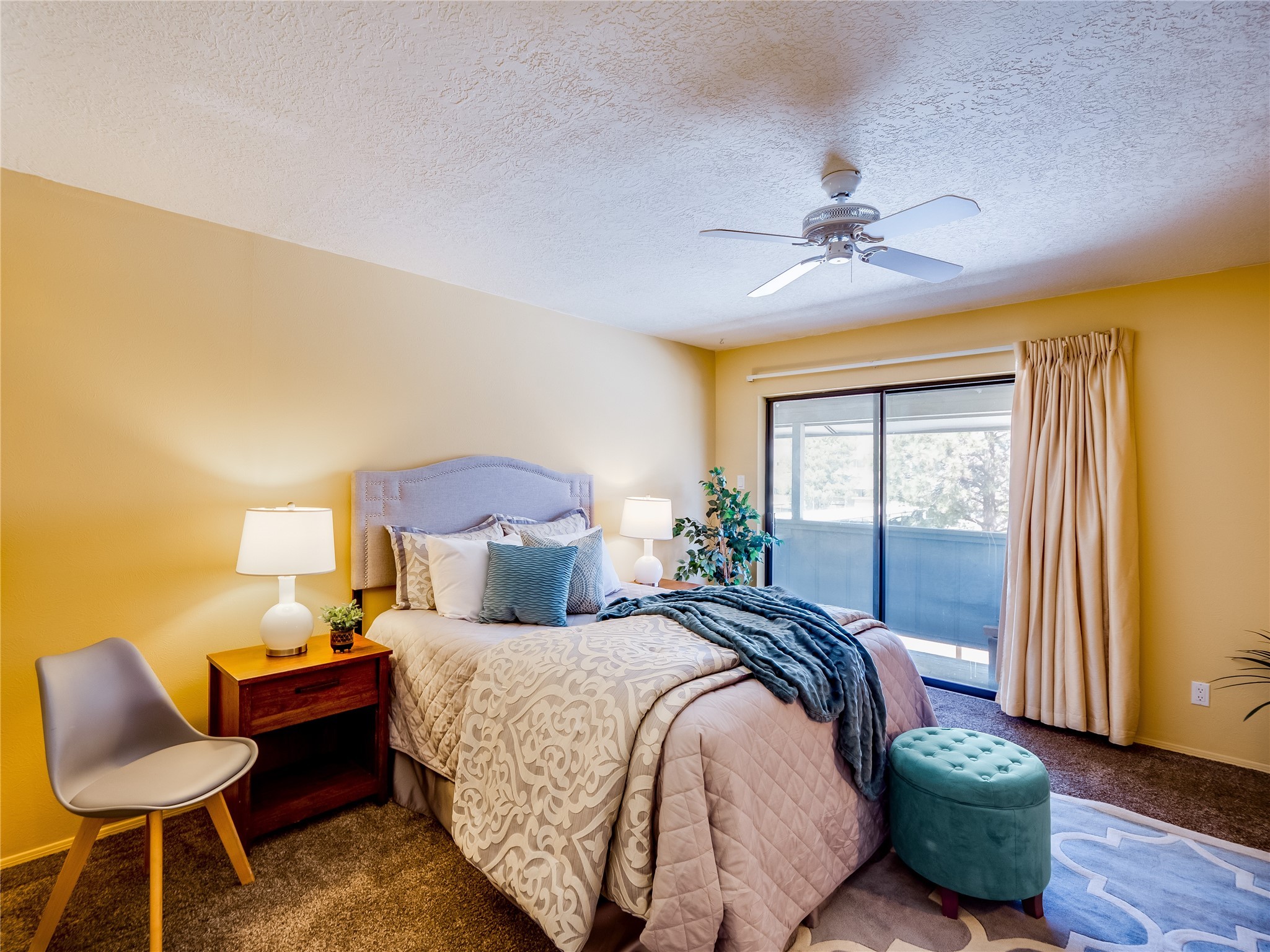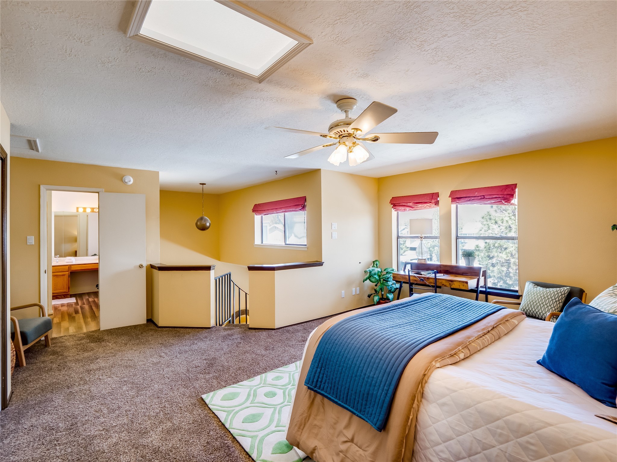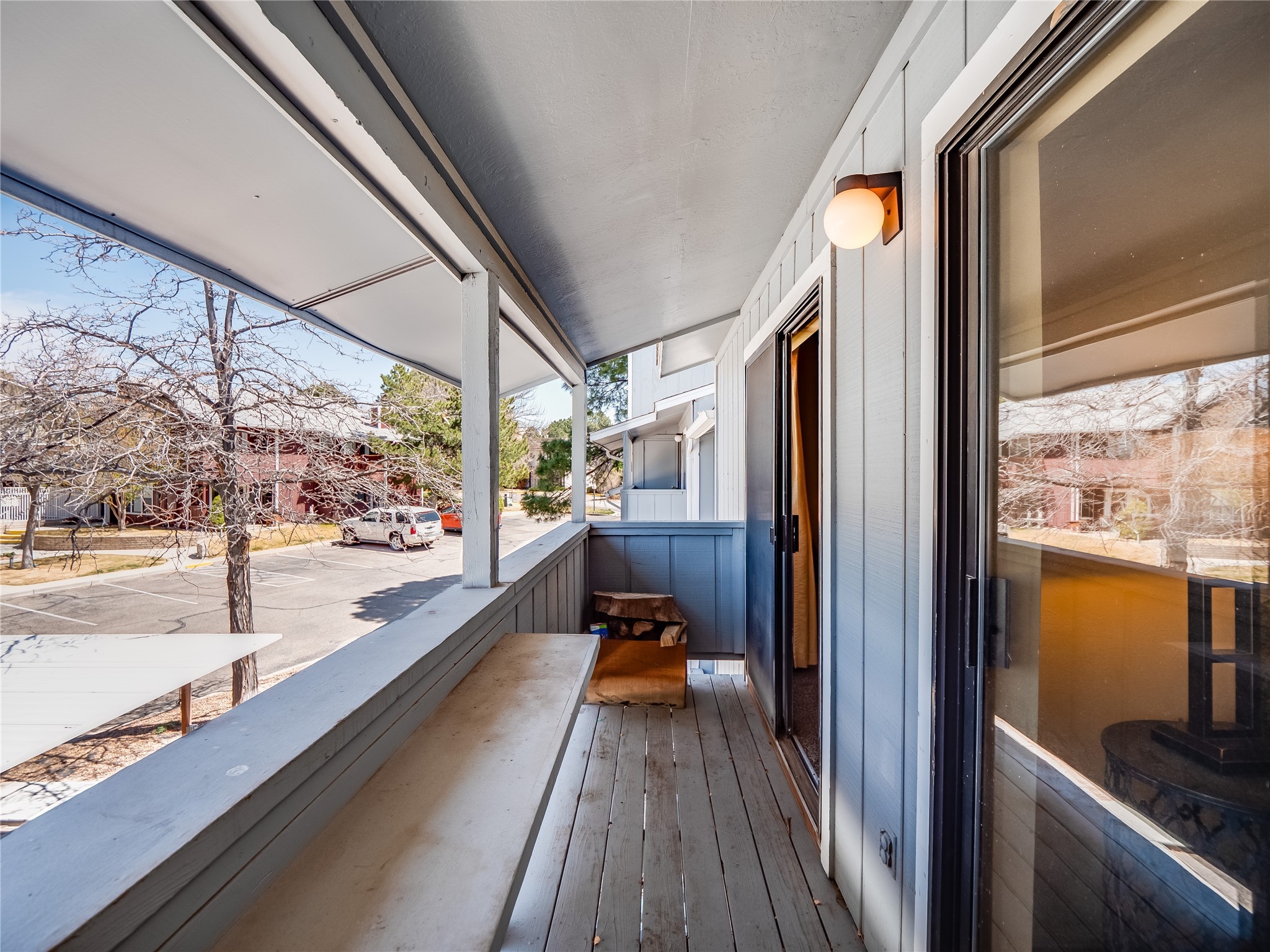 Welcome to this inviting two-story condo in the desirable Ridge Park community, offering serene treeline views from its second-floor location. Step inside to a welcoming entrance with tile flooring and a convenient coat closet. The spacious and inviting living room is the heart of the home, featuring soaring vaulted ceilings that enhance the open and airy feel. Plush carpeting adds warmth underfoot, while a wood-burning fireplace with a classic mantel serves as a cozy focal point, perfect for chilly evenings. Natural light streams in through large sliding glass doors, which lead to a covered deck, offering a peaceful outdoor retreat with treetop views. A striking spiral staircase adds architectural charm, leading to the loft-style primary suite on the second floor. The open-concept design seamlessly connects the living room to the dining area and kitchen, making the space perfect for both relaxing and entertaining. The bright galley-style kitchen features warm wood cabinetry, stylish black hardware, laminate flooring, and a passthrough window that doubles as bar seating. Just off the kitchen, you'll find a laundry closet with a stackable washer and dryer, plus built-in shelving for added convenience. A hallway with two additional storage closets leads to a full guest bathroom, complete with a single sink vanity and a tiled shower/tub combination. The spacious guest bedroom offers direct access to the covered deck, providing a private retreat with tranquil views. Upstairs, the loft-style primary en-suite is a spacious and serene escape, tucked away for ultimate privacy. The room boasts double closets offering ample storage and organization and a well-appointed bathroom with a large sink vanity and a walk-in tiled shower. Located near parks, shopping, and restaurants, this lovely condo is ready to welcome you home. Added amenities include a community pool, clubhouse, and fitness room. Don't miss your chance to see this beautiful home and schedule a viewing today!