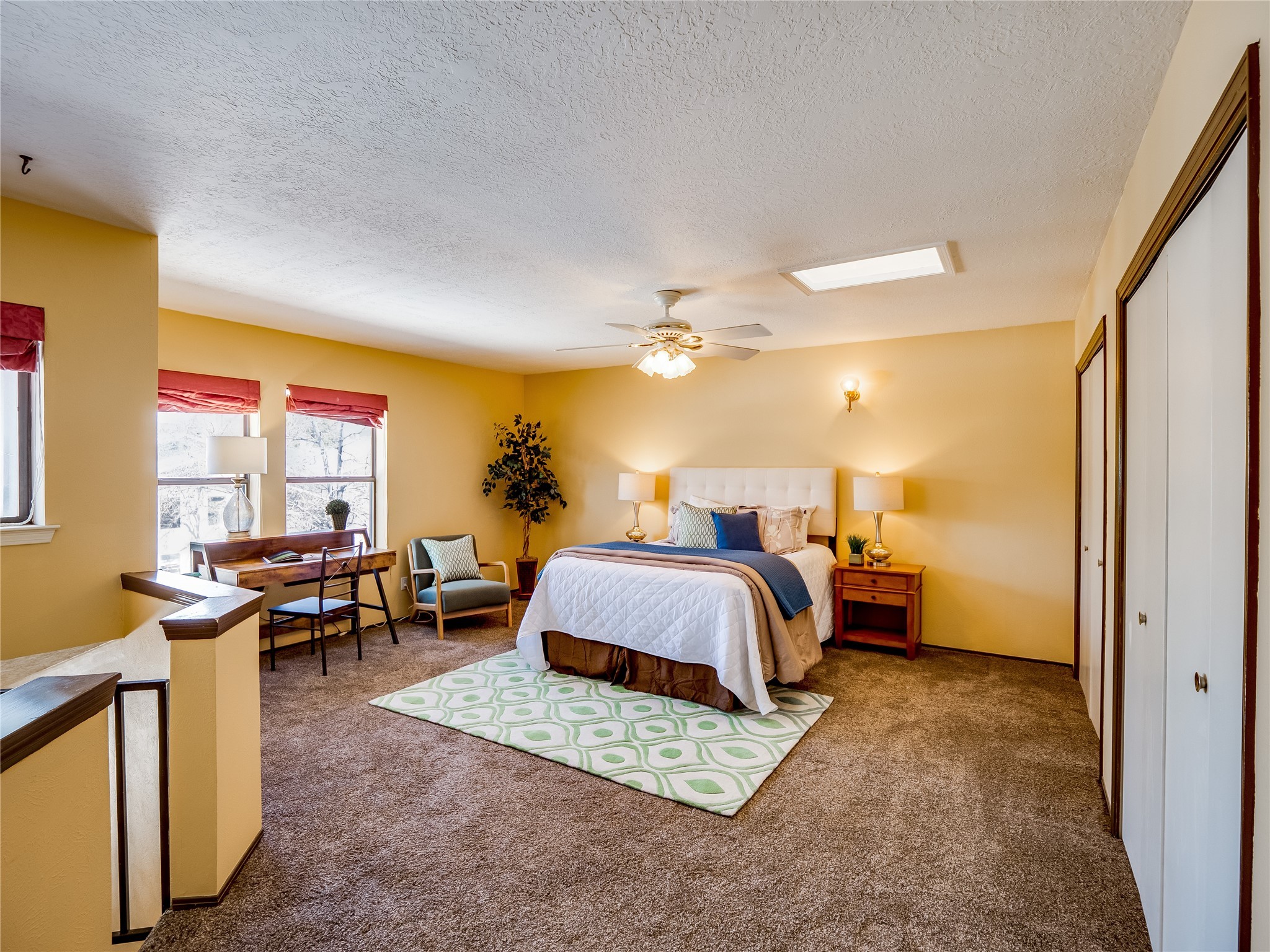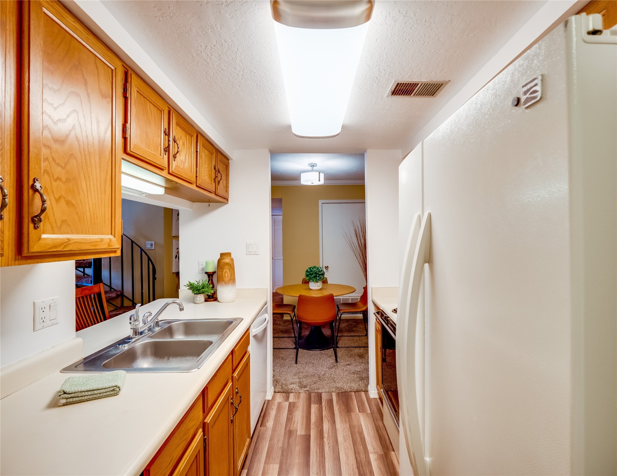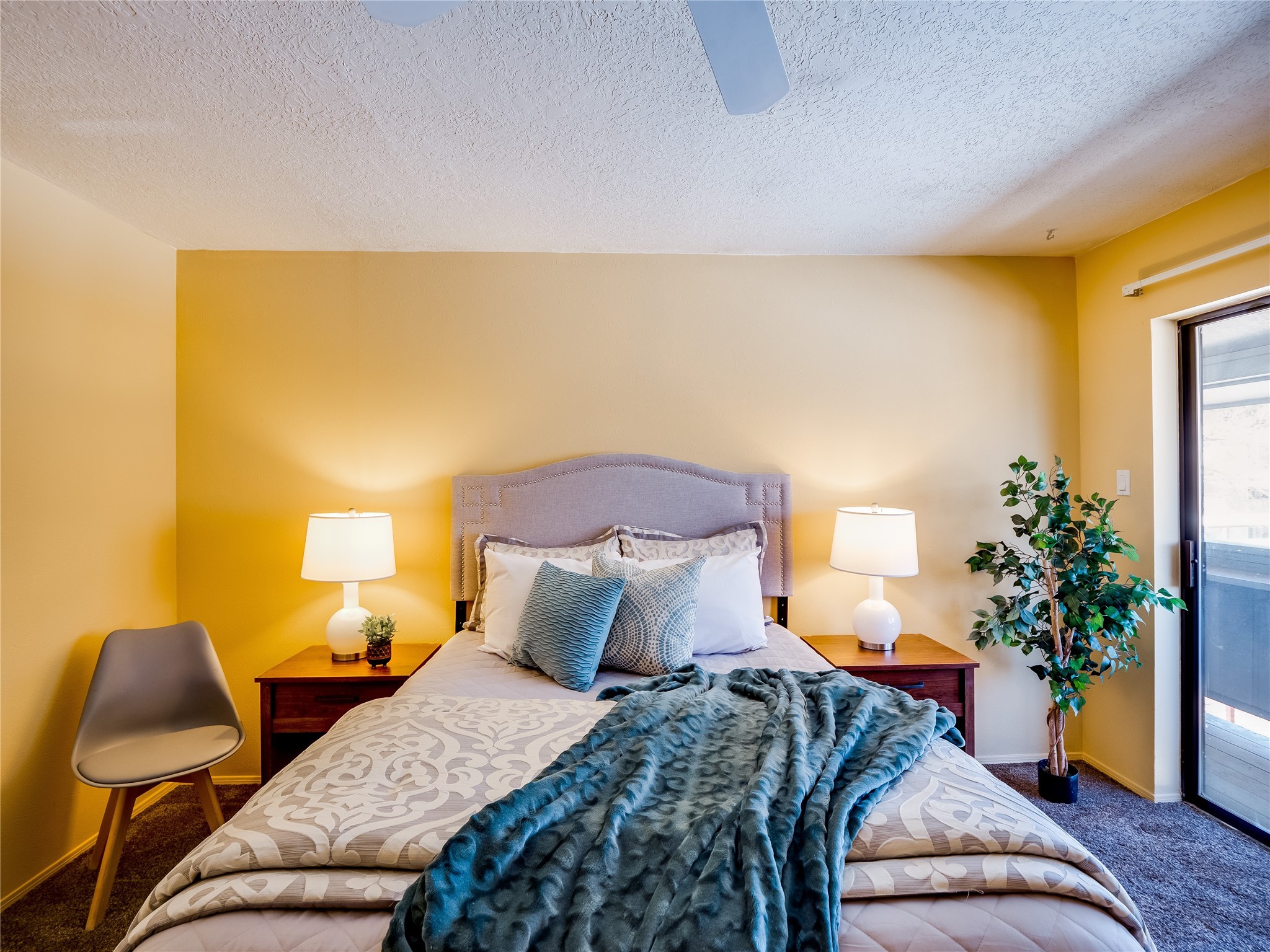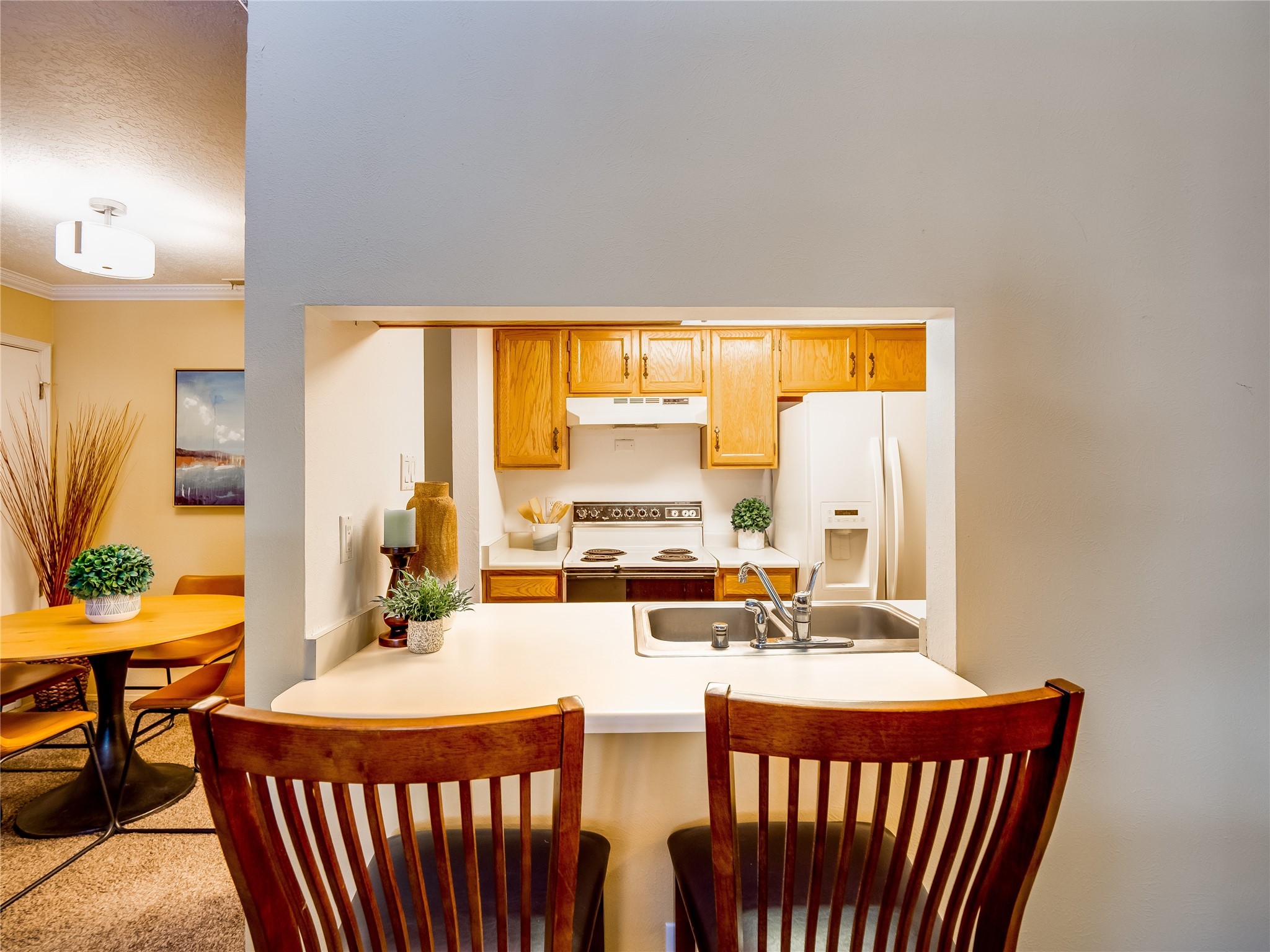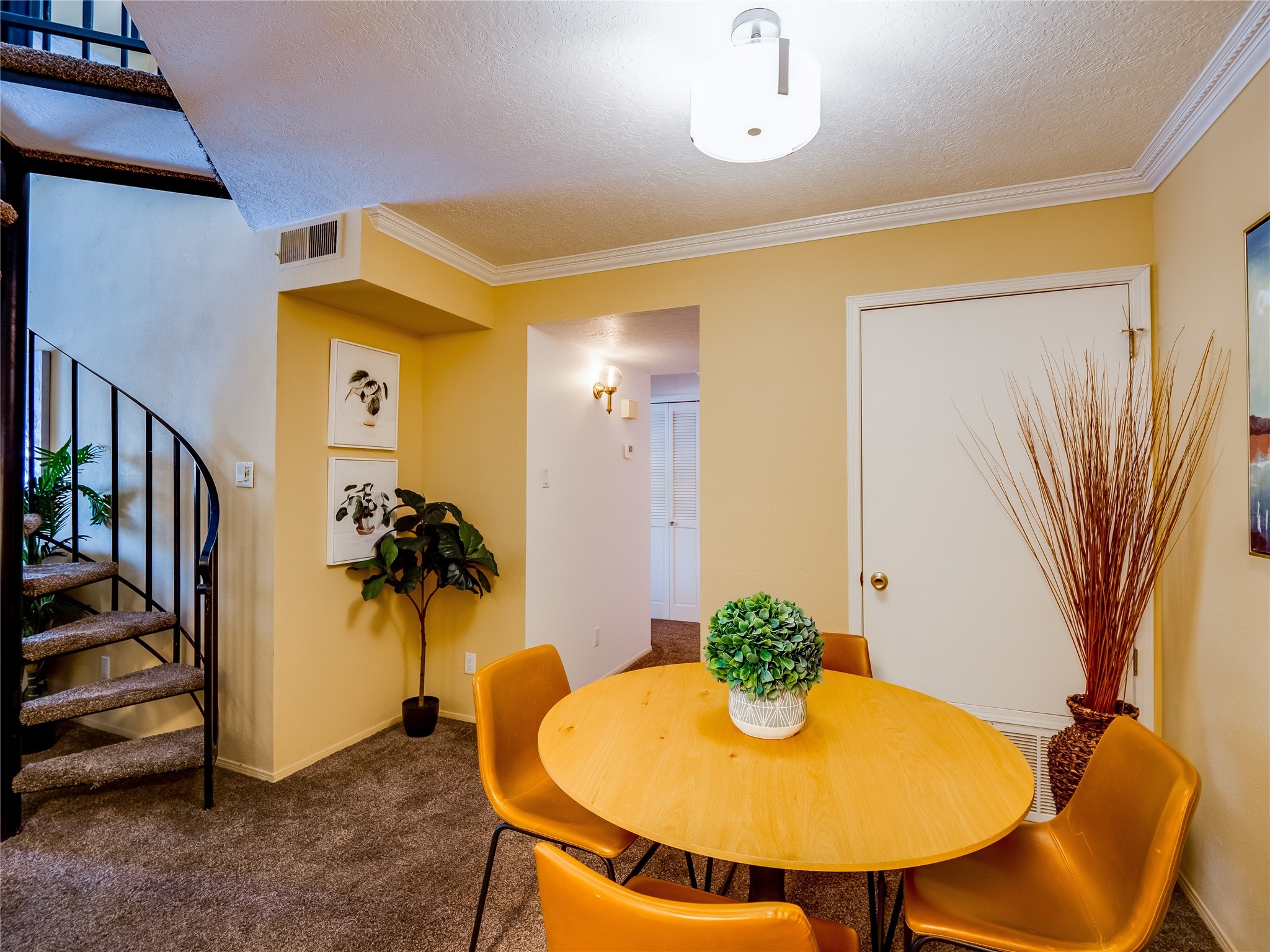 Welcome to this inviting two-story condo in the desirable Ridge Park community, offering serene treeline views from its second-floor location. Step inside to a welcoming entrance with tile flooring and a convenient coat closet. The spacious and inviting living room is the heart of the home, featuring soaring vaulted ceilings that enhance the open and airy feel. Plush carpeting adds warmth underfoot, while a wood-burning fireplace with a classic mantel serves as a cozy focal point, perfect for chilly evenings. Natural light streams in through large sliding glass doors, which lead to a covered deck, offering a peaceful outdoor retreat with treetop views. A striking spiral staircase adds architectural charm, leading to the loft-style primary suite on the second floor. The open-concept design seamlessly connects the living room to the dining area and kitchen, making the space perfect for both relaxing and entertaining. The bright galley-style kitchen features warm wood cabinetry, stylish black hardware, laminate flooring, and a passthrough window that doubles as bar seating. Just off the kitchen, you'll find a laundry closet with a stackable washer and dryer, plus built-in shelving for added convenience. A hallway with two additional storage closets leads to a full guest bathroom, complete with a single sink vanity and a tiled shower/tub combination. The spacious guest bedroom offers direct access to the covered deck, providing a private retreat with tranquil views. Upstairs, the loft-style primary en-suite is a spacious and serene escape, tucked away for ultimate privacy. The room boasts double closets offering ample storage and organization and a well-appointed bathroom with a large sink vanity and a walk-in tiled shower. Located near parks, shopping, and restaurants, this lovely condo is ready to welcome you home. Added amenities include a community pool, clubhouse, and fitness room. Don't miss your chance to see this beautiful home and schedule a viewing today!