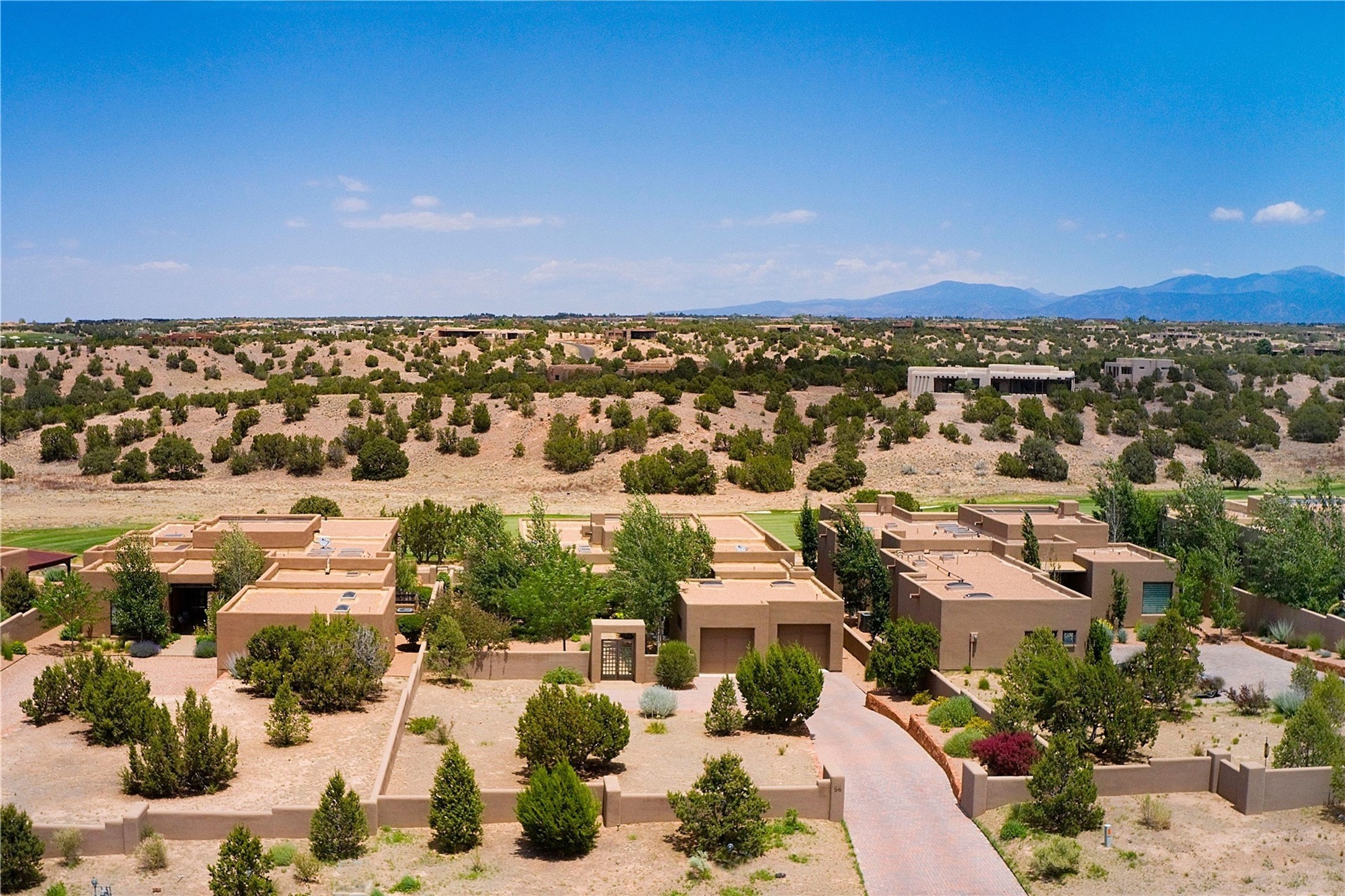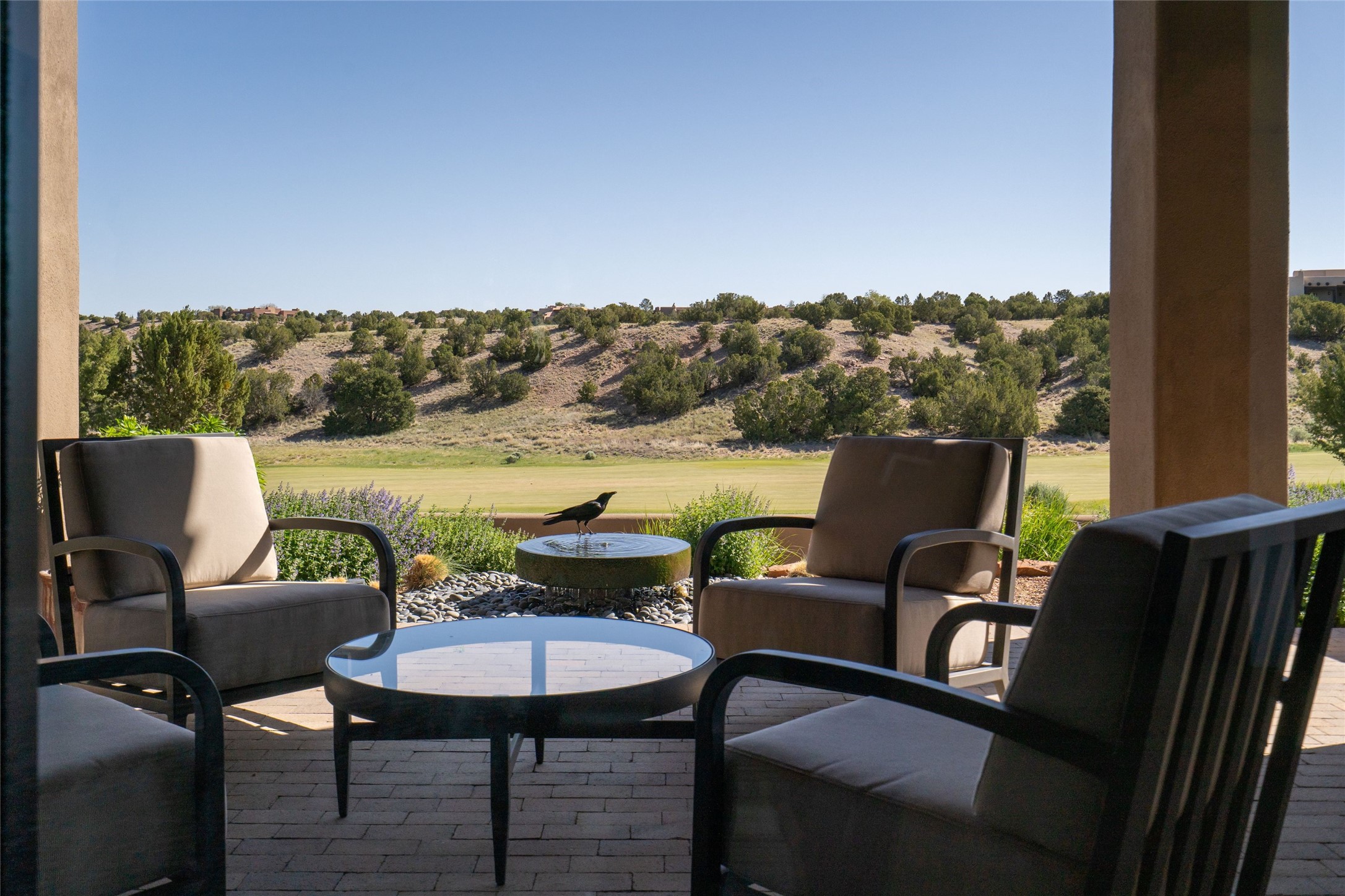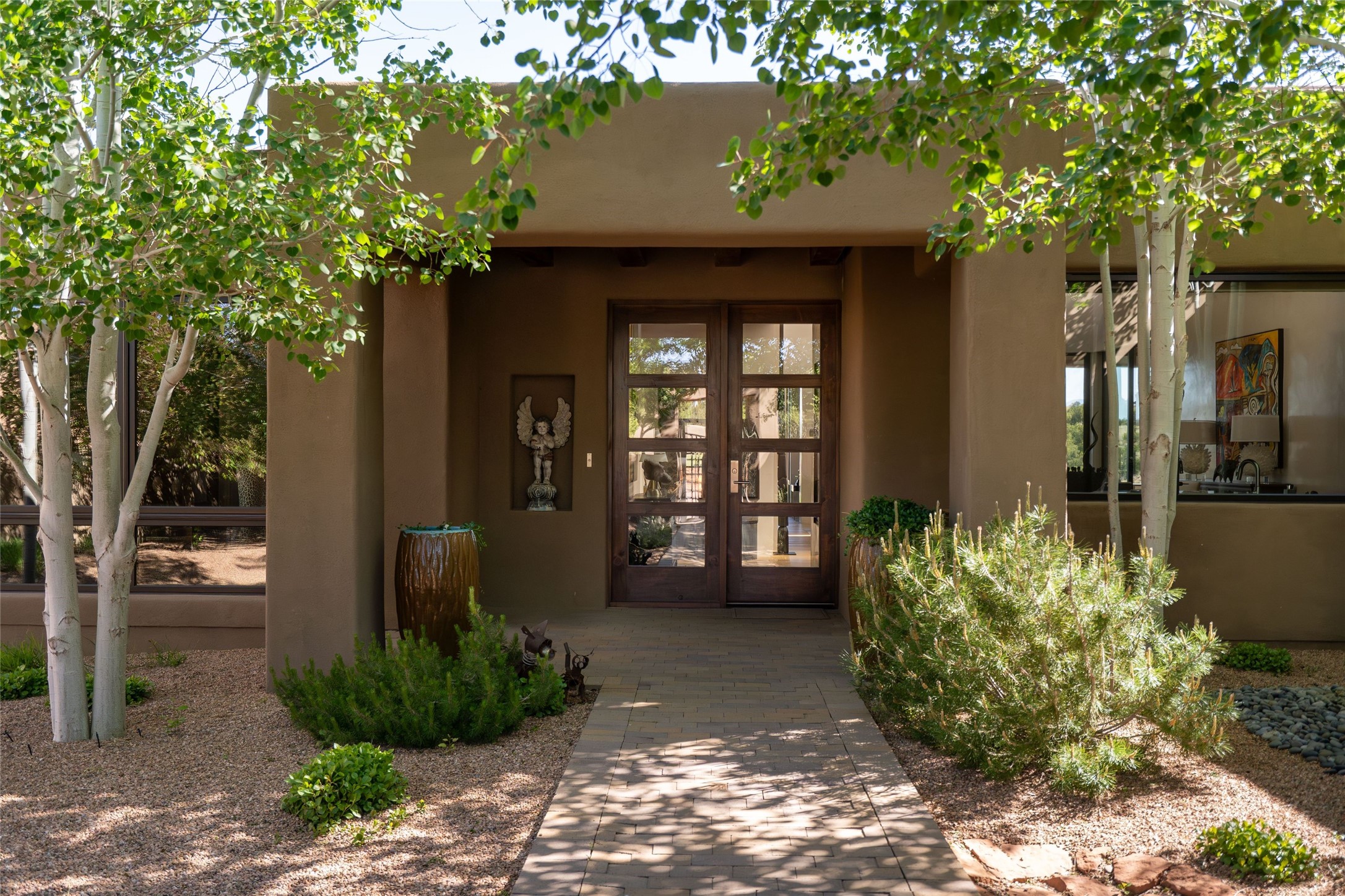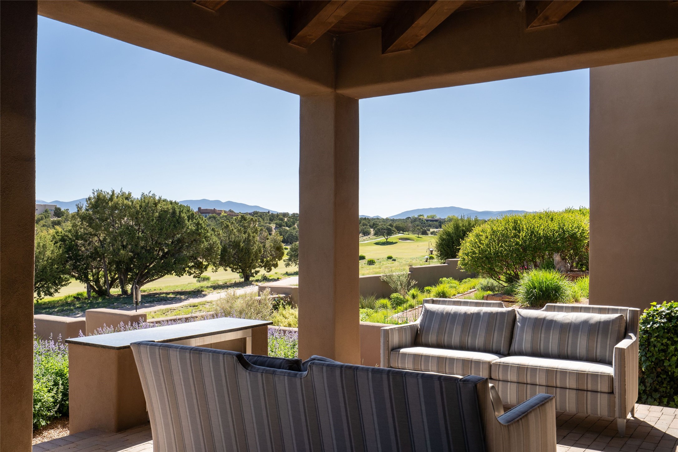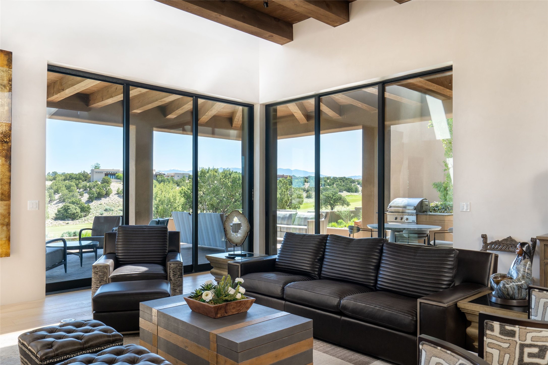 Step into this extraordinary home in Las Campanas, where modern design and natural beauty converge. Stunning 3-bedroom, 3-bath residence offers breathtaking views of the mountains and golf course, creating a picturesque backdrop for your everyday life. Crafted by the award-winning Tierra Concepts, this home exemplifies sophistication and style. The design seamlessly merges indoor and outdoor living with large disappearing window walls and oversized windows. Interior spaces have been thoughtfully curated by Santa Fe designer J. Douglas of J. Douglas Design, showcasing distinctive finishes that elevate the living experience. From the inviting wood ceilings with solid wood beams to the elegant hard-troweled diamond plaster walls and high-quality white oak flooring, every element reflects a commitment to quality and aesthetics. Gourmet kitchen is appointed a Wolf oven and range, Subzero refrigerator, and Asko dishwasher. Spacious primary bedroom features a fireplace, expansive walk-in closet, and a luxury bathroom with separated dual sinks, a soaking tub, and a walk-in shower. Entertaining is effortless with brick patios designed for outdoor dining and leisure, all framed by courtyard walls. Sustainable landscaping with a timed irrigation system that utilizes buried roof water harvesting cisterns alongside community water. 2-car garage equipped with an EV charging station. Experience the perfect blend of luxury and nature where every detail is designed for a lifestyle of elegance and ease.