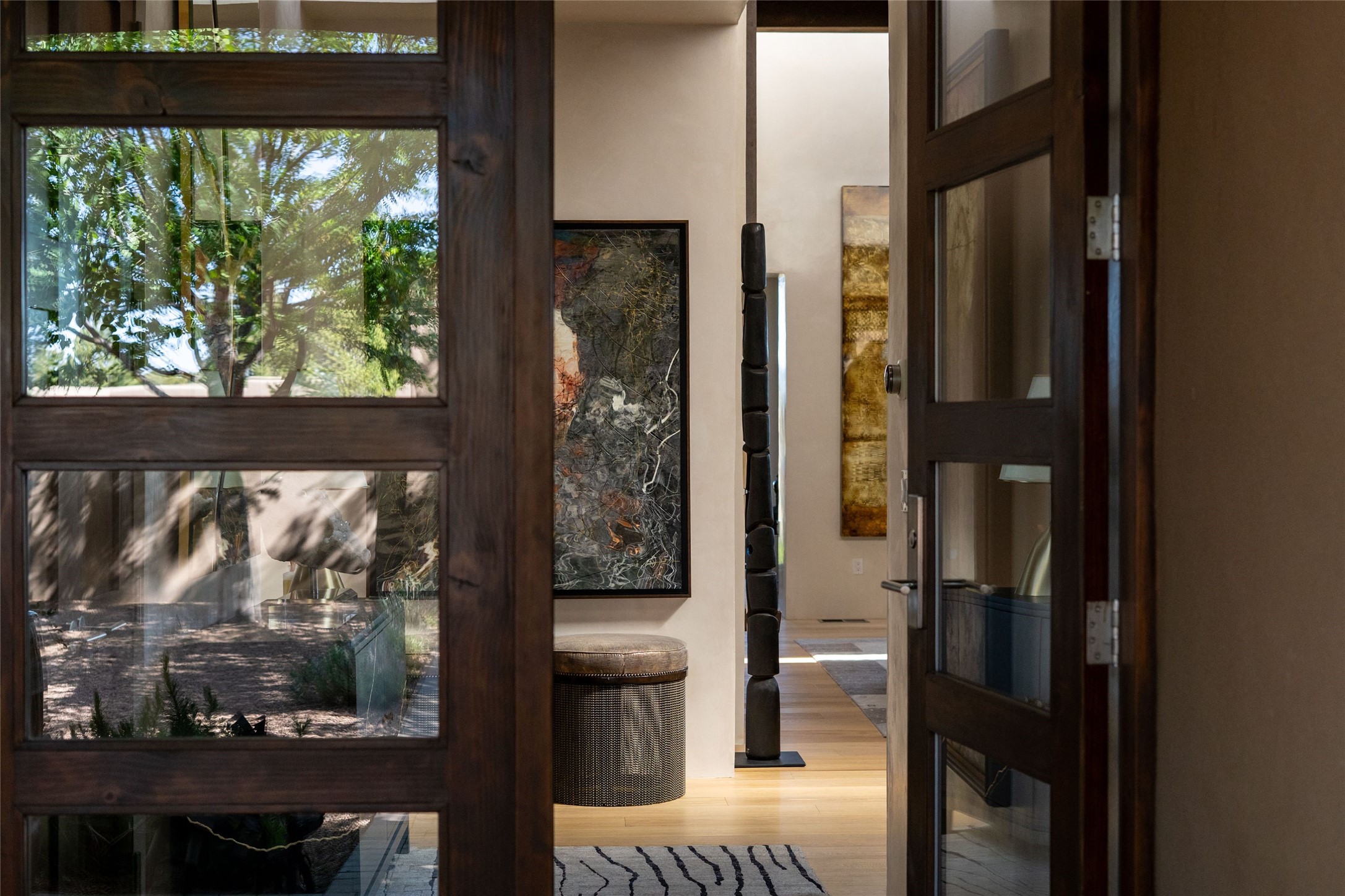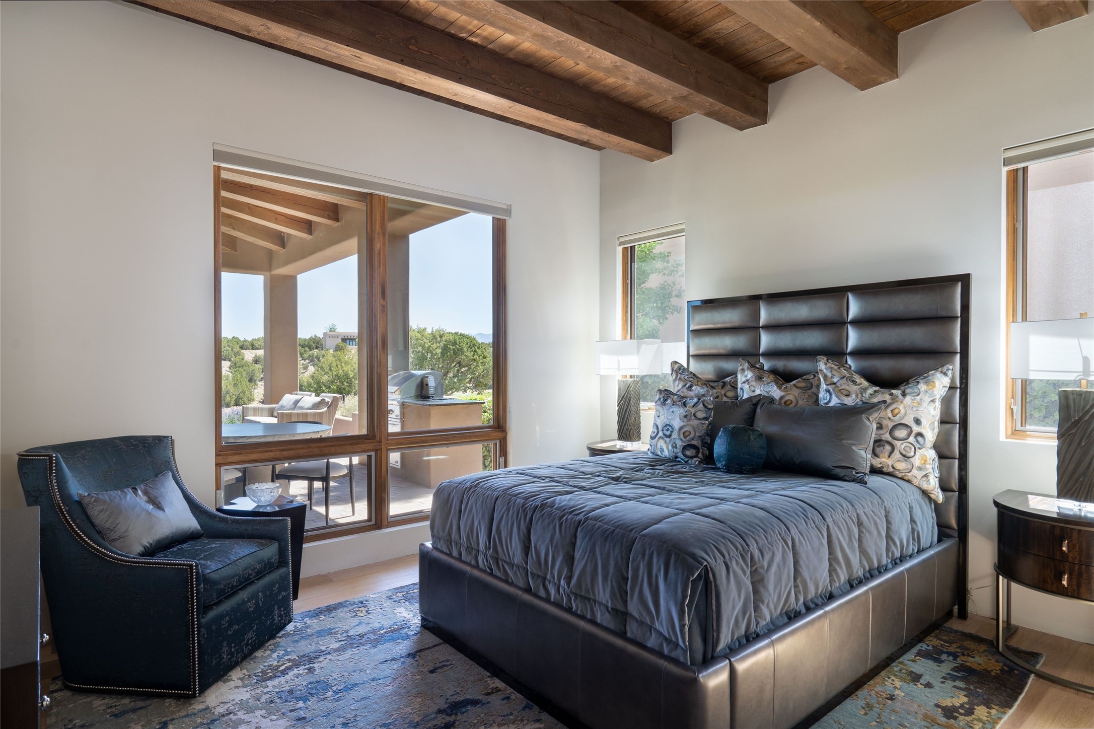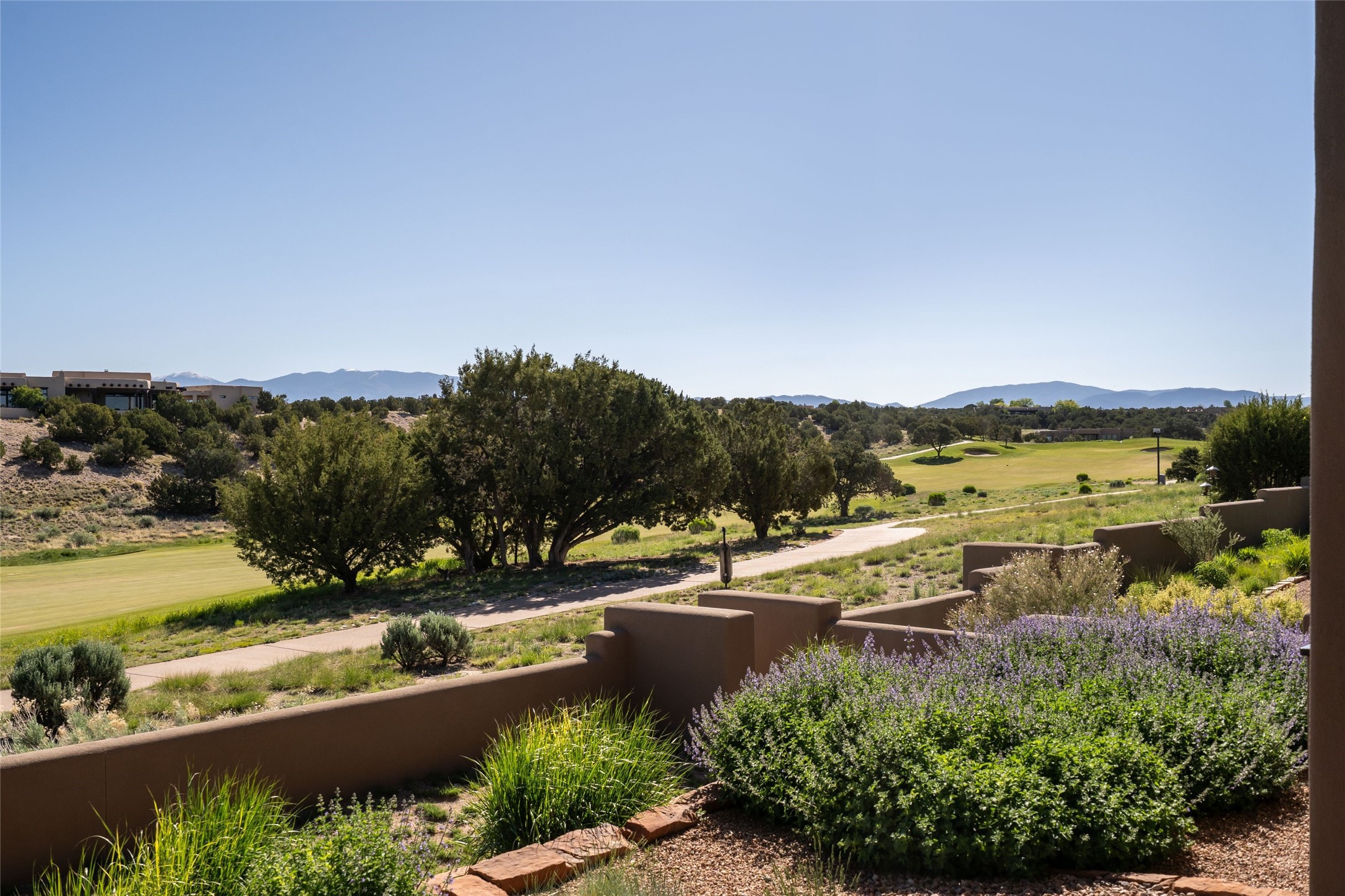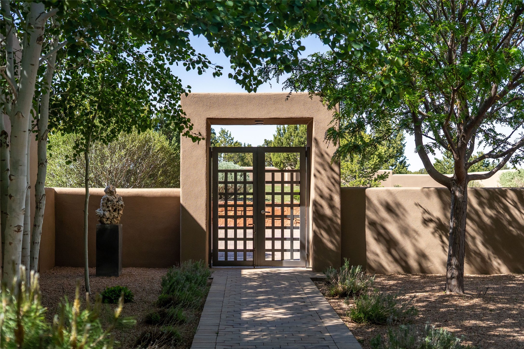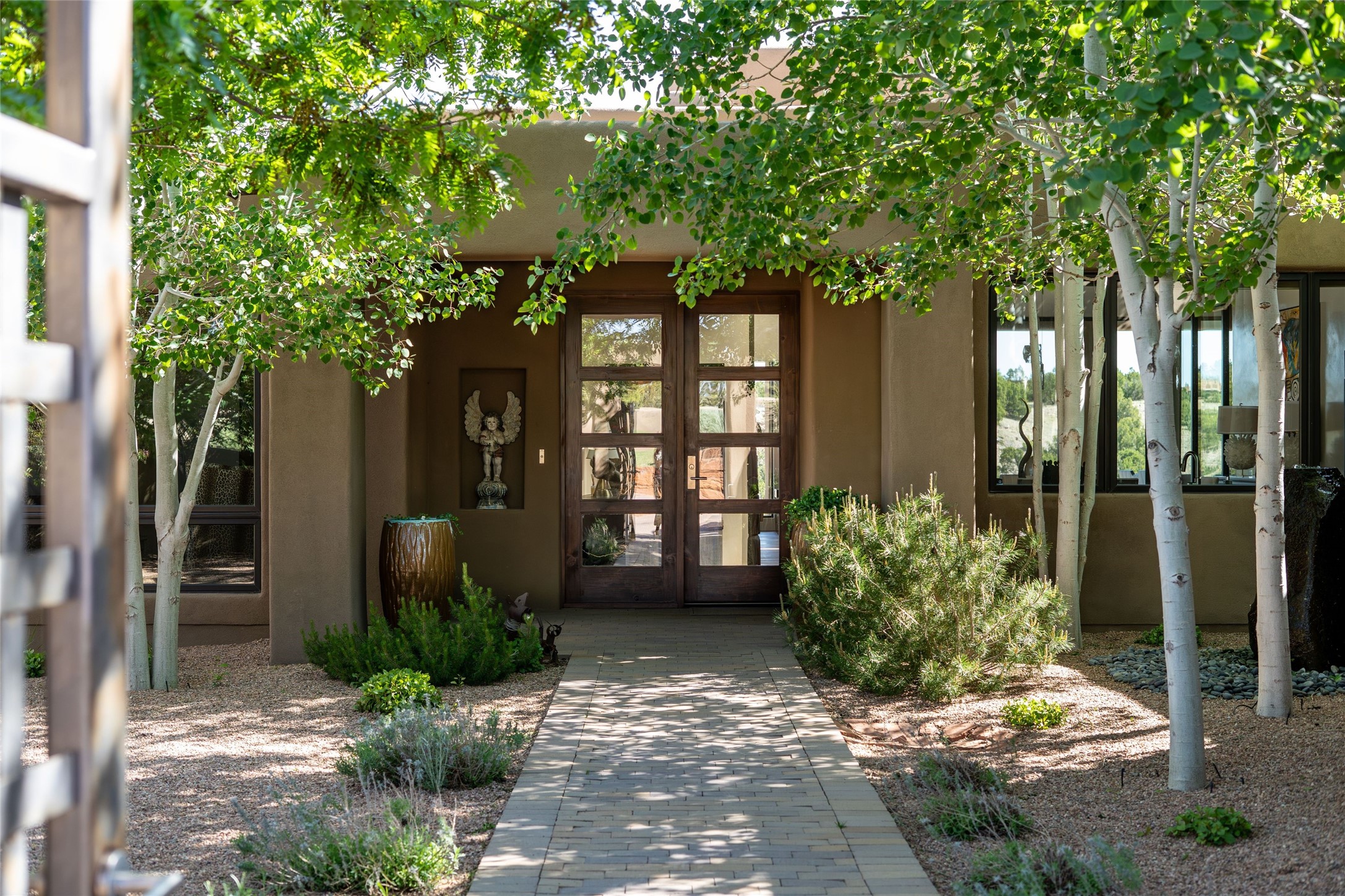 Step into this extraordinary home in Las Campanas, where modern design and natural beauty converge. Stunning 3-bedroom, 3-bath residence offers breathtaking views of the mountains and golf course, creating a picturesque backdrop for your everyday life. Crafted by the award-winning Tierra Concepts, this home exemplifies sophistication and style. The design seamlessly merges indoor and outdoor living with large disappearing window walls and oversized windows. Interior spaces have been thoughtfully curated by Santa Fe designer J. Douglas of J. Douglas Design, showcasing distinctive finishes that elevate the living experience. From the inviting wood ceilings with solid wood beams to the elegant hard-troweled diamond plaster walls and high-quality white oak flooring, every element reflects a commitment to quality and aesthetics. Gourmet kitchen is appointed a Wolf oven and range, Subzero refrigerator, and Asko dishwasher. Spacious primary bedroom features a fireplace, expansive walk-in closet, and a luxury bathroom with separated dual sinks, a soaking tub, and a walk-in shower. Entertaining is effortless with brick patios designed for outdoor dining and leisure, all framed by courtyard walls. Sustainable landscaping with a timed irrigation system that utilizes buried roof water harvesting cisterns alongside community water. 2-car garage equipped with an EV charging station. Experience the perfect blend of luxury and nature where every detail is designed for a lifestyle of elegance and ease.