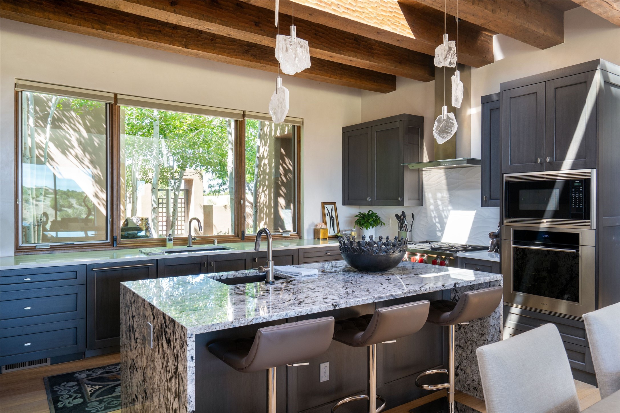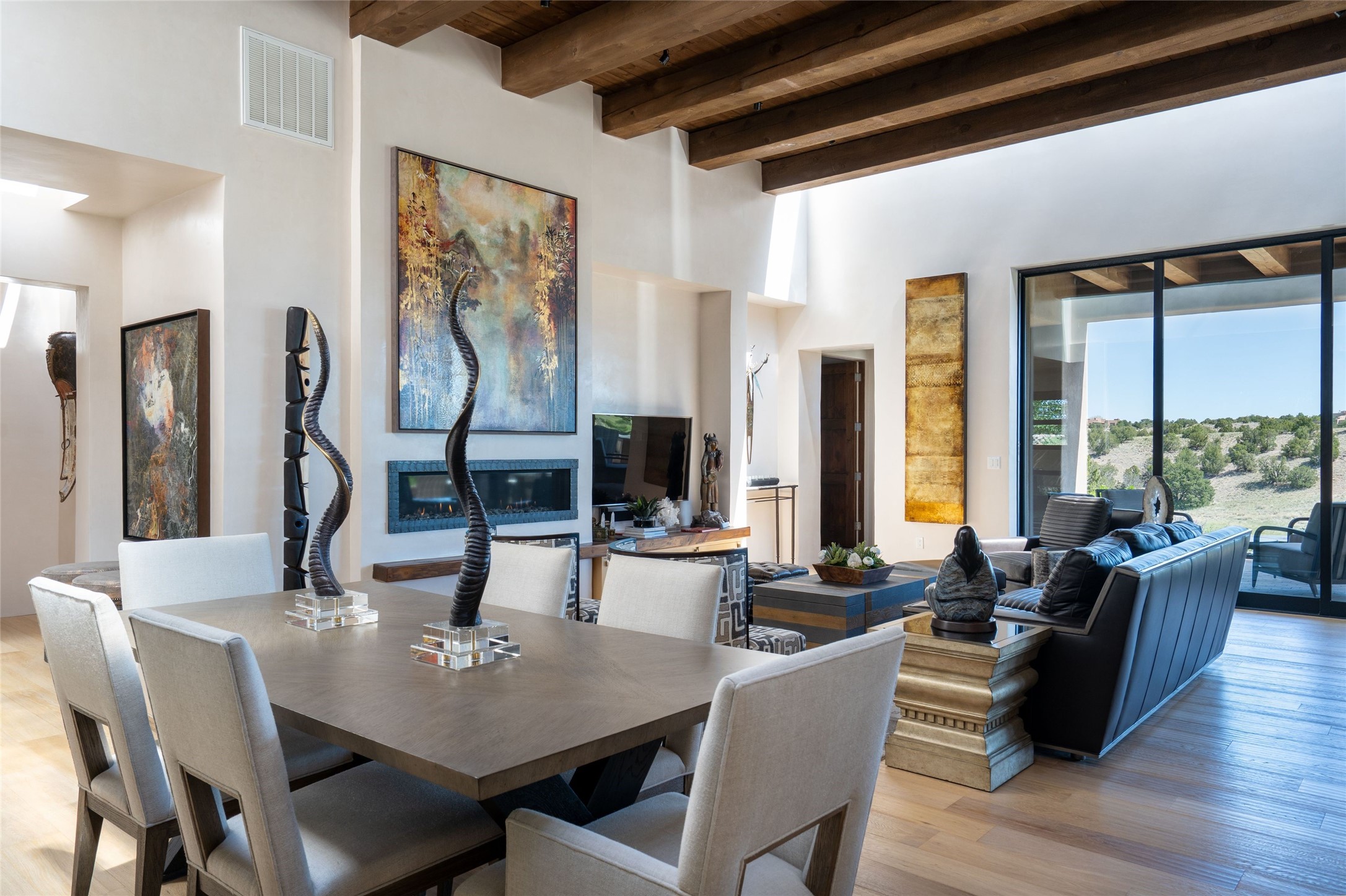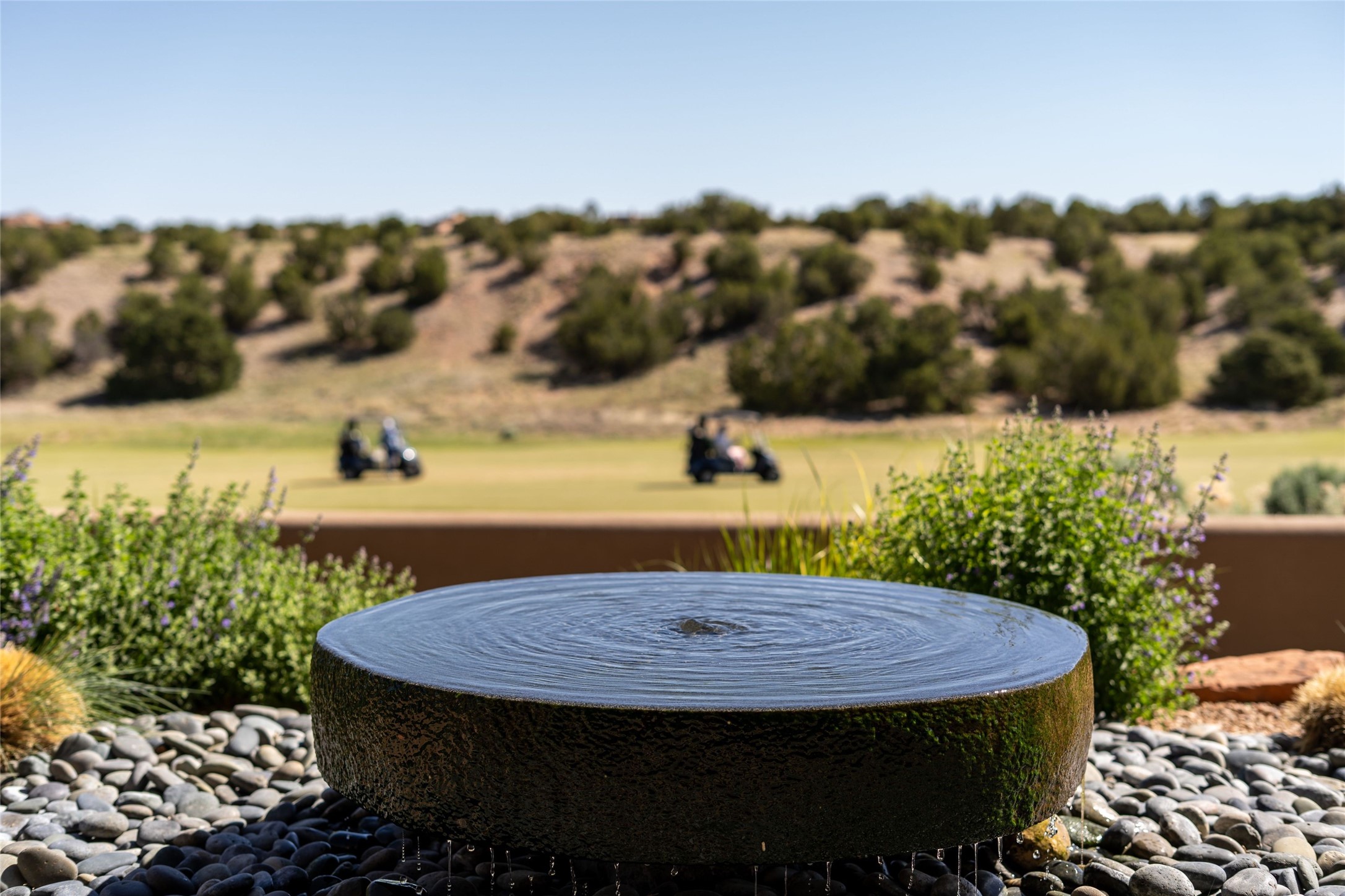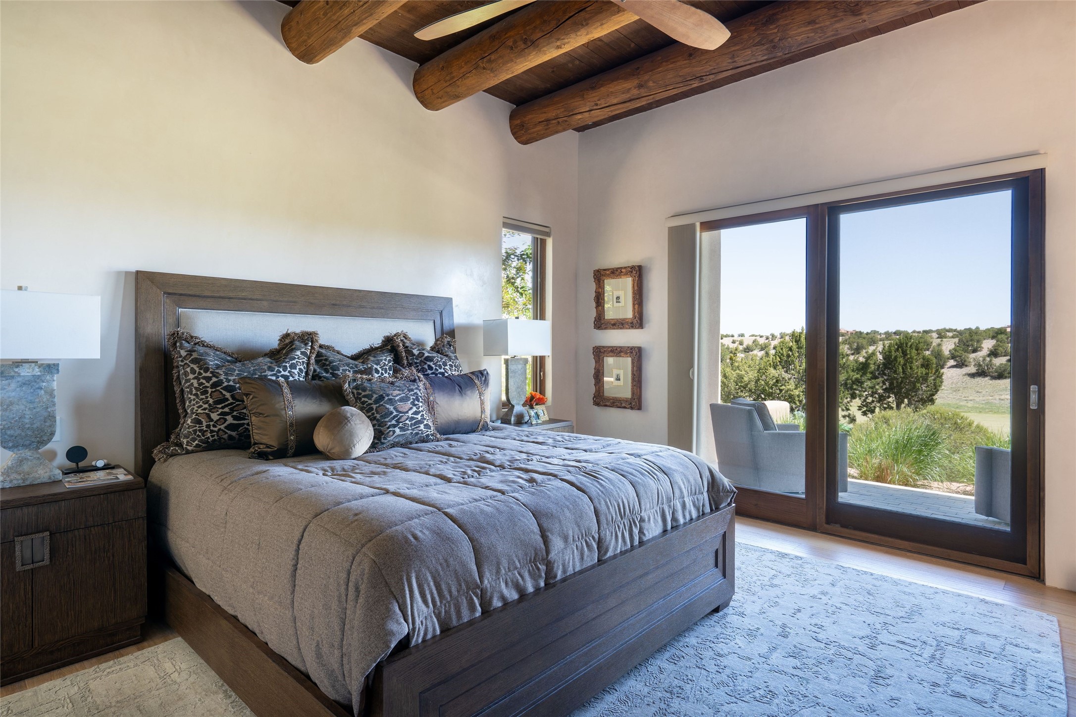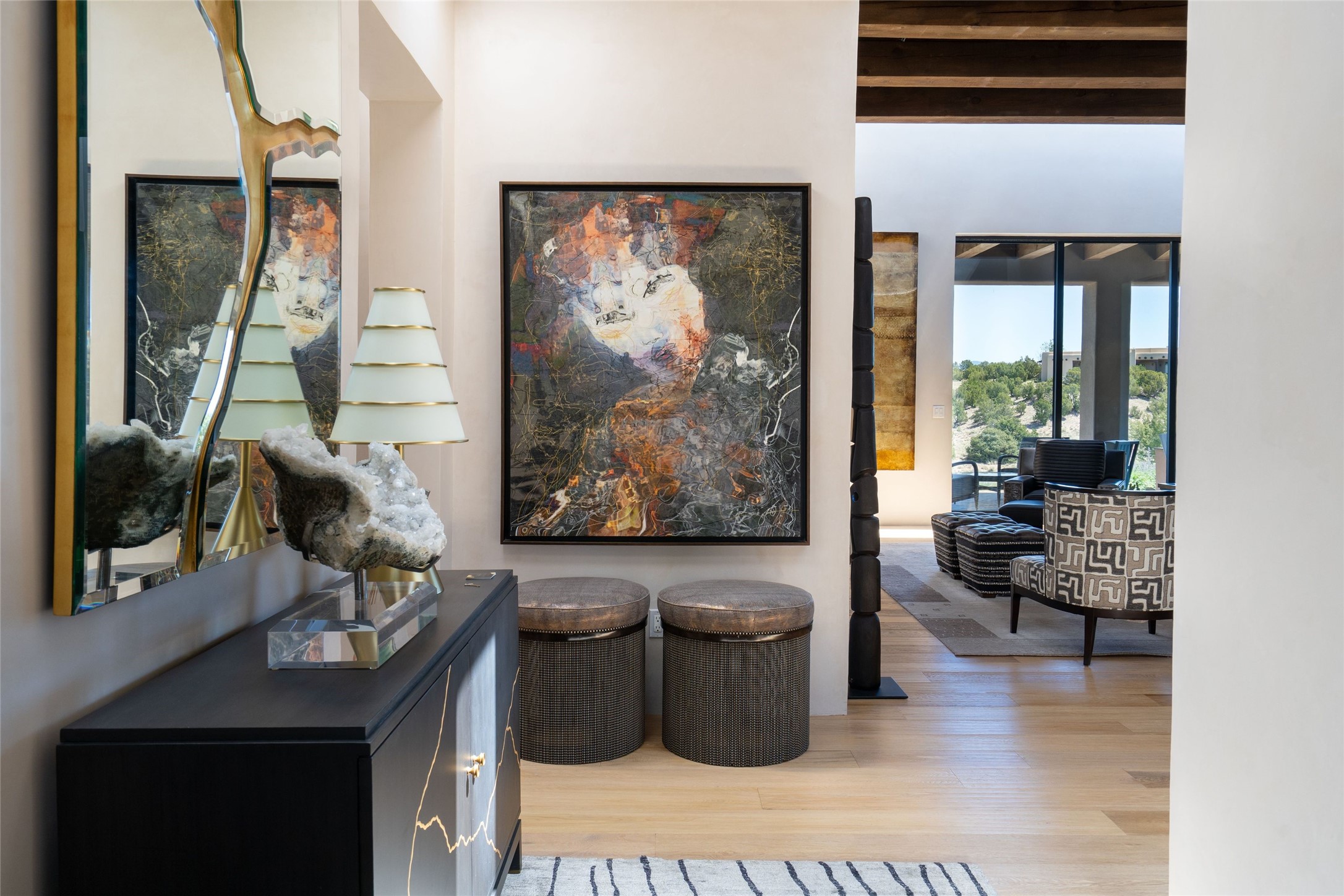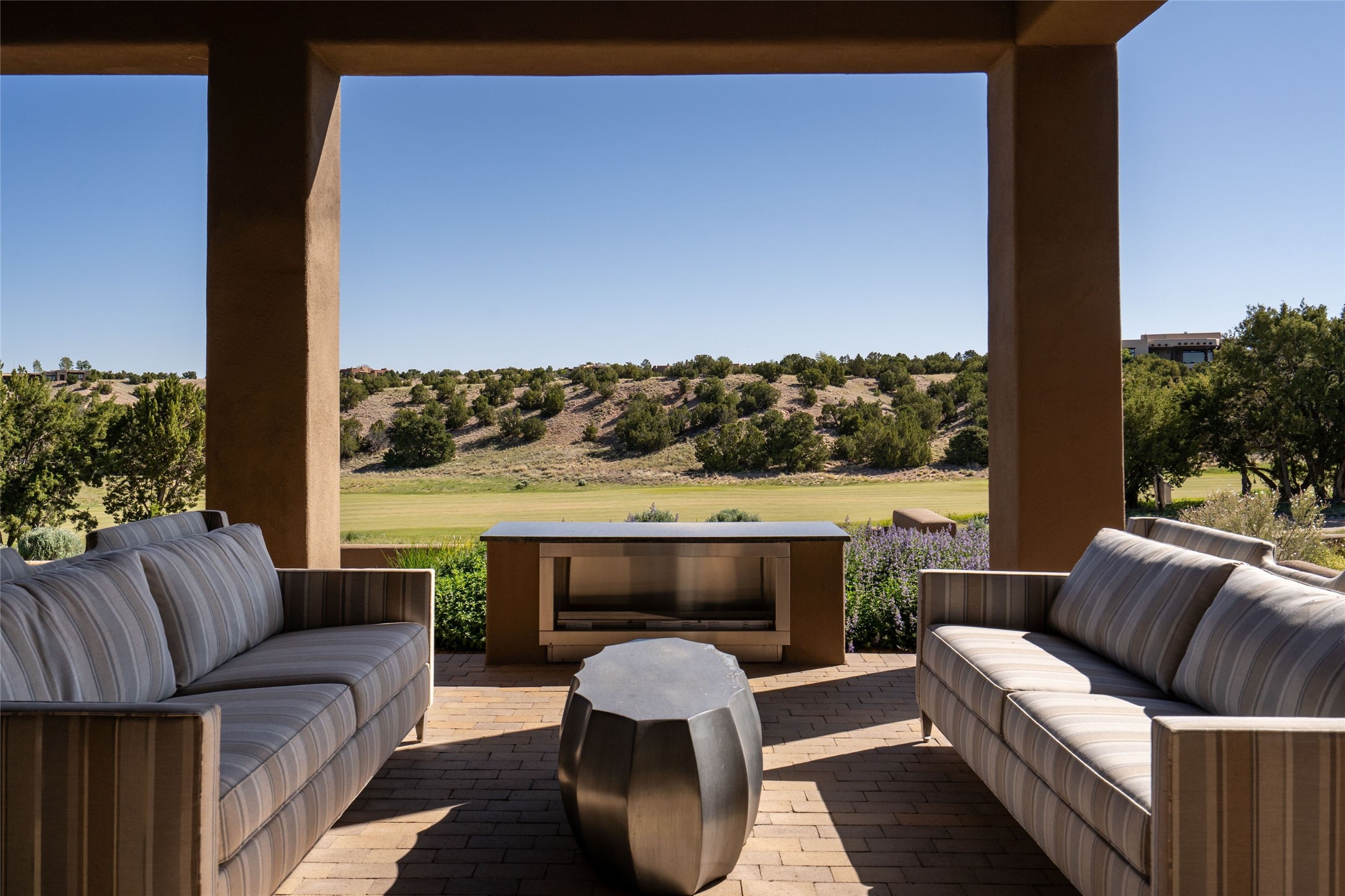 Step into this extraordinary home in Las Campanas, where modern design and natural beauty converge. Stunning 3-bedroom, 3-bath residence offers breathtaking views of the mountains and golf course, creating a picturesque backdrop for your everyday life. Crafted by the award-winning Tierra Concepts, this home exemplifies sophistication and style. The design seamlessly merges indoor and outdoor living with large disappearing window walls and oversized windows. Interior spaces have been thoughtfully curated by Santa Fe designer J. Douglas of J. Douglas Design, showcasing distinctive finishes that elevate the living experience. From the inviting wood ceilings with solid wood beams to the elegant hard-troweled diamond plaster walls and high-quality white oak flooring, every element reflects a commitment to quality and aesthetics. Gourmet kitchen is appointed a Wolf oven and range, Subzero refrigerator, and Asko dishwasher. Spacious primary bedroom features a fireplace, expansive walk-in closet, and a luxury bathroom with separated dual sinks, a soaking tub, and a walk-in shower. Entertaining is effortless with brick patios designed for outdoor dining and leisure, all framed by courtyard walls. Sustainable landscaping with a timed irrigation system that utilizes buried roof water harvesting cisterns alongside community water. 2-car garage equipped with an EV charging station. Experience the perfect blend of luxury and nature where every detail is designed for a lifestyle of elegance and ease.