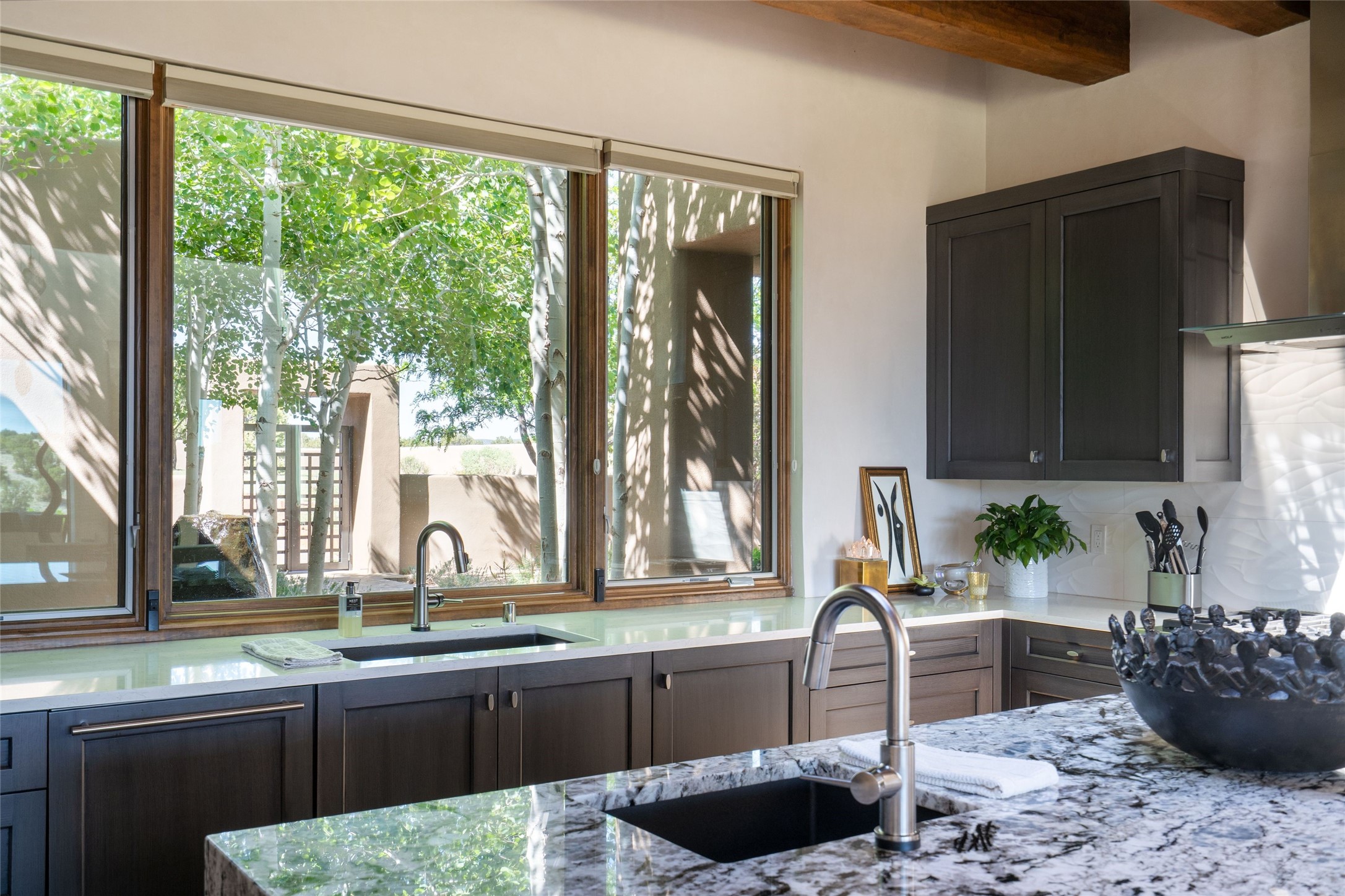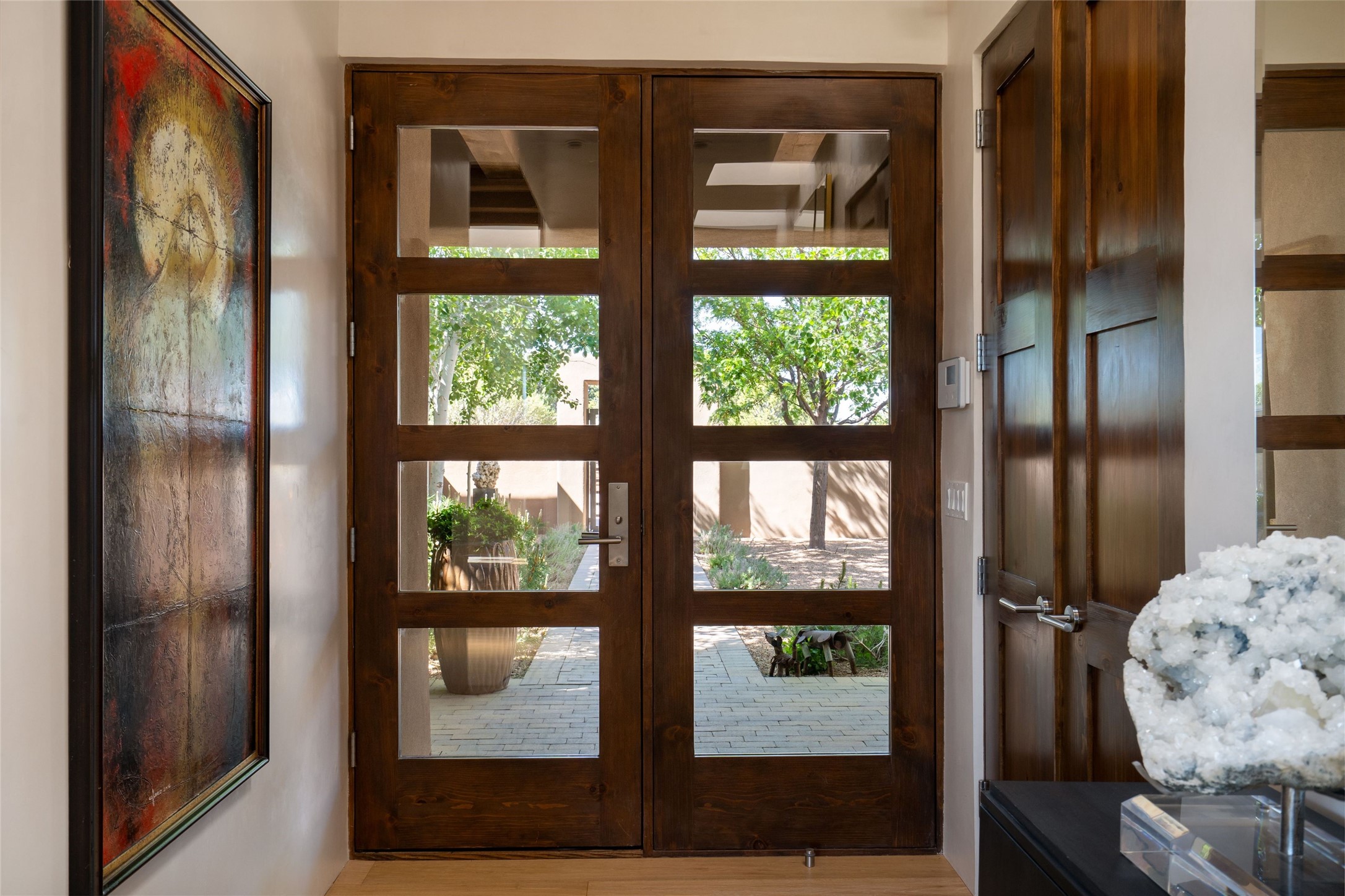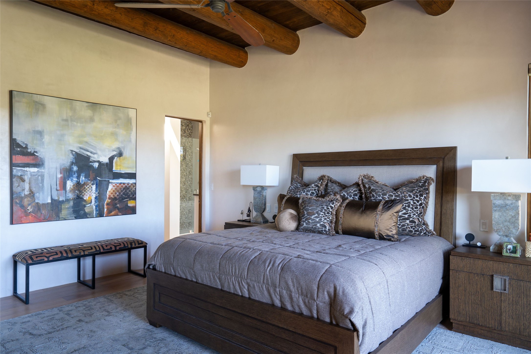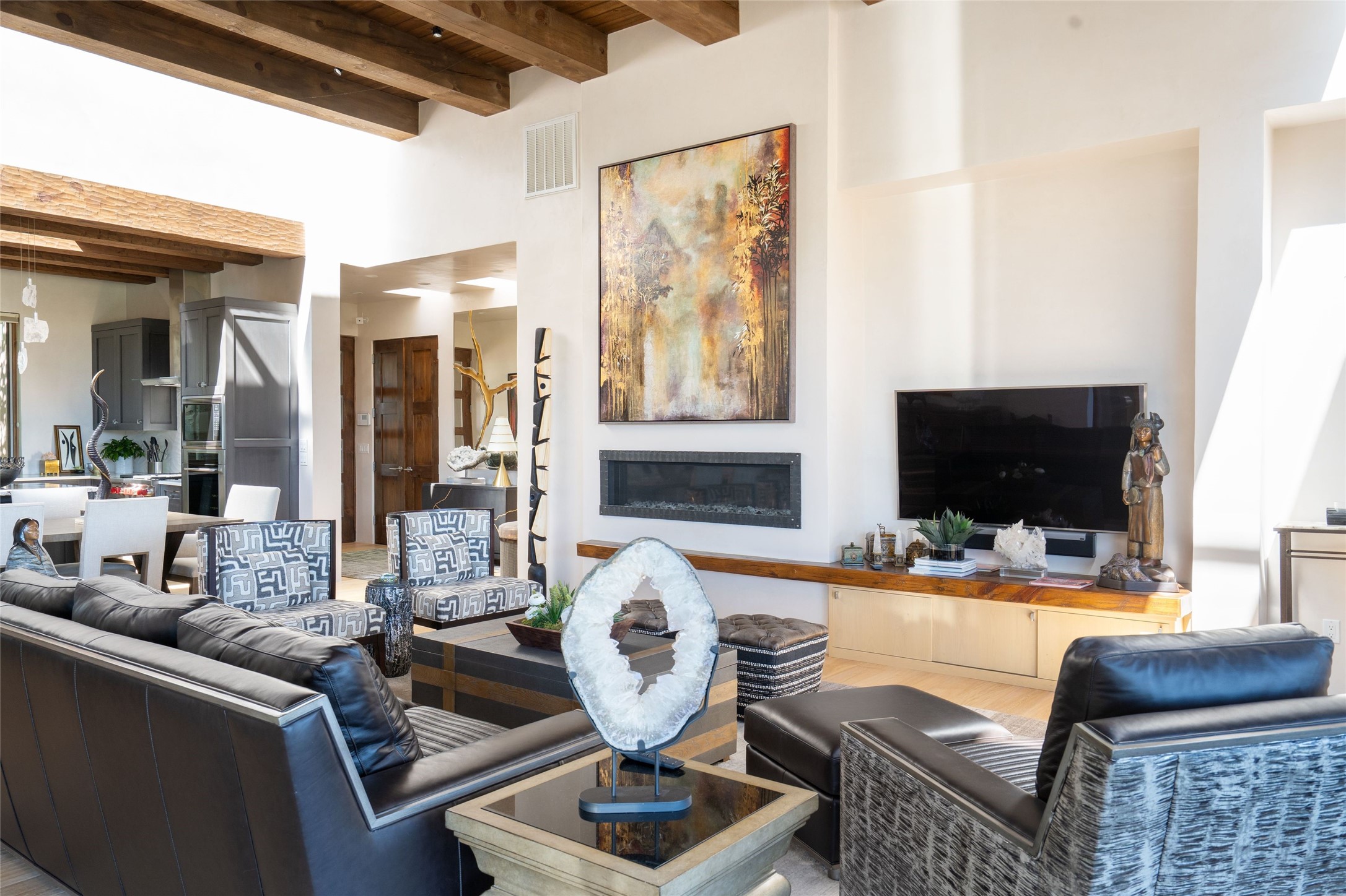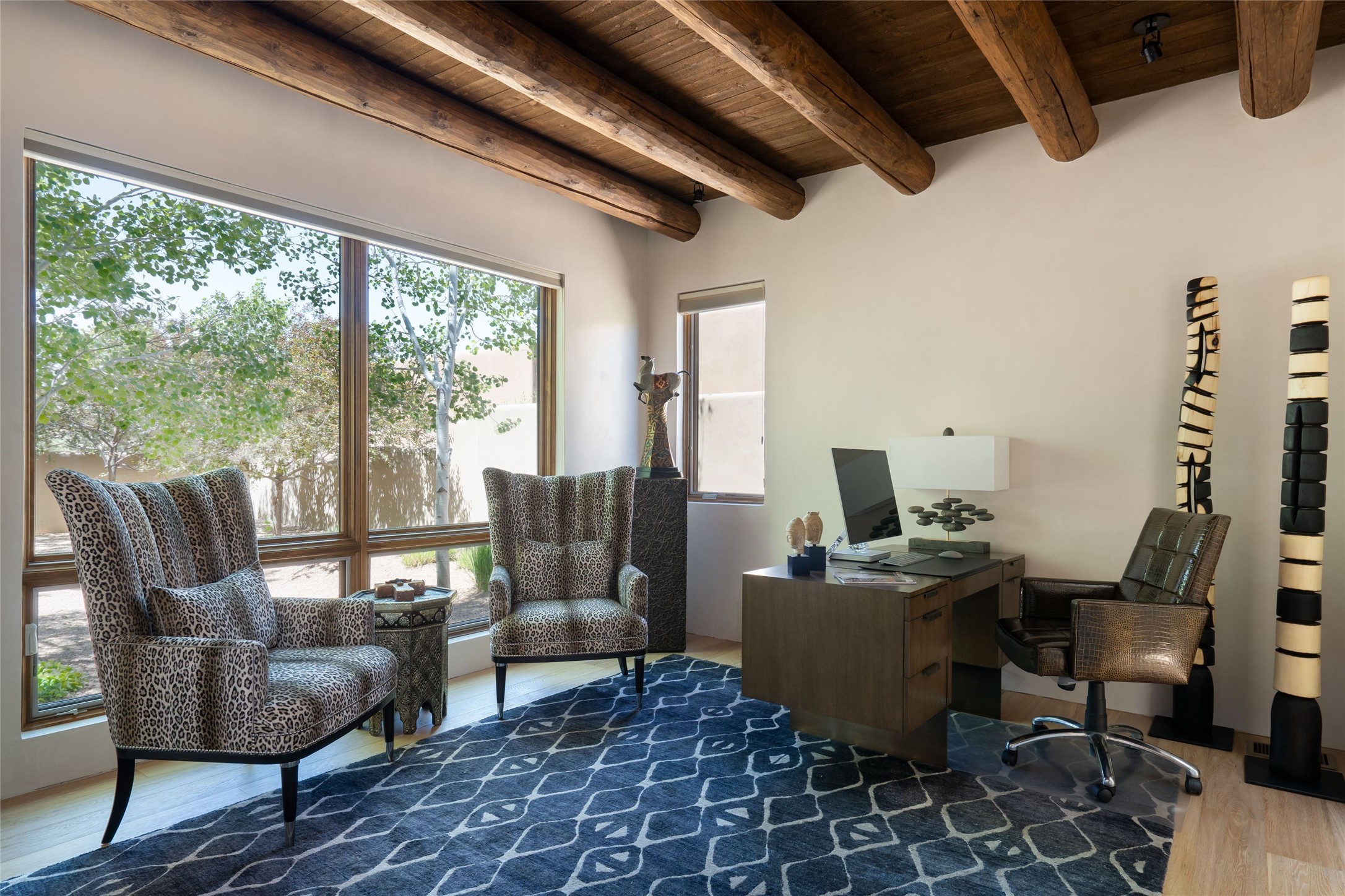 Step into this extraordinary home in Las Campanas, where modern design and natural beauty converge. Stunning 3-bedroom, 3-bath residence offers breathtaking views of the mountains and golf course, creating a picturesque backdrop for your everyday life. Crafted by the award-winning Tierra Concepts, this home exemplifies sophistication and style. The design seamlessly merges indoor and outdoor living with large disappearing window walls and oversized windows. Interior spaces have been thoughtfully curated by Santa Fe designer J. Douglas of J. Douglas Design, showcasing distinctive finishes that elevate the living experience. From the inviting wood ceilings with solid wood beams to the elegant hard-troweled diamond plaster walls and high-quality white oak flooring, every element reflects a commitment to quality and aesthetics. Gourmet kitchen is appointed a Wolf oven and range, Subzero refrigerator, and Asko dishwasher. Spacious primary bedroom features a fireplace, expansive walk-in closet, and a luxury bathroom with separated dual sinks, a soaking tub, and a walk-in shower. Entertaining is effortless with brick patios designed for outdoor dining and leisure, all framed by courtyard walls. Sustainable landscaping with a timed irrigation system that utilizes buried roof water harvesting cisterns alongside community water. 2-car garage equipped with an EV charging station. Experience the perfect blend of luxury and nature where every detail is designed for a lifestyle of elegance and ease.