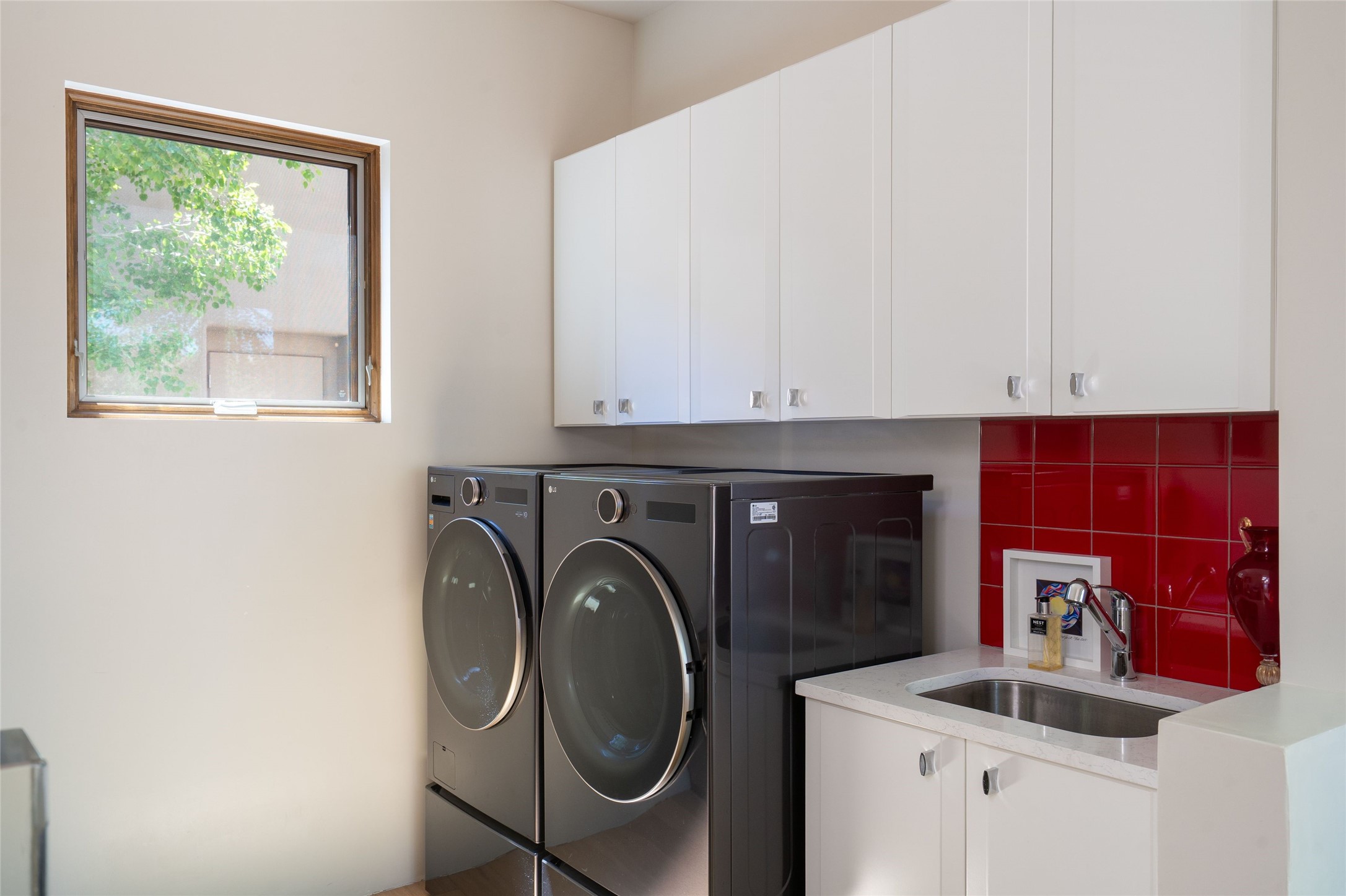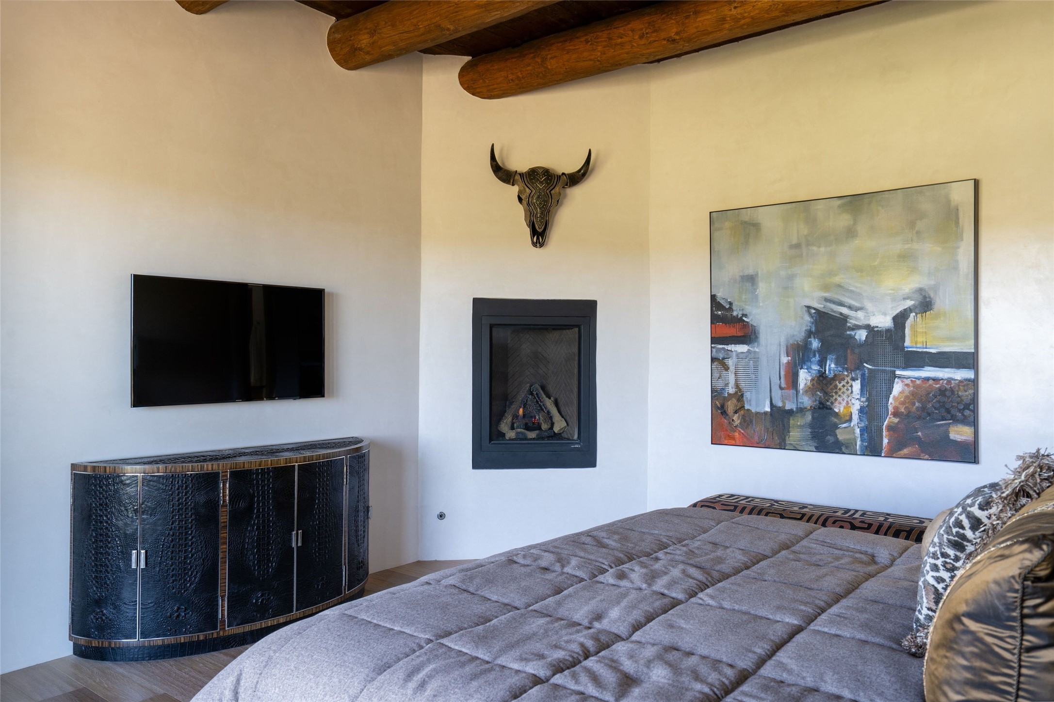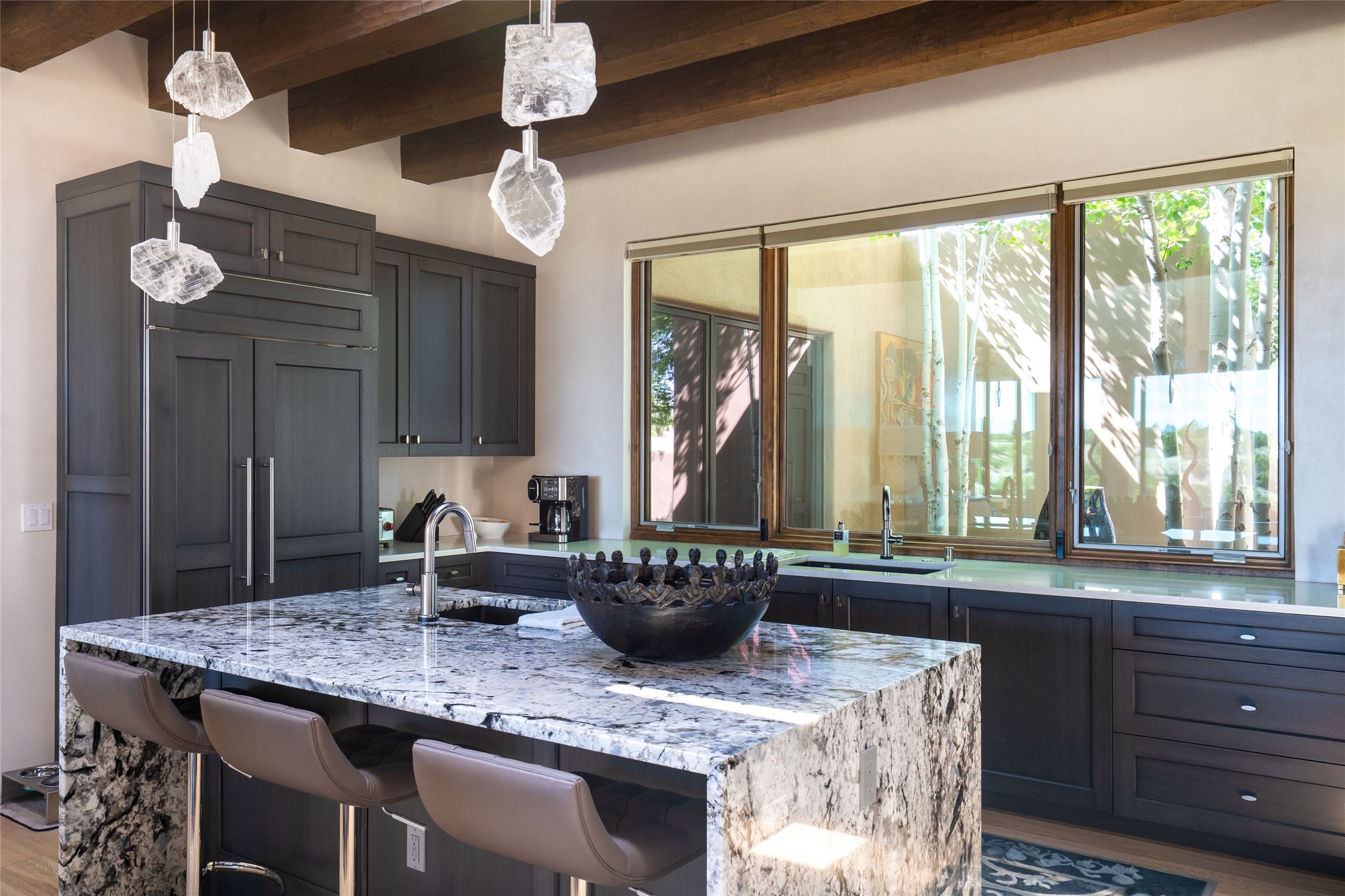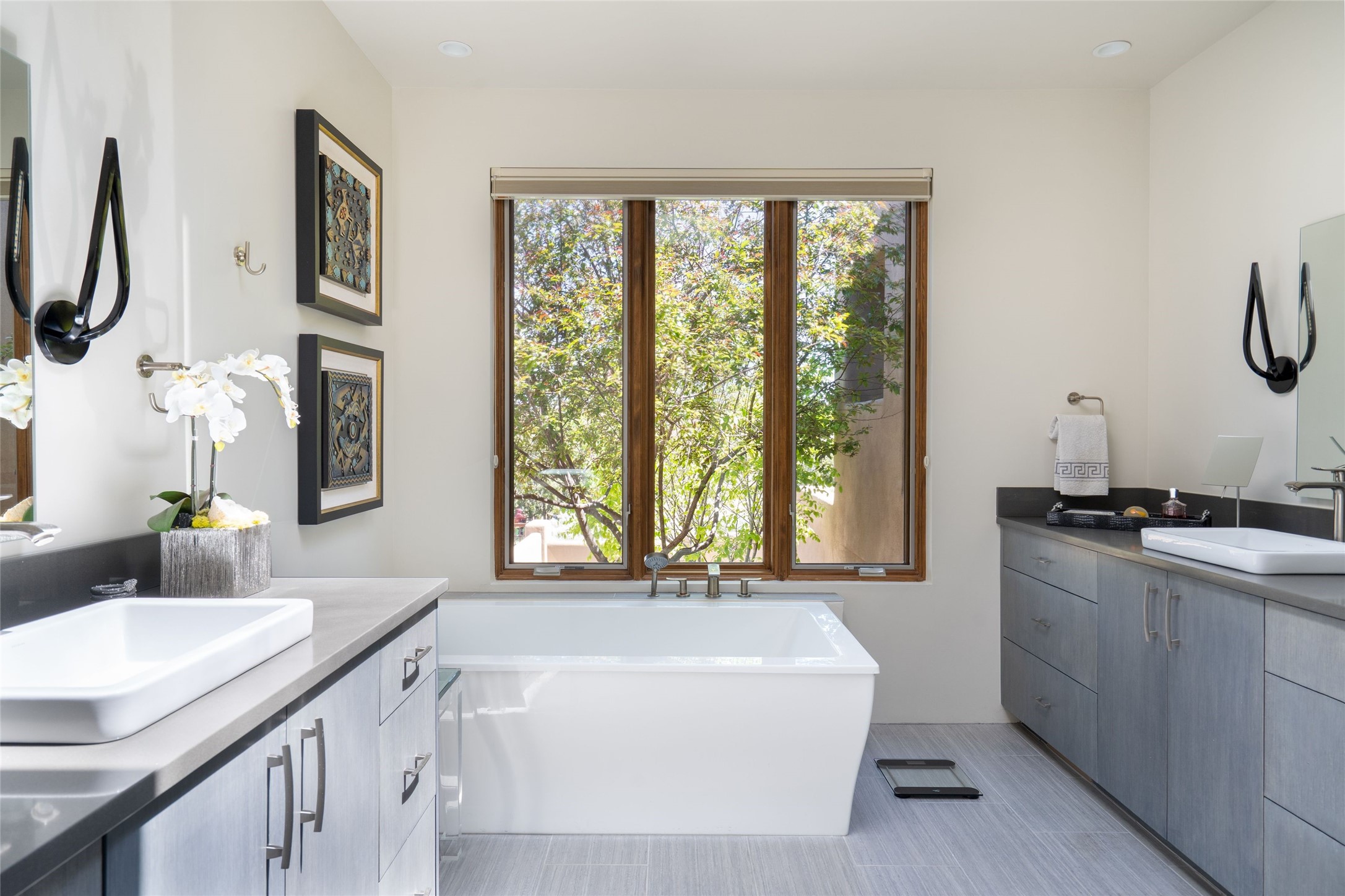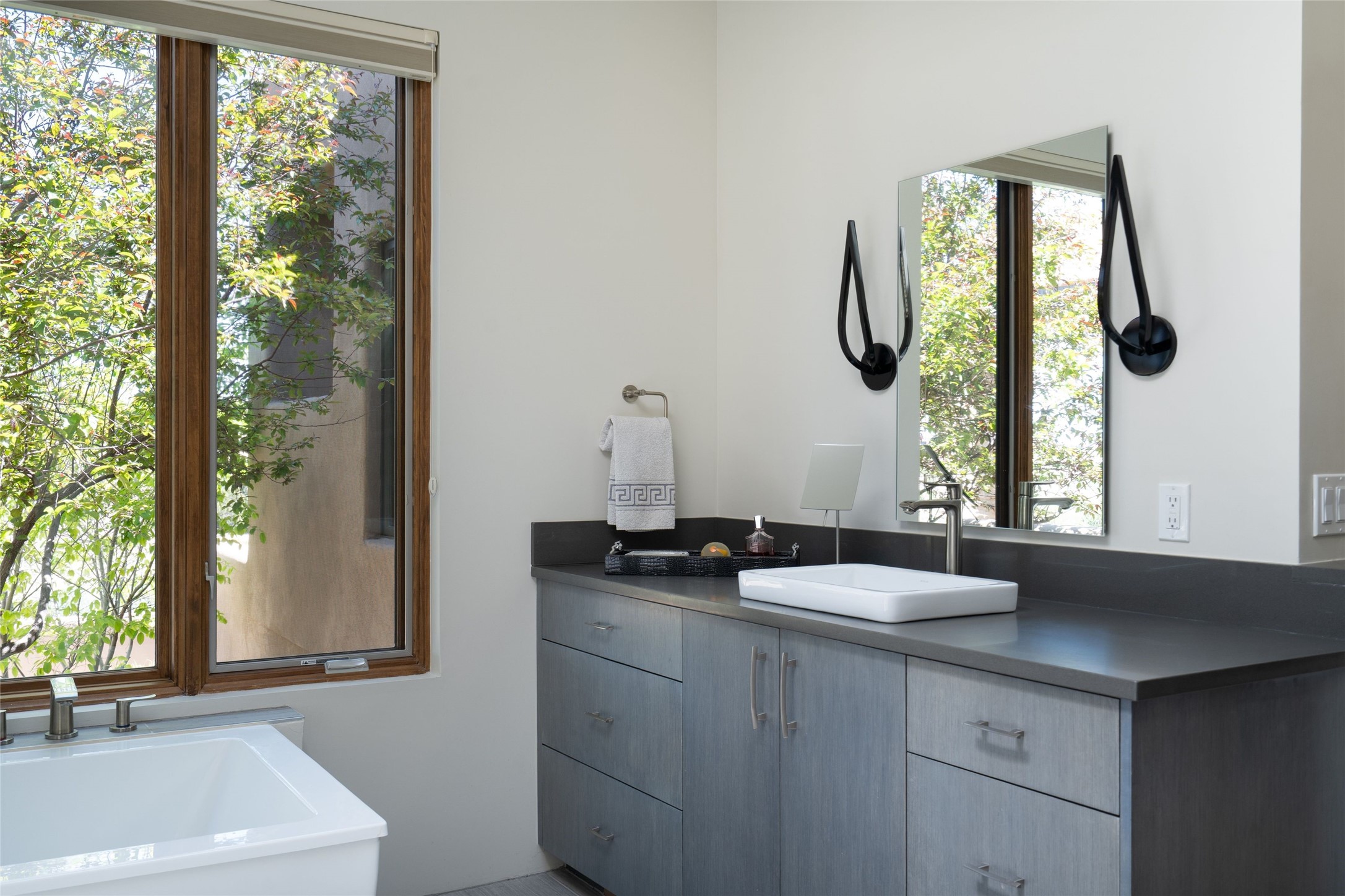 Step into this extraordinary home in Las Campanas, where modern design and natural beauty converge. Stunning 3-bedroom, 3-bath residence offers breathtaking views of the mountains and golf course, creating a picturesque backdrop for your everyday life. Crafted by the award-winning Tierra Concepts, this home exemplifies sophistication and style. The design seamlessly merges indoor and outdoor living with large disappearing window walls and oversized windows. Interior spaces have been thoughtfully curated by Santa Fe designer J. Douglas of J. Douglas Design, showcasing distinctive finishes that elevate the living experience. From the inviting wood ceilings with solid wood beams to the elegant hard-troweled diamond plaster walls and high-quality white oak flooring, every element reflects a commitment to quality and aesthetics. Gourmet kitchen is appointed a Wolf oven and range, Subzero refrigerator, and Asko dishwasher. Spacious primary bedroom features a fireplace, expansive walk-in closet, and a luxury bathroom with separated dual sinks, a soaking tub, and a walk-in shower. Entertaining is effortless with brick patios designed for outdoor dining and leisure, all framed by courtyard walls. Sustainable landscaping with a timed irrigation system that utilizes buried roof water harvesting cisterns alongside community water. 2-car garage equipped with an EV charging station. Experience the perfect blend of luxury and nature where every detail is designed for a lifestyle of elegance and ease.