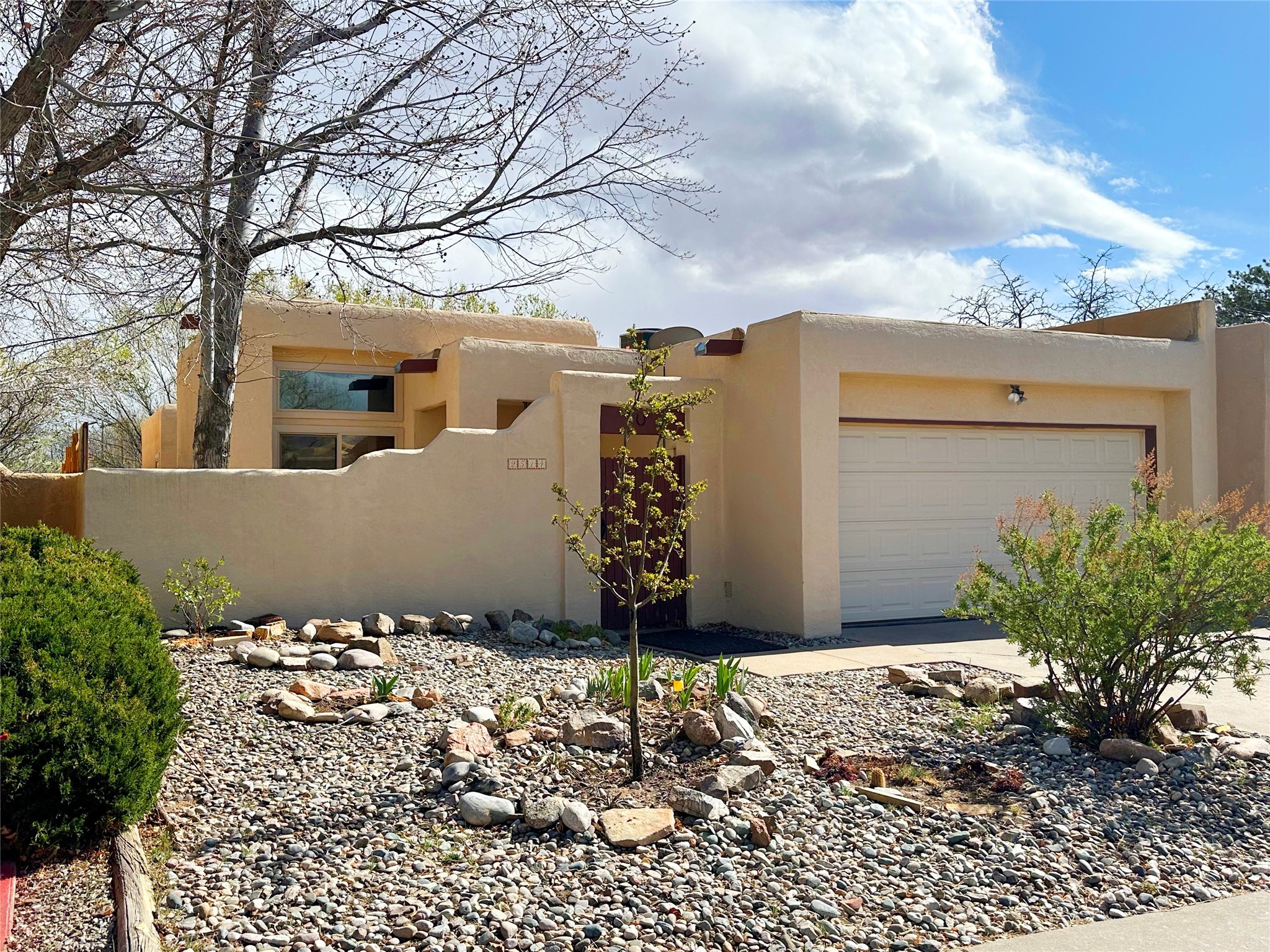 Well-maintained Santa Fe home offering three bedrooms and two baths in a convenient location. The heart of the home presents an open-concept living area with a well-designed kitchen, featuring butcher block countertops, stainless steel appliances, and glass display cabinetry. A large skylight and modern recessed lighting create bright, welcoming spaces throughout. Embracing Santa Fe's indoor-outdoor lifestyle, both the primary suite and second bedroom open directly to a covered deck with cooling fans, creating natural extensions of the living space. The primary suite includes an en-suite bath, while a tastefully refreshed guest bath completes the modern layout. A beautiful backyard features a flourishing Japanese blossom tree, offering a peaceful setting with room for additional landscaping. Multiple outdoor living spaces, including an intimate side patio and welcoming front courtyard, provide versatile areas for relaxation or entertaining. The two-car garage provides secure parking and storage space. Set near the Santa Fe Rail Trail with easy I-25 access, this home is just a 10-minute drive to the historic Plaza. The location perfectly combines pleasant residential living with convenient access to Santa Fe's culture. Adding to this home's appeal, the seller provides a generous $3,000 credit at closing towards carpet replacement in the bedrooms.