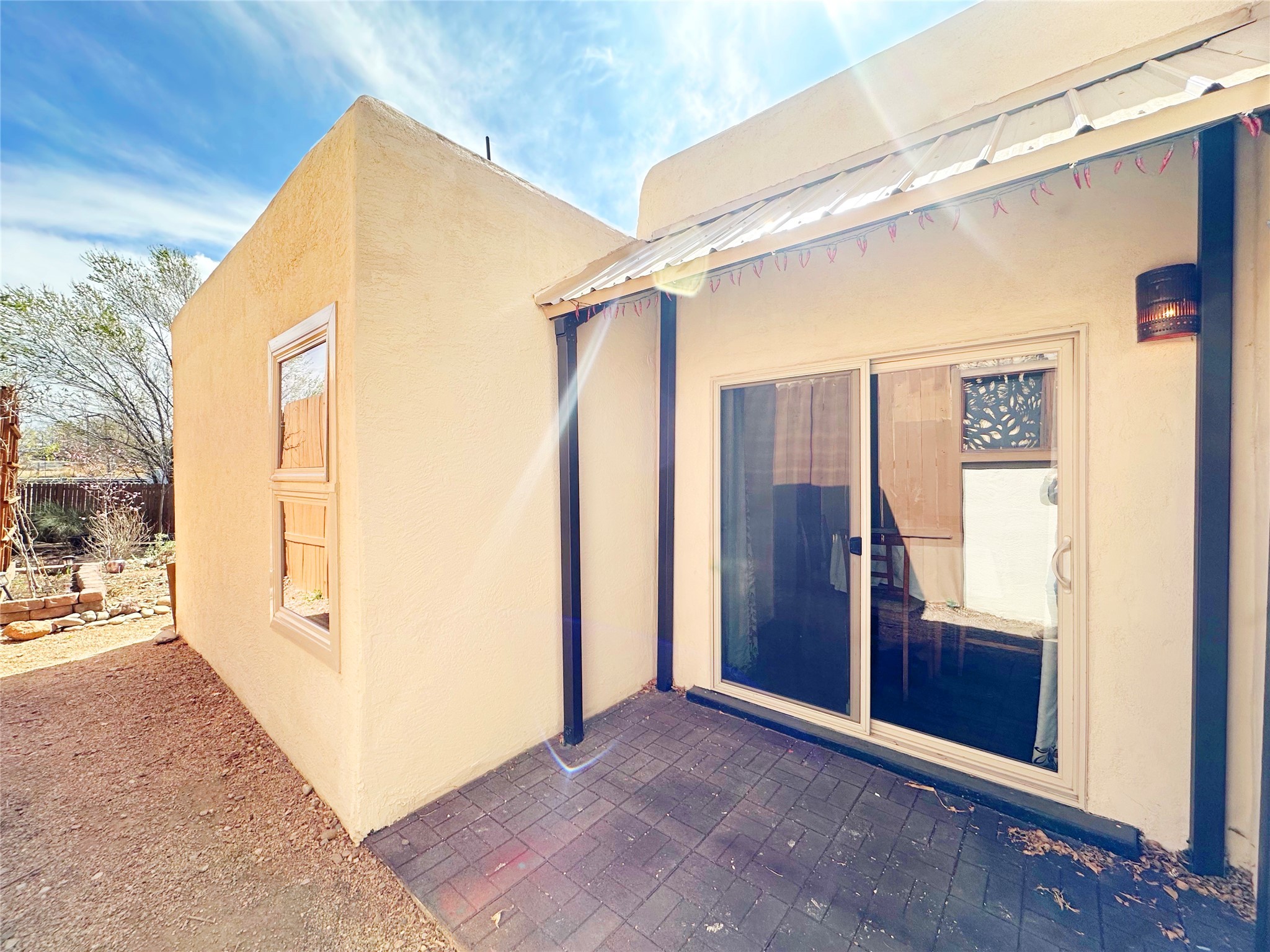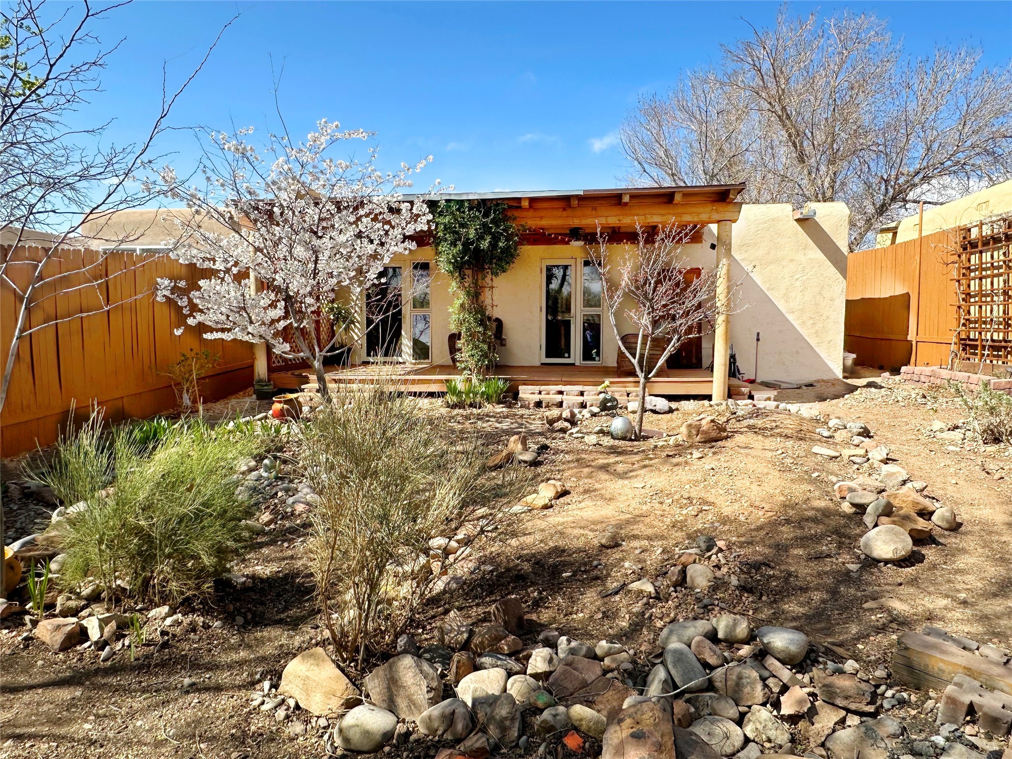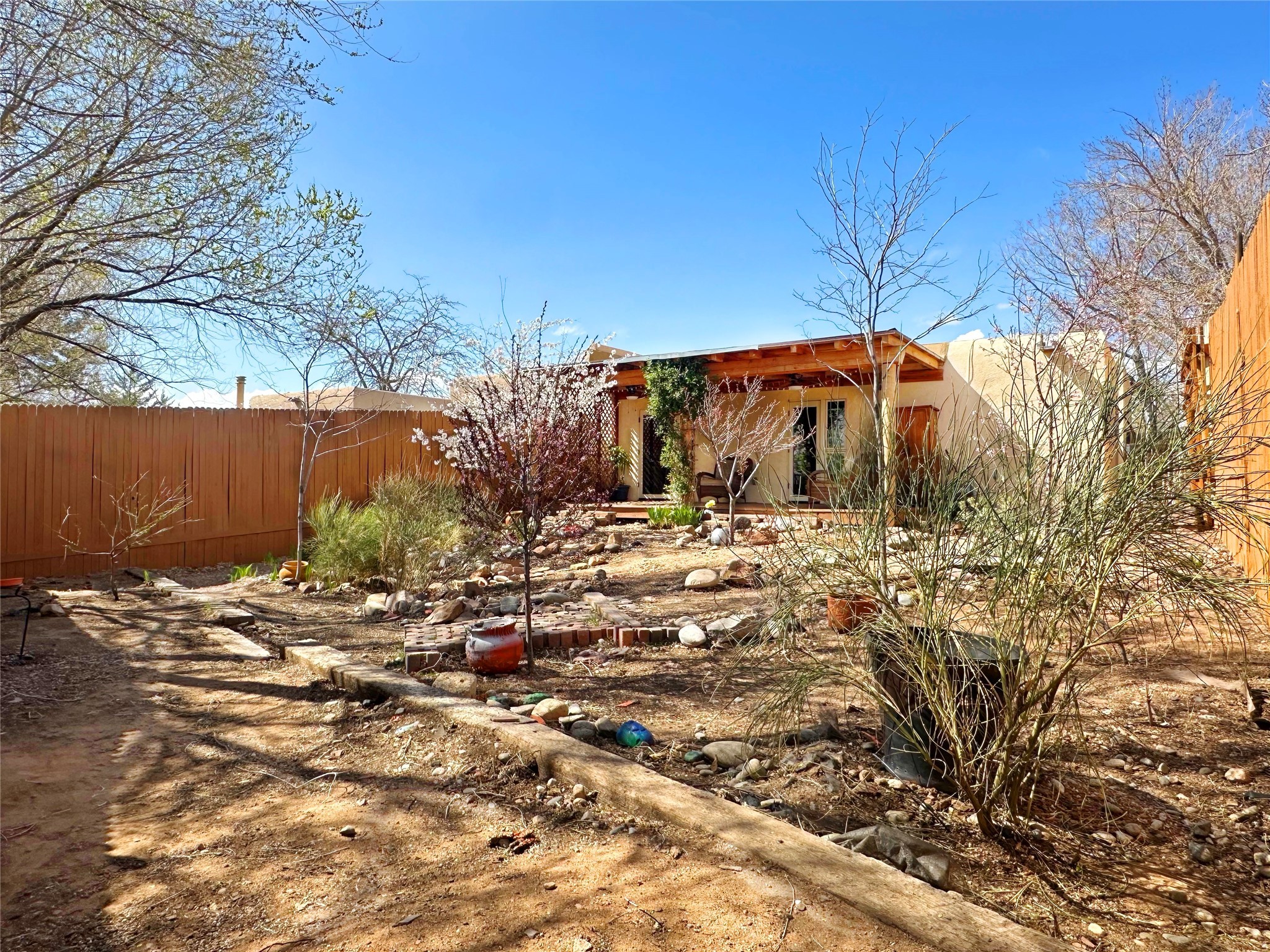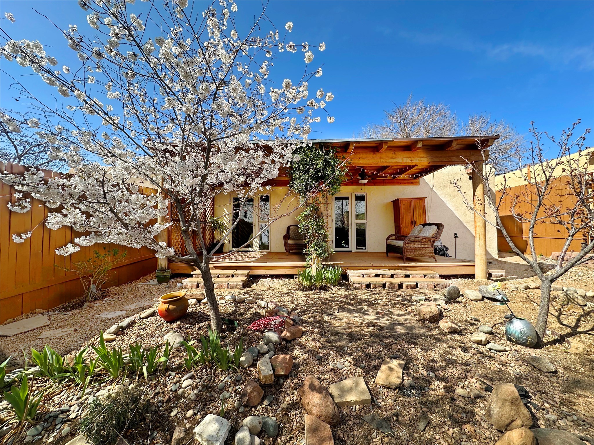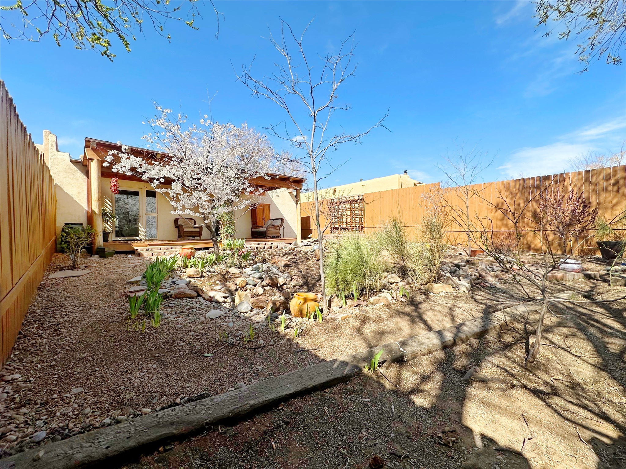 Well-maintained Santa Fe home offering three bedrooms and two baths in a convenient location. The heart of the home presents an open-concept living area with a well-designed kitchen, featuring butcher block countertops, stainless steel appliances, and glass display cabinetry. A large skylight and modern recessed lighting create bright, welcoming spaces throughout. Embracing Santa Fe's indoor-outdoor lifestyle, both the primary suite and second bedroom open directly to a covered deck with cooling fans, creating natural extensions of the living space. The primary suite includes an en-suite bath, while a tastefully refreshed guest bath completes the modern layout. A beautiful backyard features a flourishing Japanese blossom tree, offering a peaceful setting with room for additional landscaping. Multiple outdoor living spaces, including an intimate side patio and welcoming front courtyard, provide versatile areas for relaxation or entertaining. The two-car garage provides secure parking and storage space. Set near the Santa Fe Rail Trail with easy I-25 access, this home is just a 10-minute drive to the historic Plaza. The location perfectly combines pleasant residential living with convenient access to Santa Fe's culture. Adding to this home's appeal, the seller provides a generous $3,000 credit at closing towards carpet replacement in the bedrooms.