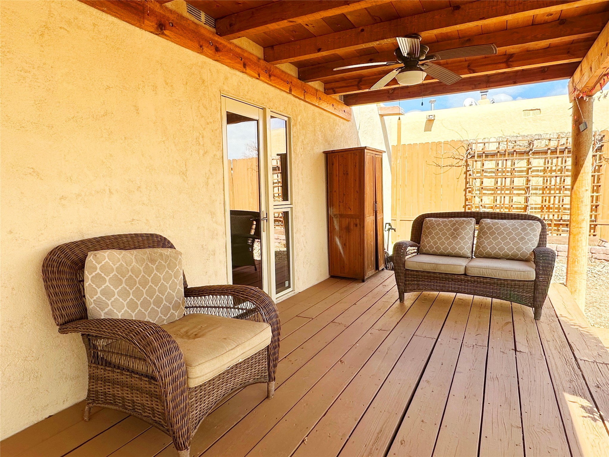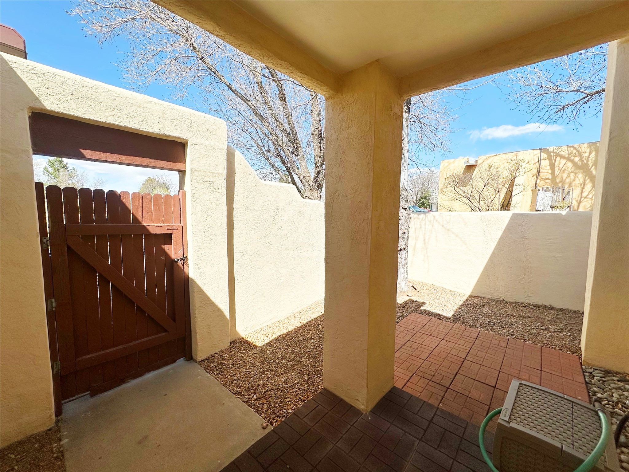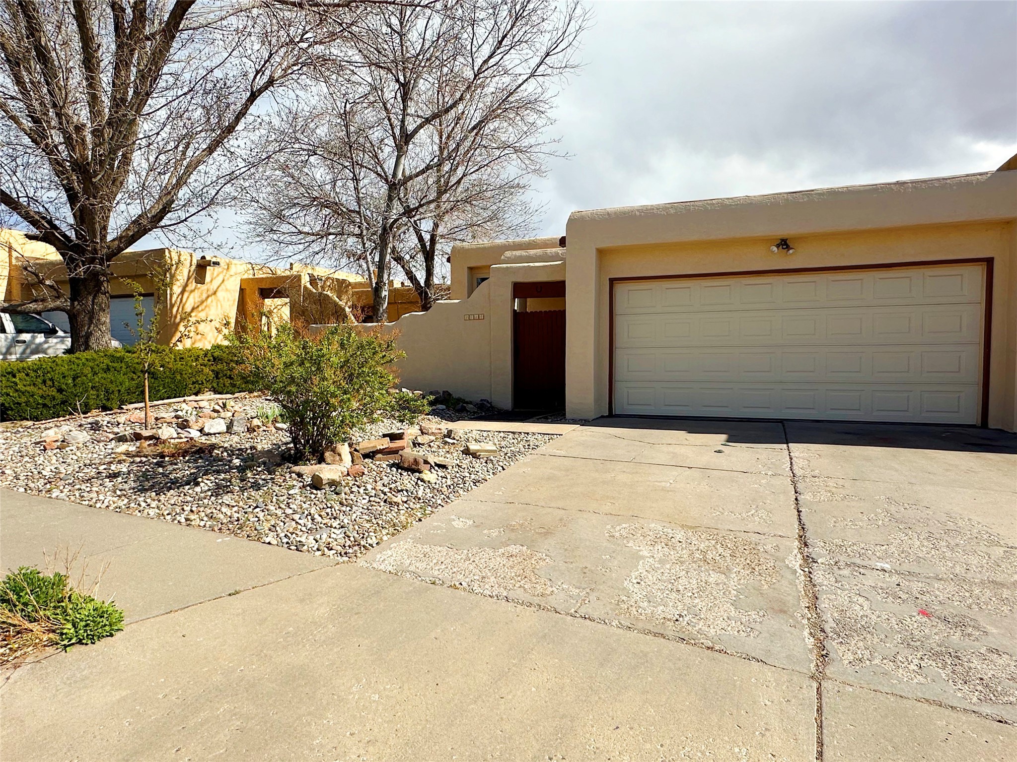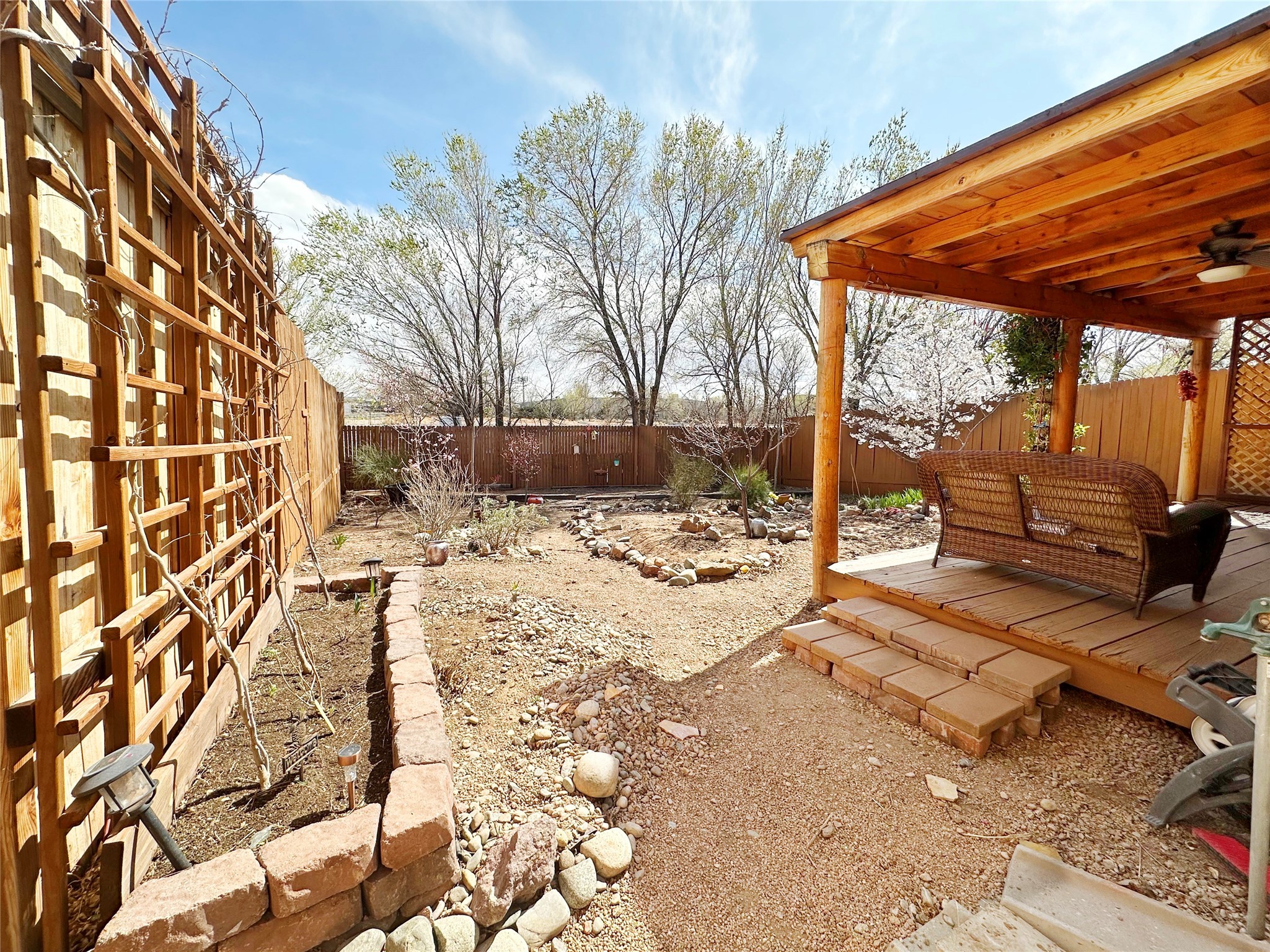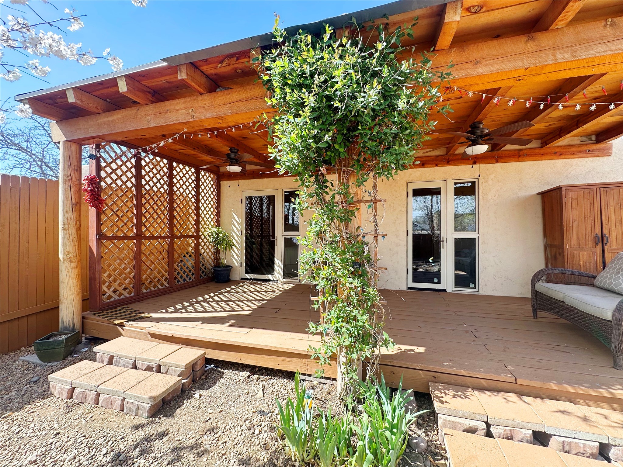 Well-maintained Santa Fe home offering three bedrooms and two baths in a convenient location. The heart of the home presents an open-concept living area with a well-designed kitchen, featuring butcher block countertops, stainless steel appliances, and glass display cabinetry. A large skylight and modern recessed lighting create bright, welcoming spaces throughout. Embracing Santa Fe's indoor-outdoor lifestyle, both the primary suite and second bedroom open directly to a covered deck with cooling fans, creating natural extensions of the living space. The primary suite includes an en-suite bath, while a tastefully refreshed guest bath completes the modern layout. A beautiful backyard features a flourishing Japanese blossom tree, offering a peaceful setting with room for additional landscaping. Multiple outdoor living spaces, including an intimate side patio and welcoming front courtyard, provide versatile areas for relaxation or entertaining. The two-car garage provides secure parking and storage space. Set near the Santa Fe Rail Trail with easy I-25 access, this home is just a 10-minute drive to the historic Plaza. The location perfectly combines pleasant residential living with convenient access to Santa Fe's culture. Adding to this home's appeal, the seller provides a generous $3,000 credit at closing towards carpet replacement in the bedrooms.