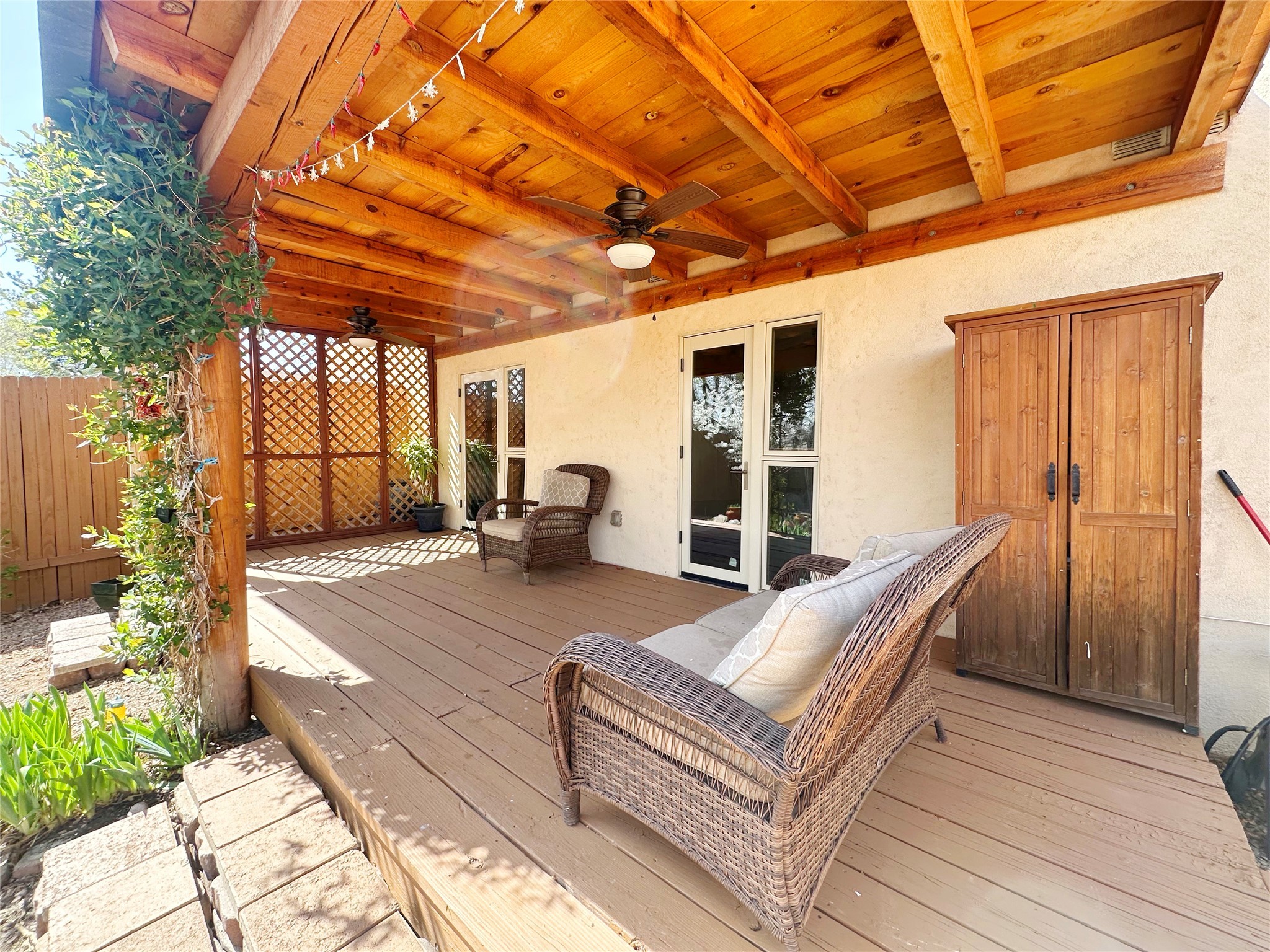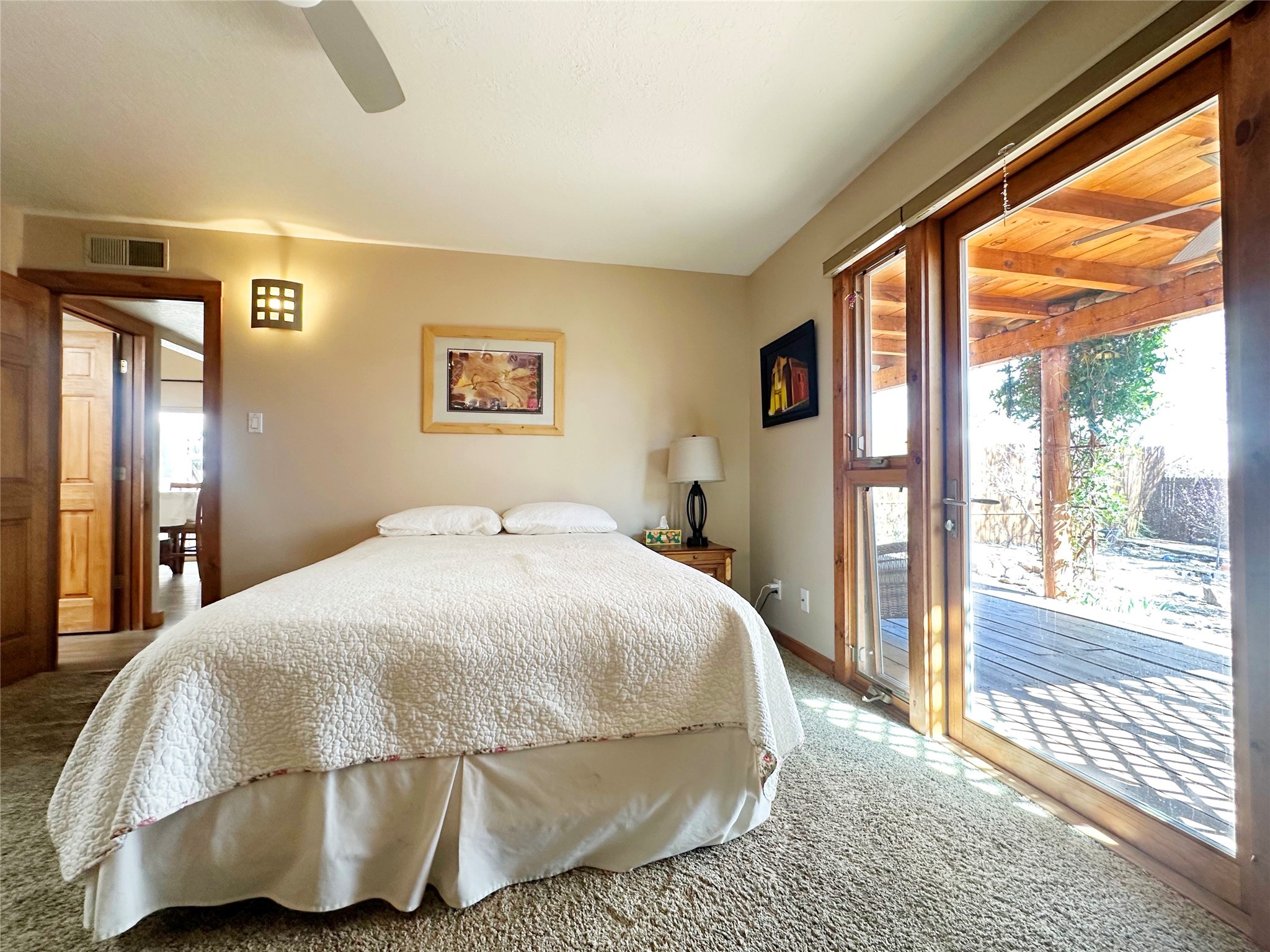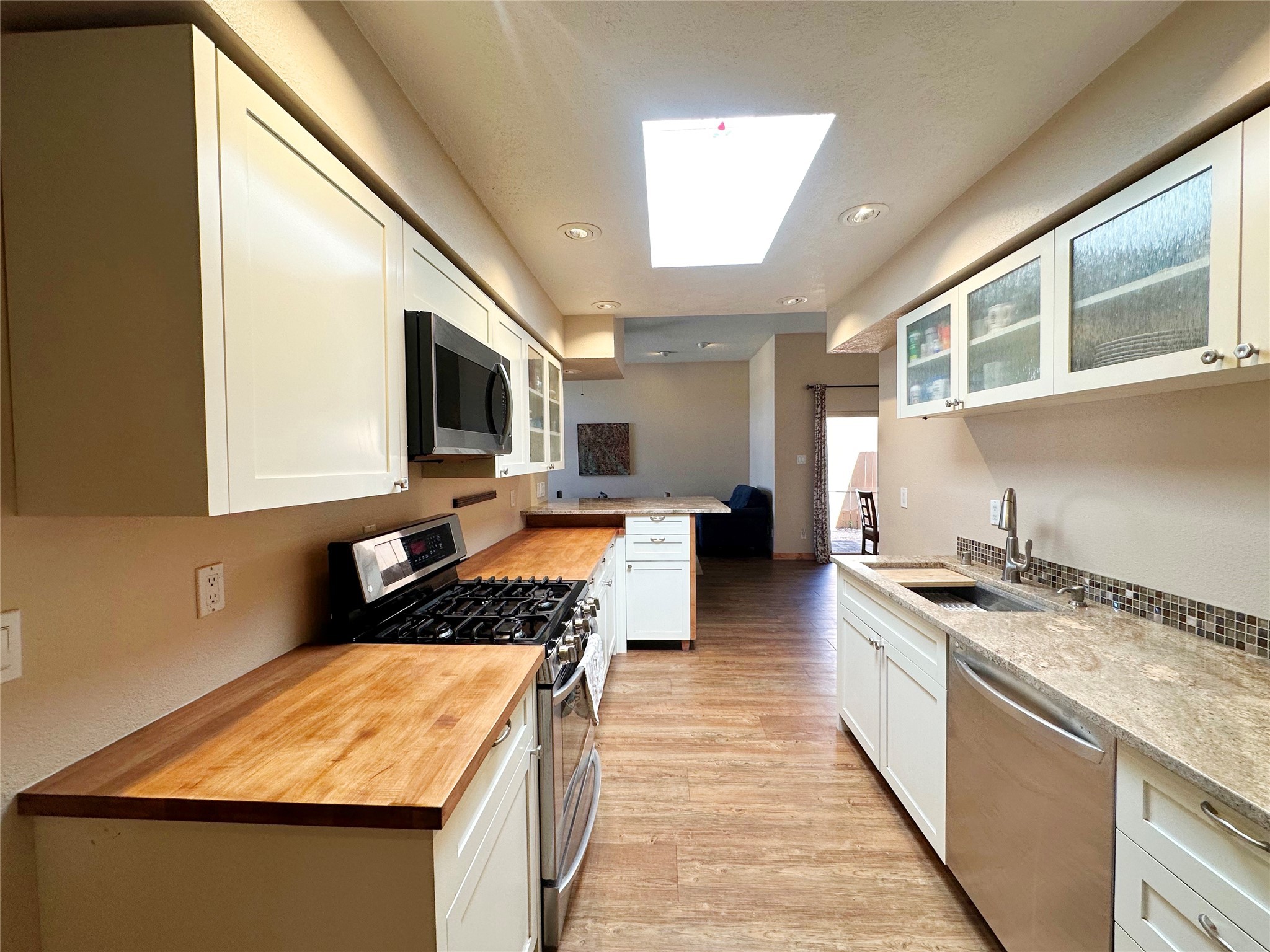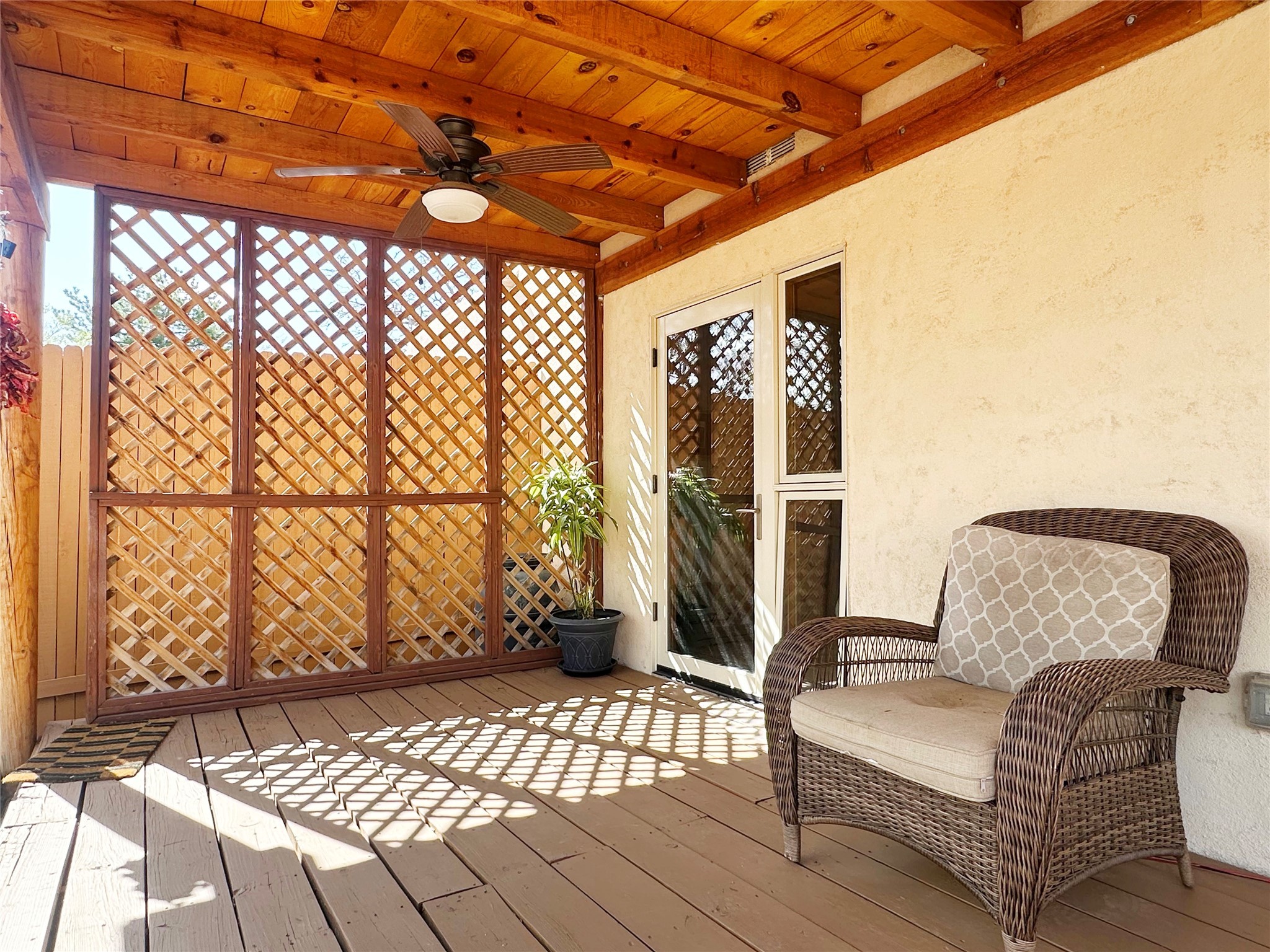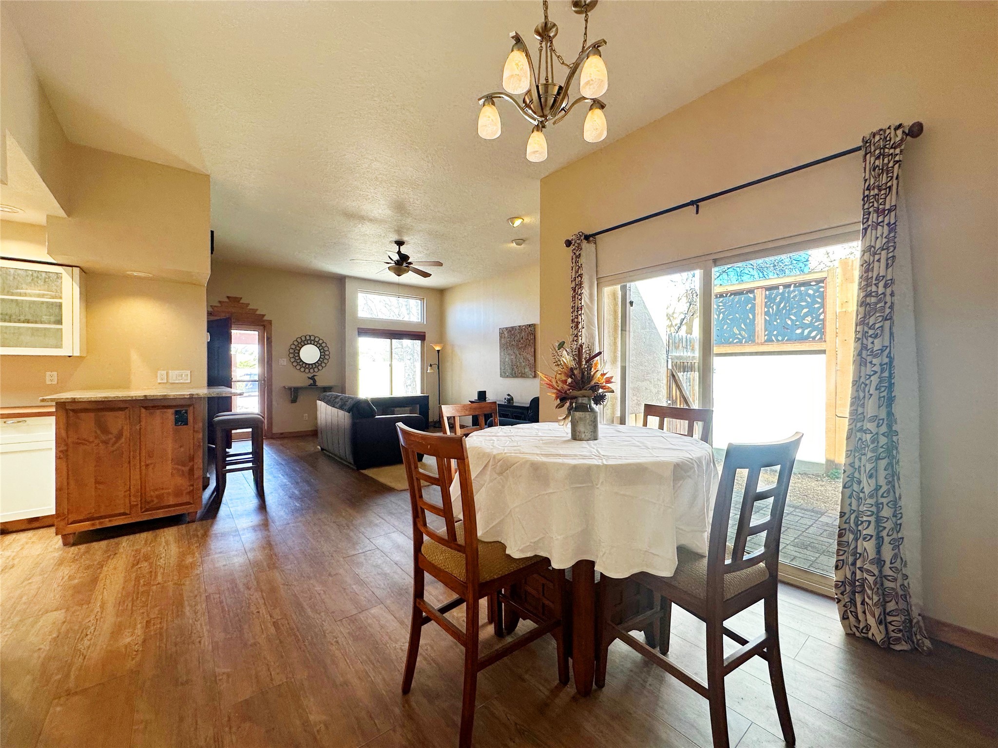 Well-maintained Santa Fe home offering three bedrooms and two baths in a convenient location. The heart of the home presents an open-concept living area with a well-designed kitchen, featuring butcher block countertops, stainless steel appliances, and glass display cabinetry. A large skylight and modern recessed lighting create bright, welcoming spaces throughout. Embracing Santa Fe's indoor-outdoor lifestyle, both the primary suite and second bedroom open directly to a covered deck with cooling fans, creating natural extensions of the living space. The primary suite includes an en-suite bath, while a tastefully refreshed guest bath completes the modern layout. A beautiful backyard features a flourishing Japanese blossom tree, offering a peaceful setting with room for additional landscaping. Multiple outdoor living spaces, including an intimate side patio and welcoming front courtyard, provide versatile areas for relaxation or entertaining. The two-car garage provides secure parking and storage space. Set near the Santa Fe Rail Trail with easy I-25 access, this home is just a 10-minute drive to the historic Plaza. The location perfectly combines pleasant residential living with convenient access to Santa Fe's culture. Adding to this home's appeal, the seller provides a generous $3,000 credit at closing towards carpet replacement in the bedrooms.