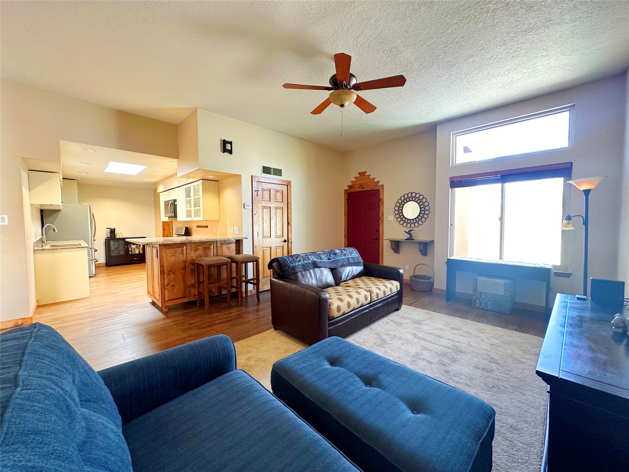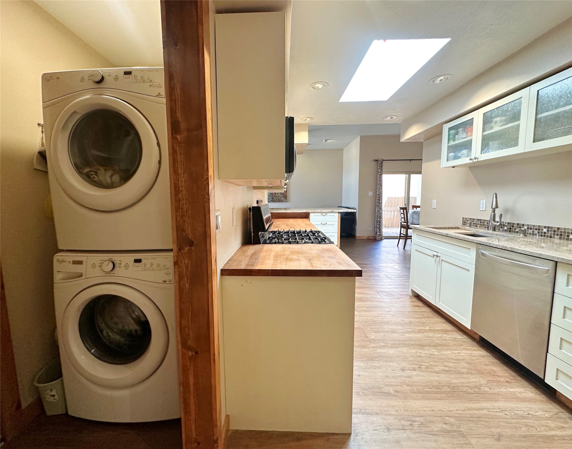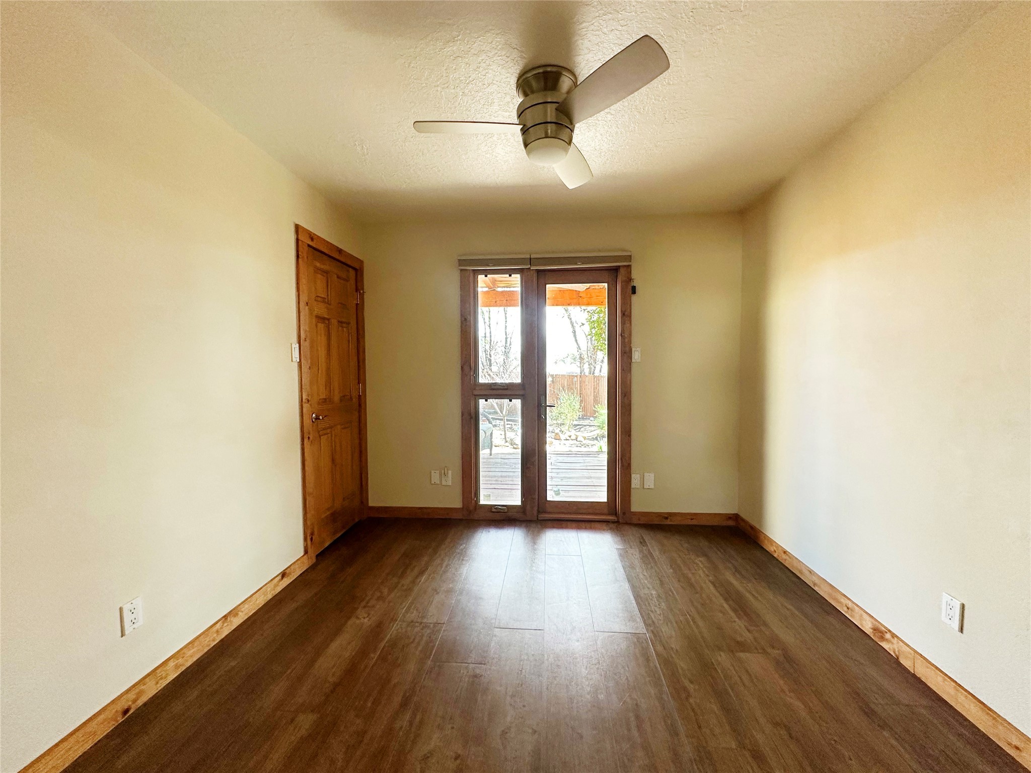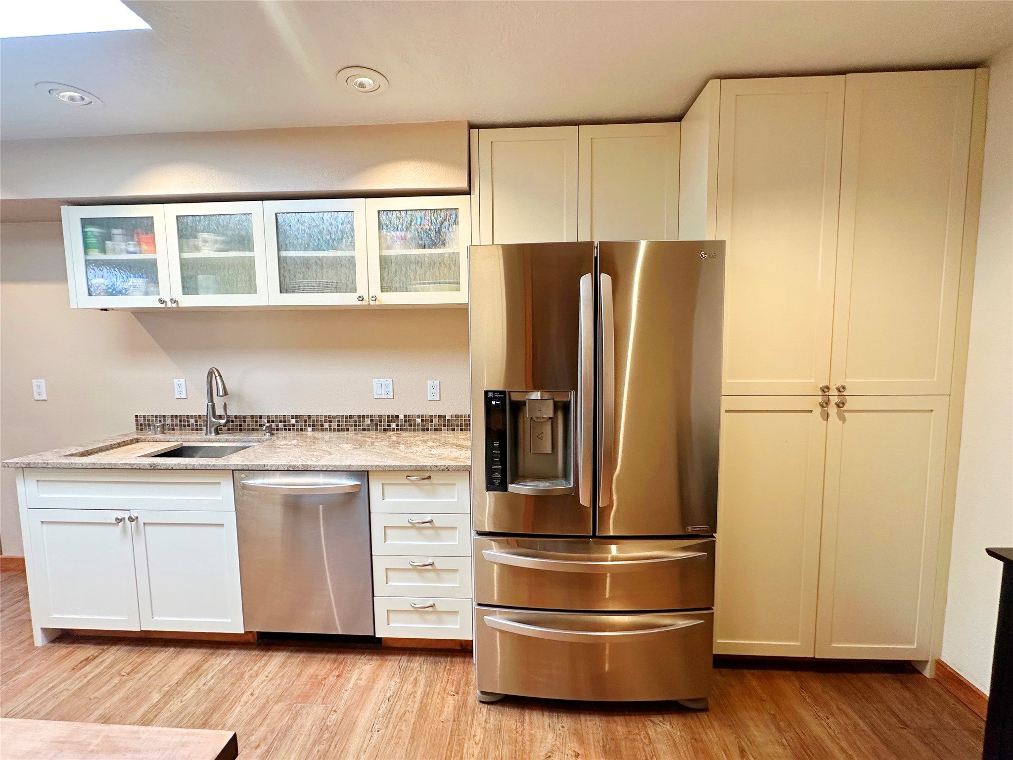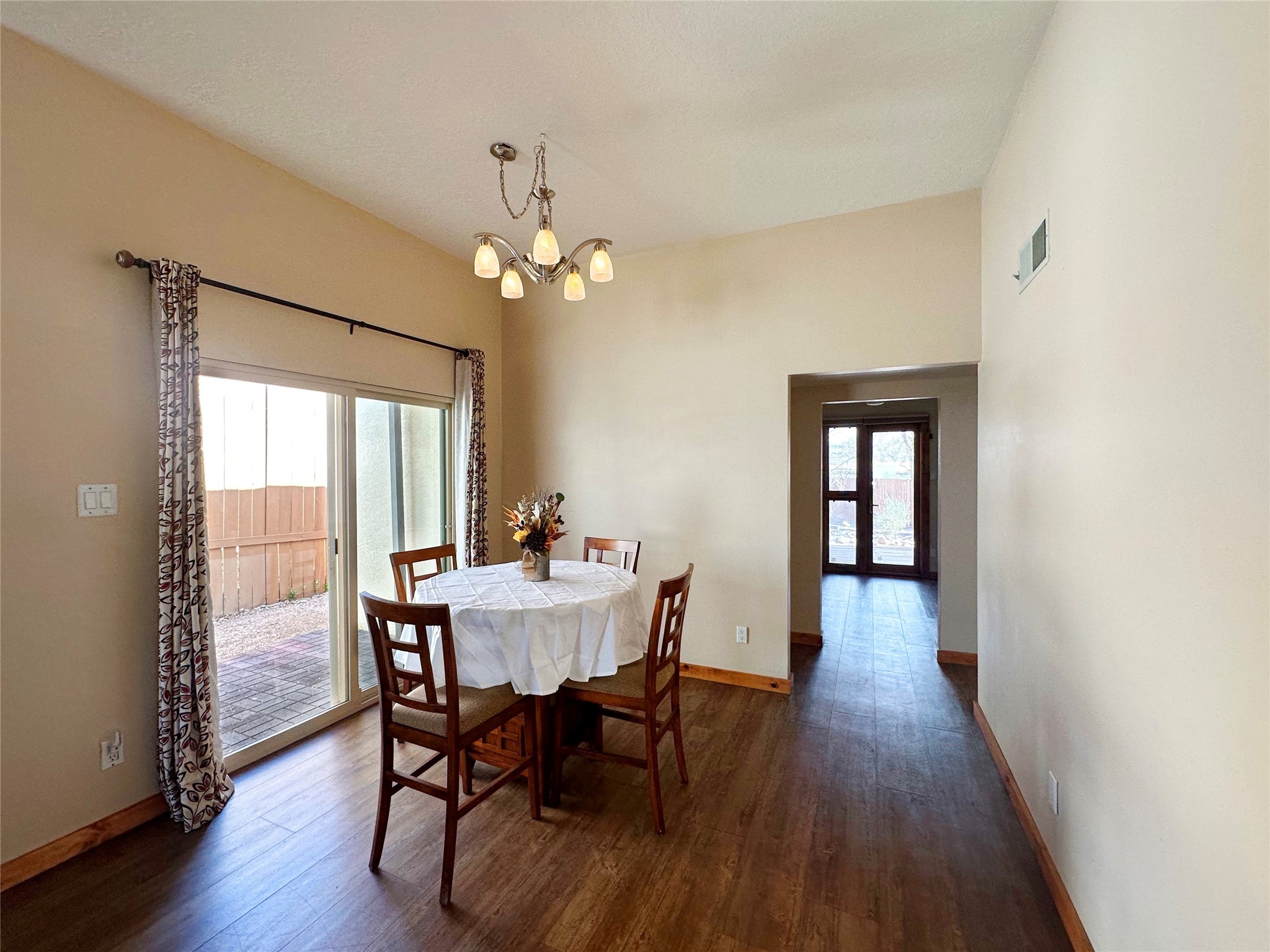 Well-maintained Santa Fe home offering three bedrooms and two baths in a convenient location. The heart of the home presents an open-concept living area with a well-designed kitchen, featuring butcher block countertops, stainless steel appliances, and glass display cabinetry. A large skylight and modern recessed lighting create bright, welcoming spaces throughout. Embracing Santa Fe's indoor-outdoor lifestyle, both the primary suite and second bedroom open directly to a covered deck with cooling fans, creating natural extensions of the living space. The primary suite includes an en-suite bath, while a tastefully refreshed guest bath completes the modern layout. A beautiful backyard features a flourishing Japanese blossom tree, offering a peaceful setting with room for additional landscaping. Multiple outdoor living spaces, including an intimate side patio and welcoming front courtyard, provide versatile areas for relaxation or entertaining. The two-car garage provides secure parking and storage space. Set near the Santa Fe Rail Trail with easy I-25 access, this home is just a 10-minute drive to the historic Plaza. The location perfectly combines pleasant residential living with convenient access to Santa Fe's culture. Adding to this home's appeal, the seller provides a generous $3,000 credit at closing towards carpet replacement in the bedrooms.